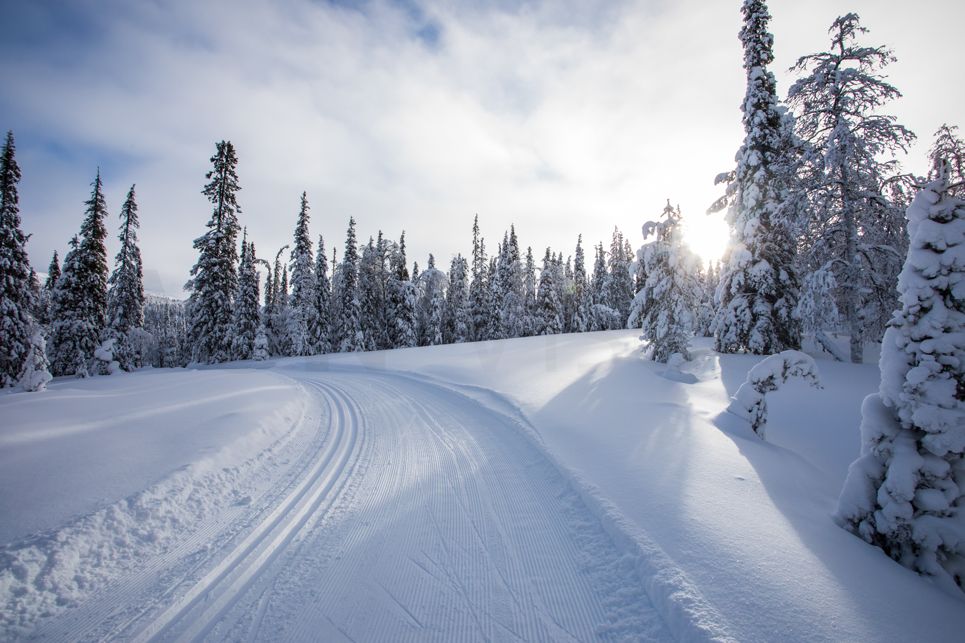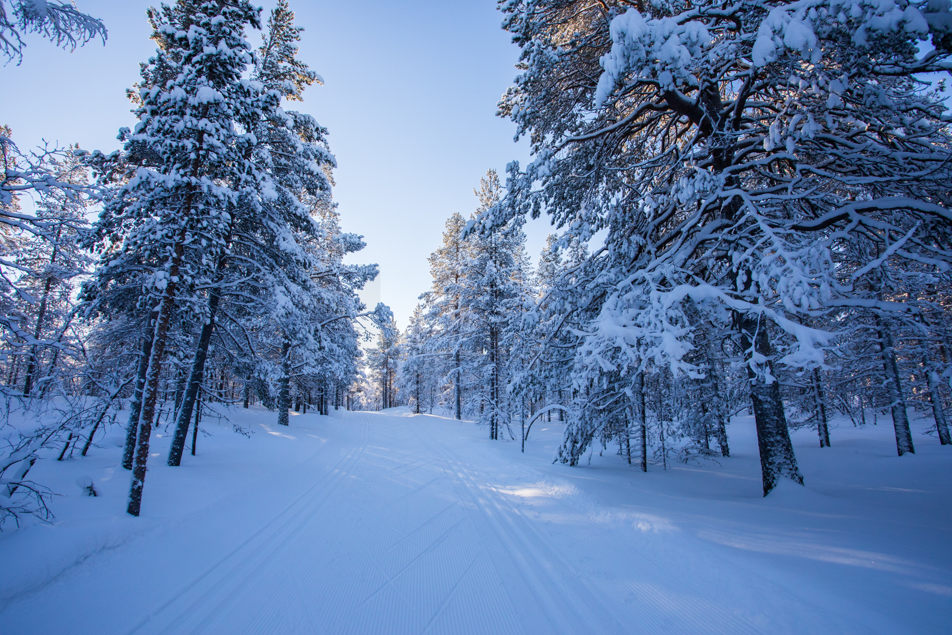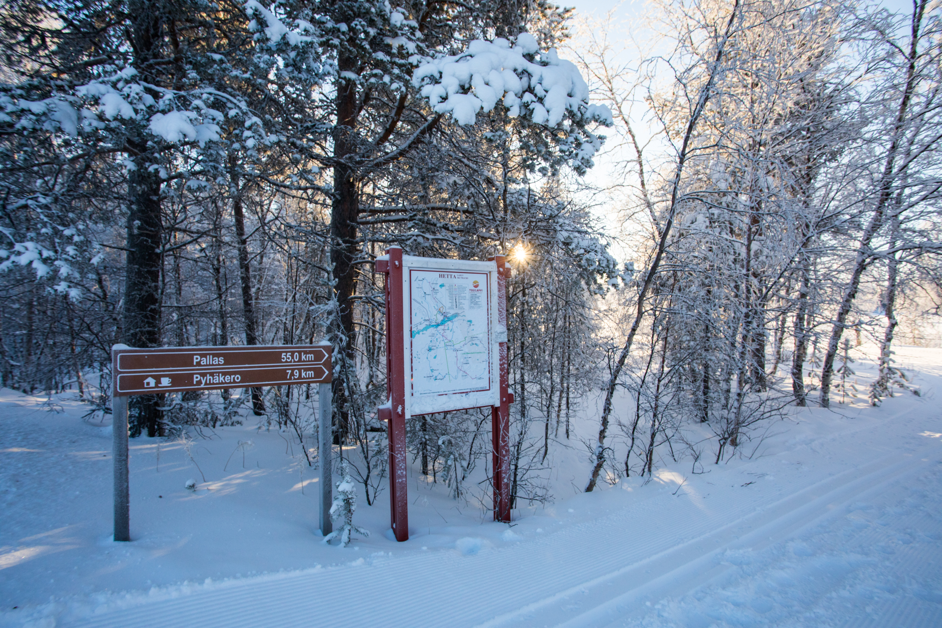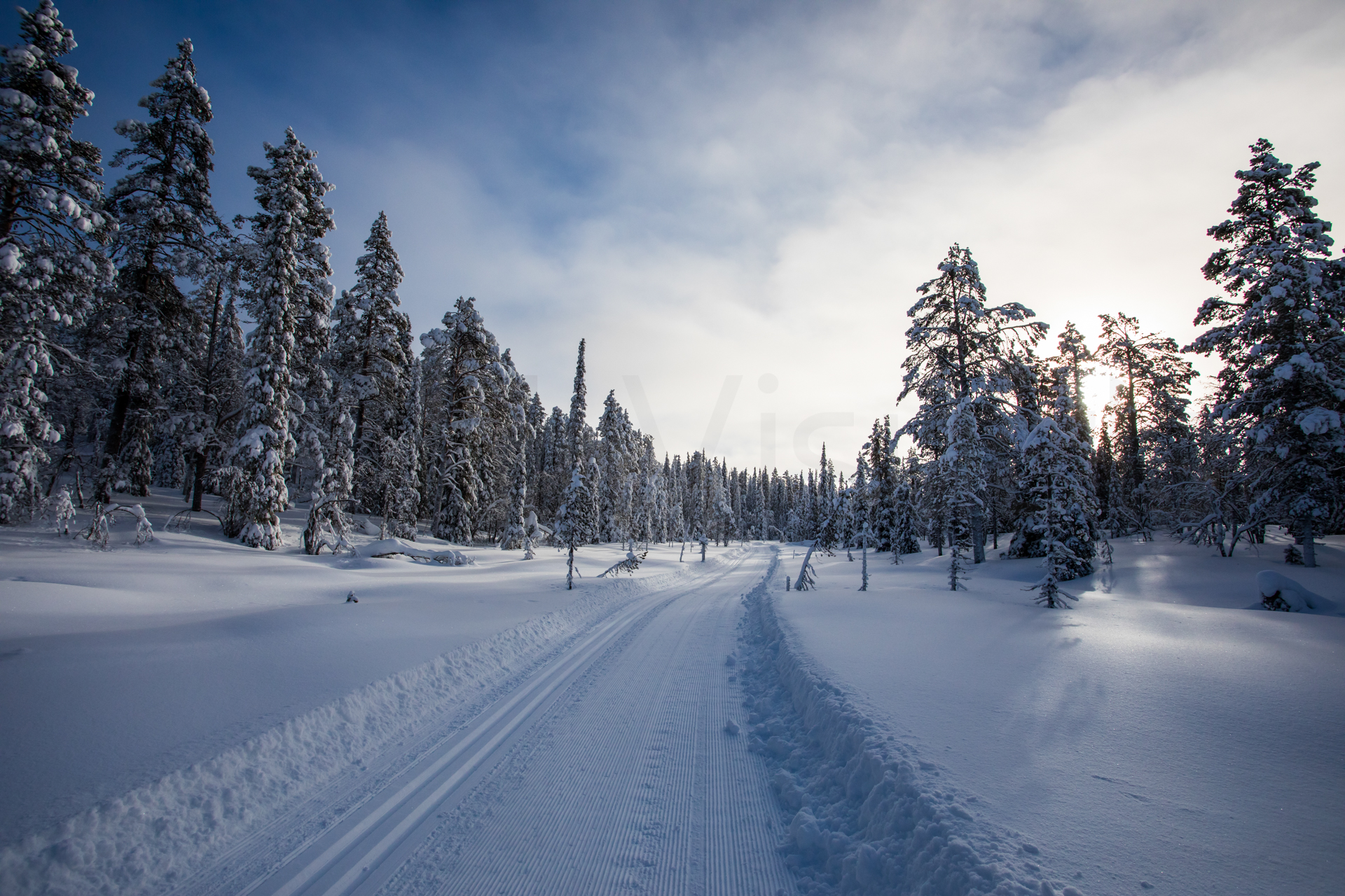 Aquí el trayecto es fácil, con árboles altos y cubiertos de nieve que crean un paisaje espectacular. Sin embargo, la bajada es muy pronunciada y tengo que quitarme los esquís porque no puedo frenar. En una de estas bajadas, un mosquetón se suelta y la pulka me arrastra unos metros fuera de la pista (afortunadamente, gracias a mis conocimientos de autodetención en nieve logro frenar). Regreso a la pista y me doy cuenta de que no llegaré al refugio de Nammalakuru, ya que está oscureciendo. Consulto el mapa y descubro que no hay refugio cercano, pero sí un hotel en Vuontispirtti. Decido ir al hotel, no tanto por cansancio, sino para cargar adecuadamente las baterías de las cámaras, ya que las de segunda marca me han fallado.