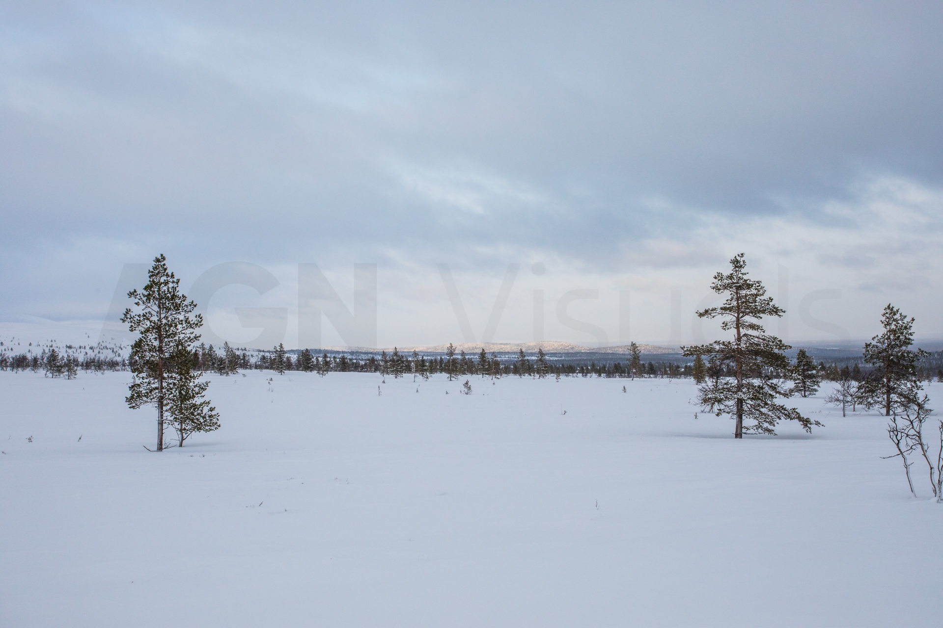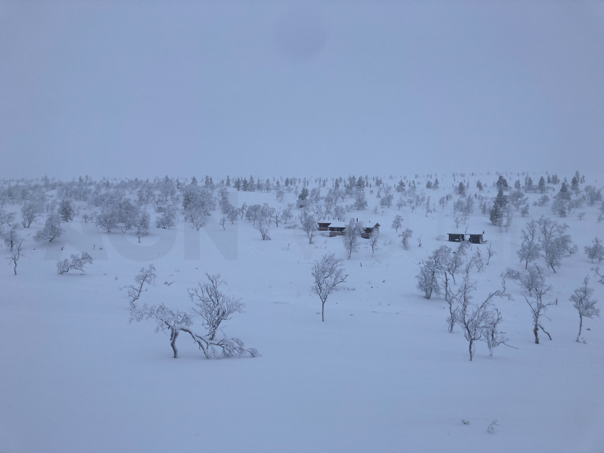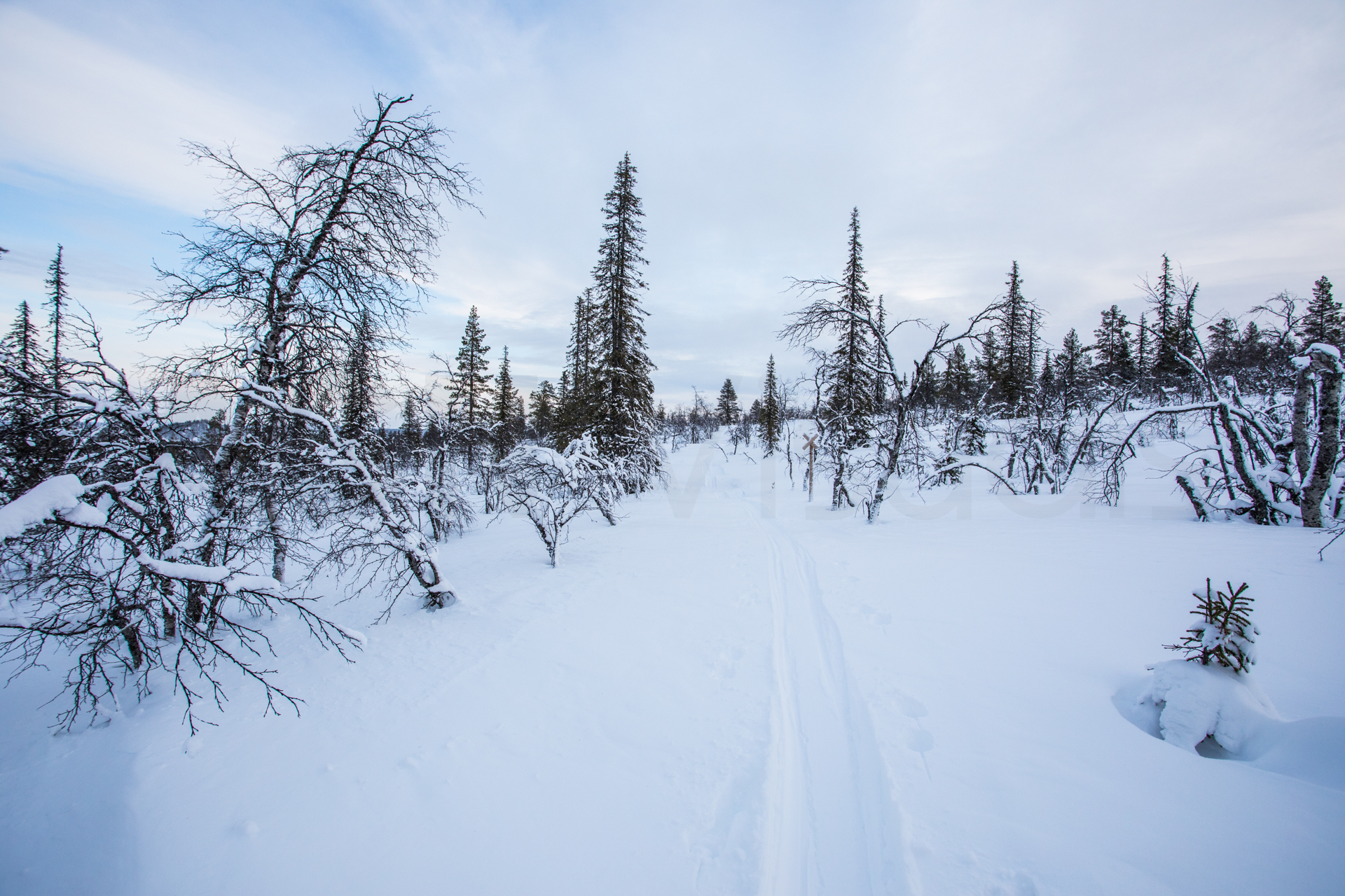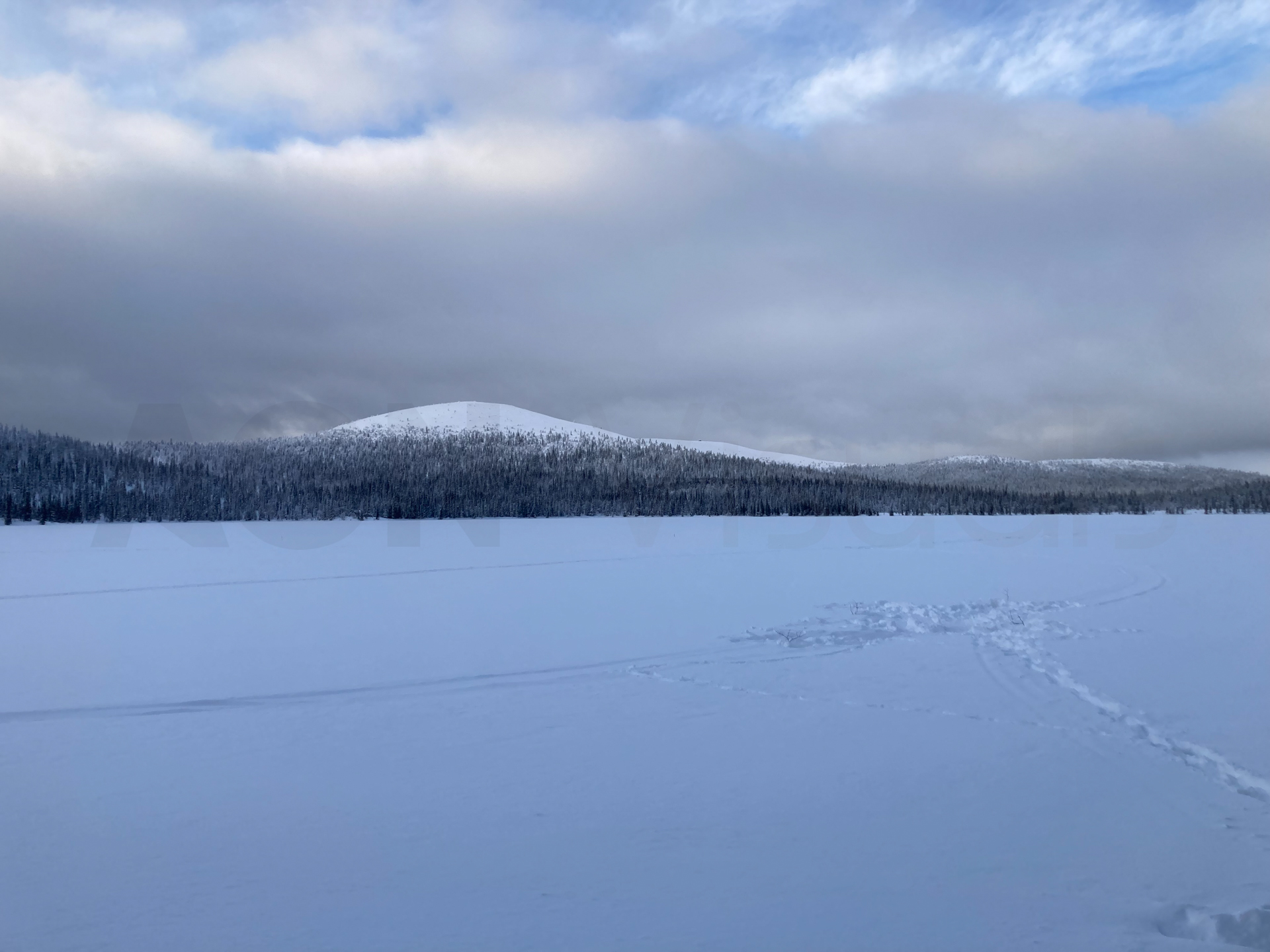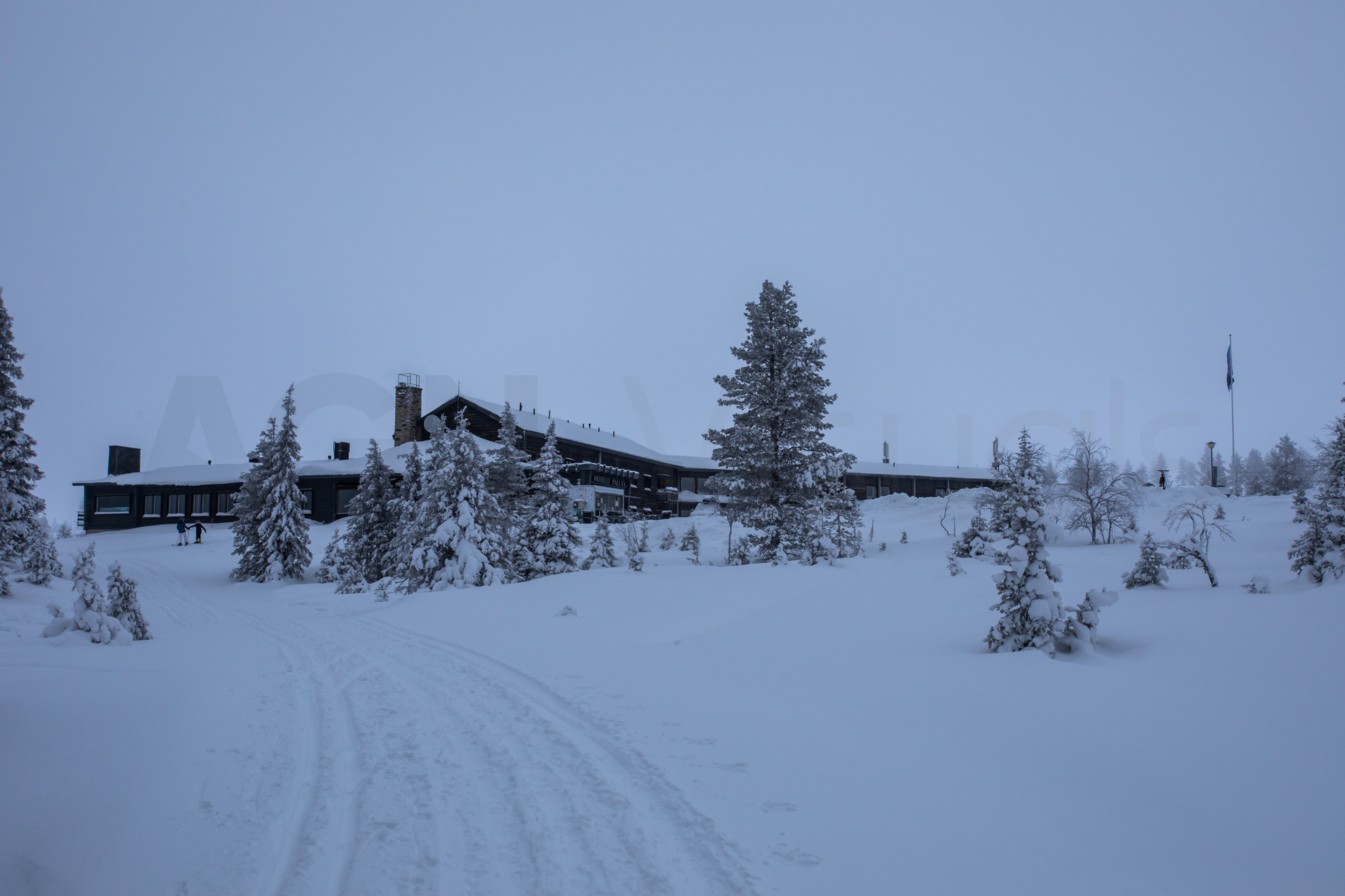 Dejo la cabaña de Sioskuru y me dirijo hacia la cabaña de Pahakuru. Hoy el paisaje será precioso, nublado pero con unas vistas impresionantes de las montañas del parque. Observar las extensas llanuras de los bosques lapones es todo un espectáculo. Gracias al fuerte viento, la nieve está firme y avanzar se hace fácil, hasta llegar a Pahakuru.