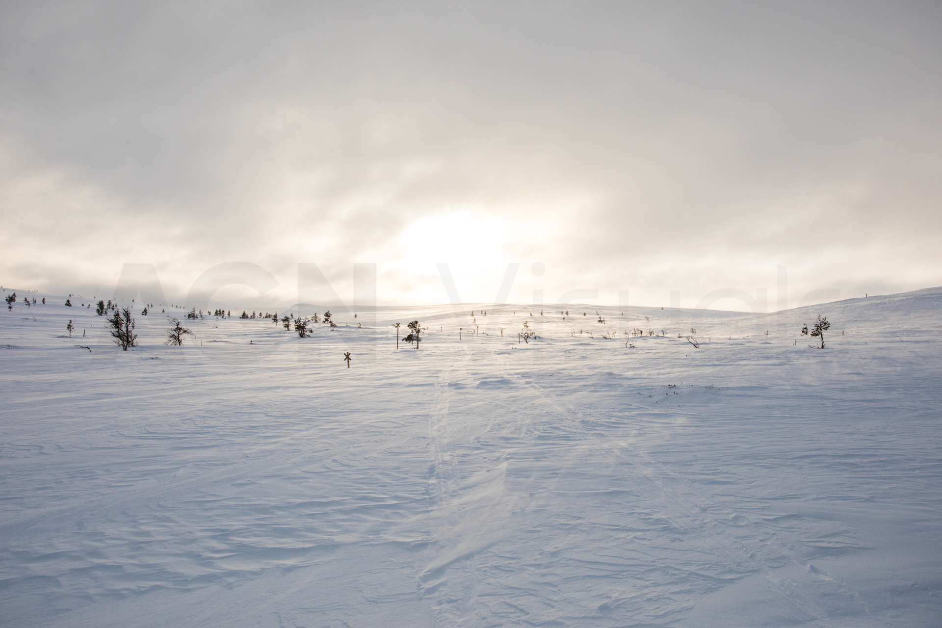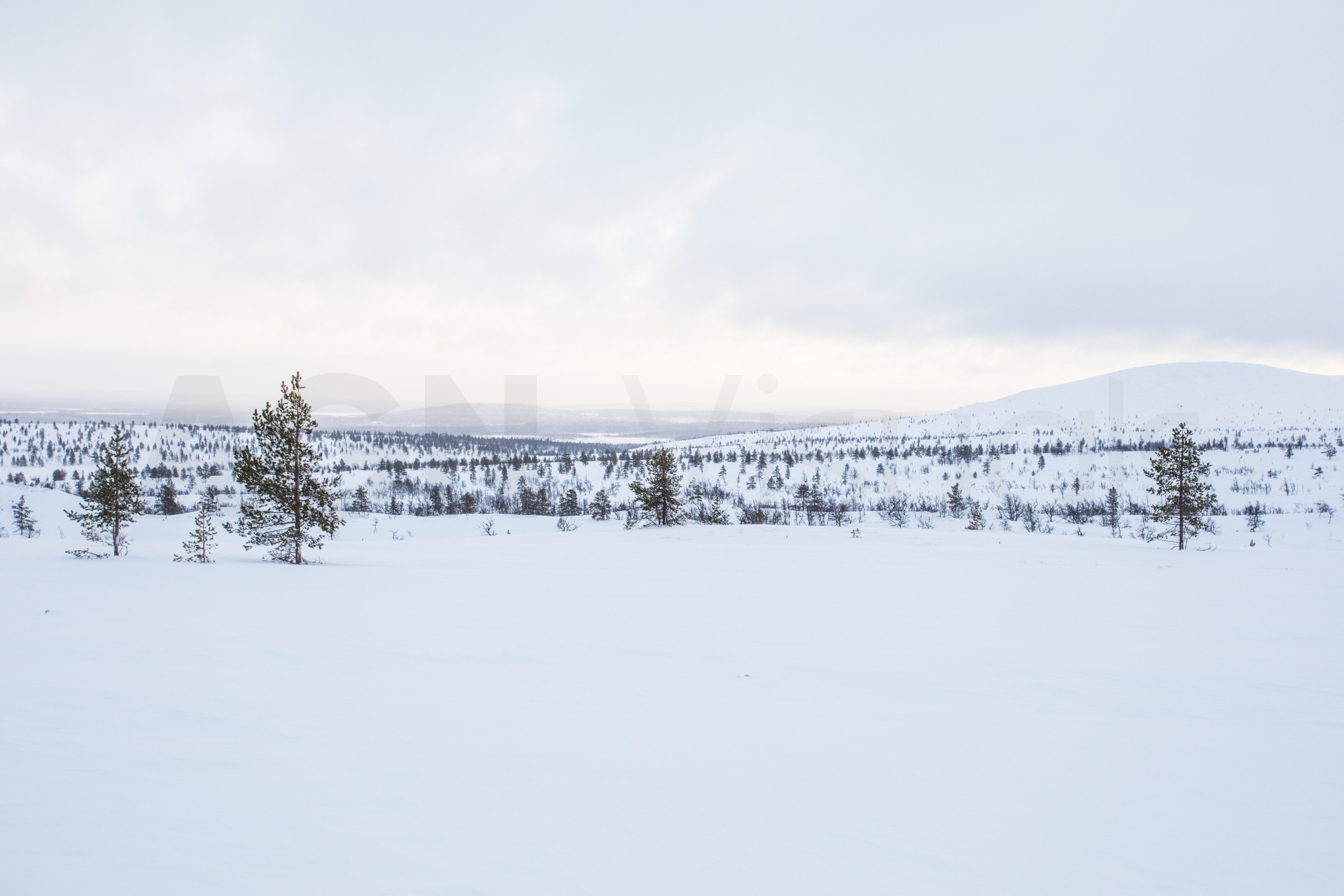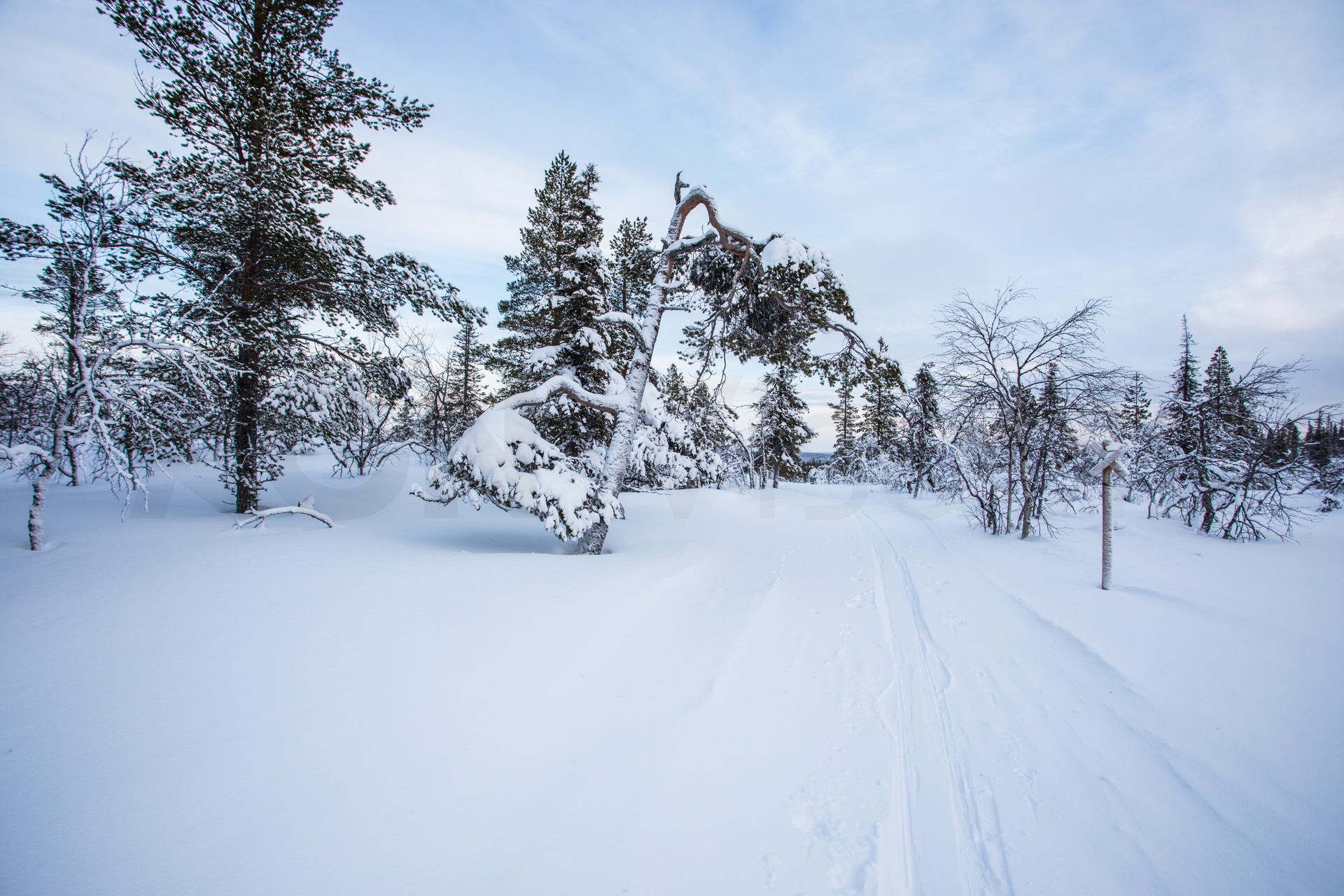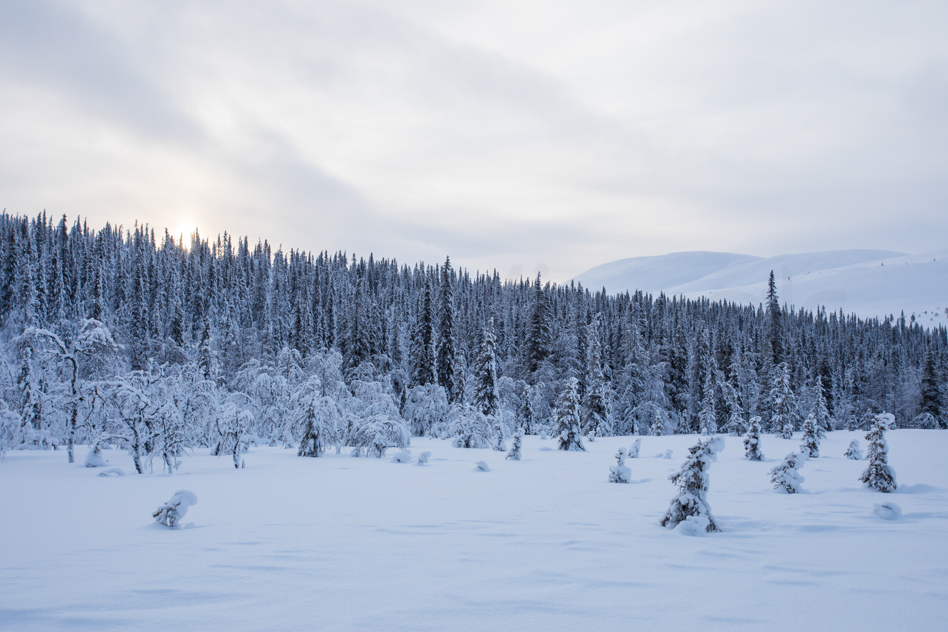Dejo la cabaña de Sioskuru y me dirijo hacia la cabaña de Pahakuru. Hoy el paisaje será precioso, nublado pero con unas vistas impresionantes de las montañas del parque. Observar las extensas llanuras de los bosques lapones es todo un espectáculo. Gracias al fuerte viento, la nieve está firme y avanzar se hace fácil, hasta llegar a Pahakuru.