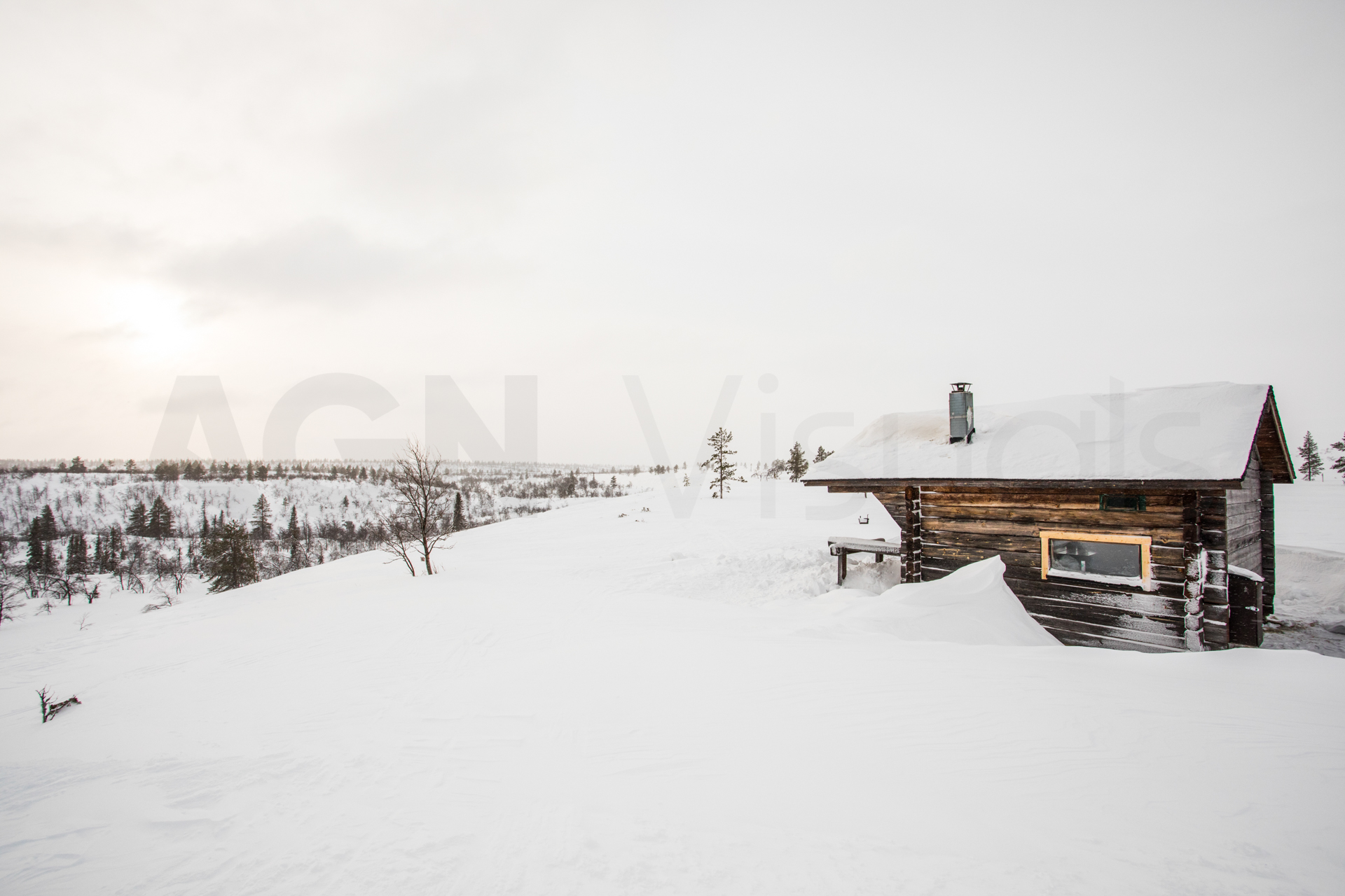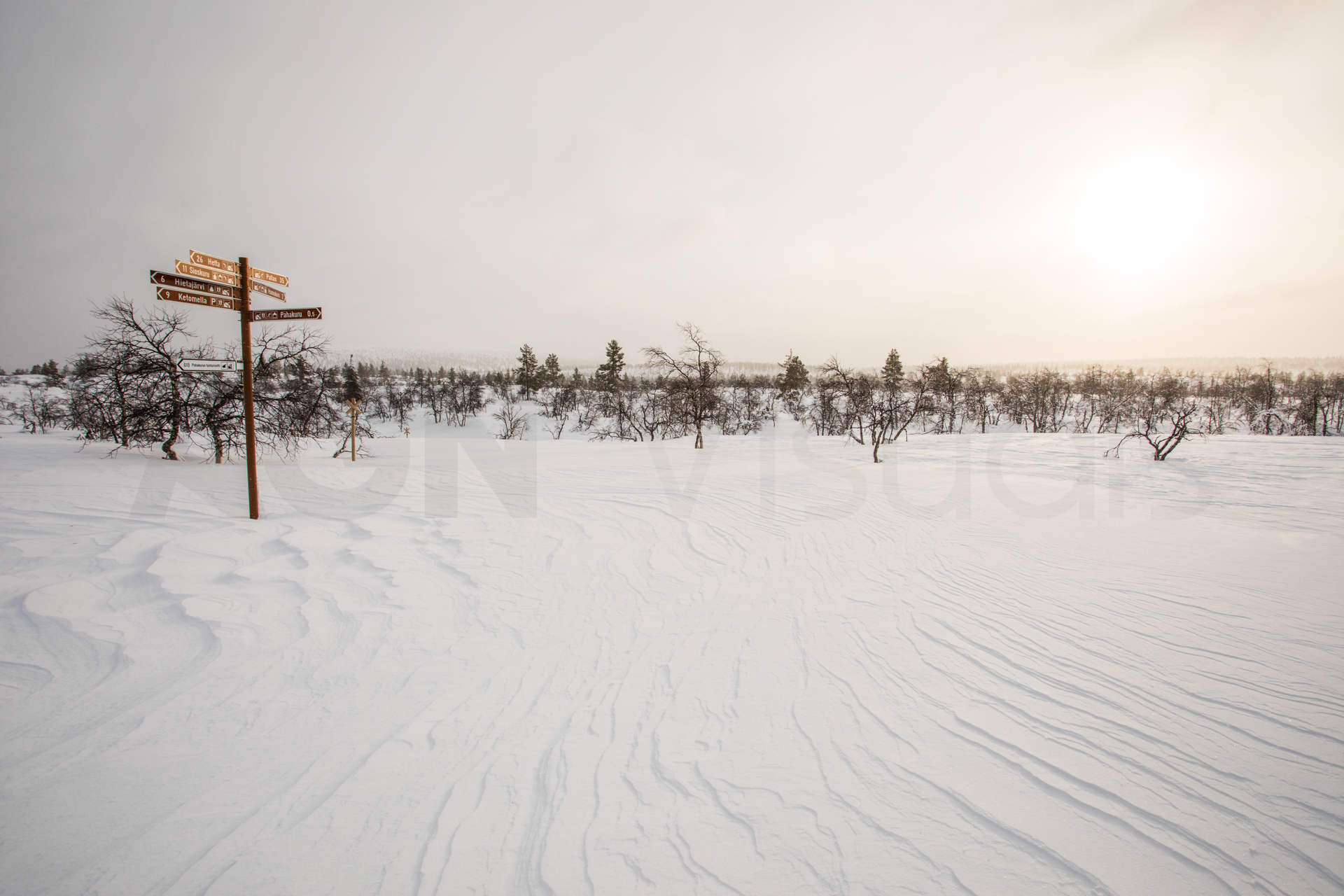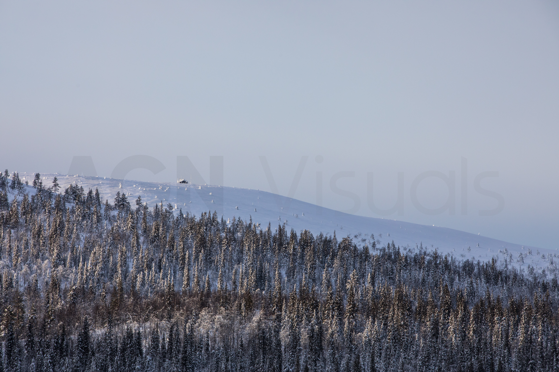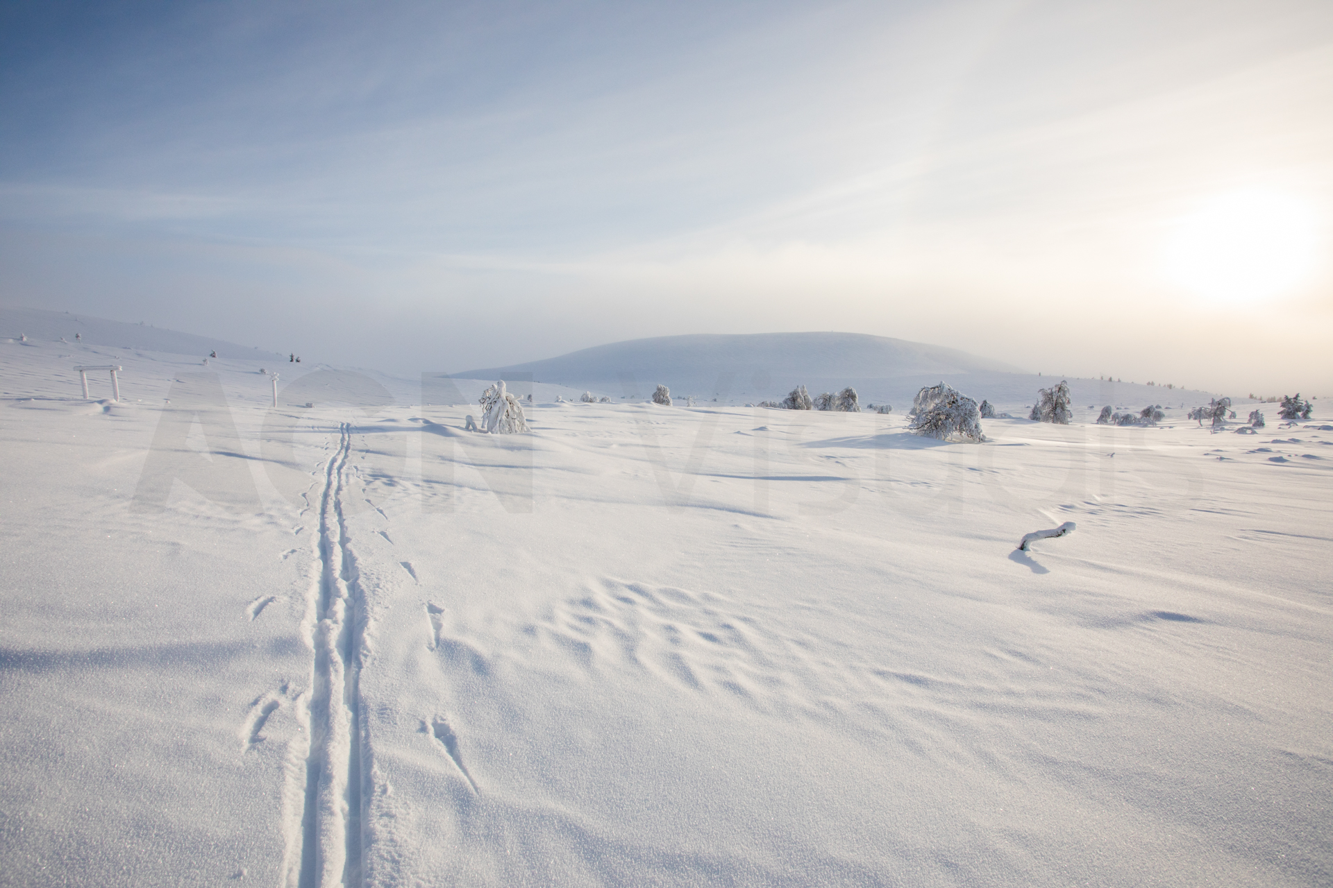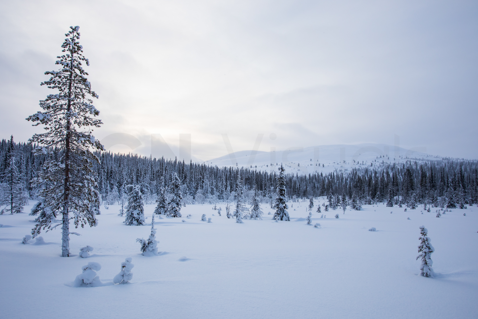 Dejo la cabaña de Sioskuru y me dirijo hacia la cabaña de Pahakuru. Hoy el paisaje será precioso, nublado pero con unas vistas impresionantes de las montañas del parque. Observar las extensas llanuras de los bosques lapones es todo un espectáculo. Gracias al fuerte viento, la nieve está firme y avanzar se hace fácil, hasta llegar a Pahakuru.