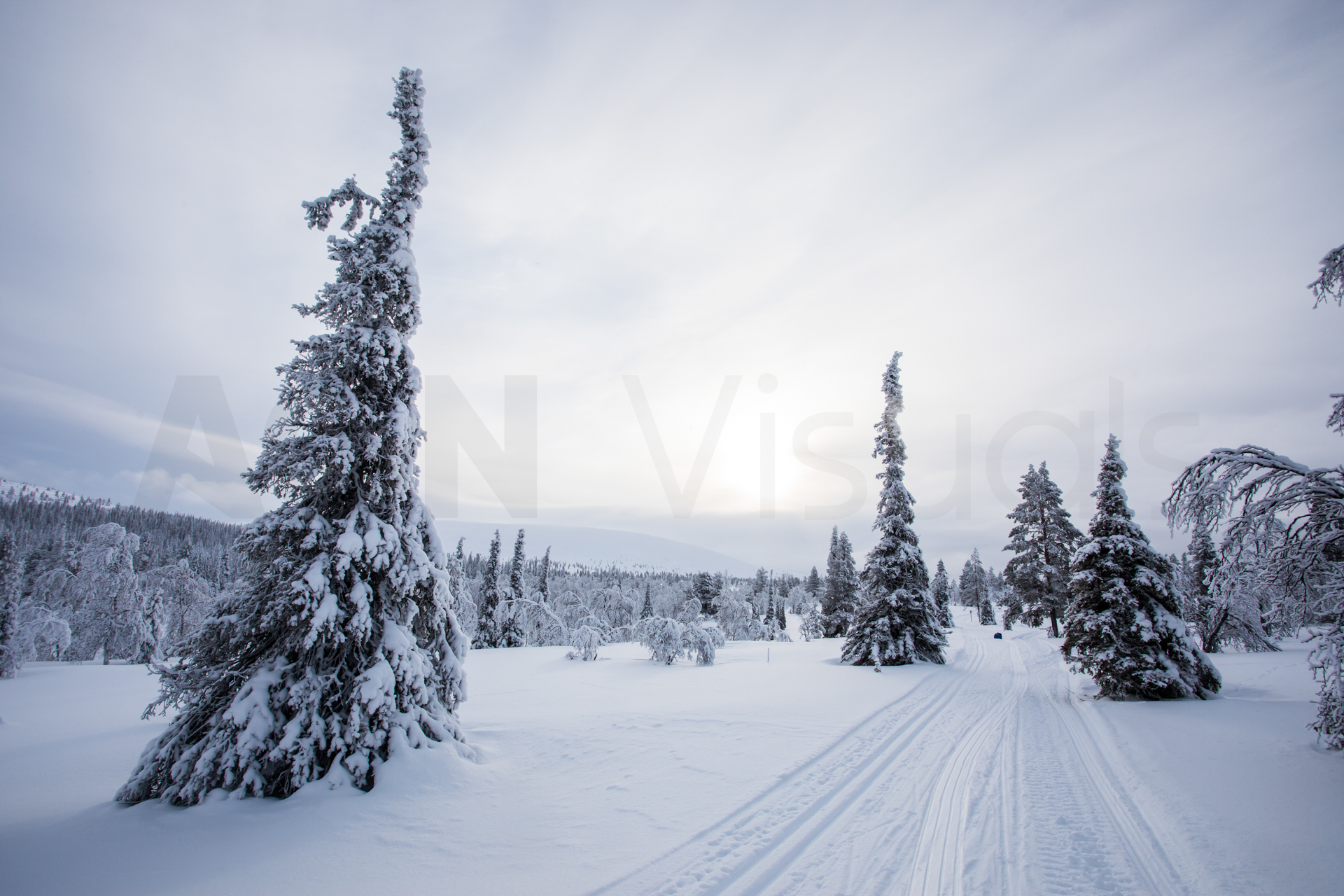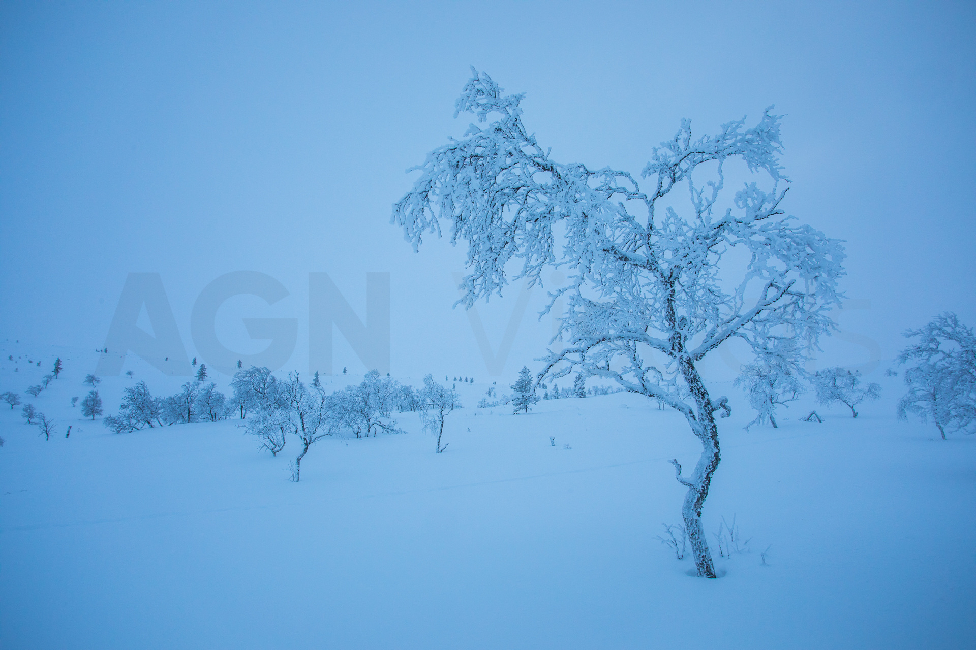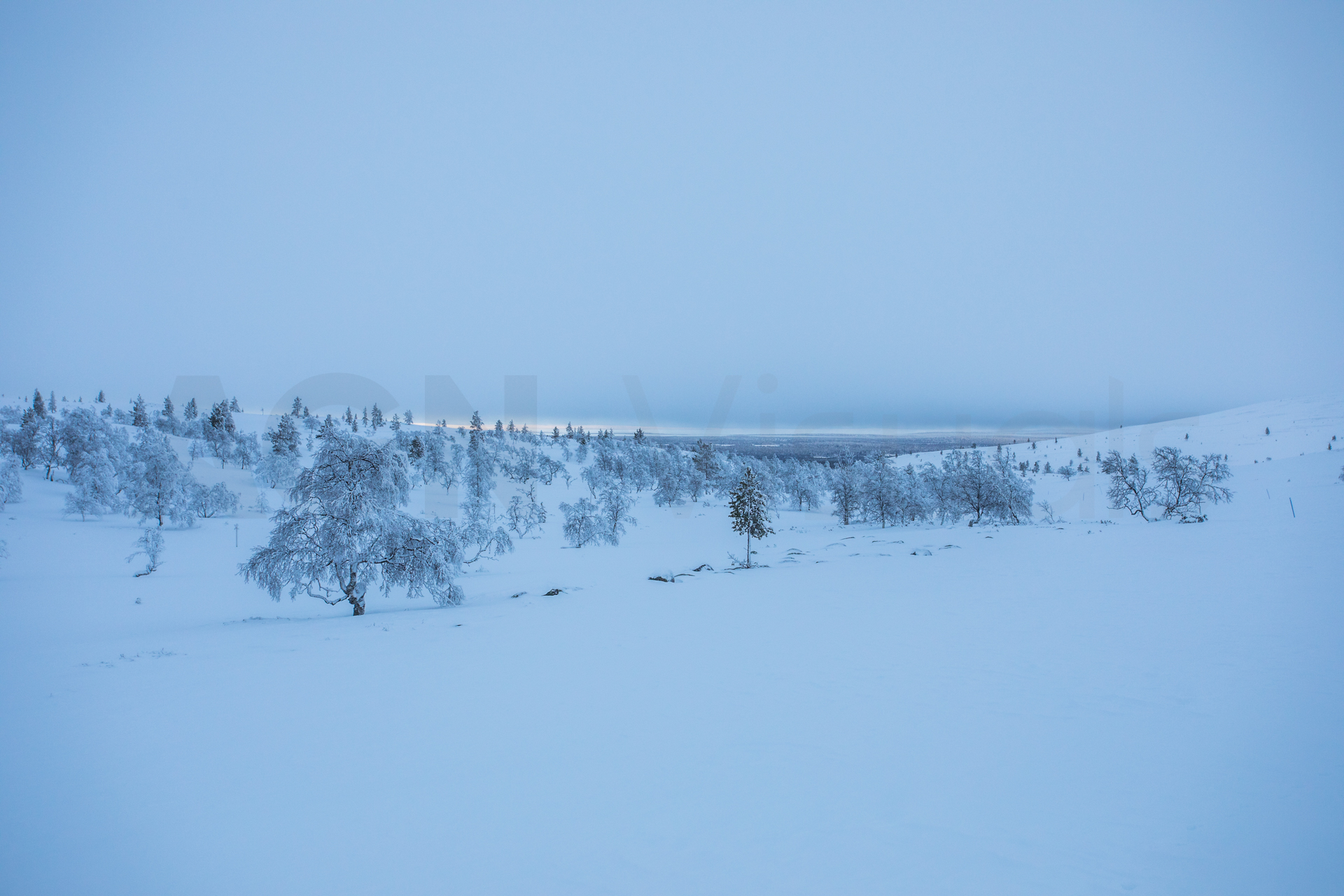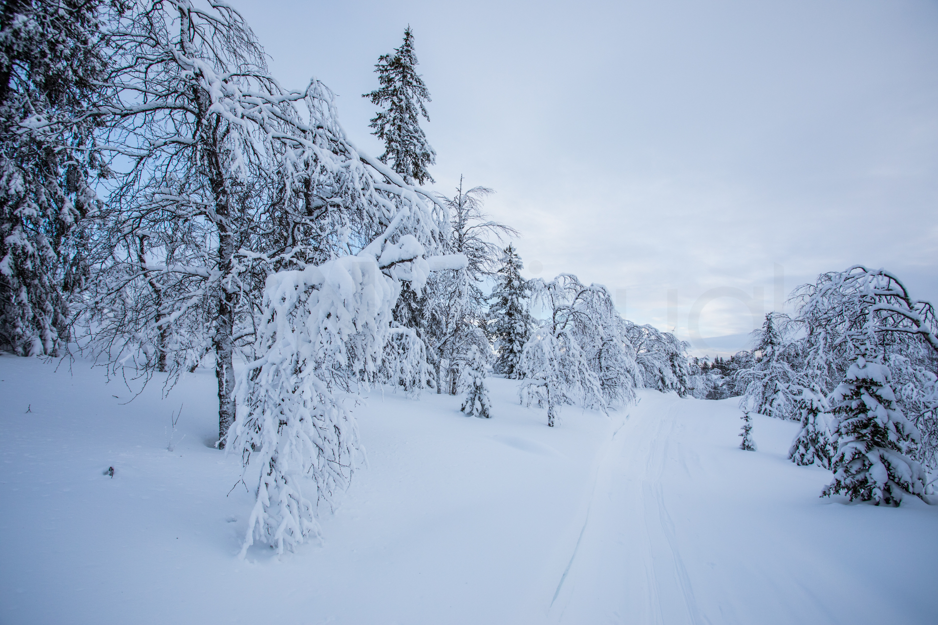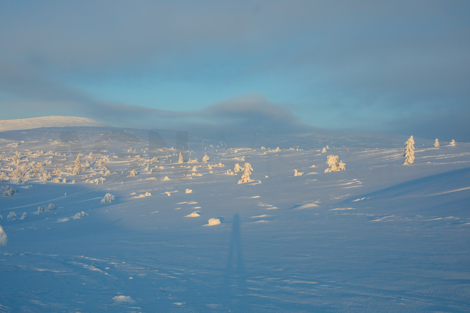 Hoy será un día tranquilo y de disfrutar el paisaje, así como de fotografiarlo. Salgo con los esquís pero sin la pulka, solo llevo la mochila. Subo a la colina más alta, pero hay nubes arriba que no permiten ver el paisaje, así que bajo un poco más. Voy un poco más adentro del bosque para fotografiar los árboles cubiertos de nieve.
