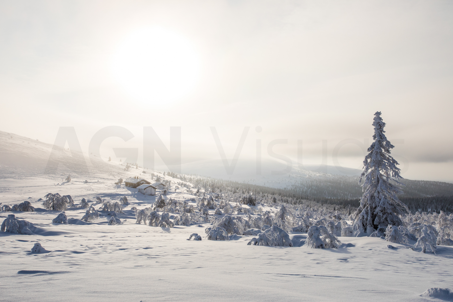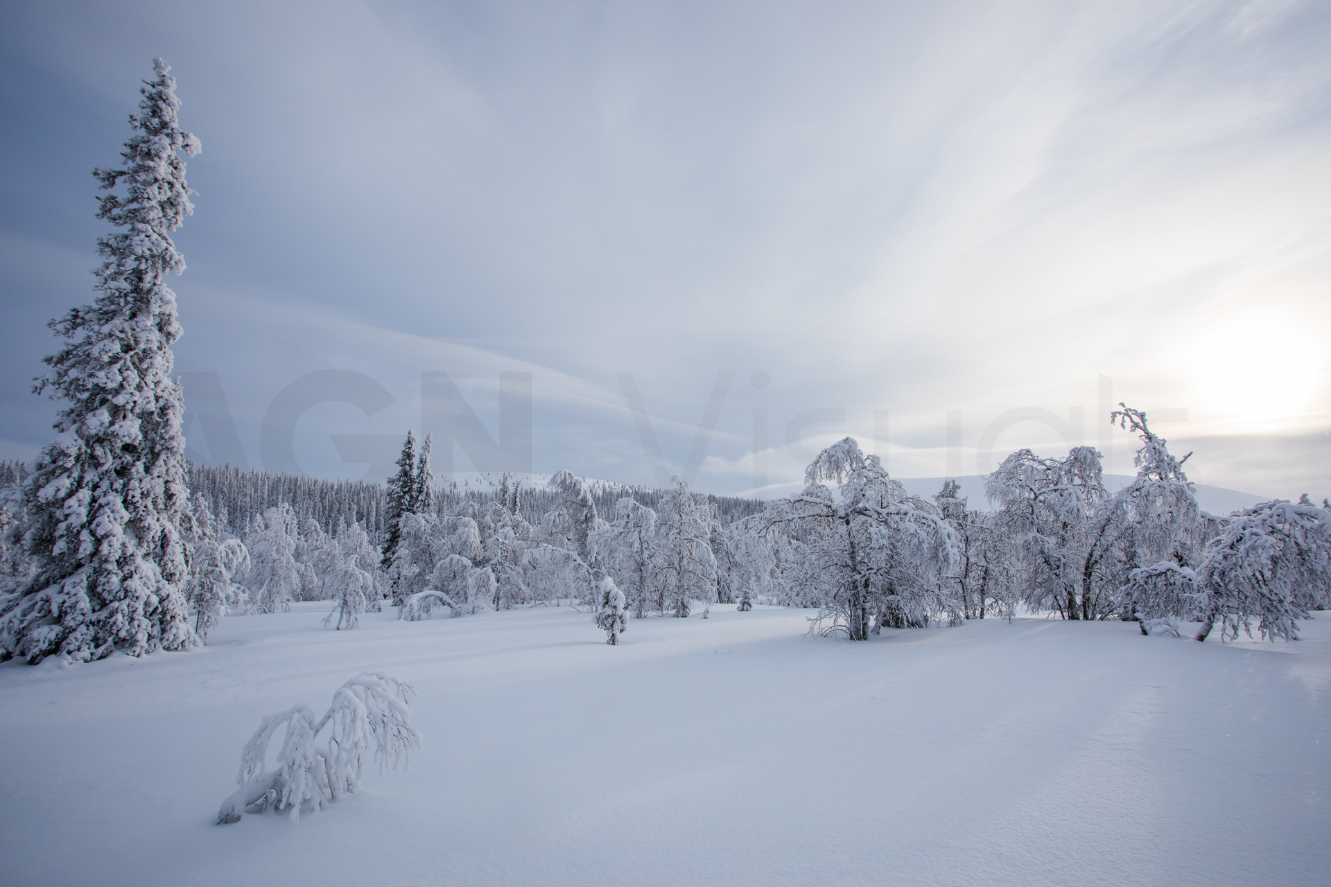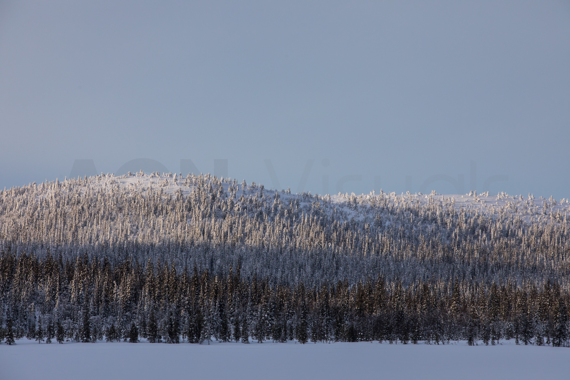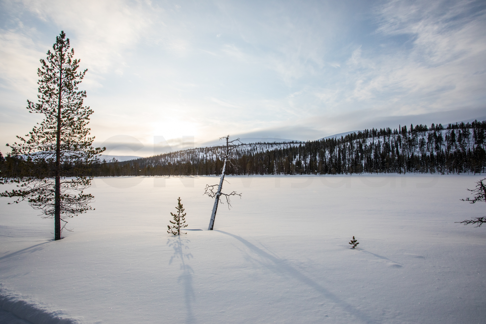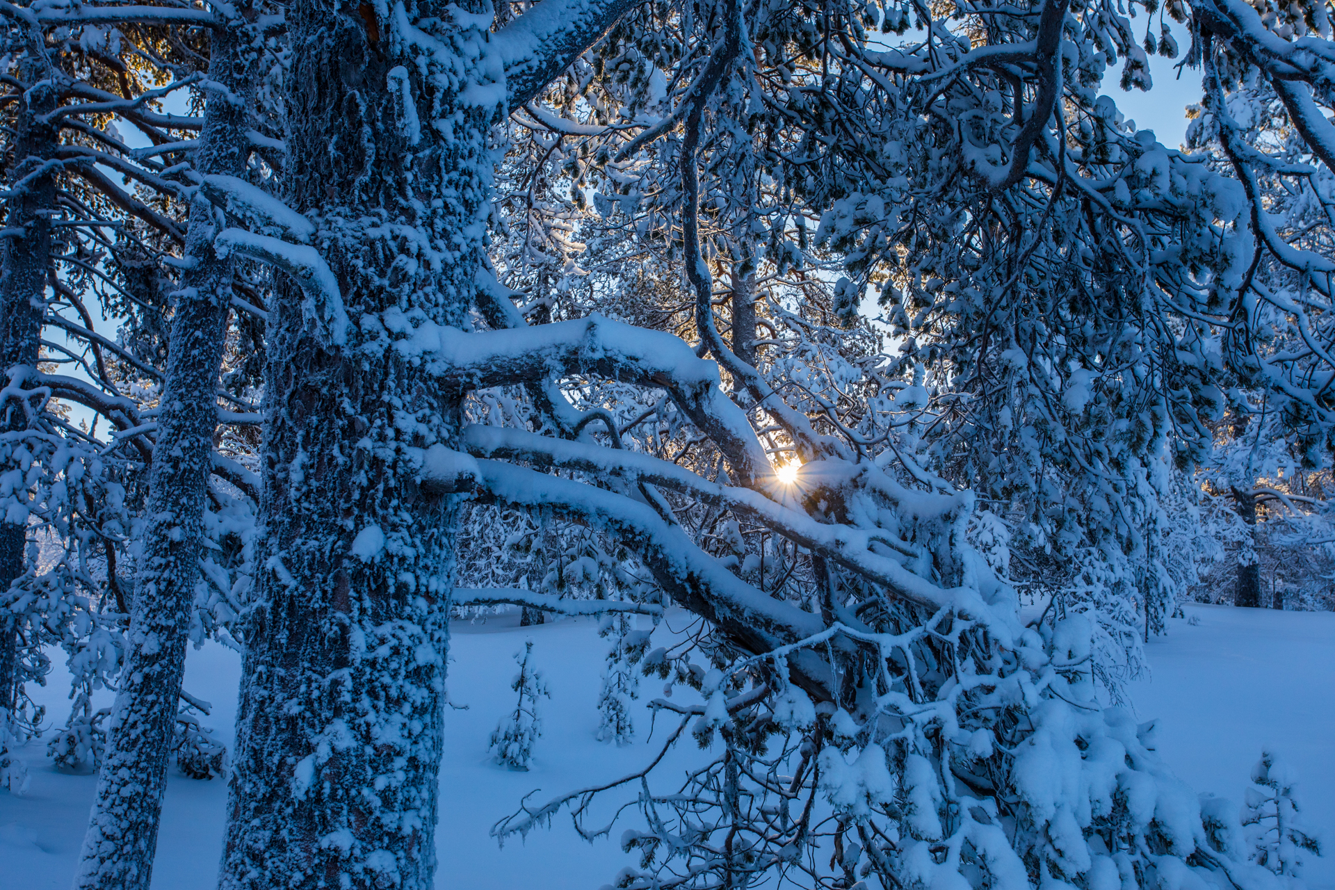 Hoy será un día tranquilo y de disfrutar el paisaje, así como de fotografiarlo. Salgo con los esquís pero sin la pulka, solo llevo la mochila. Subo a la colina más alta, pero hay nubes arriba que no permiten ver el paisaje, así que bajo un poco más. Voy un poco más adentro del bosque para fotografiar los árboles cubiertos de nieve.