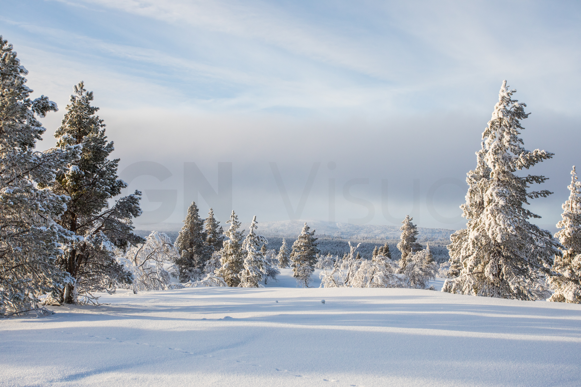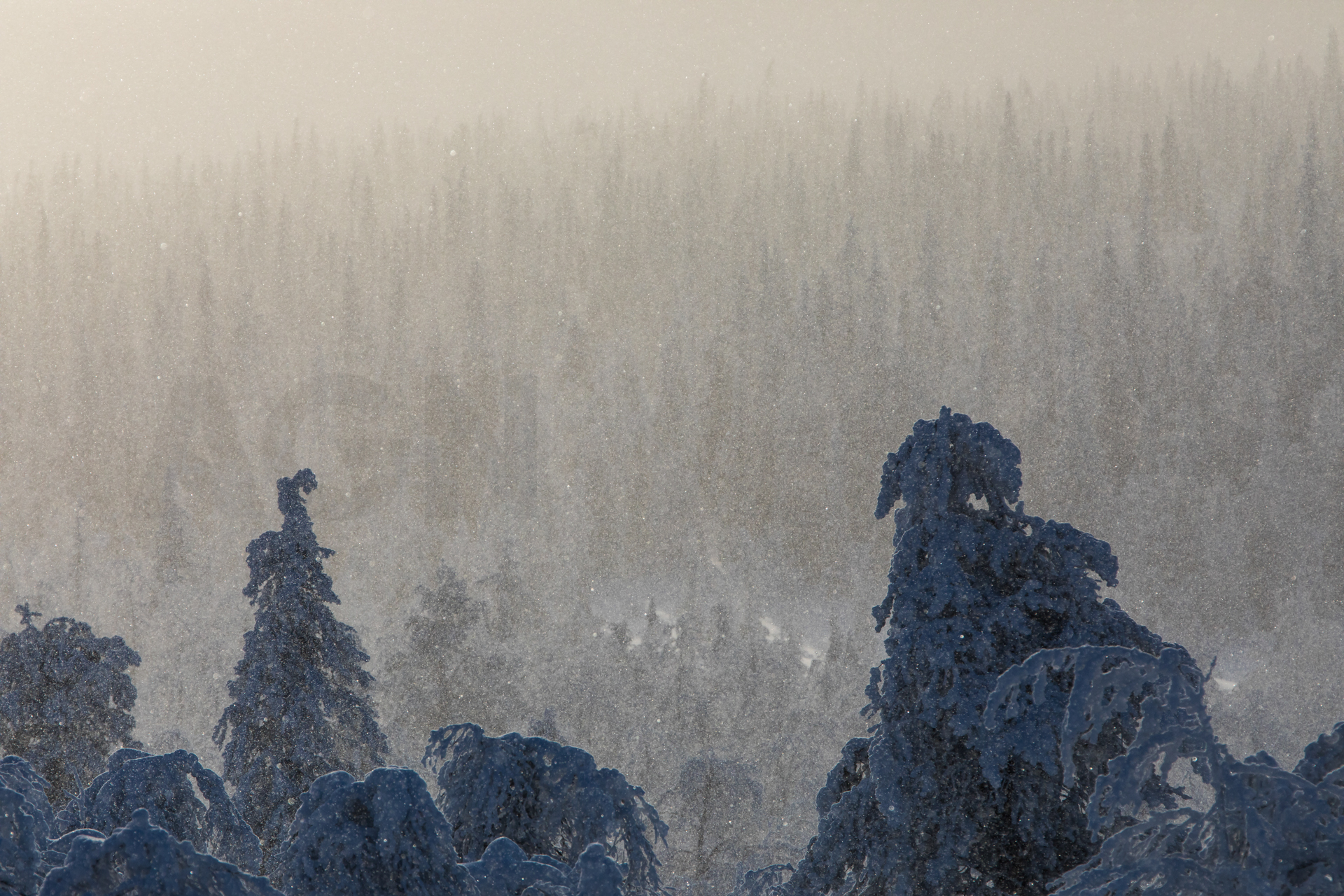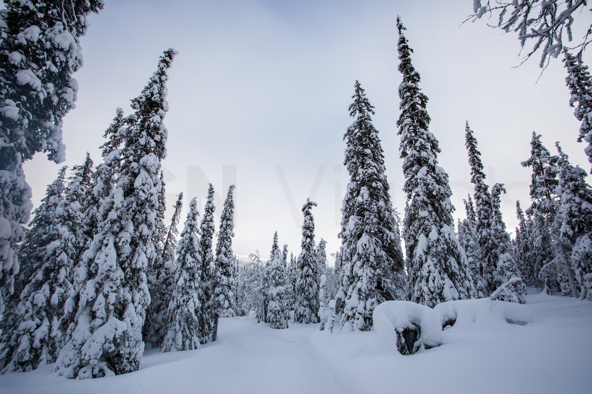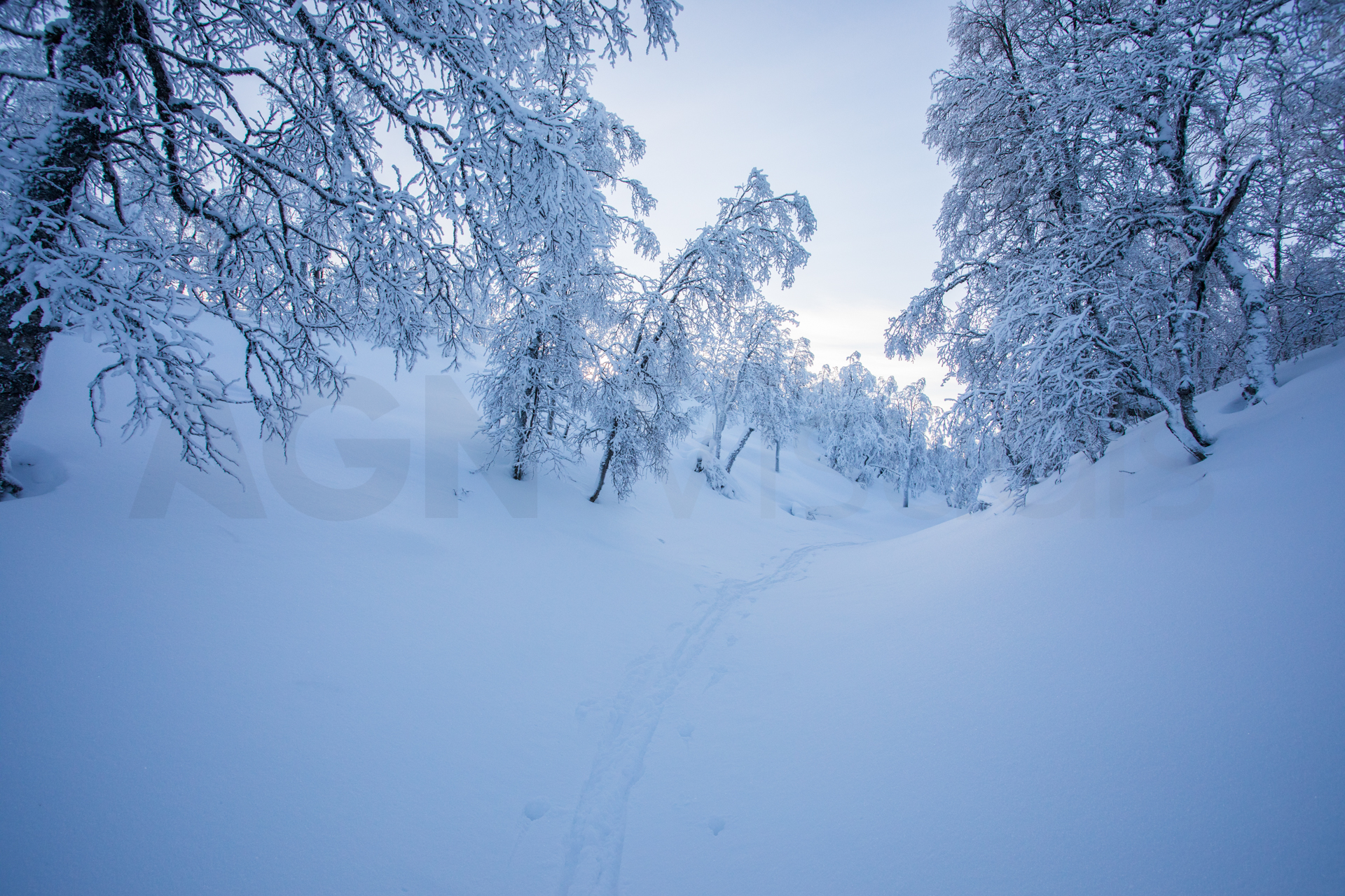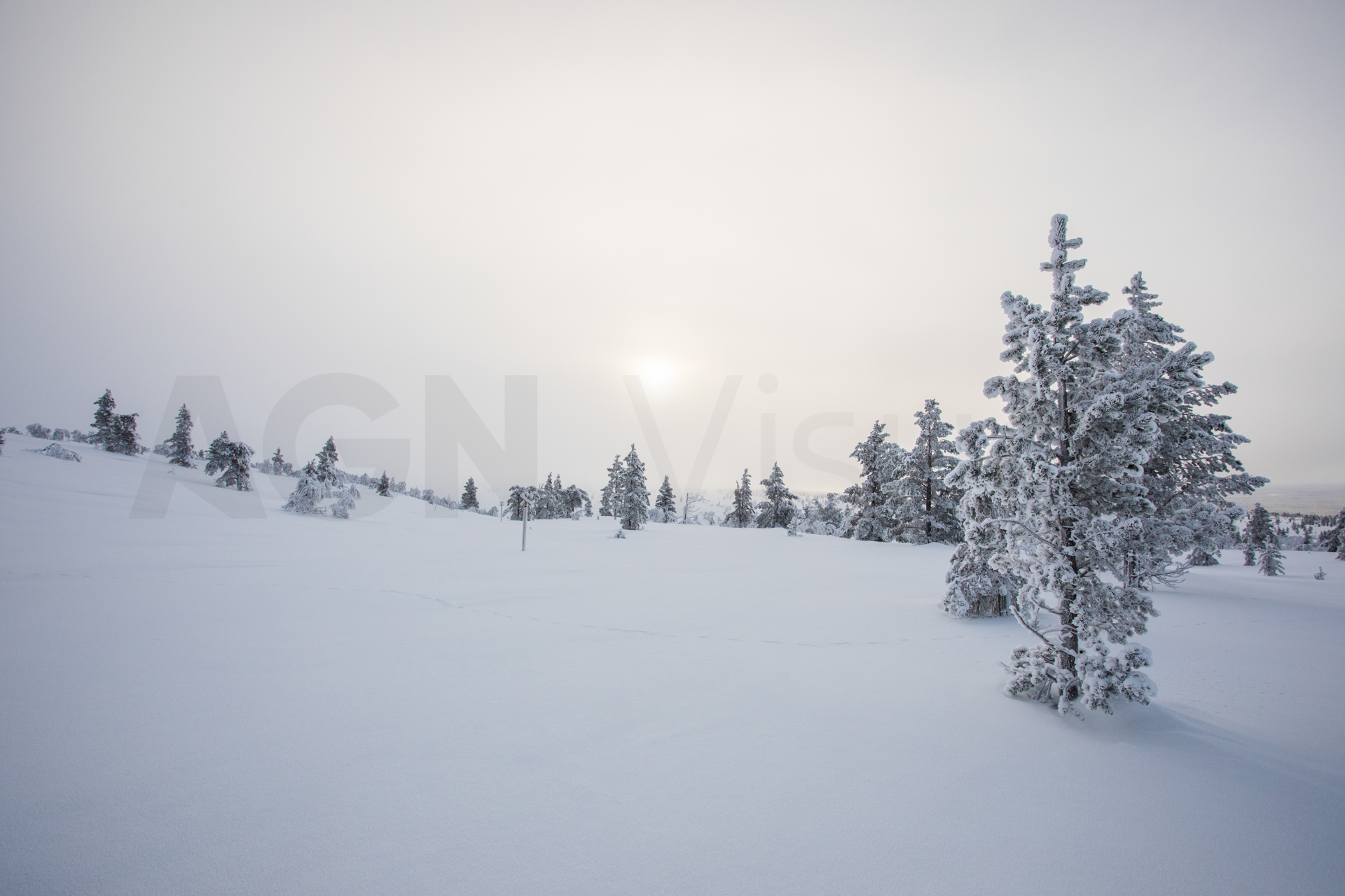 Hoy será un día tranquilo y de disfrutar el paisaje, así como de fotografiarlo. Salgo con los esquís pero sin la pulka, solo llevo la mochila. Subo a la colina más alta, pero hay nubes arriba que no permiten ver el paisaje, así que bajo un poco más. Voy un poco más adentro del bosque para fotografiar los árboles cubiertos de nieve.