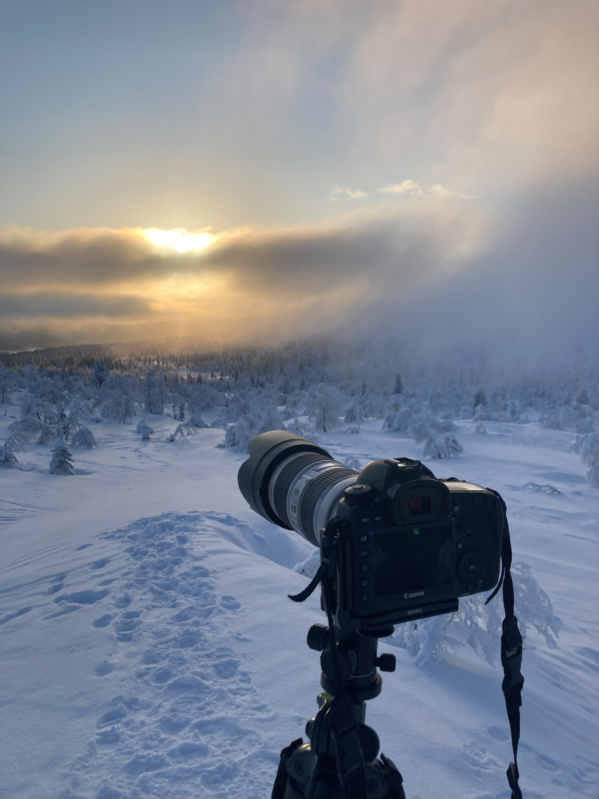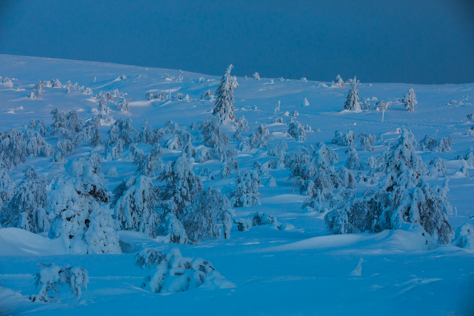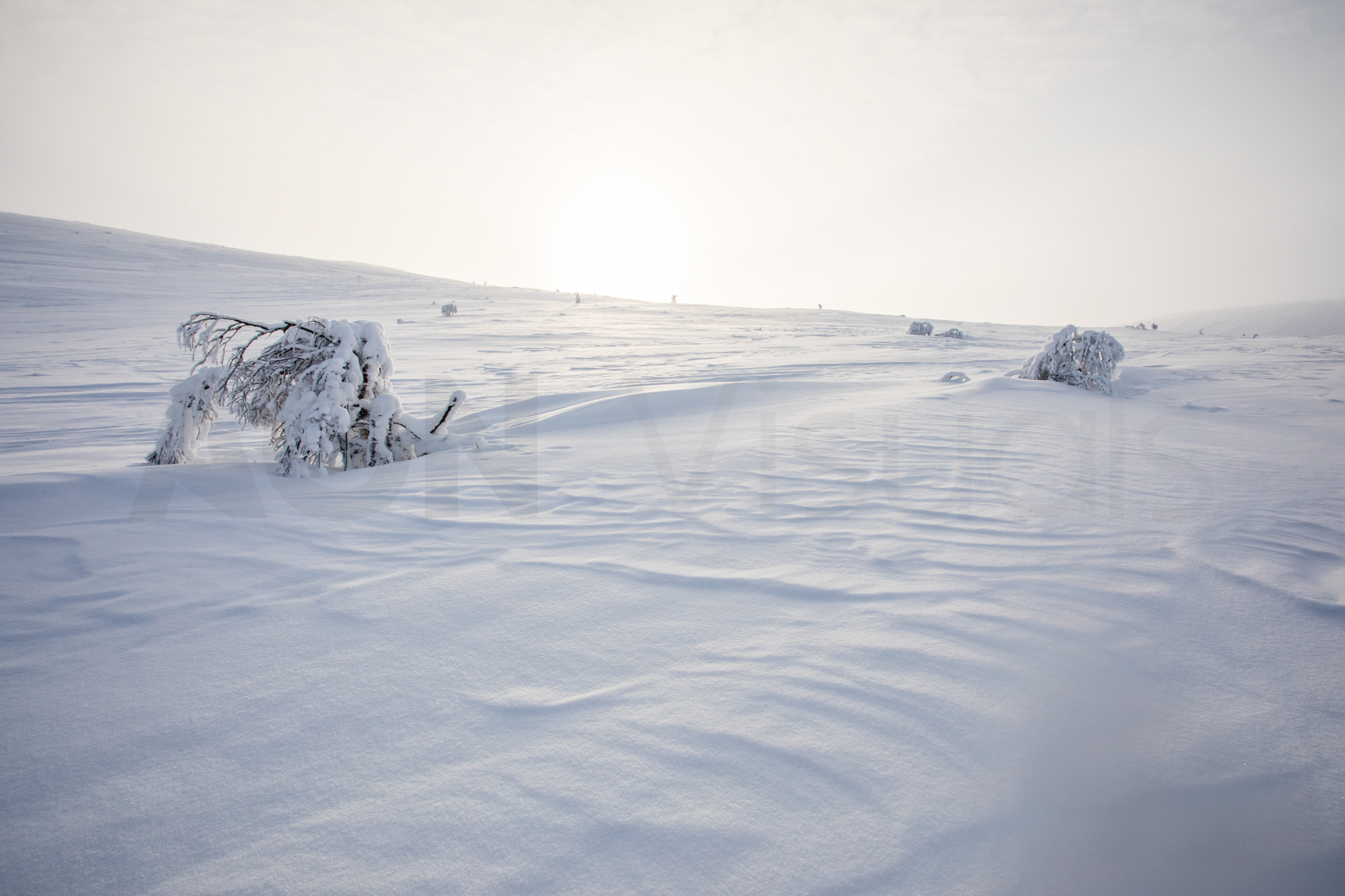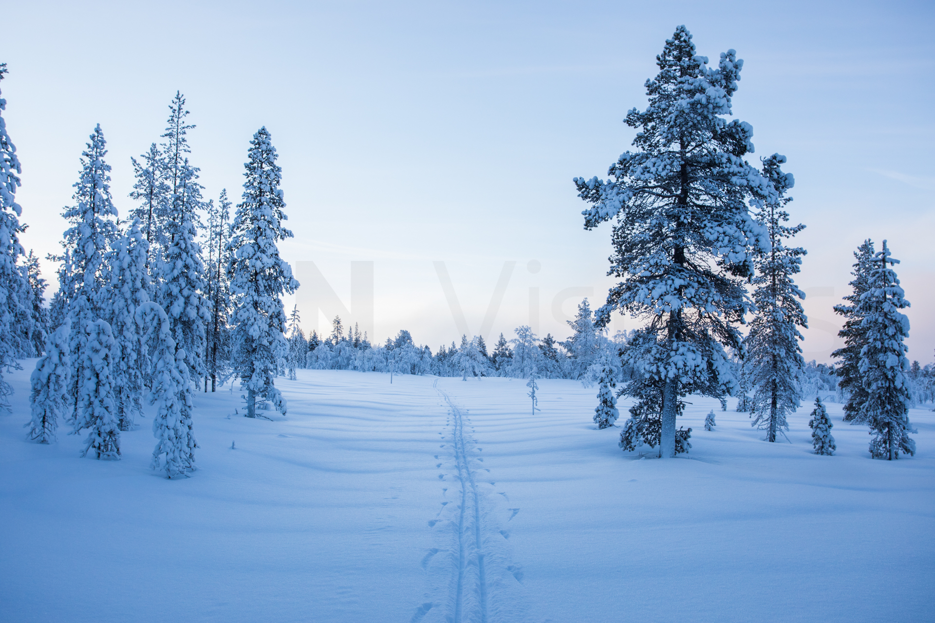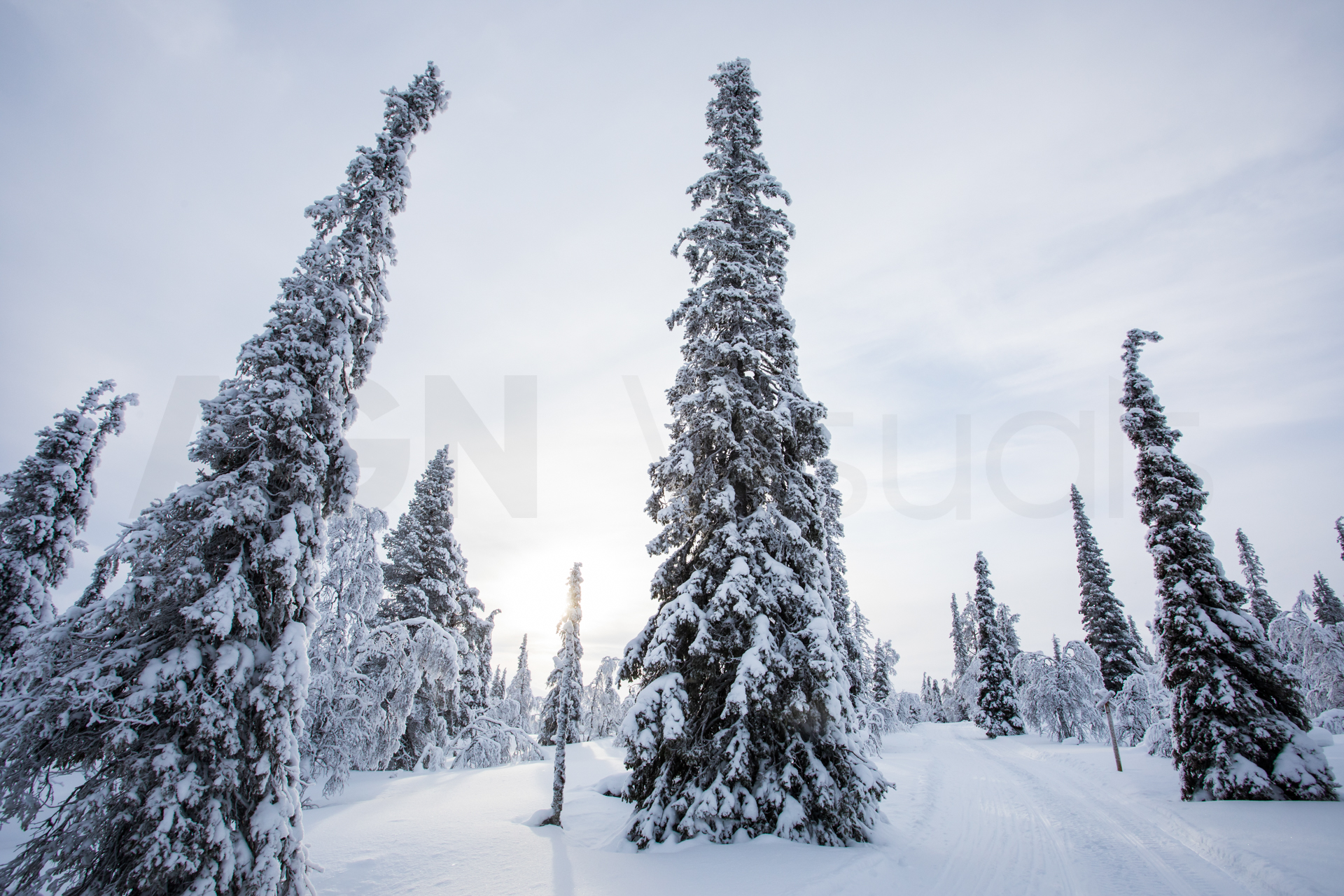 Hoy será un día tranquilo y de disfrutar el paisaje, así como de fotografiarlo. Salgo con los esquís pero sin la pulka, solo llevo la mochila. Subo a la colina más alta, pero hay nubes arriba que no permiten ver el paisaje, así que bajo un poco más. Voy un poco más adentro del bosque para fotografiar los árboles cubiertos de nieve.