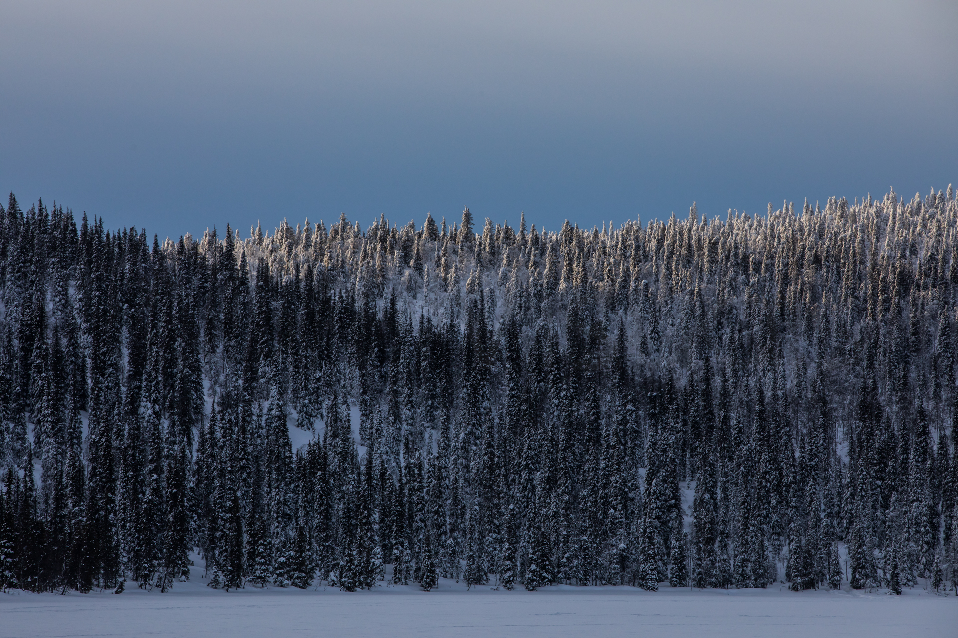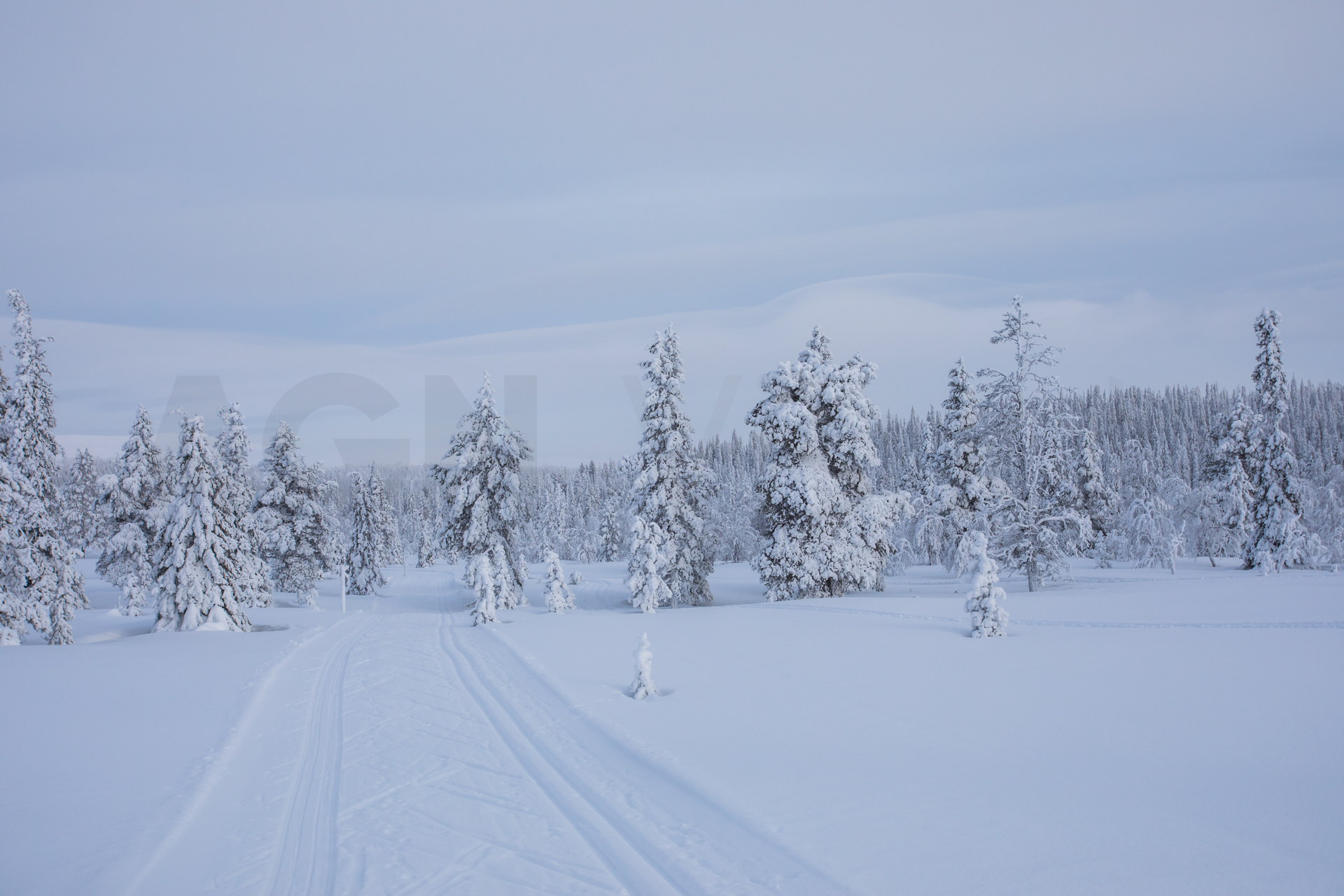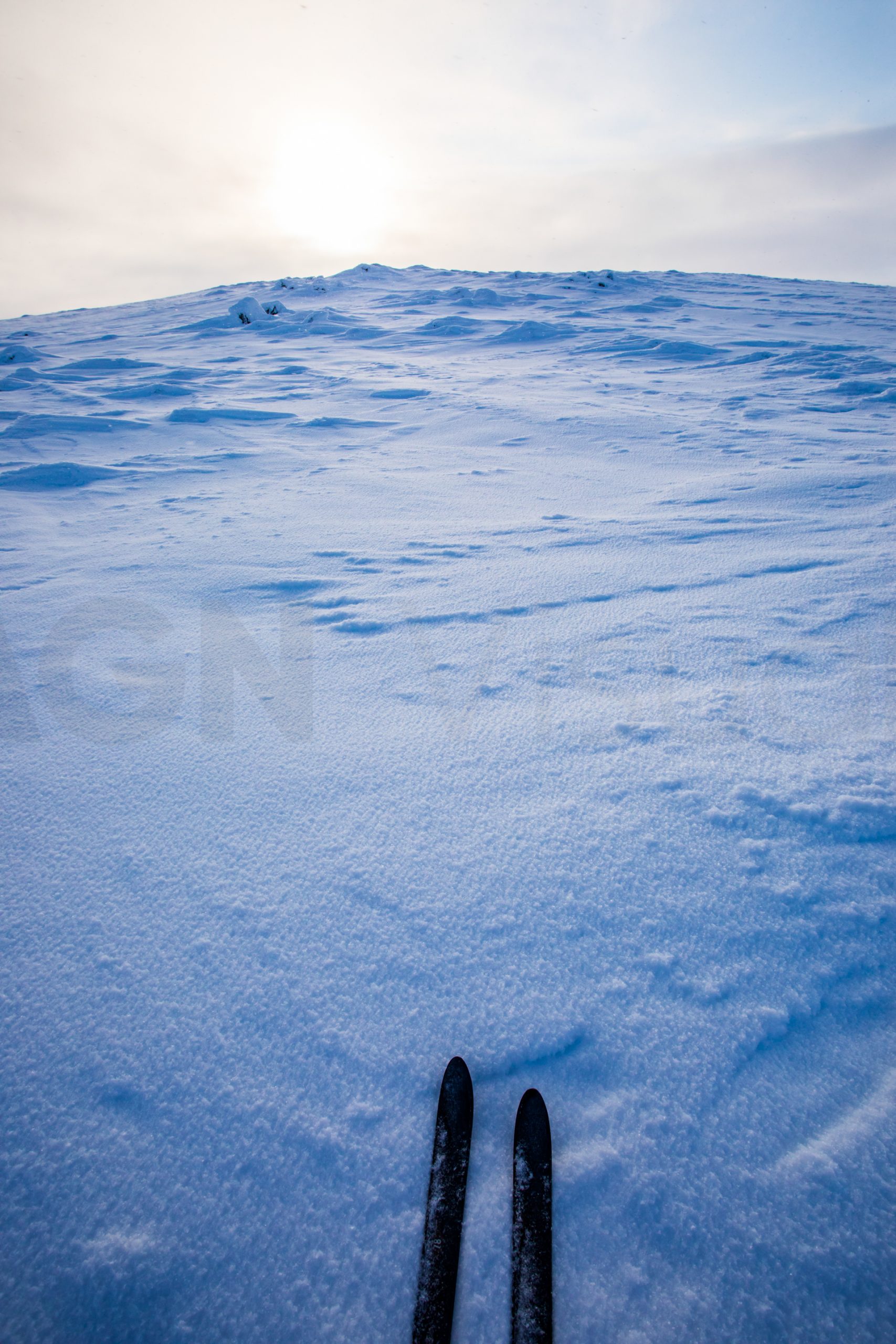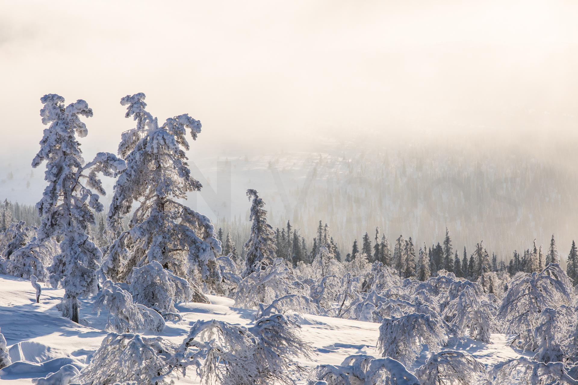 Hoy será un día tranquilo y de disfrutar el paisaje, así como de fotografiarlo. Salgo con los esquís pero sin la pulka, solo llevo la mochila. Subo a la colina más alta, pero hay nubes arriba que no permiten ver el paisaje, así que bajo un poco más. Voy un poco más adentro del bosque para fotografiar los árboles cubiertos de nieve.