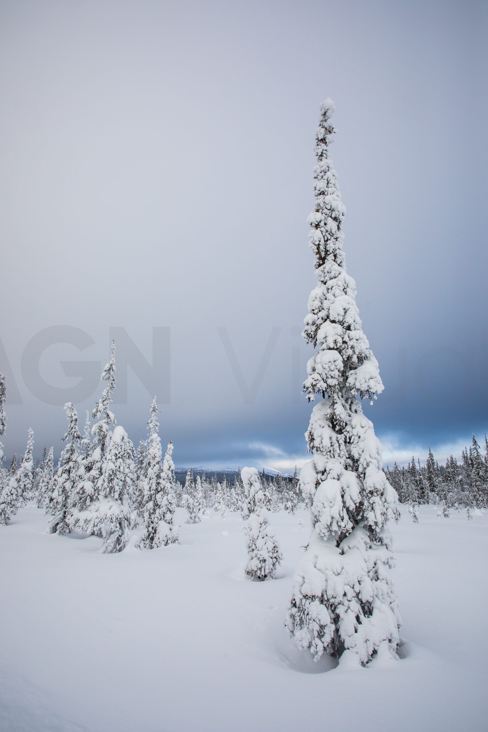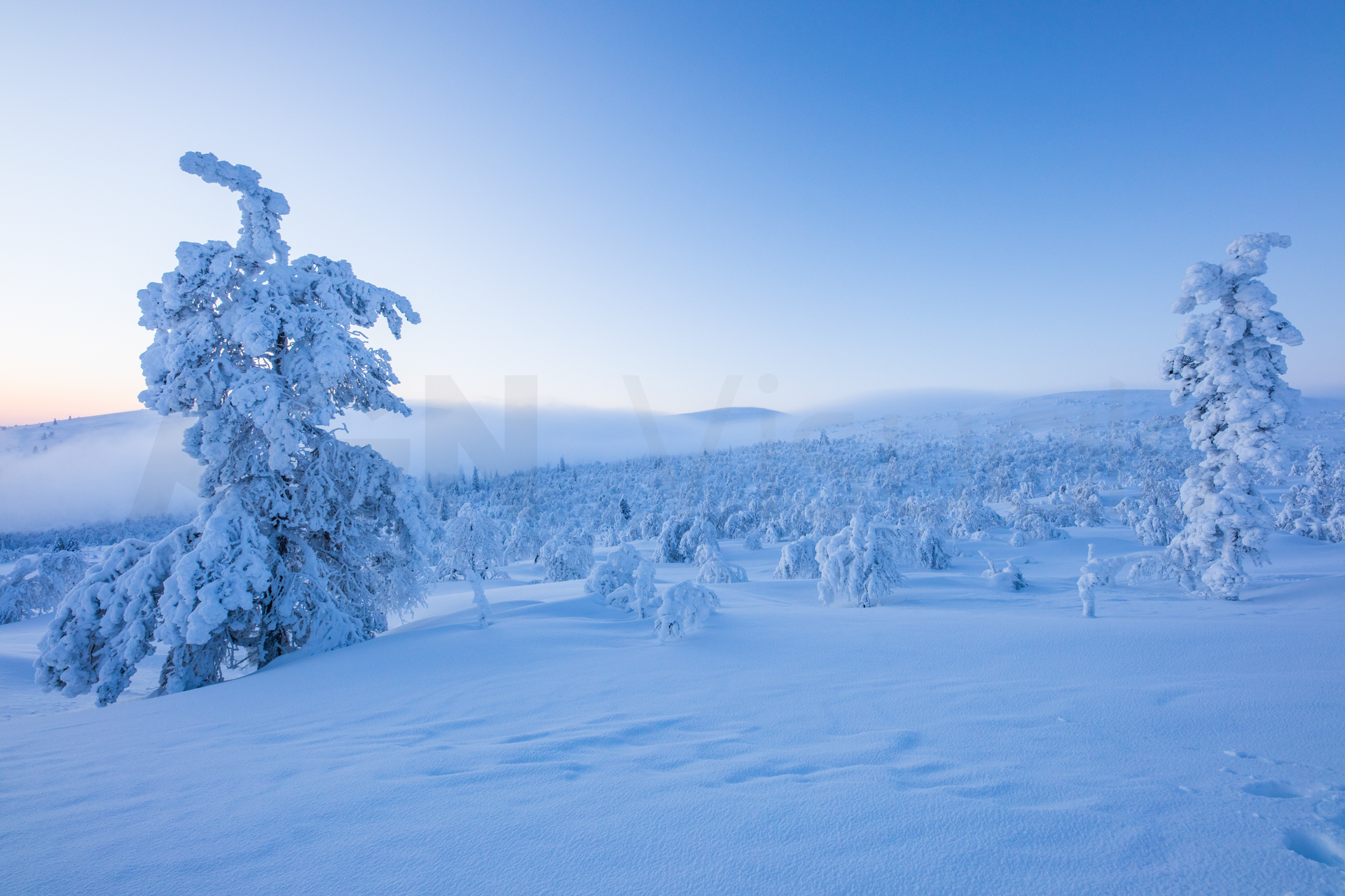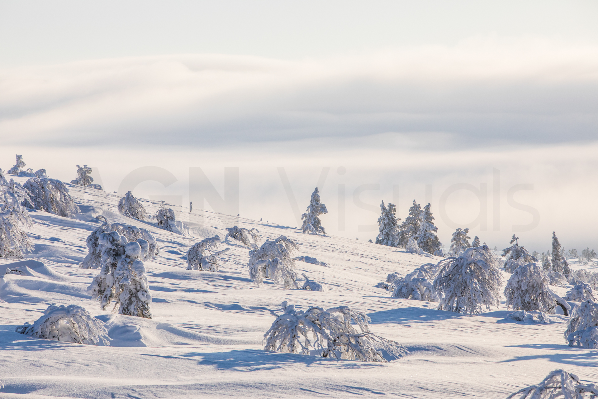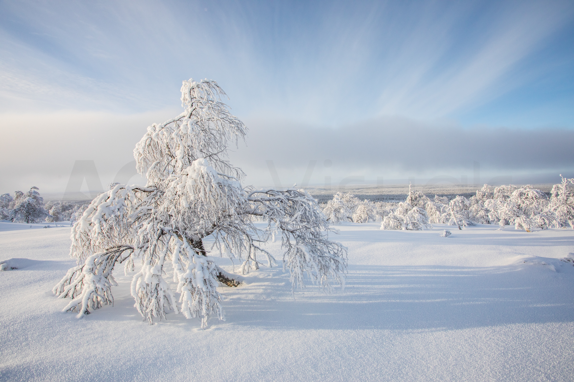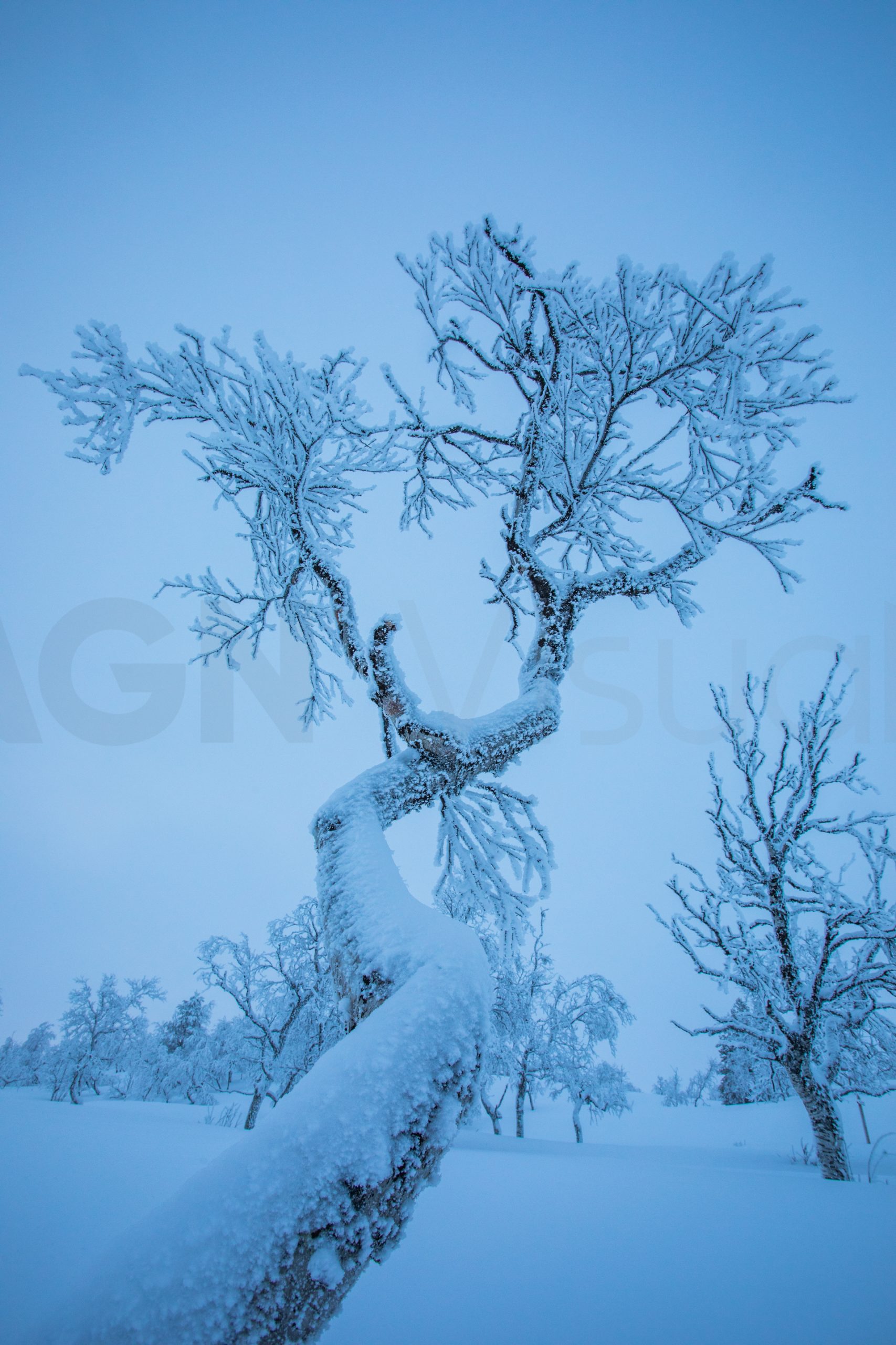 Hoy será un día tranquilo y de disfrutar el paisaje, así como de fotografiarlo. Salgo con los esquís pero sin la pulka, solo llevo la mochila. Subo a la colina más alta, pero hay nubes arriba que no permiten ver el paisaje, así que bajo un poco más. Voy un poco más adentro del bosque para fotografiar los árboles cubiertos de nieve.