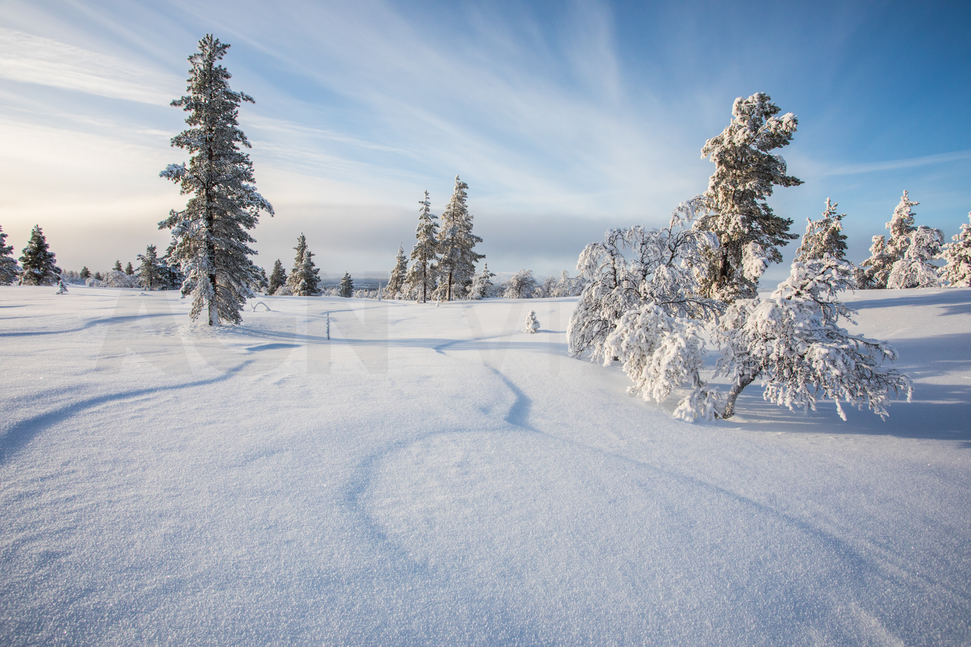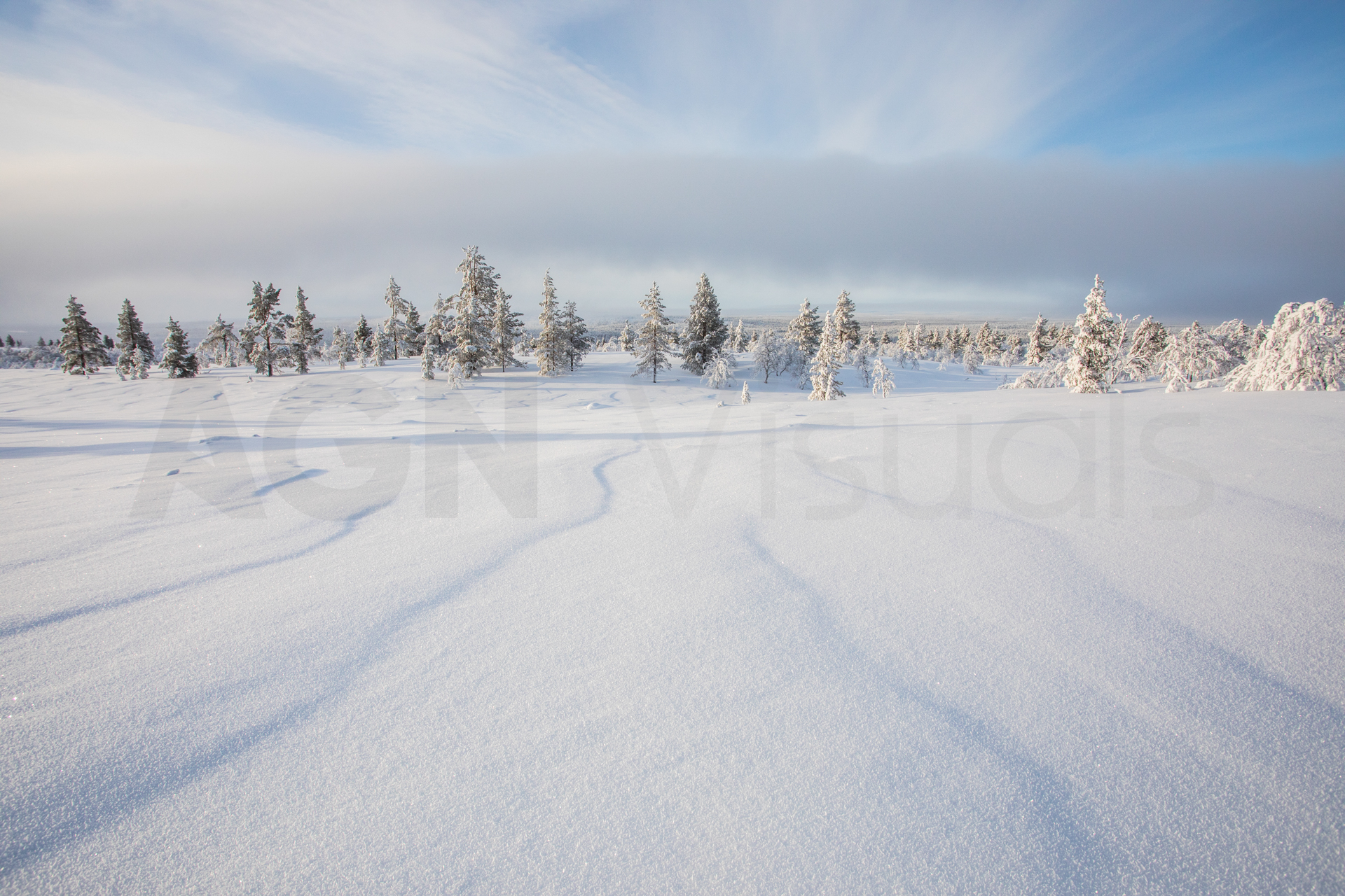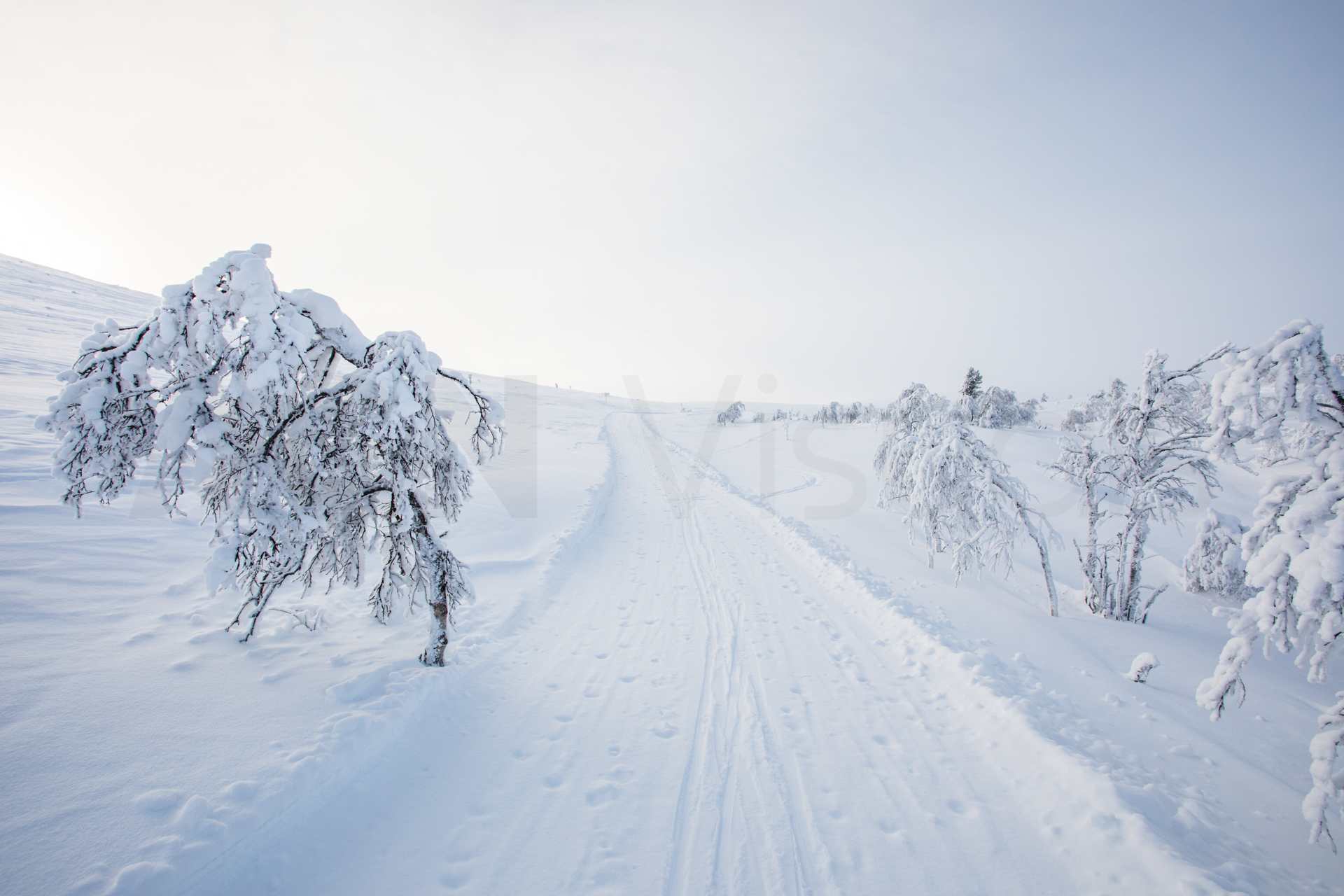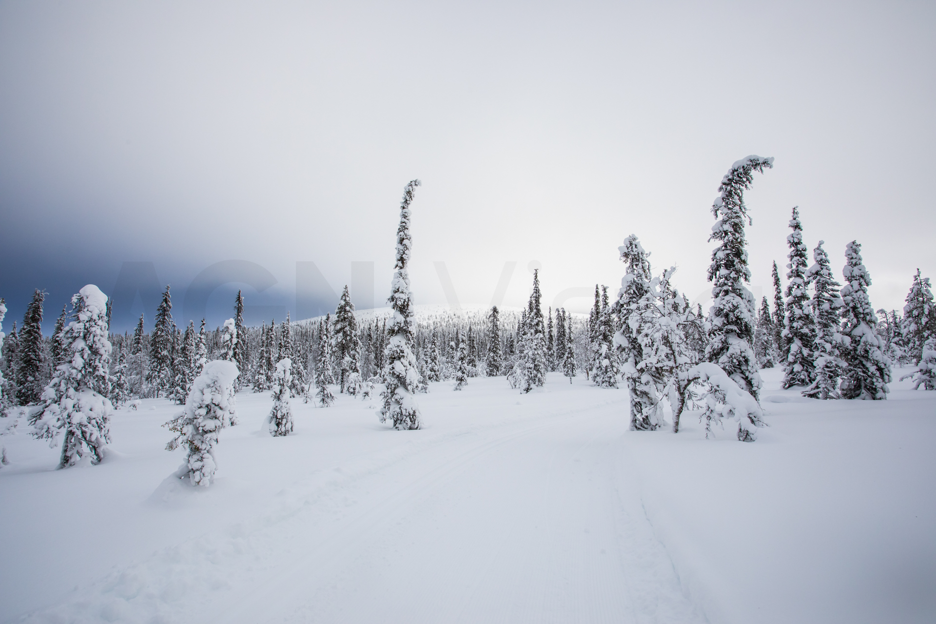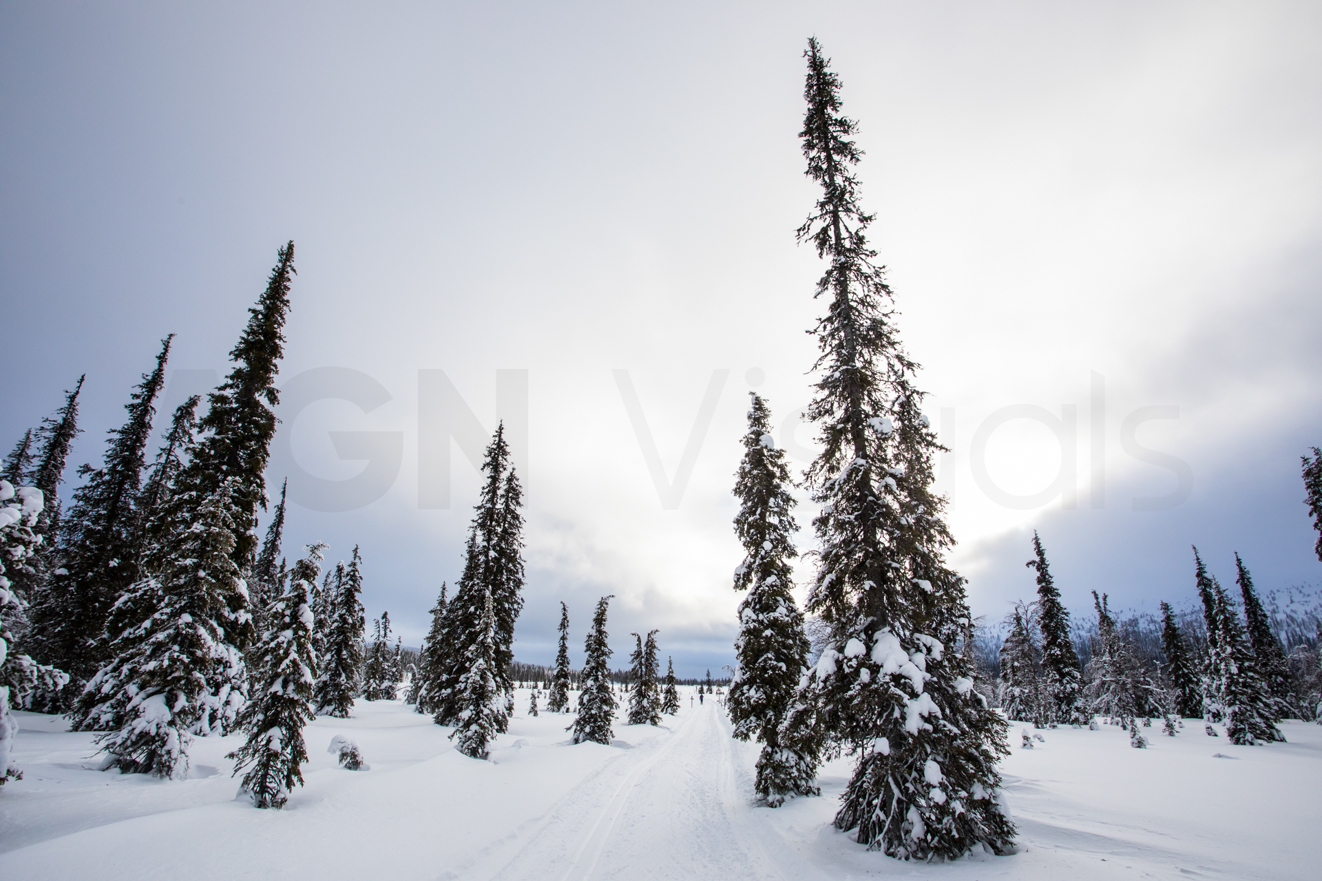 Hoy será un día tranquilo y de disfrutar el paisaje, así como de fotografiarlo. Salgo con los esquís pero sin la pulka, solo llevo la mochila. Subo a la colina más alta, pero hay nubes arriba que no permiten ver el paisaje, así que bajo un poco más. Voy un poco más adentro del bosque para fotografiar los árboles cubiertos de nieve.