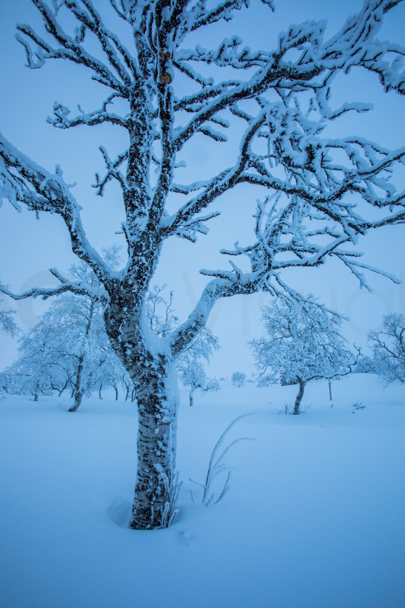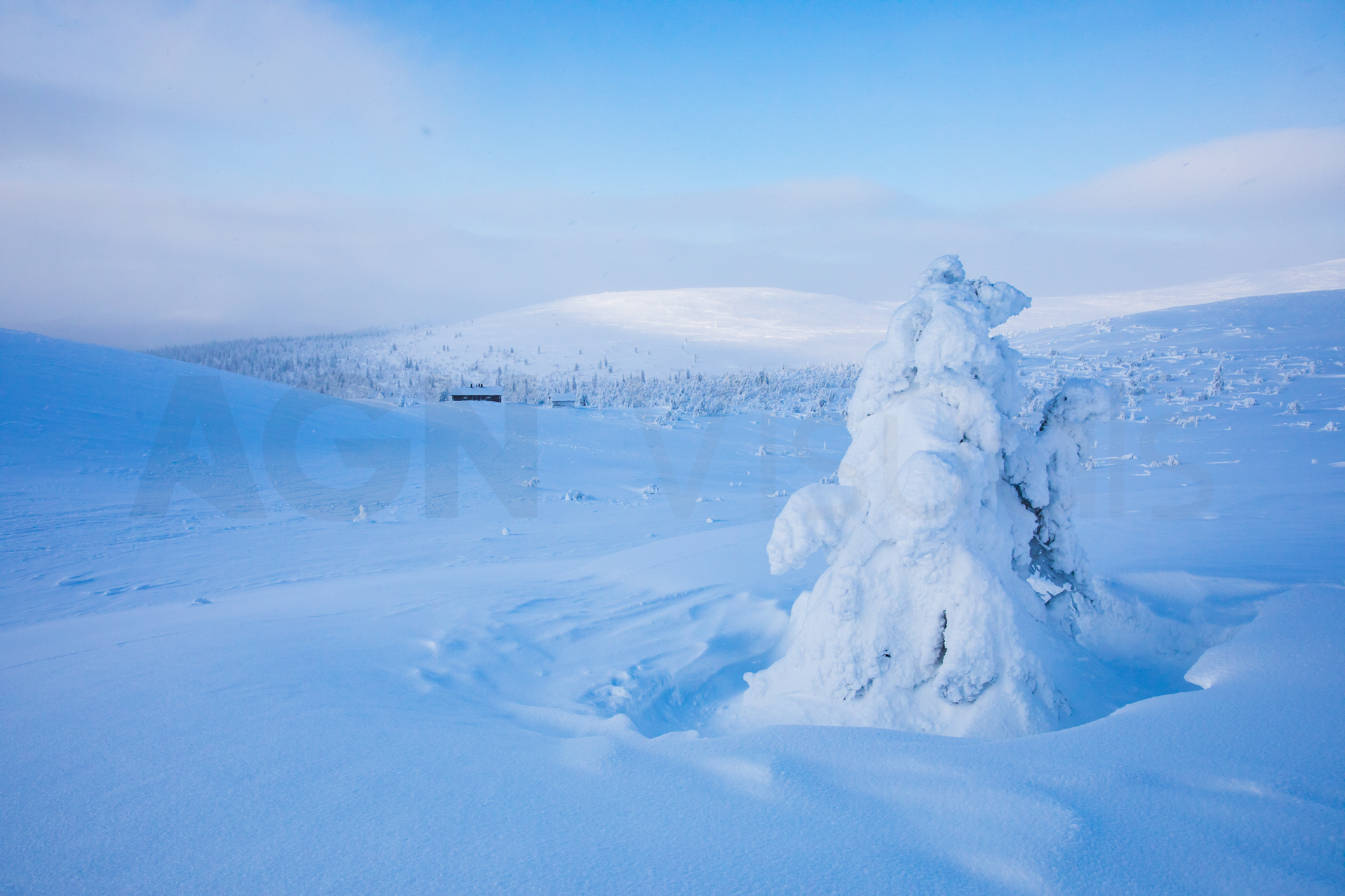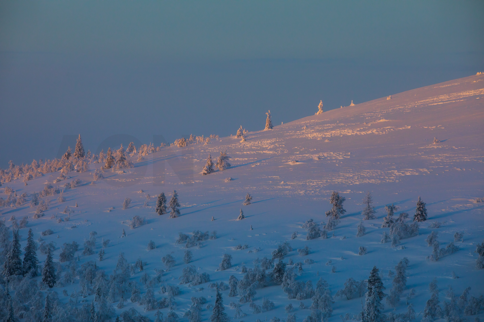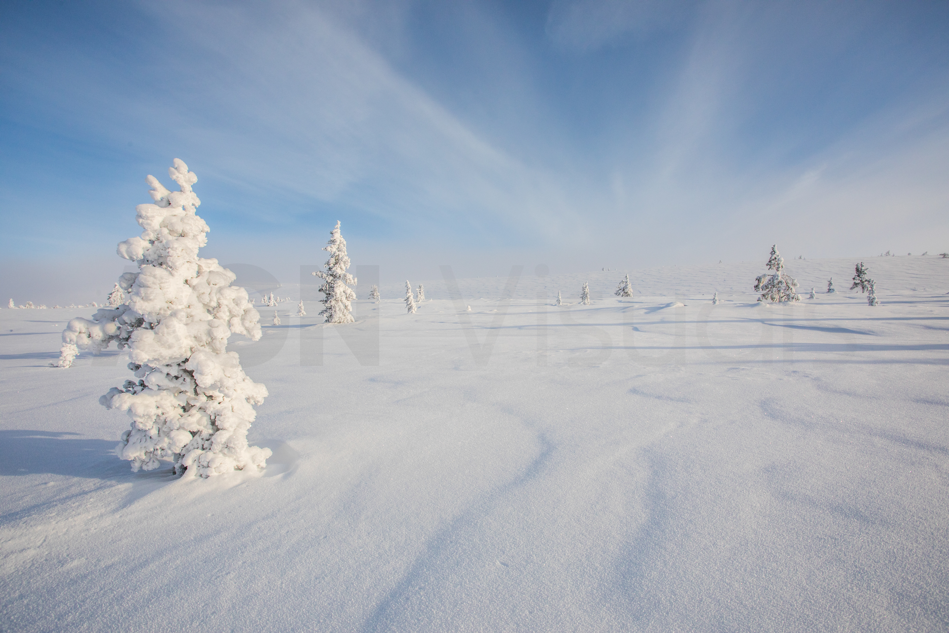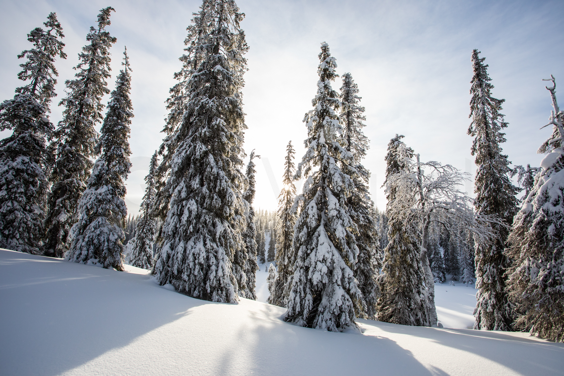 Hoy será un día tranquilo y de disfrutar el paisaje, así como de fotografiarlo. Salgo con los esquís pero sin la pulka, solo llevo la mochila. Subo a la colina más alta, pero hay nubes arriba que no permiten ver el paisaje, así que bajo un poco más. Voy un poco más adentro del bosque para fotografiar los árboles cubiertos de nieve.
