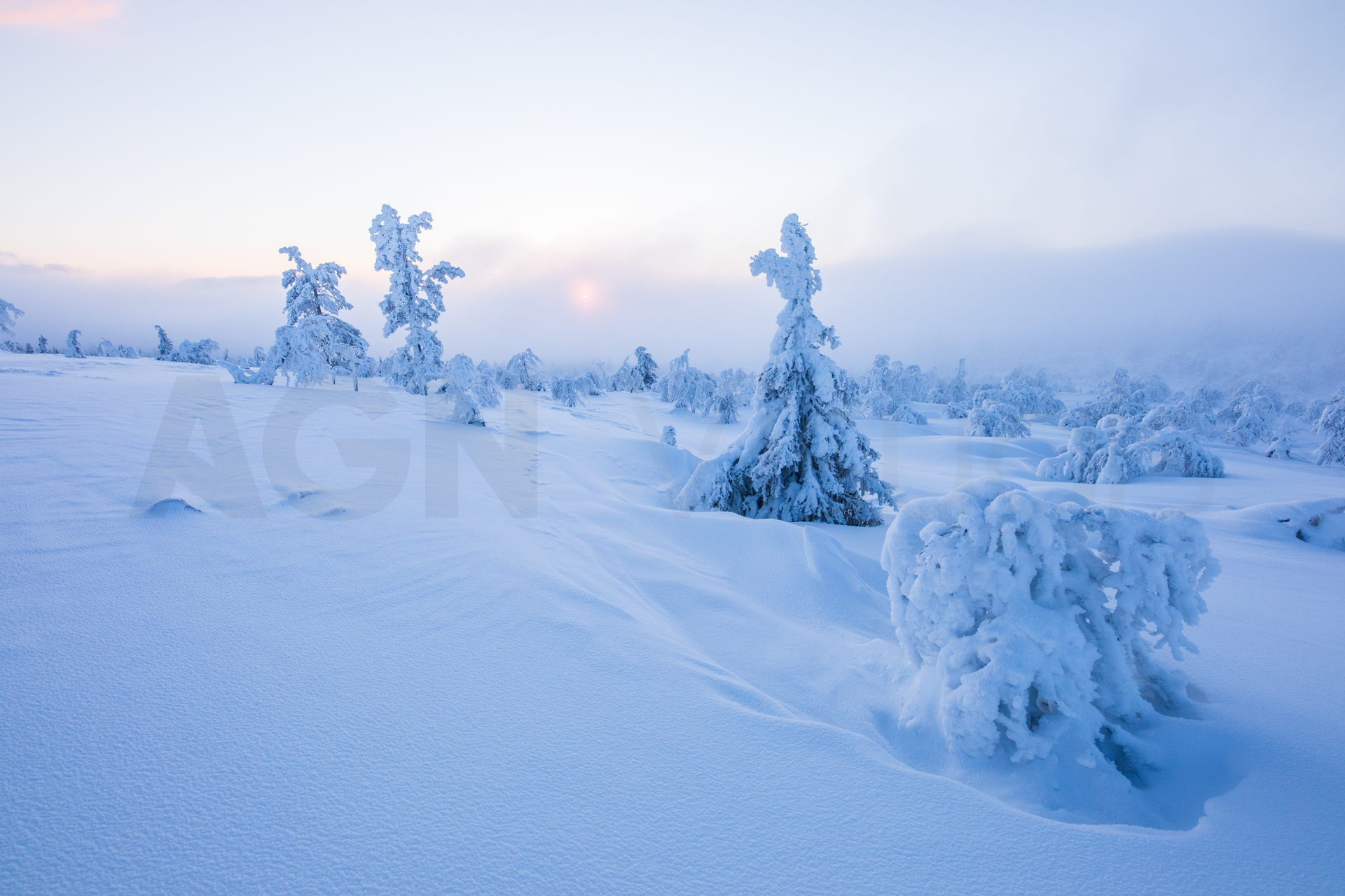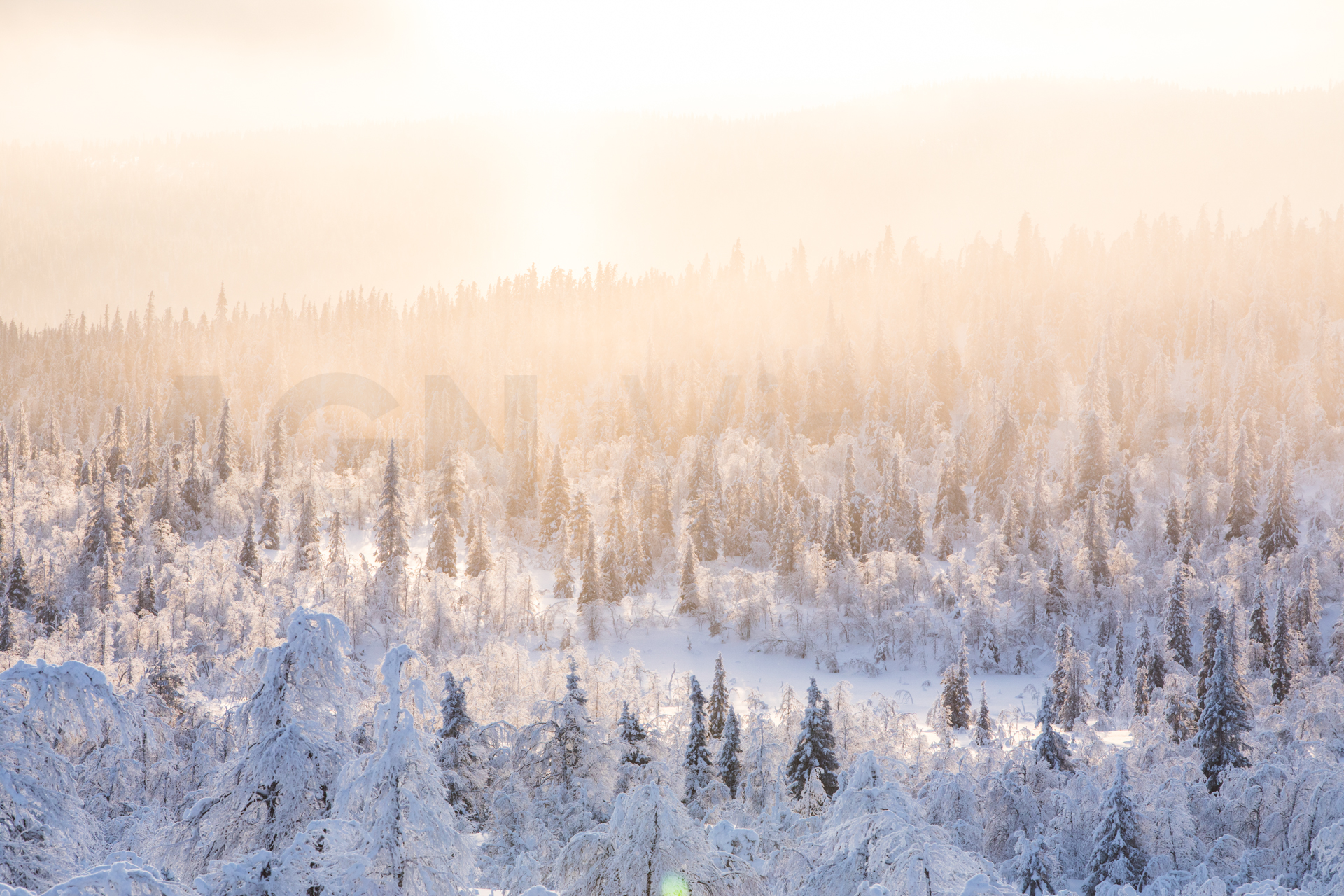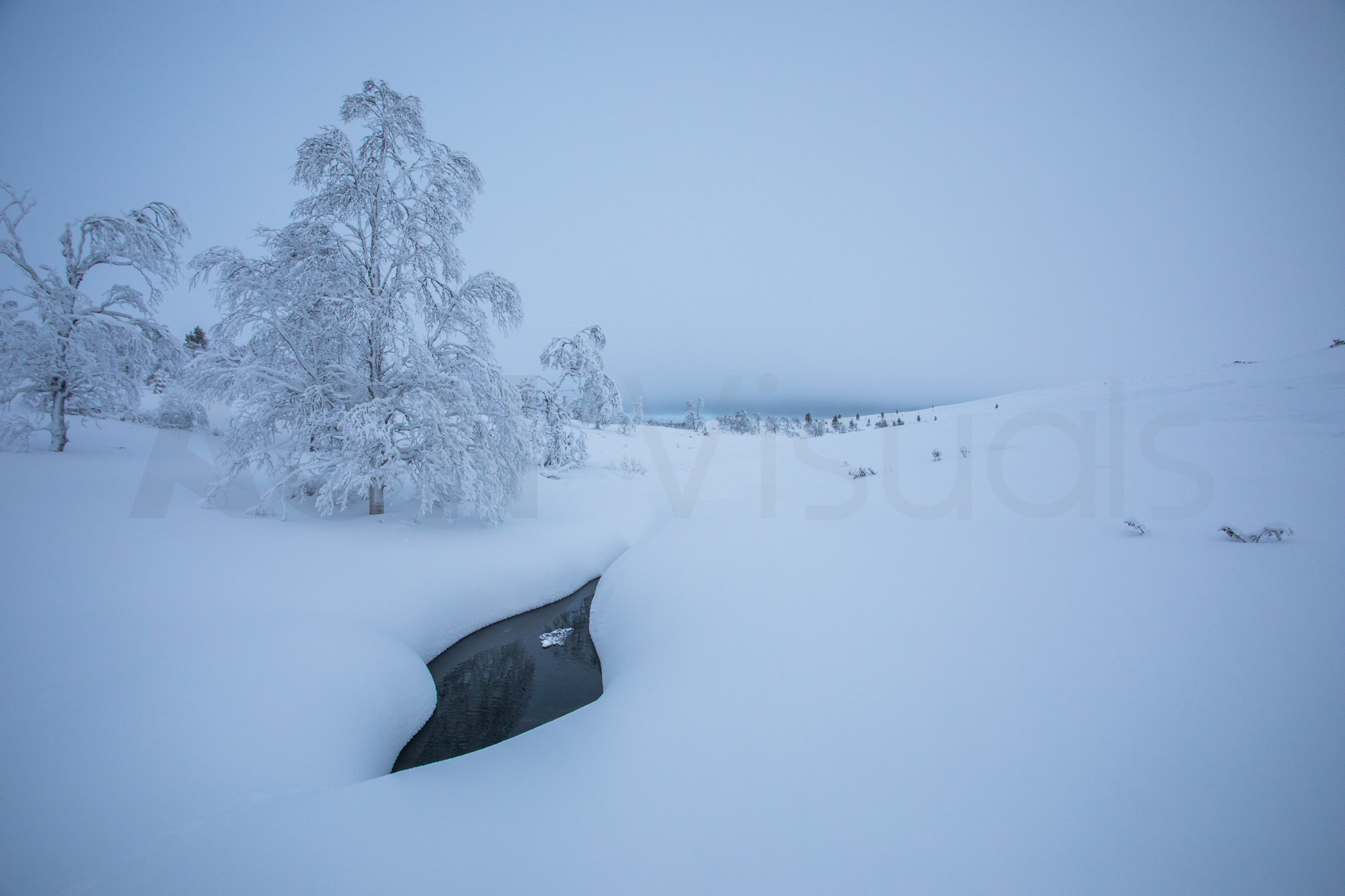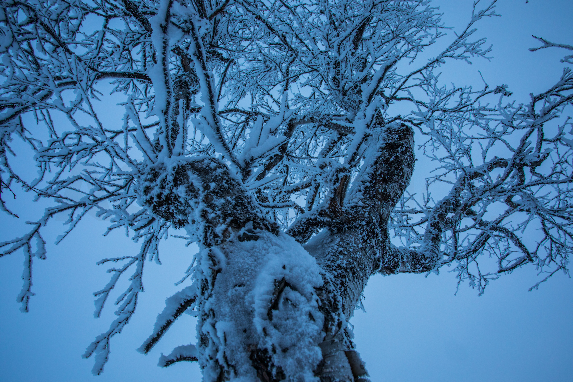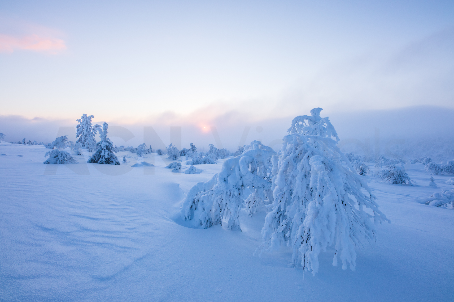 Hoy será un día tranquilo y de disfrutar el paisaje, así como de fotografiarlo. Salgo con los esquís pero sin la pulka, solo llevo la mochila. Subo a la colina más alta, pero hay nubes arriba que no permiten ver el paisaje, así que bajo un poco más. Voy un poco más adentro del bosque para fotografiar los árboles cubiertos de nieve.