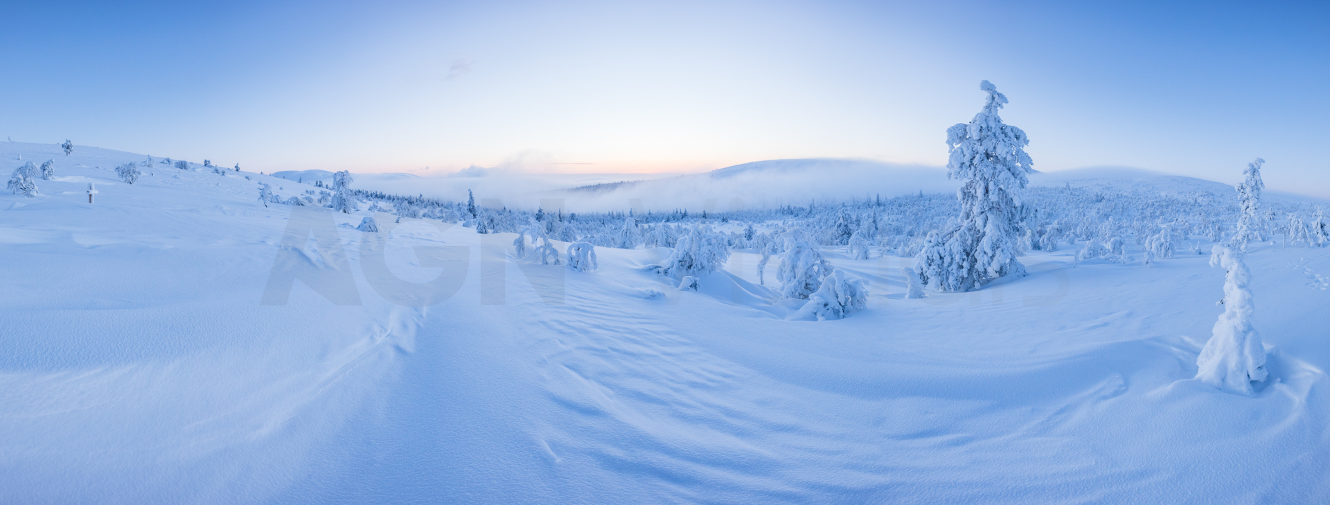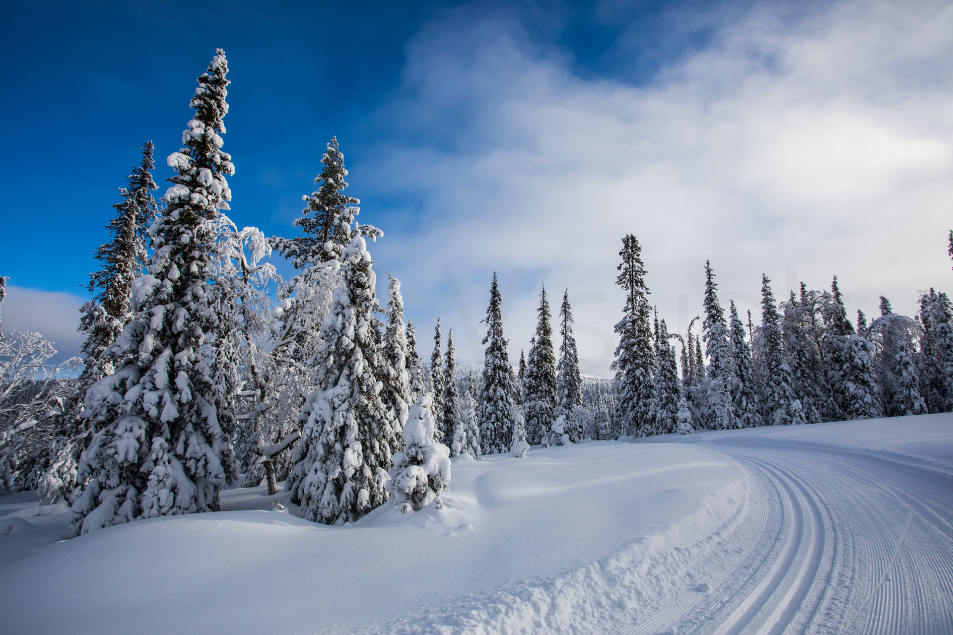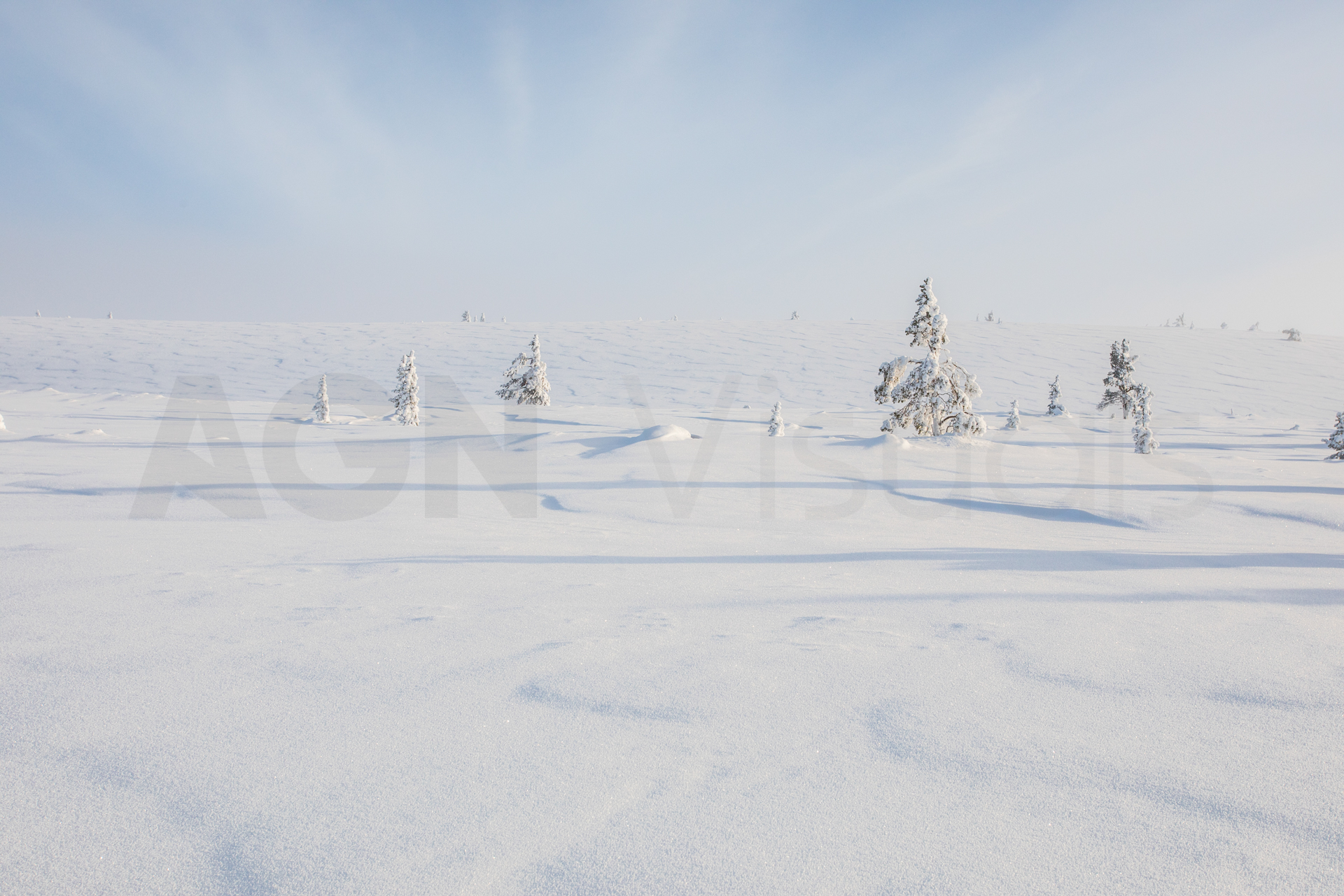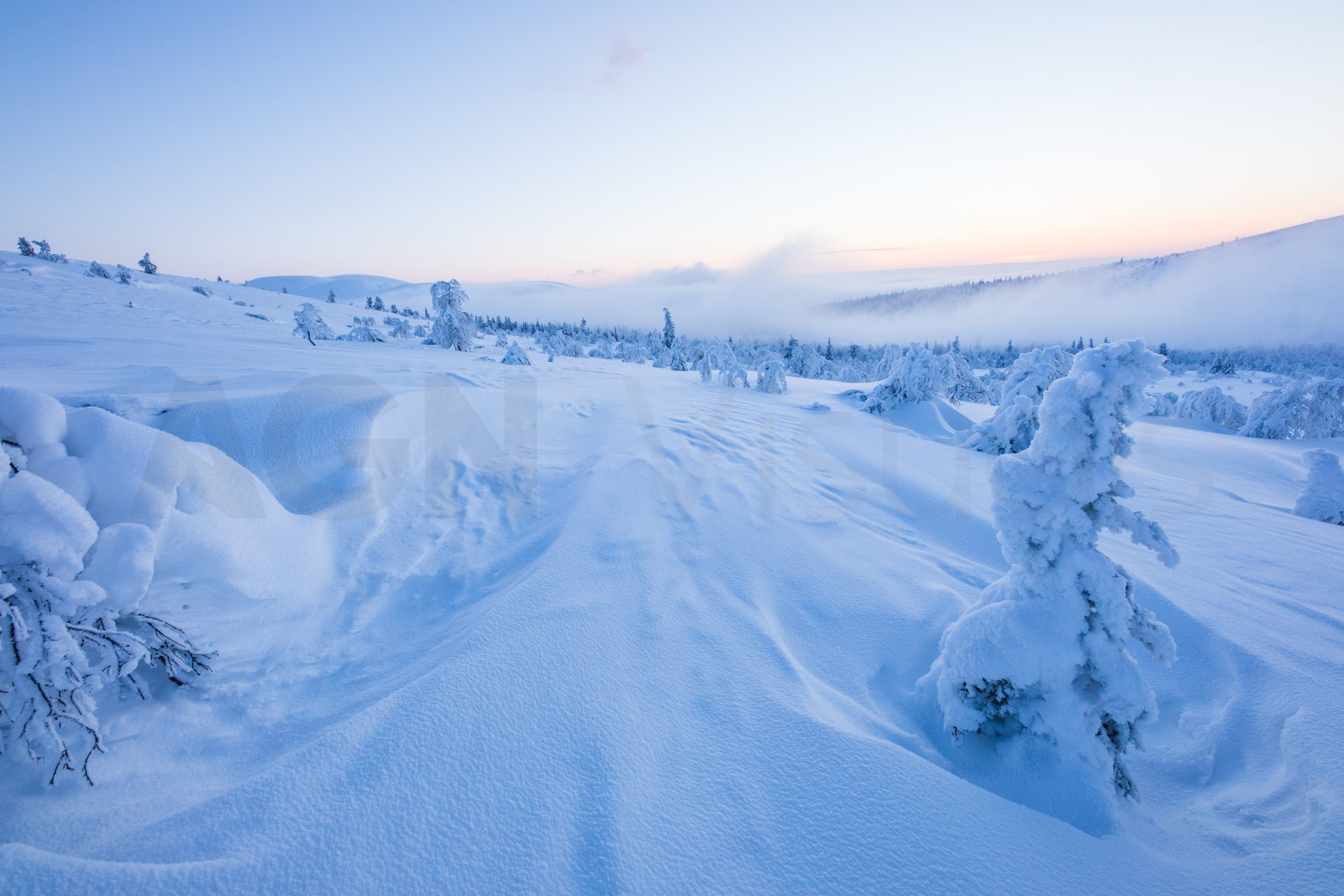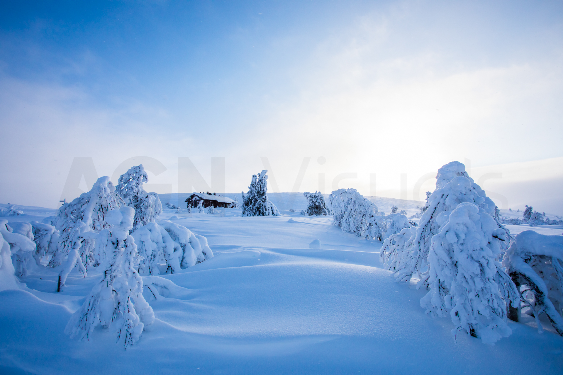 Hoy será un día tranquilo y de disfrutar el paisaje, así como de fotografiarlo. Salgo con los esquís pero sin la pulka, solo llevo la mochila. Subo a la colina más alta, pero hay nubes arriba que no permiten ver el paisaje, así que bajo un poco más. Voy un poco más adentro del bosque para fotografiar los árboles cubiertos de nieve.