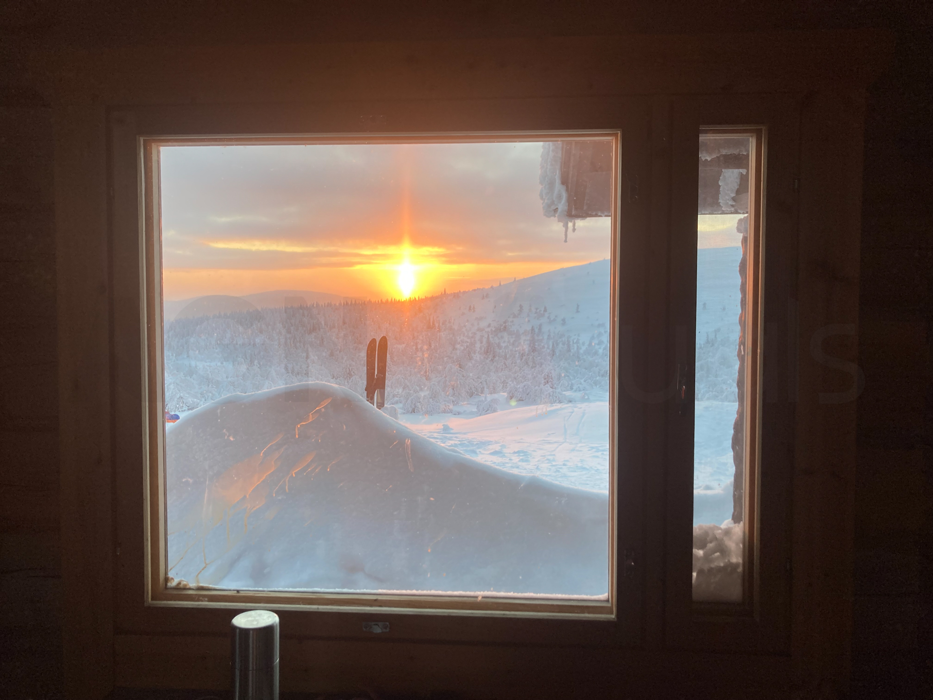 Entro en la cabaña, enciendo el fuego y preparo la comida. Salgo a disfrutar del paisaje y a tomar fotos. No puedo parar; el paisaje es realmente espectacular y cuando llega la puesta de sol, la mezcla del paisaje frío y el cálido sol es perfecta para las fotos.