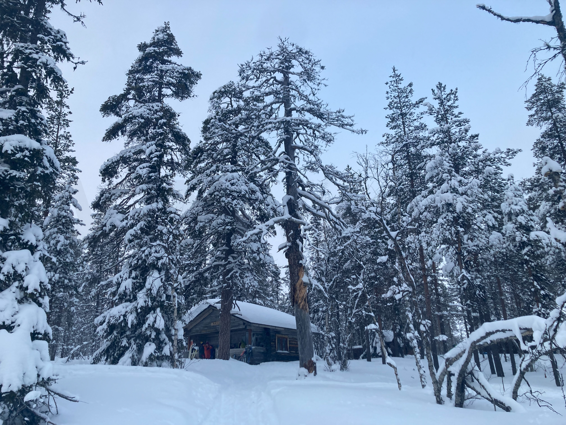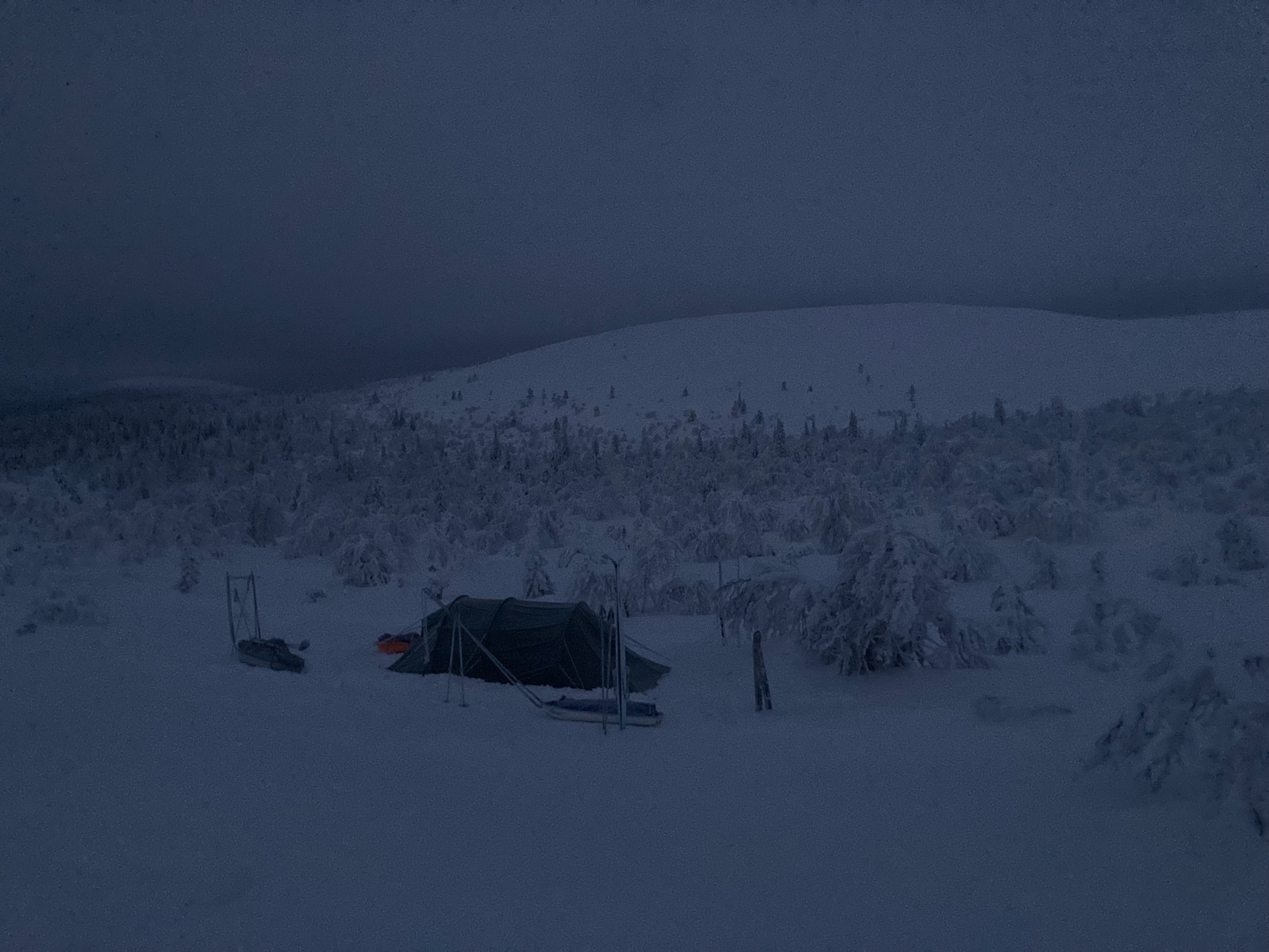 El problema fue que este breve tramo de 2 kilómetros fue muy duro. Mientras el viento había dejado la nieve firme en casi todo el trayecto, en esta parte había acumulado mucha nieve. Con los esquís puestos, la nieve me llegaba por las rodillas. Además, la cabaña libre de Hannakuru está en un pequeño monte, y la subida con nieve virgen y tanto peso se me hizo muy dura. Si lo hubiera sabido, habría montado la tienda junto a la otra cabaña.