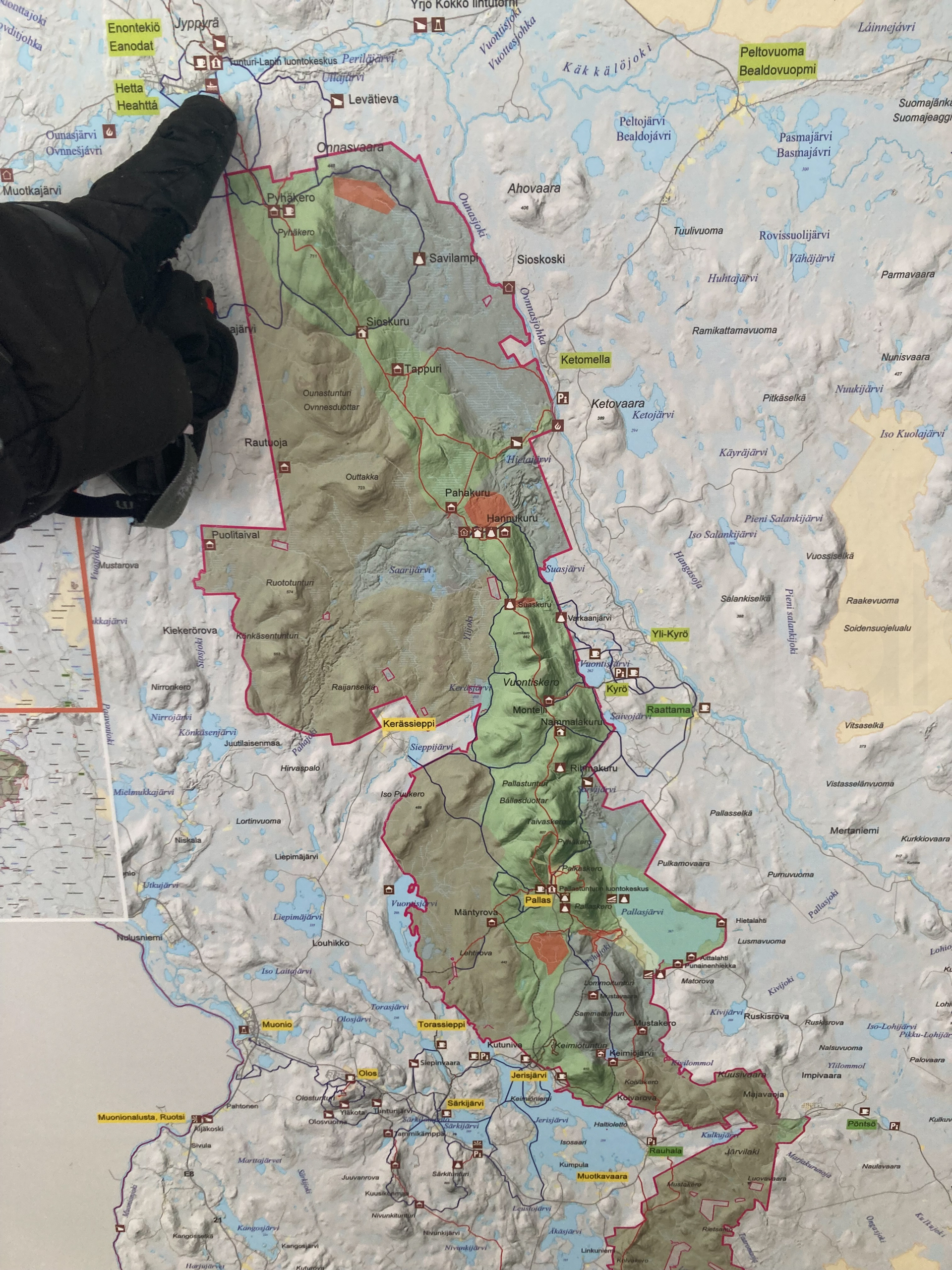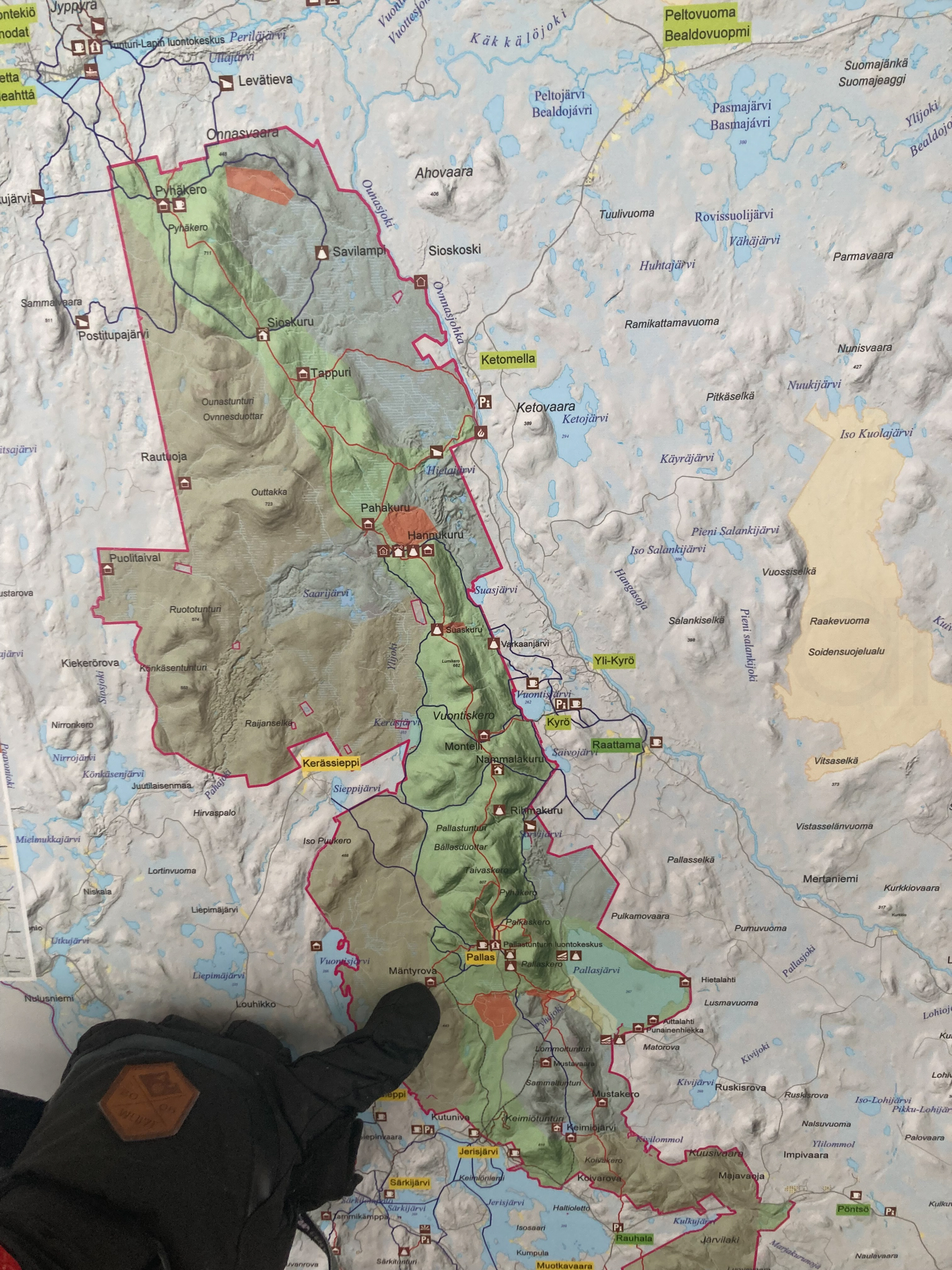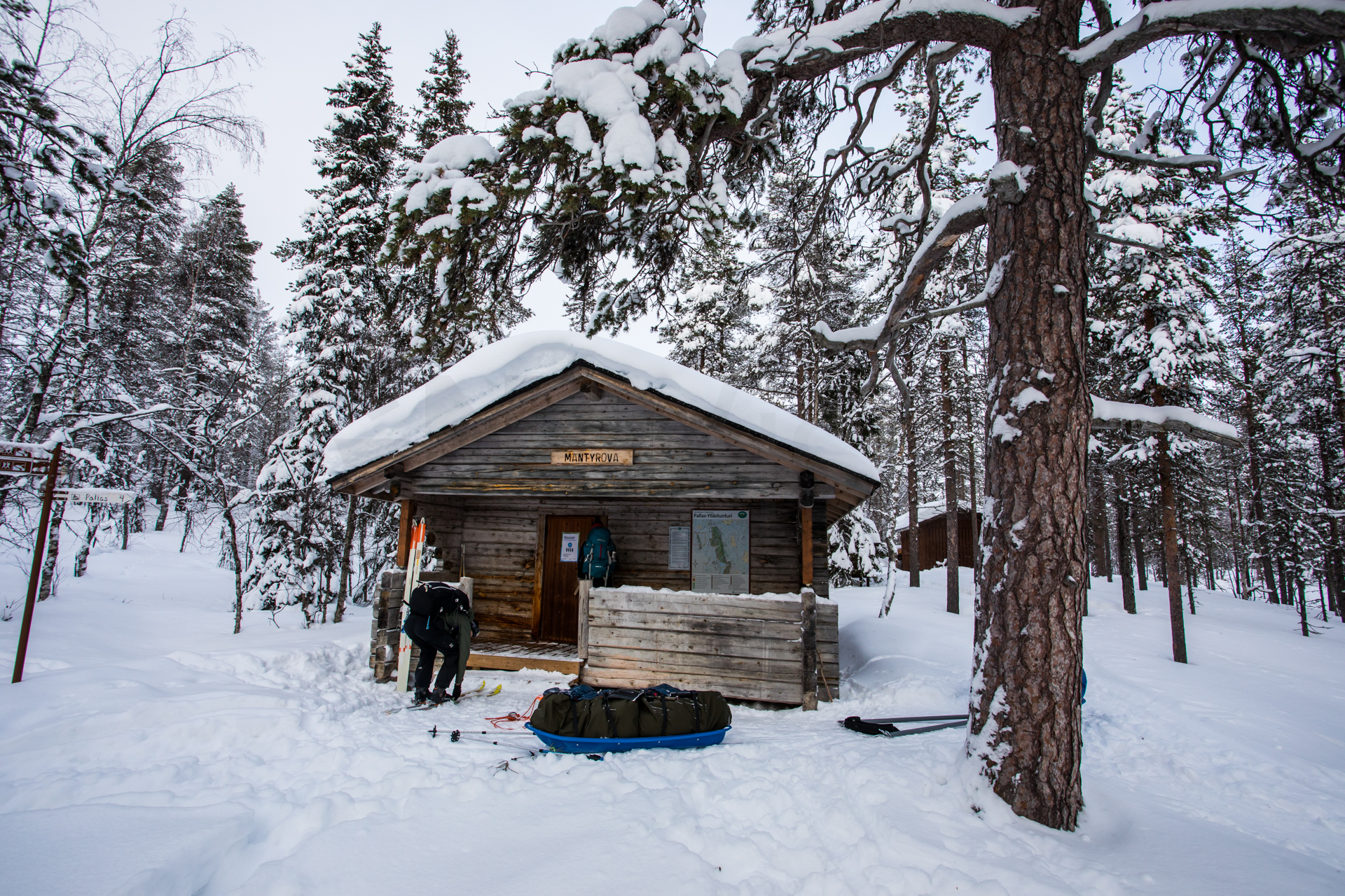Me dirijo a la cabaña de Mantyrova. Por el camino me encuentro a los guardias del parque, muy amables, y me preguntan de dónde vengo. Les digo que de Nammalakuru, pero que empecé el viaje en Enontekiö. No me creen por la gran pulka que llevo y les enseño fotos. Se sorprenden de que con tanto peso haya podido atravesar la parte norte del parque debido a las acumulaciones de nieve. Me dicen que ya no tendré tramos con nieve virgen.