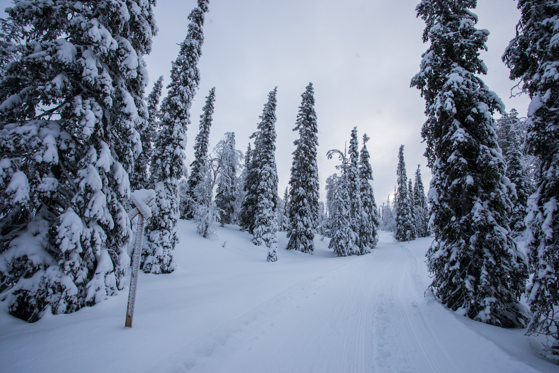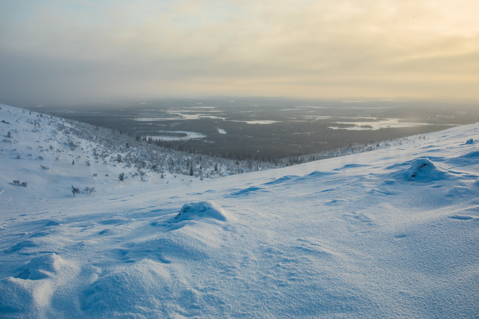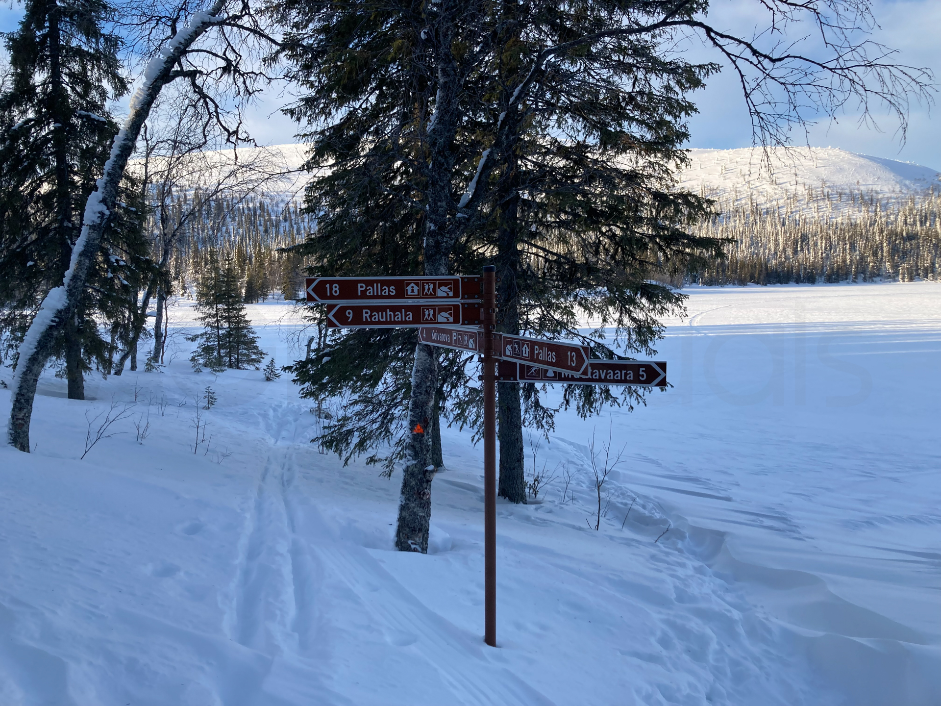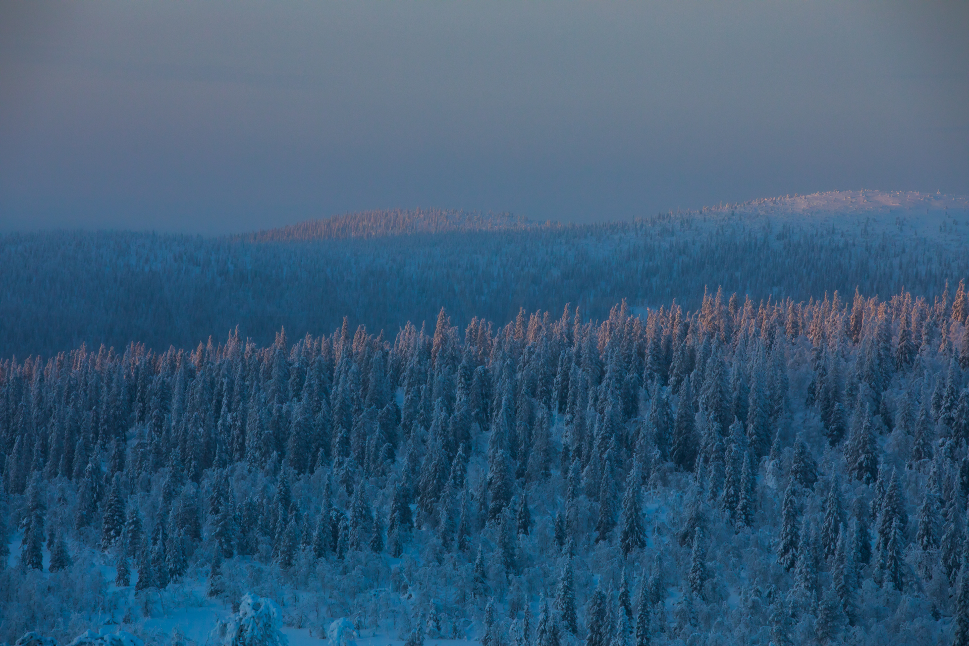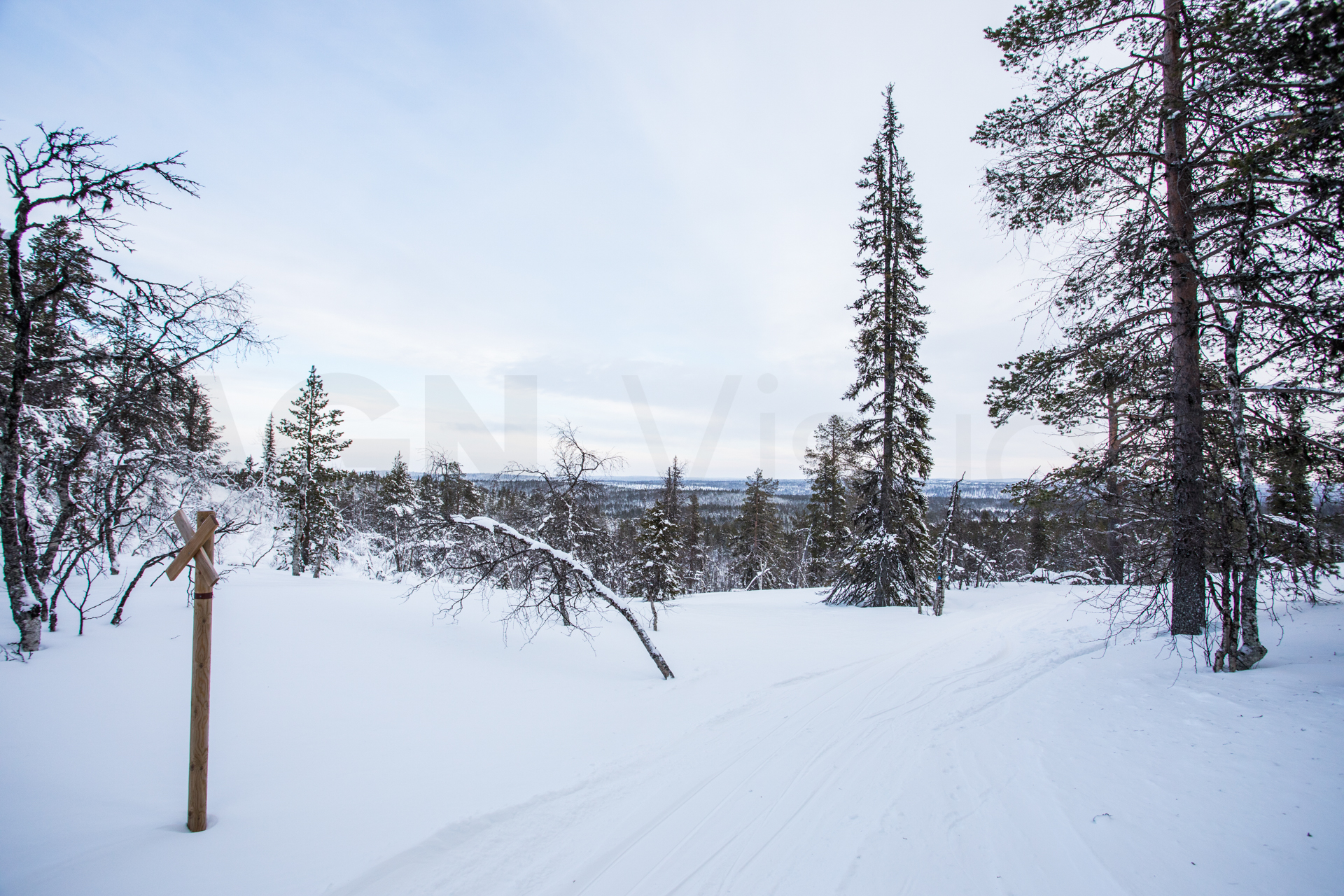 Salgo de Vuontispirtti y me dirijo hacia la cabaña de Nammalakuru. Hoy me espera un buen desnivel, pero con nieve pisada. Realizo todo el tramo sin los esquís y a pie. Con estas fuertes subidas, hubiera ido bien llevar pieles de foca, ya que las escamas de los esquís Cross Country no son suficientes. Este error acentuaría mucho más la lesión en el dedo gordo del pie derecho al forzar la posición de los esquís en la subida, la cual arrastraría durante meses después. Aunque la subida es dura, el paisaje es precioso, con todo el camino rodeado de frondosos y altos árboles cubiertos de nieve. Al llegar arriba, me esperan unas vistas espectaculares.