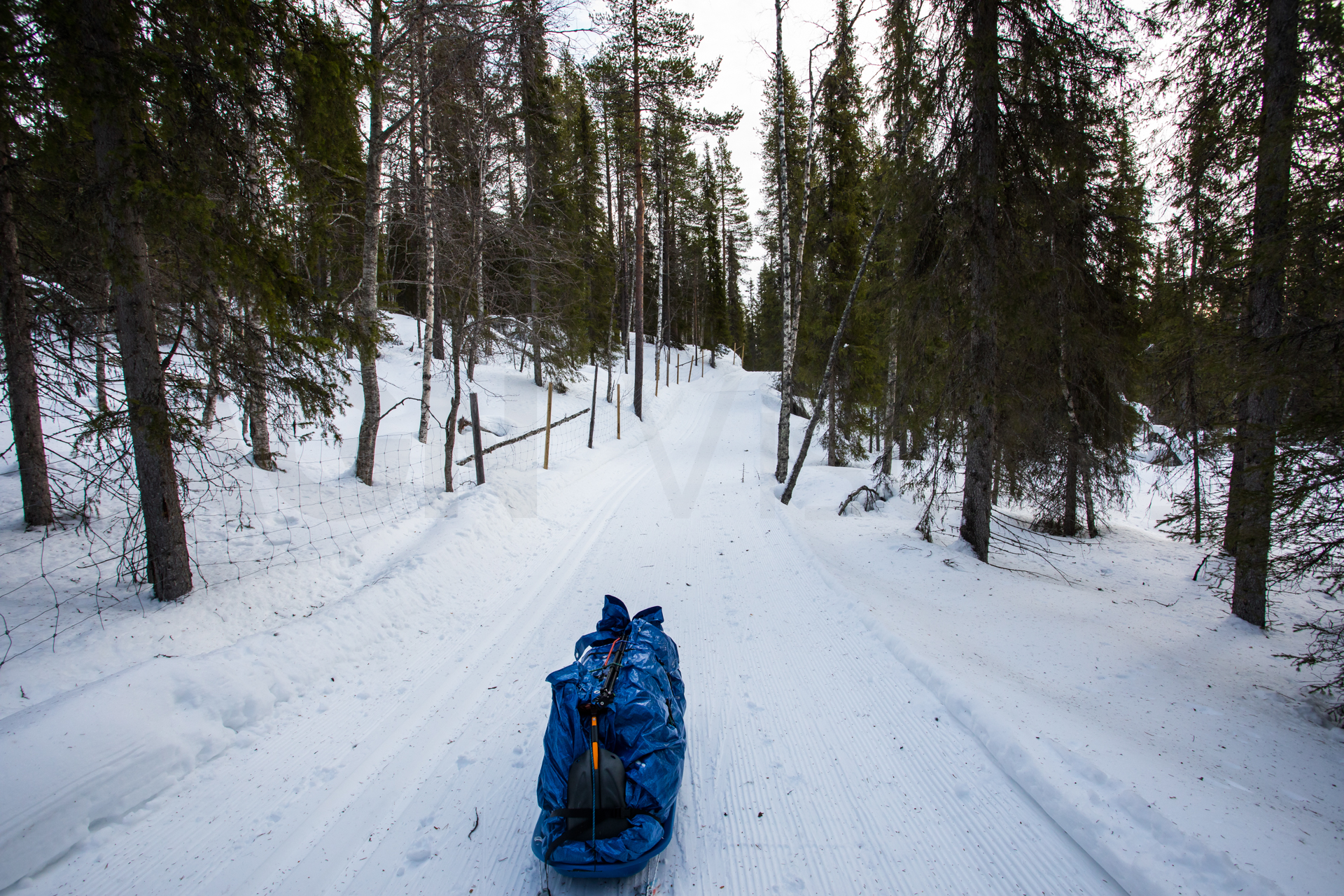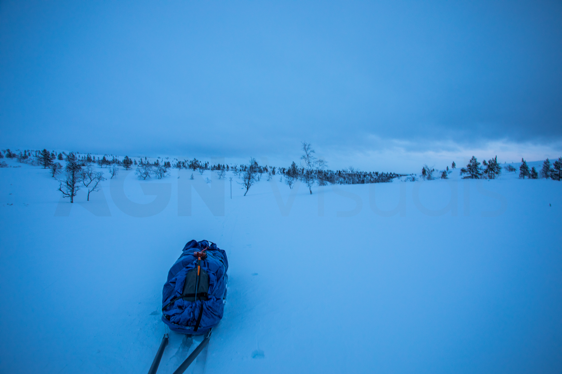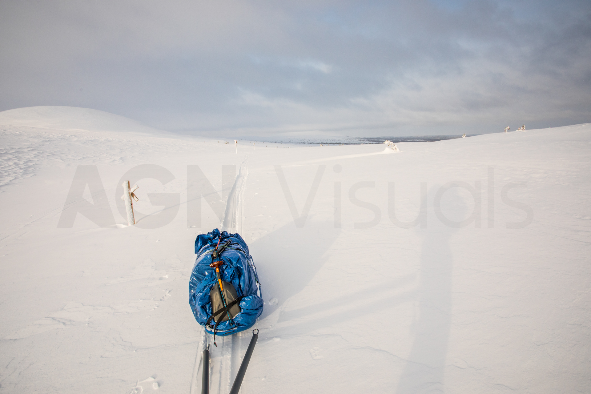 Por fin, después de 18 años, empiezo la travesía que tanto deseaba. Una emoción muy fuerte tenía, pero a la vez no podía emocionarme mucho porque hacía mucho frío y no podía parar. En pocos minutos, el vapor de mi respiración se congela en mis pestañas, cejas y braga de cuello. Hoy la etapa es corta y fácil porque es una pista de esquí de fondo pisada, pero se me hace muy dura por el exceso de peso que llevo en la pulka. Al tener tan poco tiempo para preparar la travesía, no medí el peso, llené las maletas y la pulka pesaba más de 70 kg (además de mi mochila con parte del equipo fotográfico). Un error que lo pagaría caro durante el viaje, pero de todo se aprende y lo que no te mata te hace más fuerte.