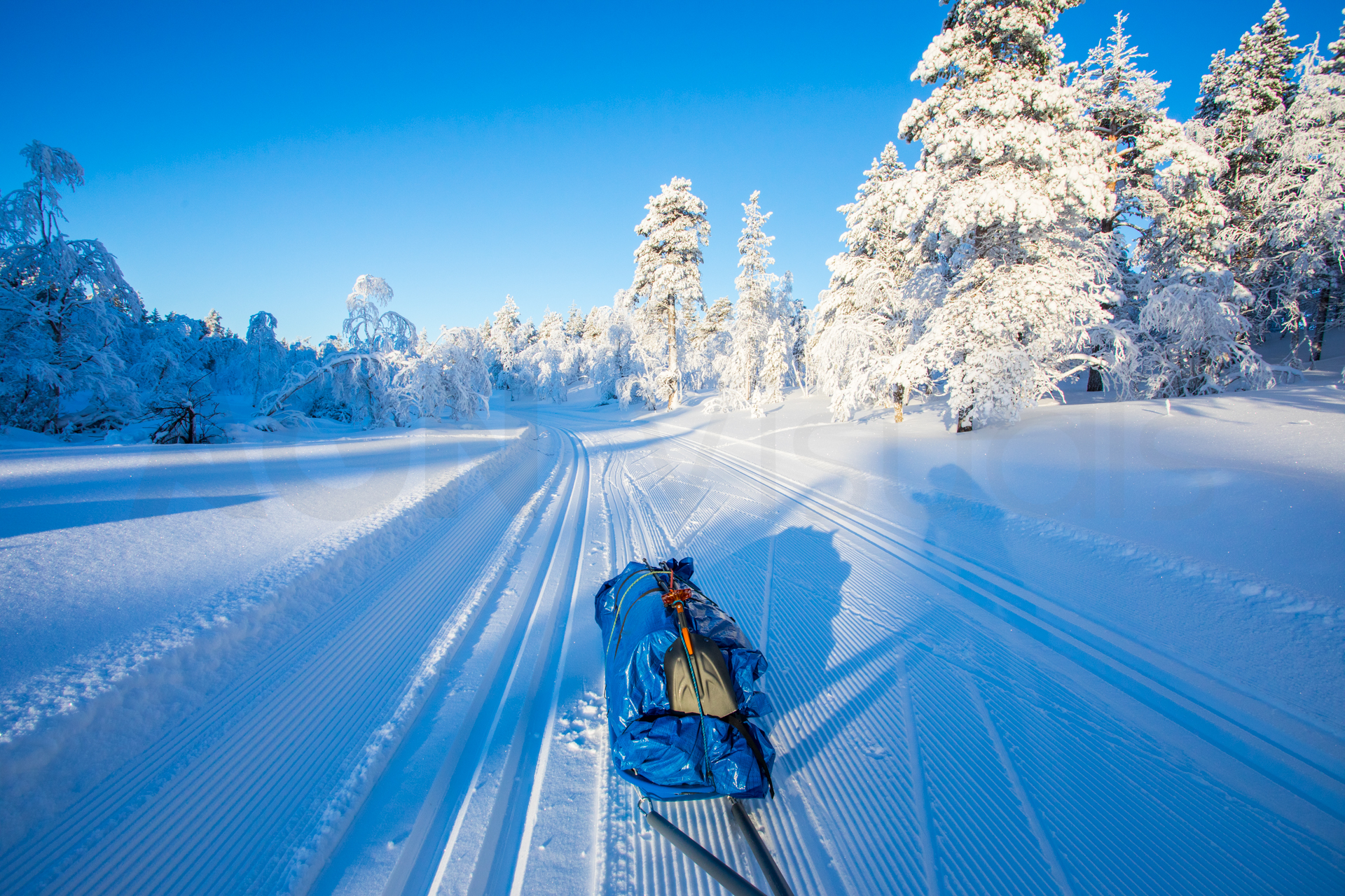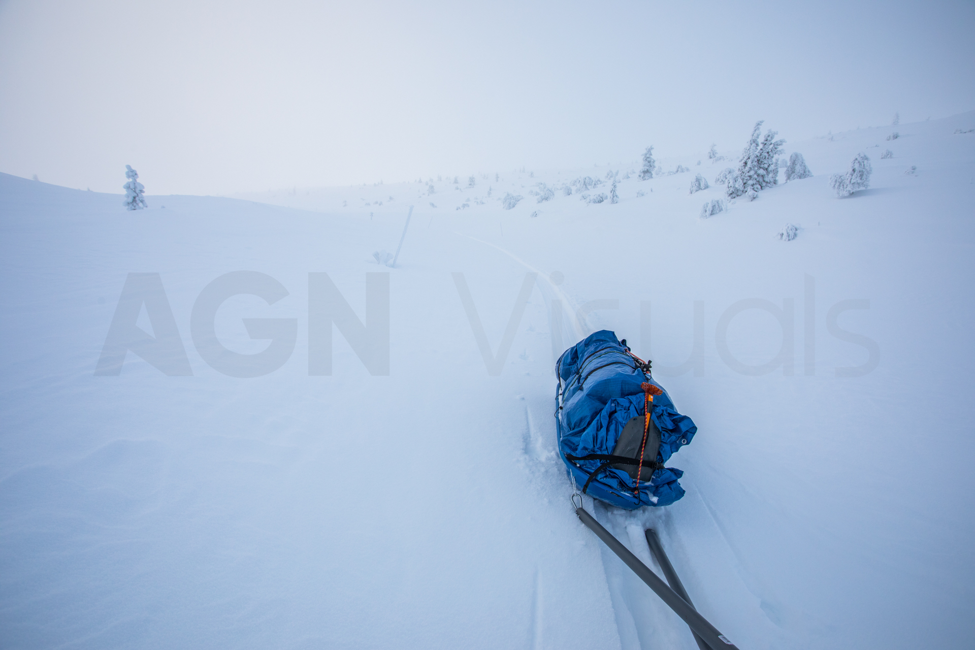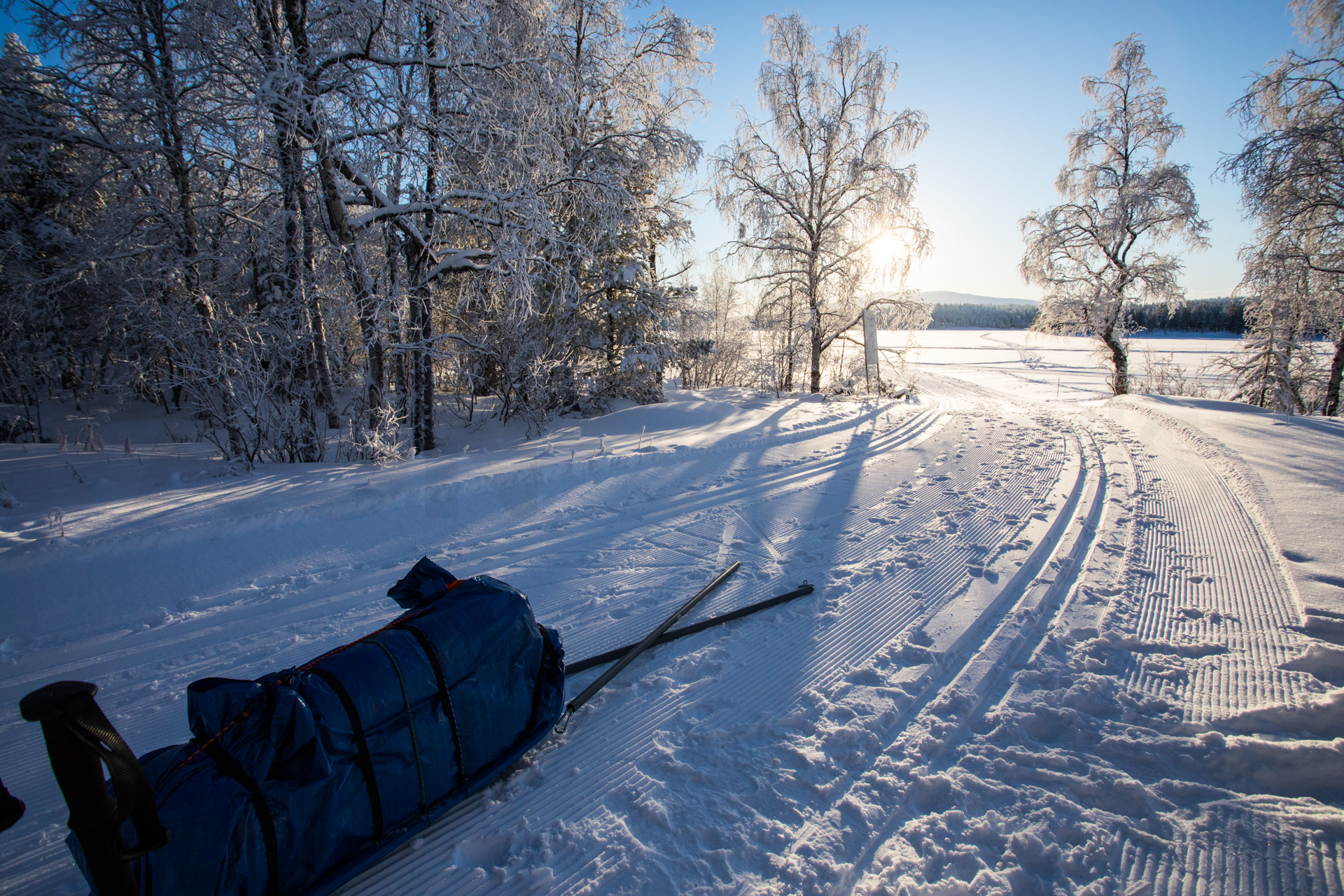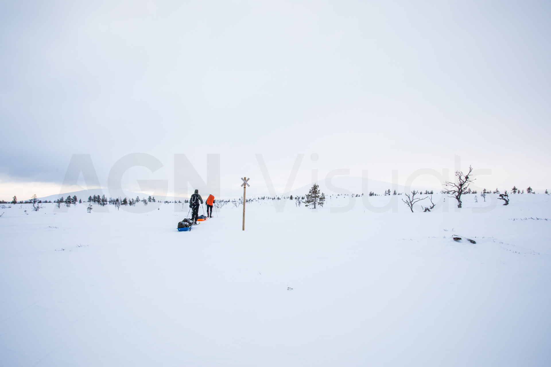 Por fin, después de 18 años, empiezo la travesía que tanto deseaba. Una emoción muy fuerte tenía, pero a la vez no podía emocionarme mucho porque hacía mucho frío y no podía parar. En pocos minutos, el vapor de mi respiración se congela en mis pestañas, cejas y braga de cuello. Hoy la etapa es corta y fácil porque es una pista de esquí de fondo pisada, pero se me hace muy dura por el exceso de peso que llevo en la pulka. Al tener tan poco tiempo para preparar la travesía, no medí el peso, llené las maletas y la pulka pesaba más de 70 kg (además de mi mochila con parte del equipo fotográfico). Un error que lo pagaría caro durante el viaje, pero de todo se aprende y lo que no te mata te hace más fuerte.
