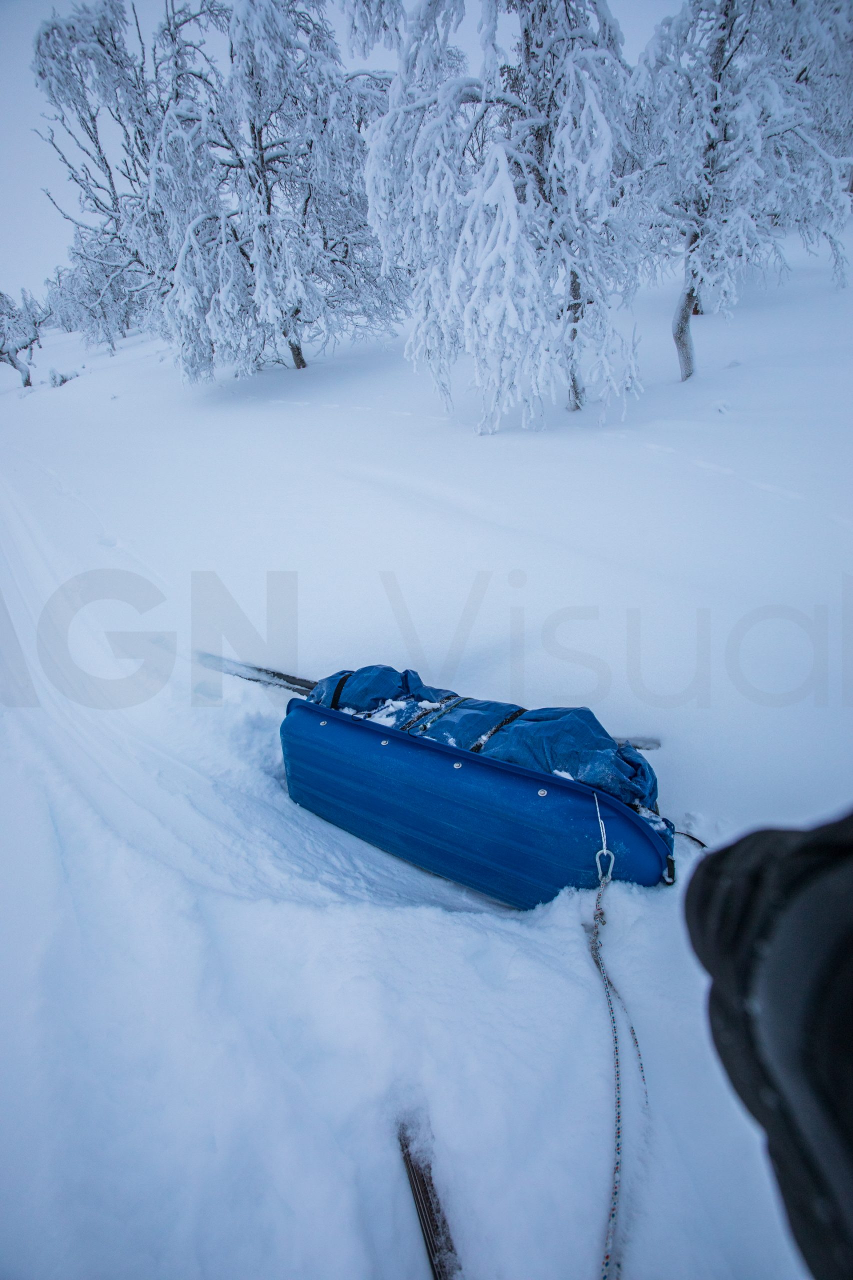 Empiezo el día con cierta incertidumbre pero con ganas de avanzar. Realizo la bajada con precaución y caigo en un agujero de nieve que me llega por la cintura con los esquís puestos. Debido a la profundidad de la nieve y el peso de la pulka, no puedo salir. Me quito los esquís y me coloco las raquetas de nieve, pero también me hundo hasta la cintura y no logro salir. En mi mente pasan muchas cosas y una de ellas es estrenar el Garmin Inreach y solicitar rescate, pero sabía que hacer esto pondría fin al viaje. Me tranquilizo, bebo un poco de tang, como algo y descanso. Recuerdo que tengo una sierra portátil, corto unos troncos y los coloco debajo de las raquetas. Funciona y más de una hora después consigo salir de allí.