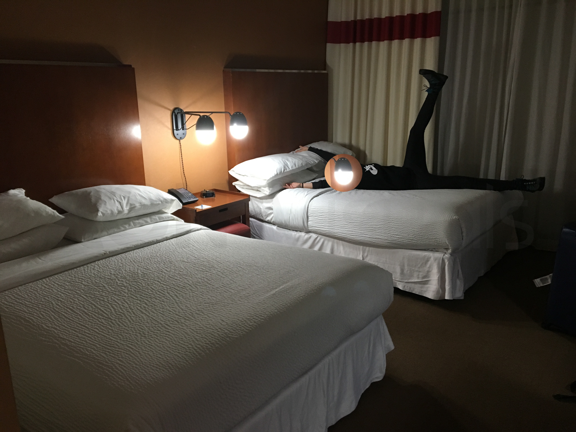 Vamos al hotel y estamos tan cansados que pago el mismo parking de la entrada del hotel por no ir a aparcarlo a dos calles en el parking gratuito. Nos toca una habitación con dos camas grandes. Dormiremos anchos y durante horas.