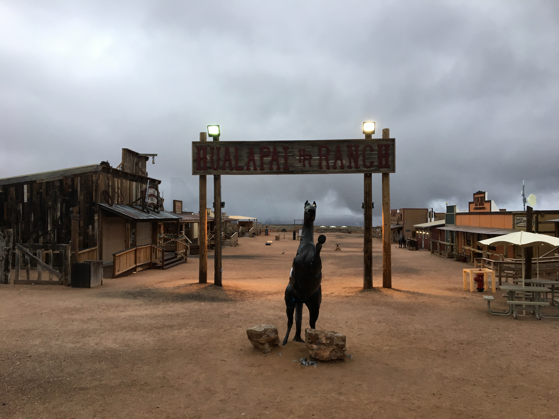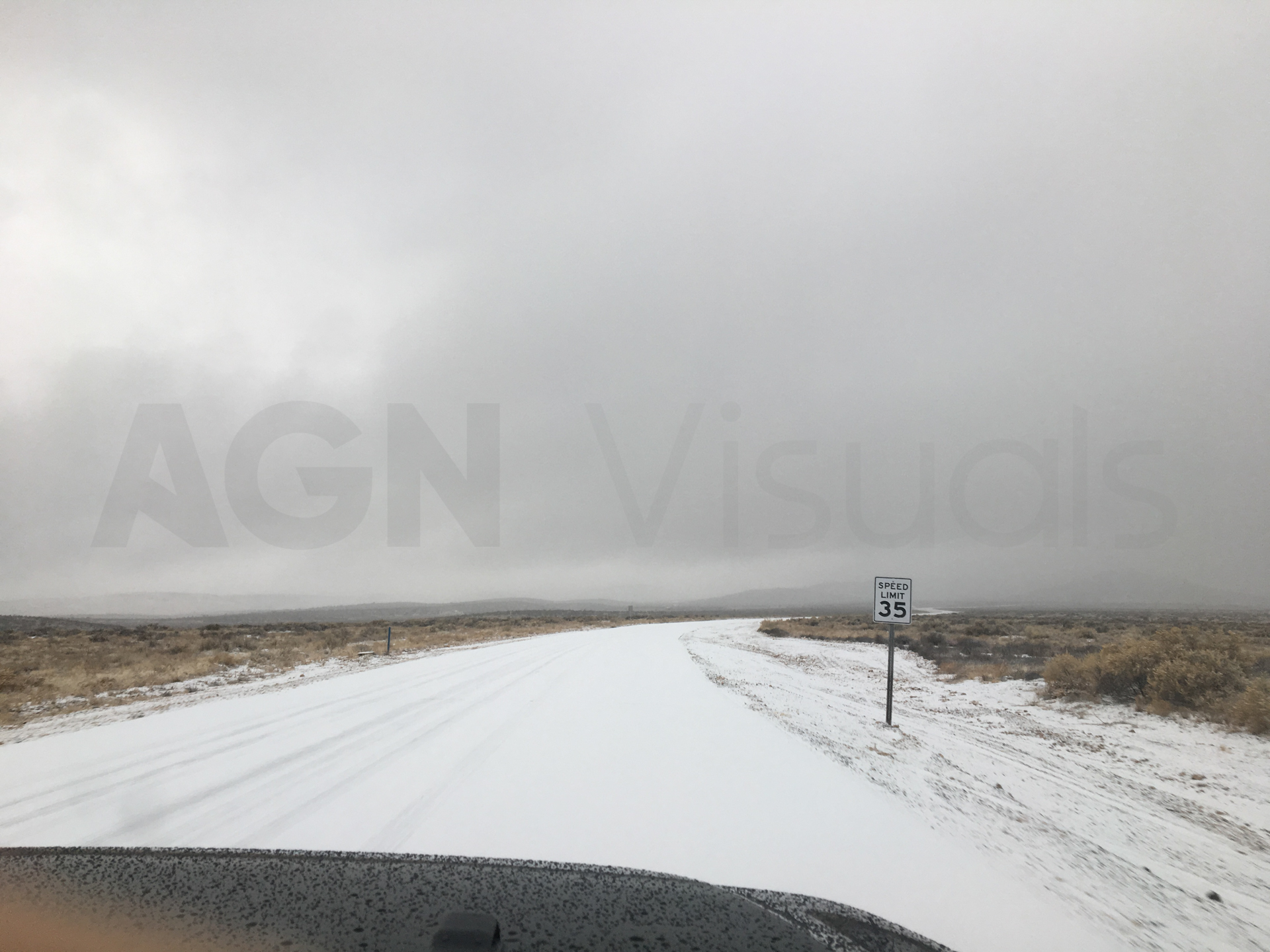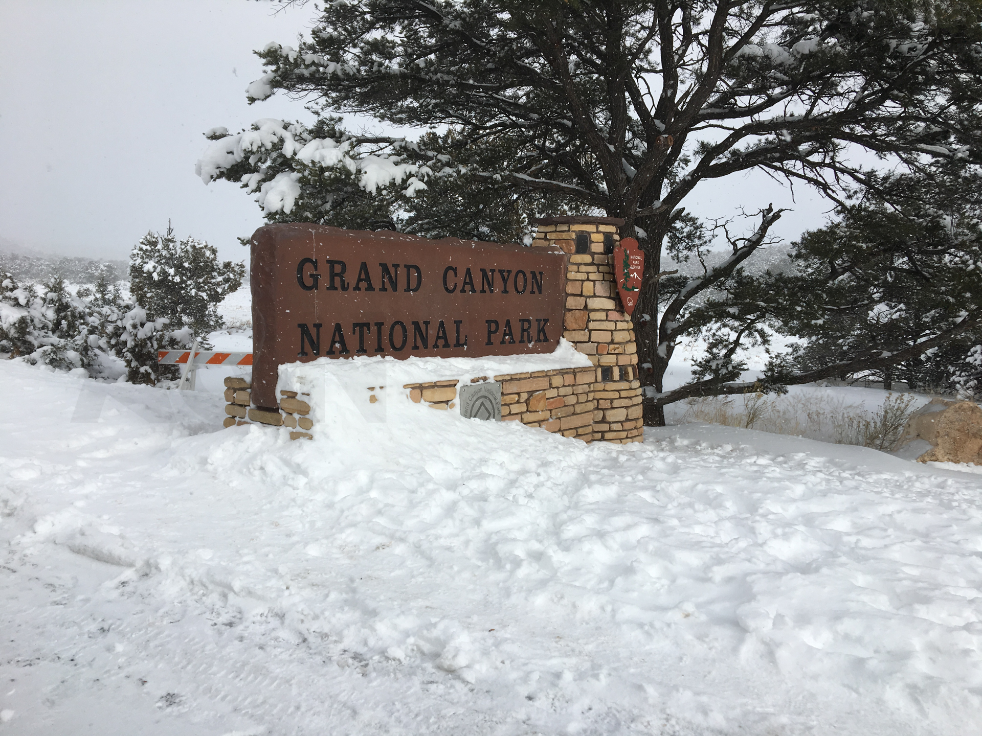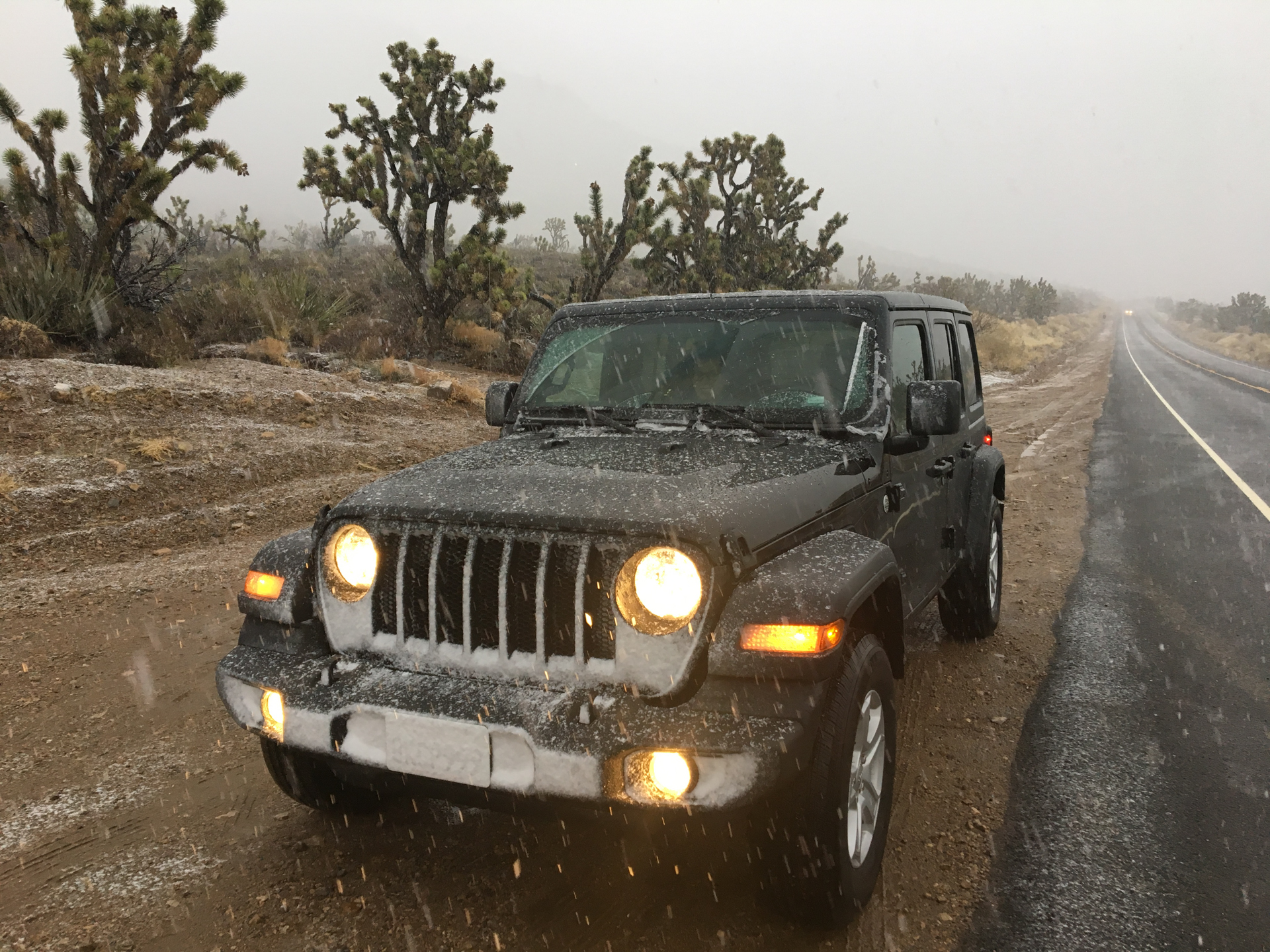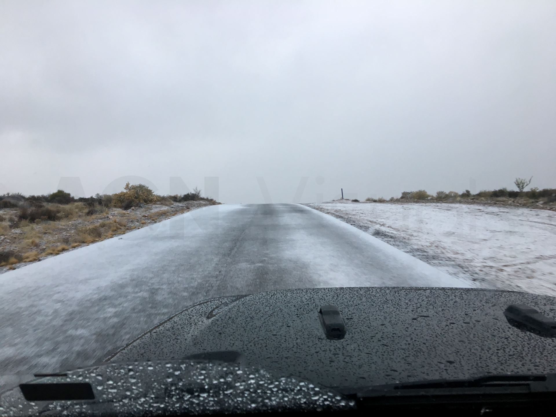 De subida, vamos a una zona de un mirador del Gran Cañón, el Meadview y Huapalai Ranch. De camino aquí, vemos que empieza a nevar. Es muy peligroso cuando ha llovido y hay agua en la calzada y luego empieza a nevar. La nieve va cayendo en el agua y se va congelando. Se forma hielo en lugar de nieve, lo que hace que la carretera sea muy resbaladiza. Decido reducir mucho la velocidad y unos kilómetros más adelante nos encontramos un coche volcado en medio del prado. Ya hay equipos de emergencia que nos alertan del hielo. Cuando nos hacen parar el coche, no frena por la placa de hielo y sigo recto unos pocos metros. Buena decisión ser prudentes y reducir la velocidad.
