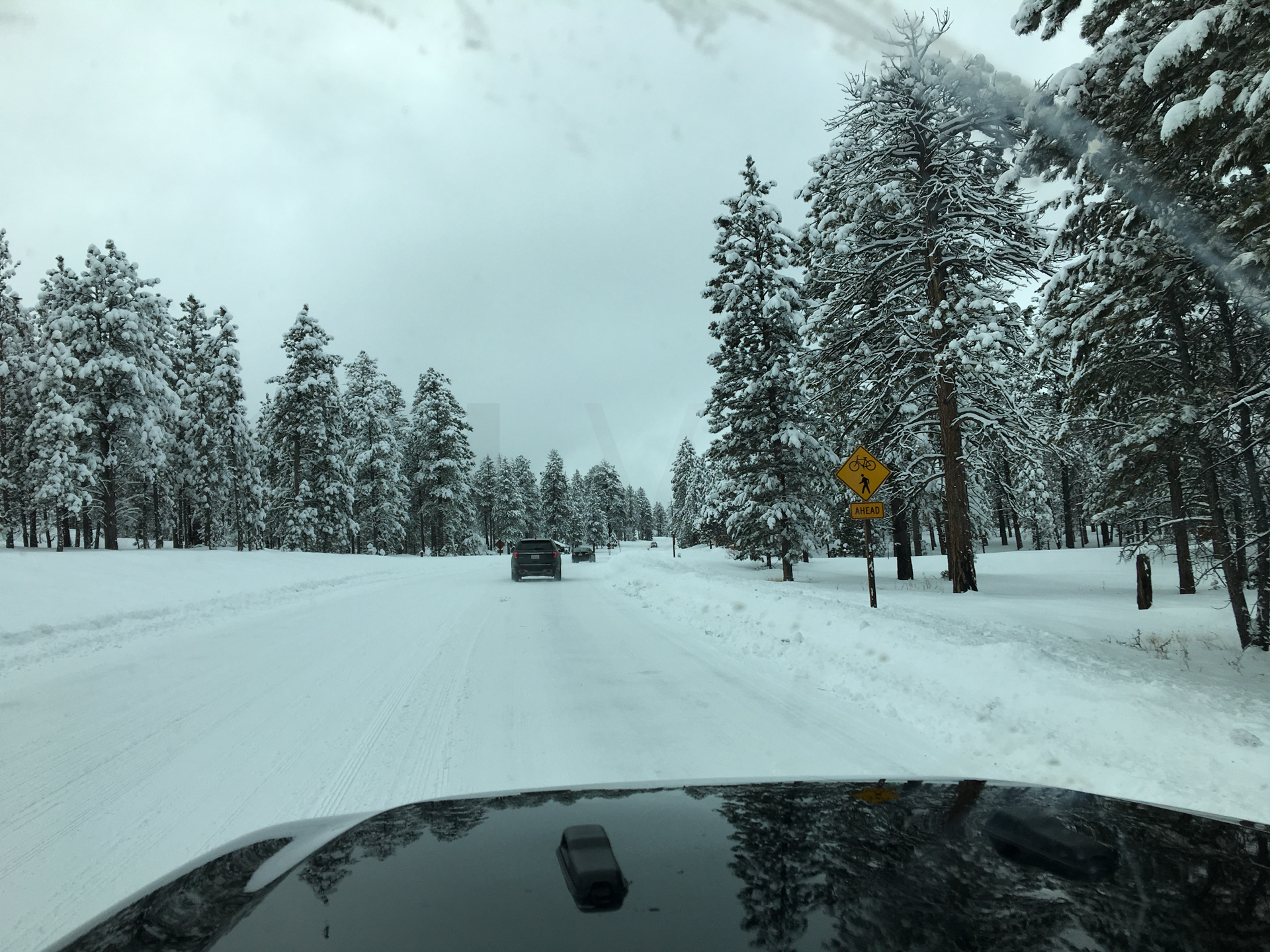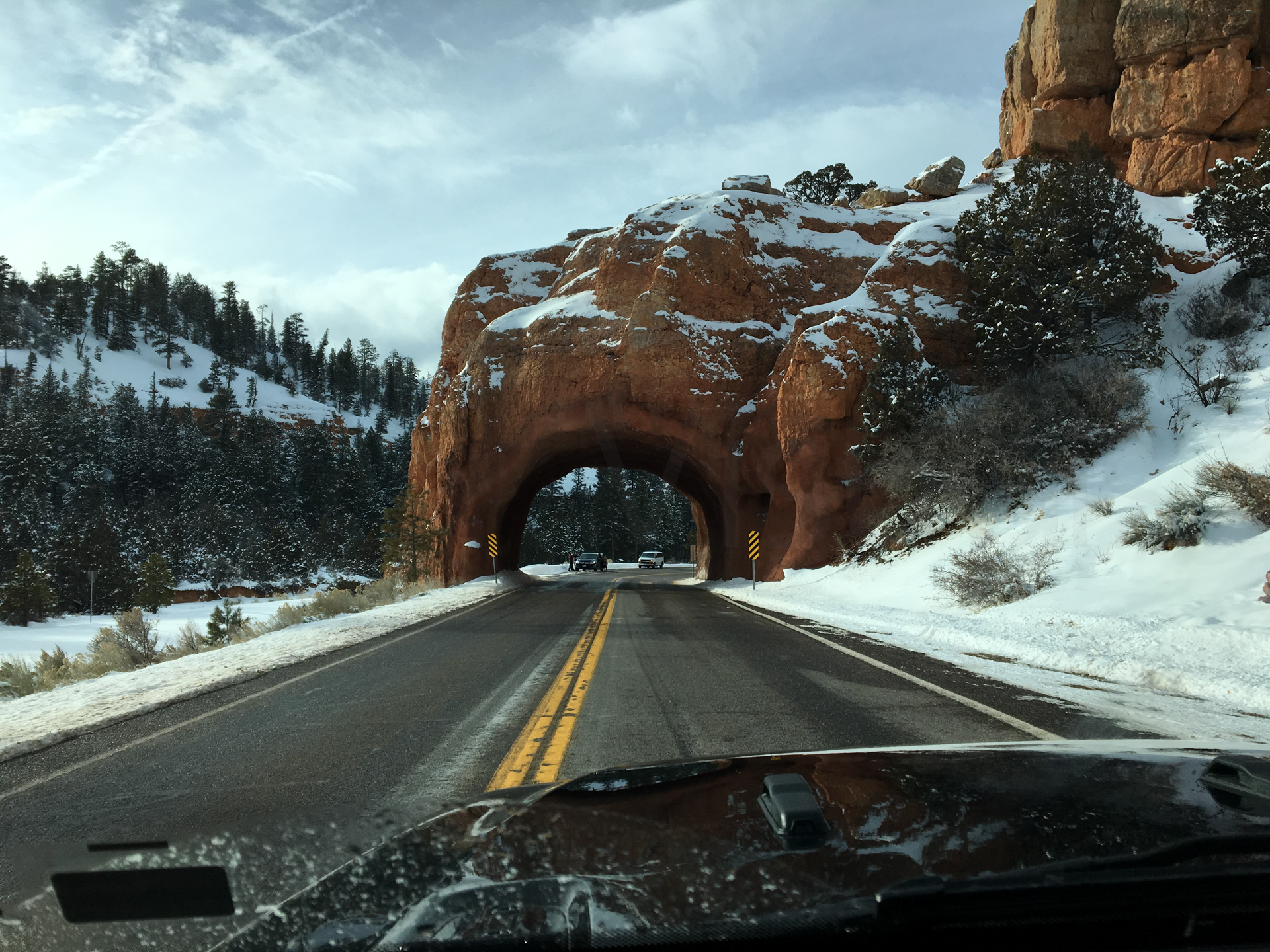 Dejamos el Parque Nacional del Zion y nos dirigimos al Parque Nacional del Bryce Canyon. De camino, vamos viendo el paisaje cada vez con más grosor de nieve, tenemos dudas si podremos visitar el parque. Por fin, llegamos a la entrada del Parque Nacional, los vigilantes del parque nos dicen que está cerrado más de la mitad del parque. En principio, tenemos un poco de decepción, pero decidimos entrar ya que estamos. La carretera del parque está totalmente nevada y hay un poco de grava para mejorar la adherencia. Hay muchos coches y muchos tienen dificultades para circular. Gran decisión insistir en un coche con tracción a las cuatro ruedas, circulamos sin ninguna dificultad.