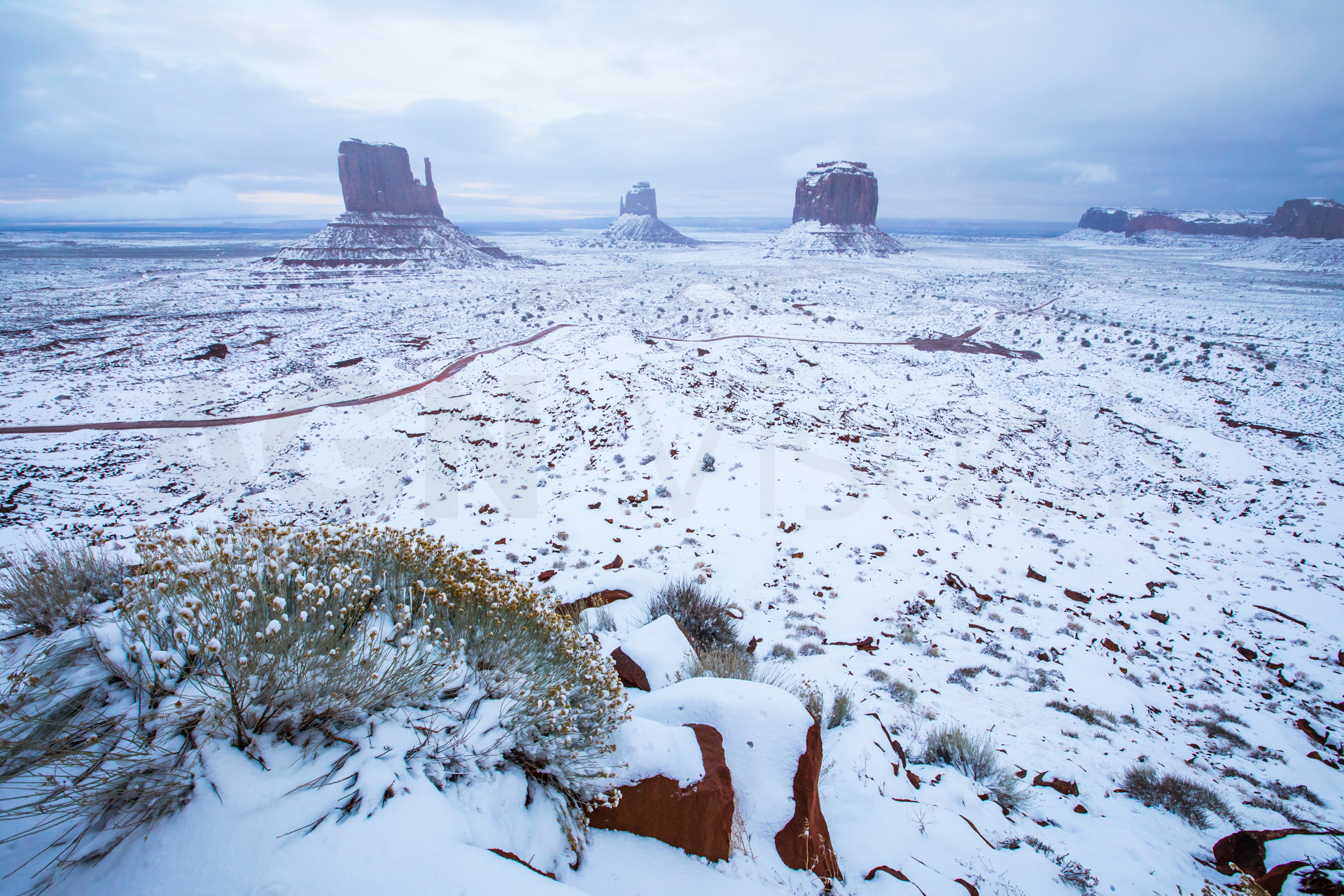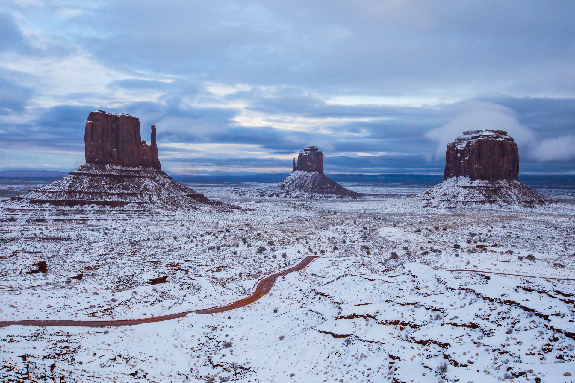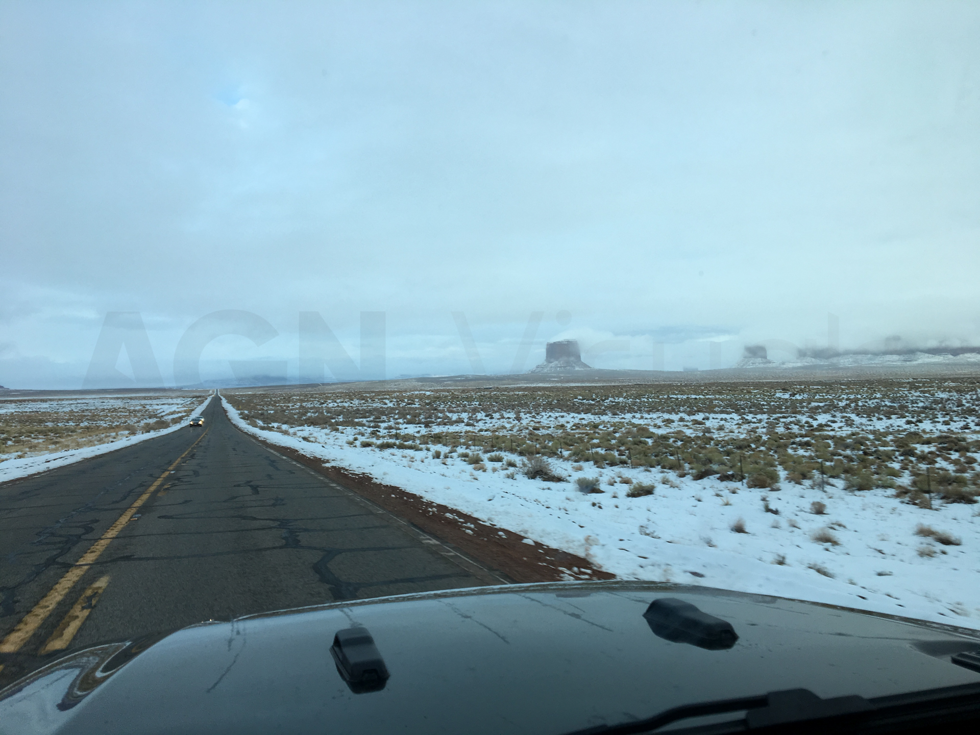 Dejamos las maletas en la habitación y nos vamos a Monument Valley. Llegamos y está todo nevado y con mucha niebla. Como ya tenemos la habitación de motel reservada, no tenemos prisa y esperamos a ver si despeja. Al cabo de un buen rato, las nubes se abren y vemos el paisaje. Aunque teníamos mala luz, el paisaje era impresionante. Ver ese desierto con esas singulares montañas y nevadas era espectacular. Era como estar en una película del oeste o que en cualquier momento se nos apareciese Marty McFly con su DeLorean en medio del desierto.