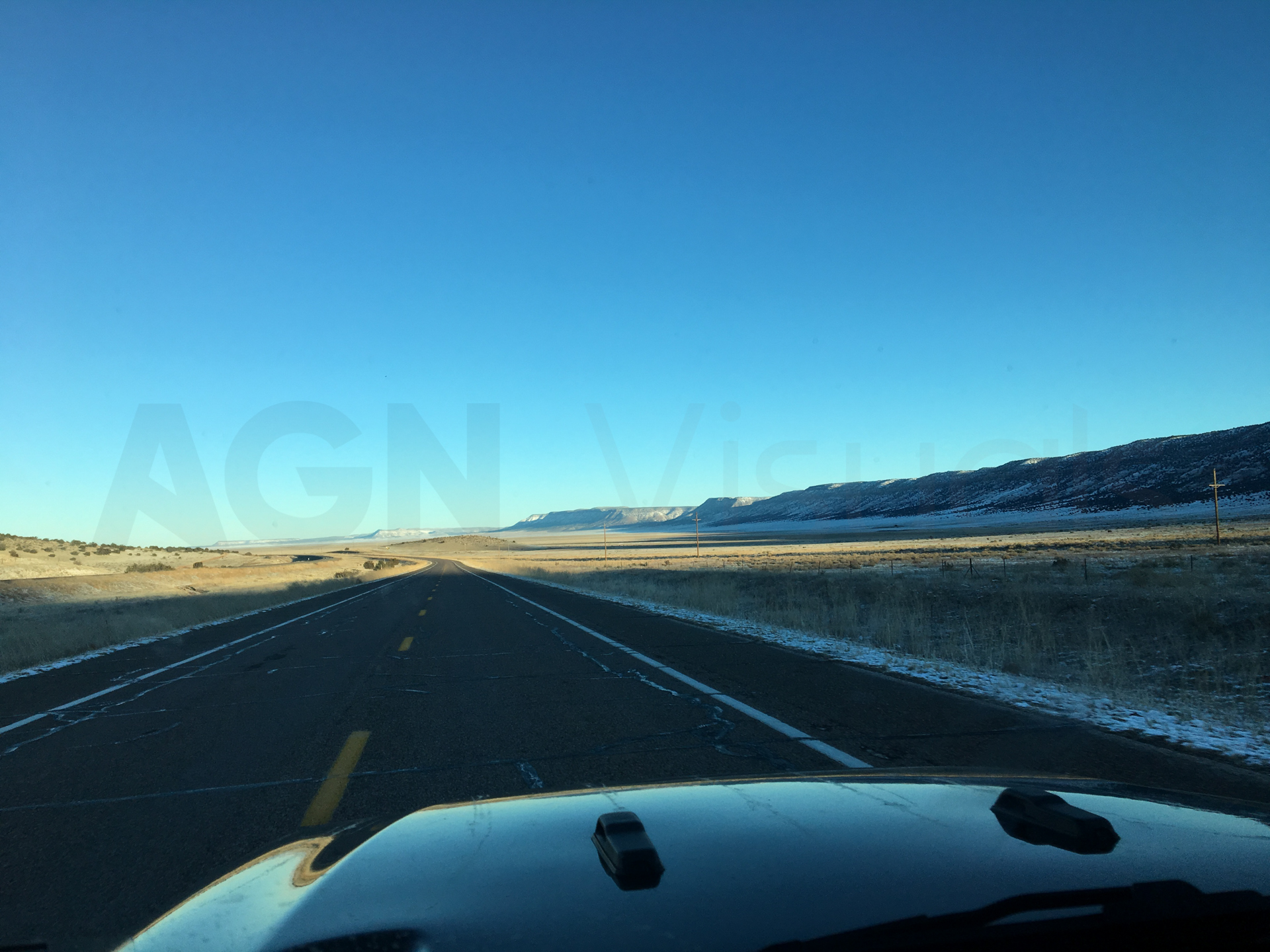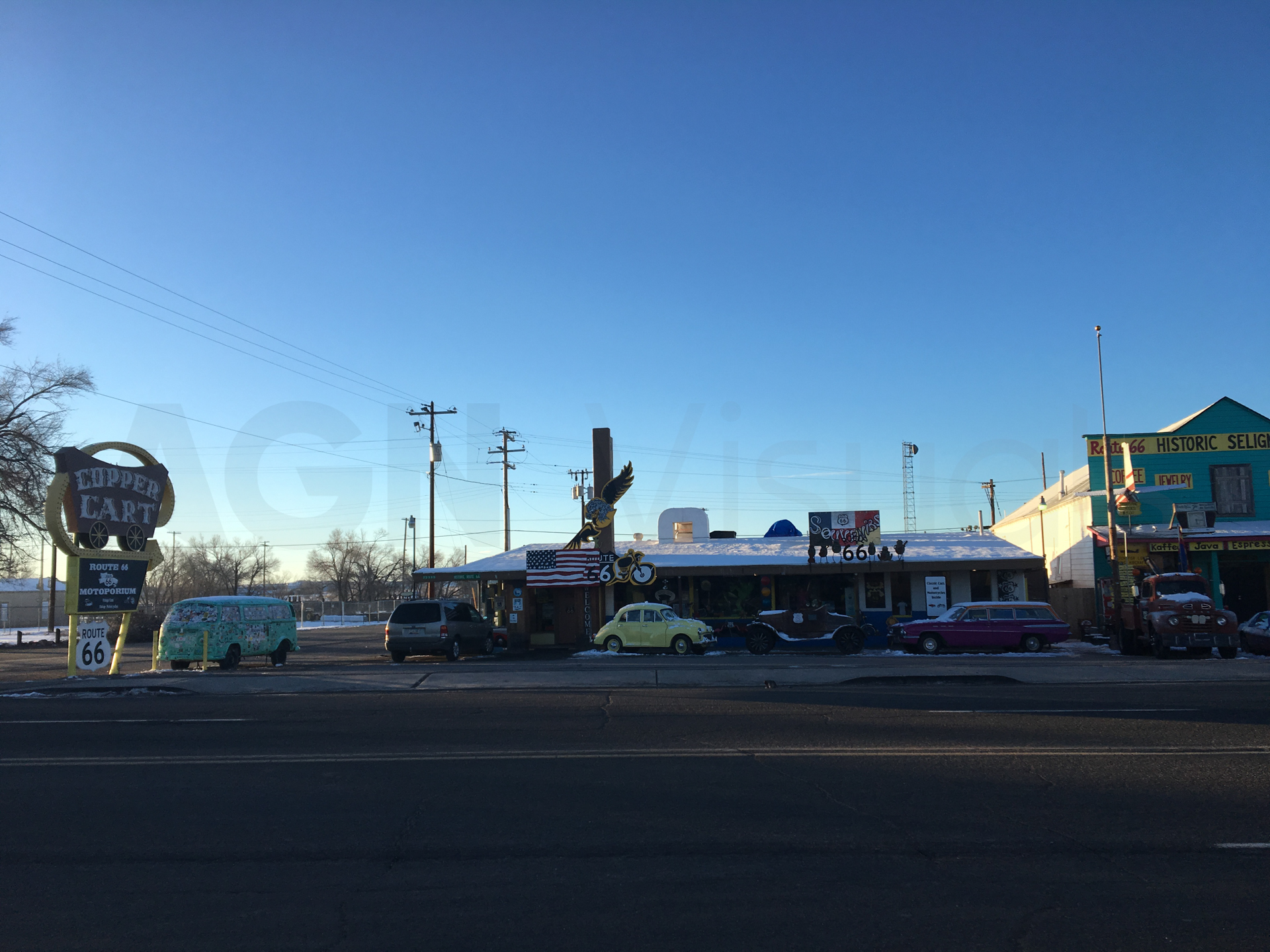 Se levanta mi pareja, recogemos y nos vamos hacia el Gran Canyon. Haremos unas dos horas de carreteras nevadas y mucho hielo. Por el camino dejamos atrás las nubes y sale el sol acompañado de mucho viento. Vemos una cafetería y paramos a desayunar.