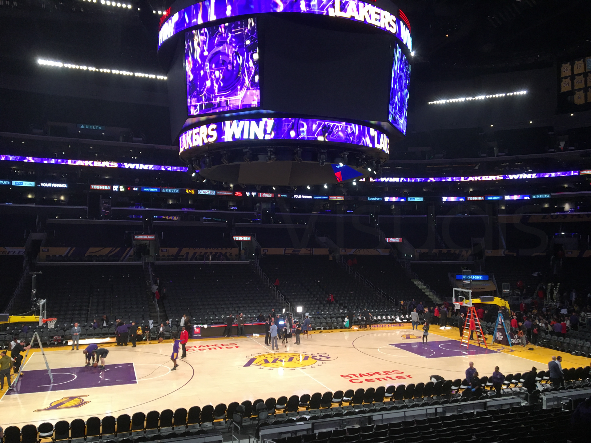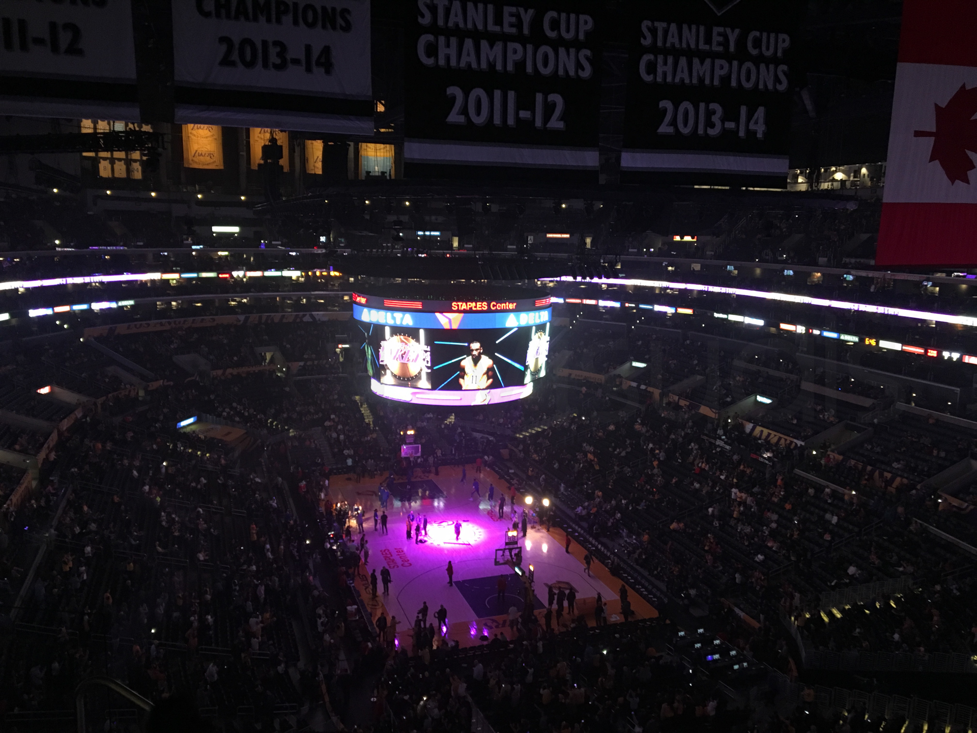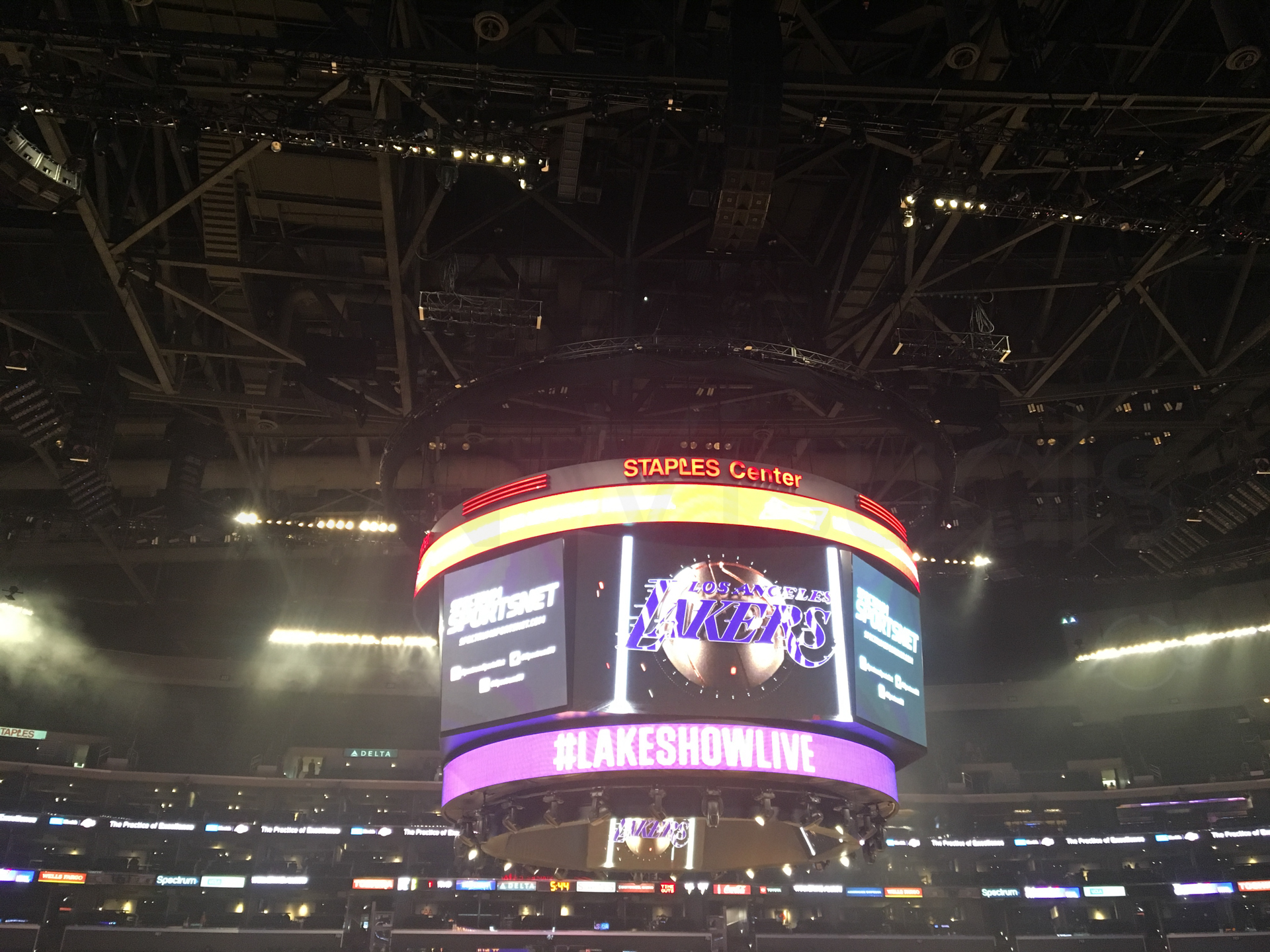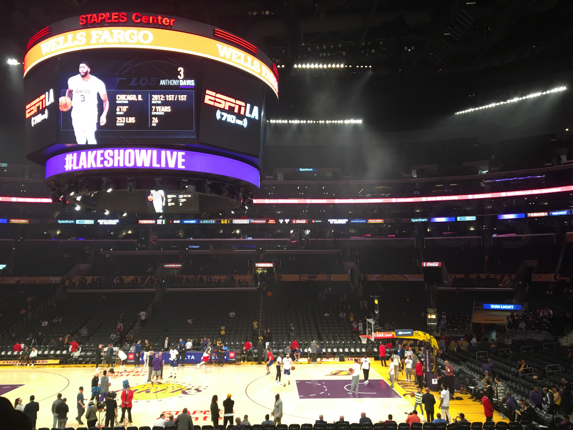 Antes de empezar el partido, ya empieza el espectáculo. Imágenes, música… Para dar la pista de salida al partido, un espectáculo visual impresionante. Empieza el partido y no paran de meter canastas de un lado al otro, es un partido muy activo, para nada aburrido. Llega la pausa y aquí pensábamos que nos aburriríamos. Para nada, sigue el espectáculo con bailes y demás. Le toca a un seguidor de los Lakers probar suerte lanzando a canasta desde medio campo. ¡Lanza y encesta! Todo el estadio se puso en pie, lo celebró más que la victoria de los Lakers. ¡El seguidor se llevó 100.000 dólares por una canasta!