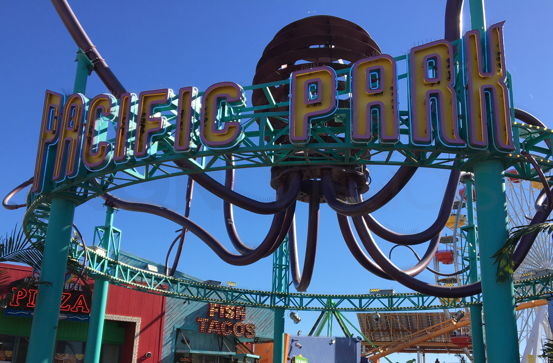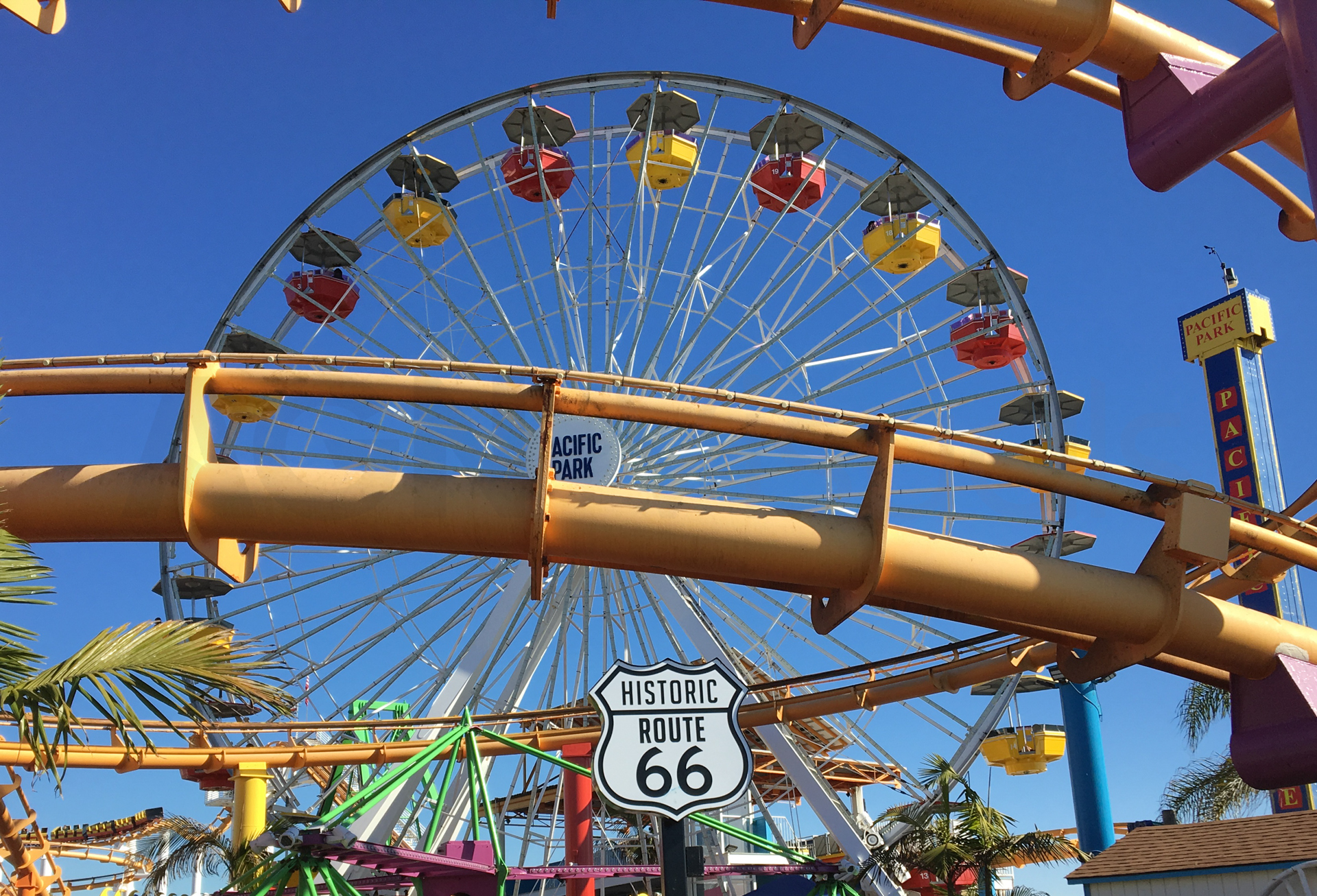 Se levanta un día completamente soleado y nos vamos a visitar Santa Mónica y el parque de atracciones Pacific Park. Nos hacemos unas fotos también con las torres de los socorristas de la playa.