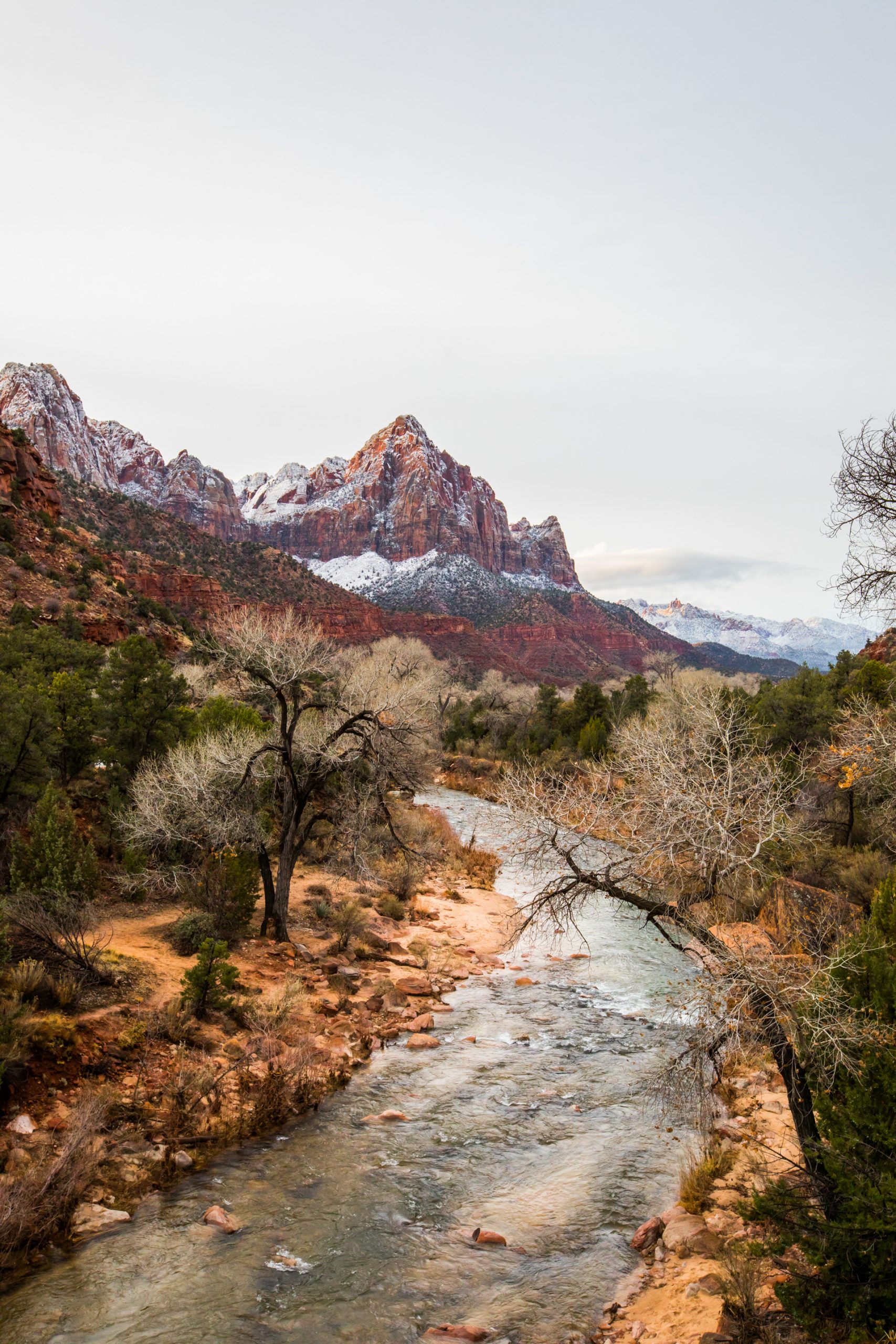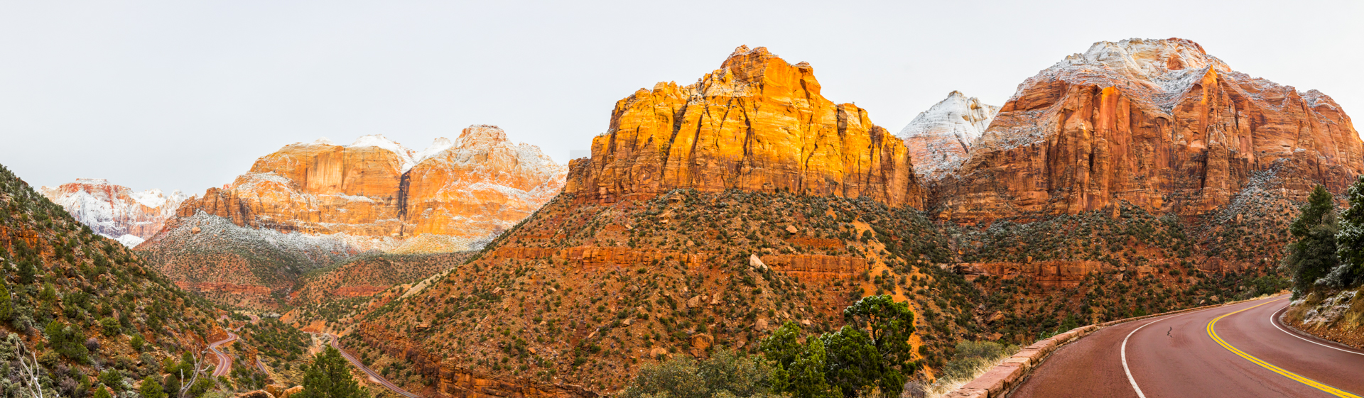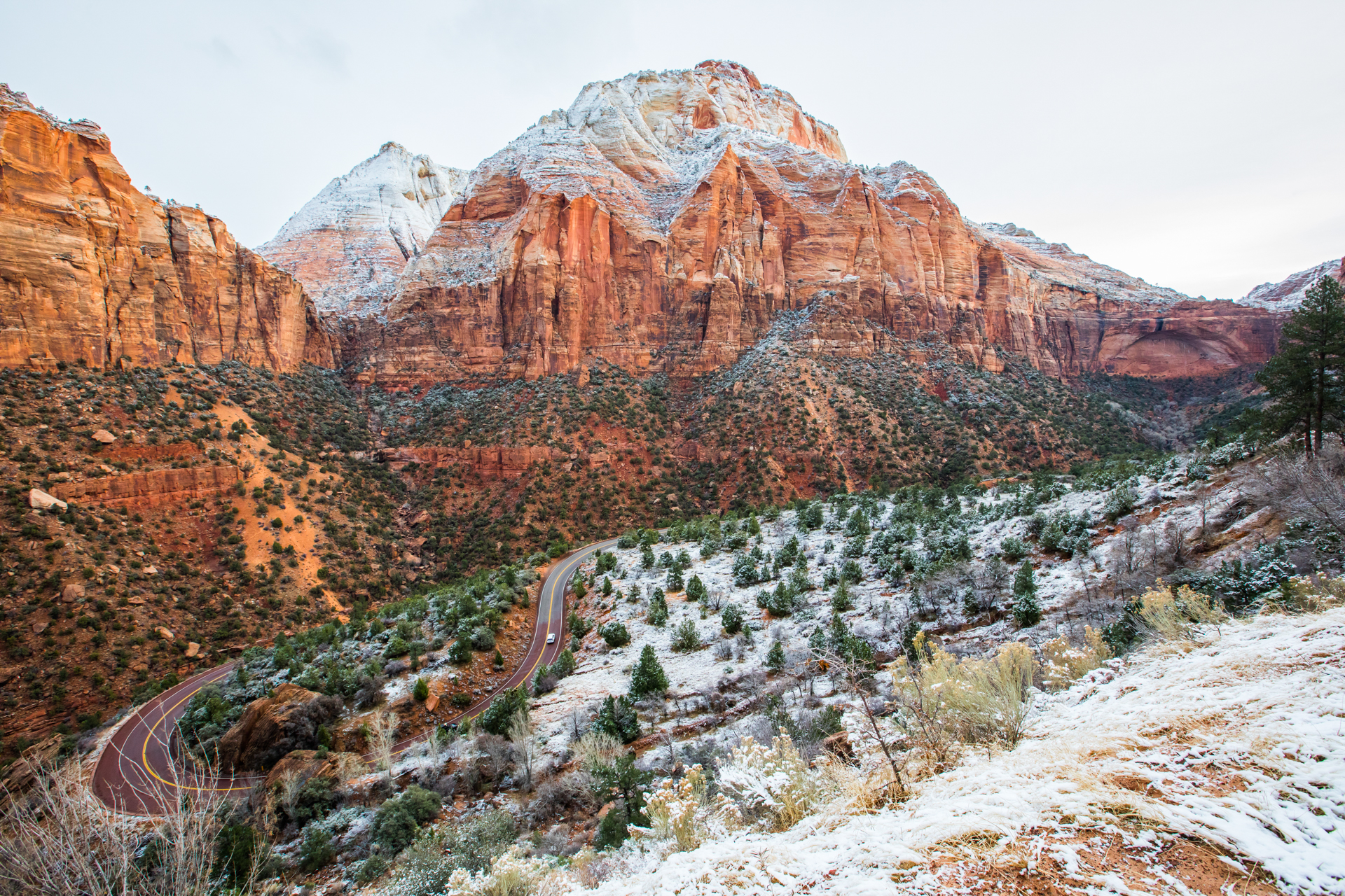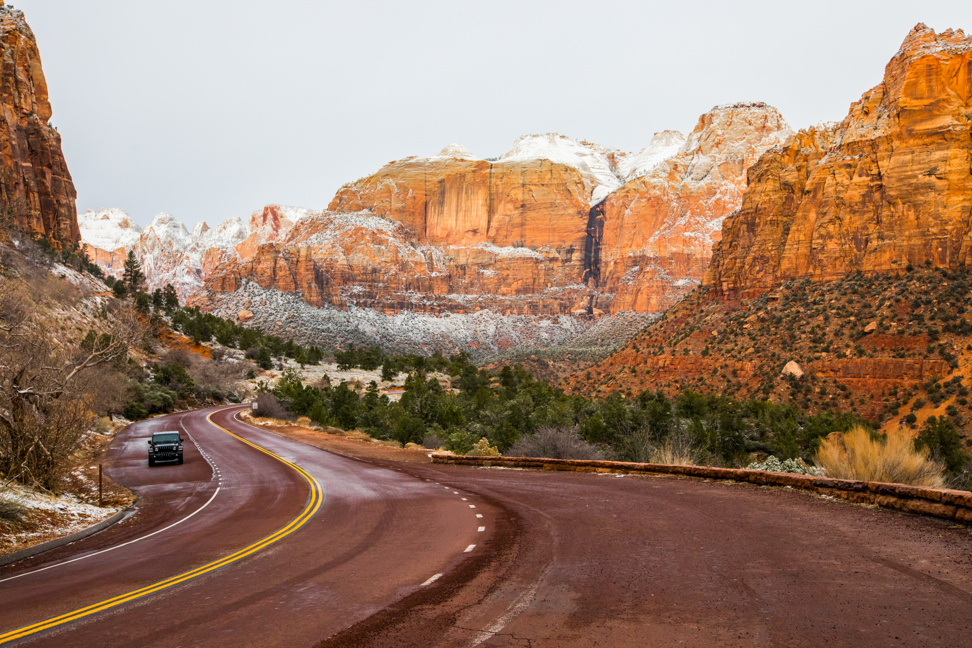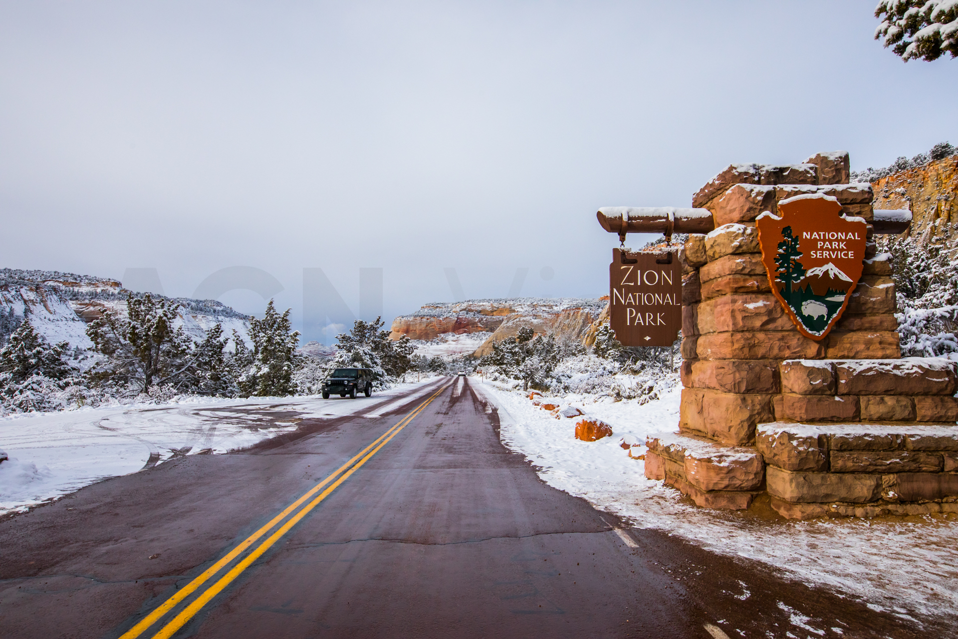 Volvemos a madrugar por el jetlag, salimos antes del amanecer y desayunamos en la cafetería de un supermercado. Vamos al Parque Nacional del Zion Canyon. En la entrada compramos el pase anual, como iremos a varios Parques Nacionales nos sale a cuenta comprar este pase y no por cada parque. Al entrar nos dicen que en ese momento la carretera está cerrada y no saben cuándo la abrirán. Ha nevado y tienen que ver si es seguro. Esperamos unos cuantos turistas y cuando ya es seguro, podemos entrar.