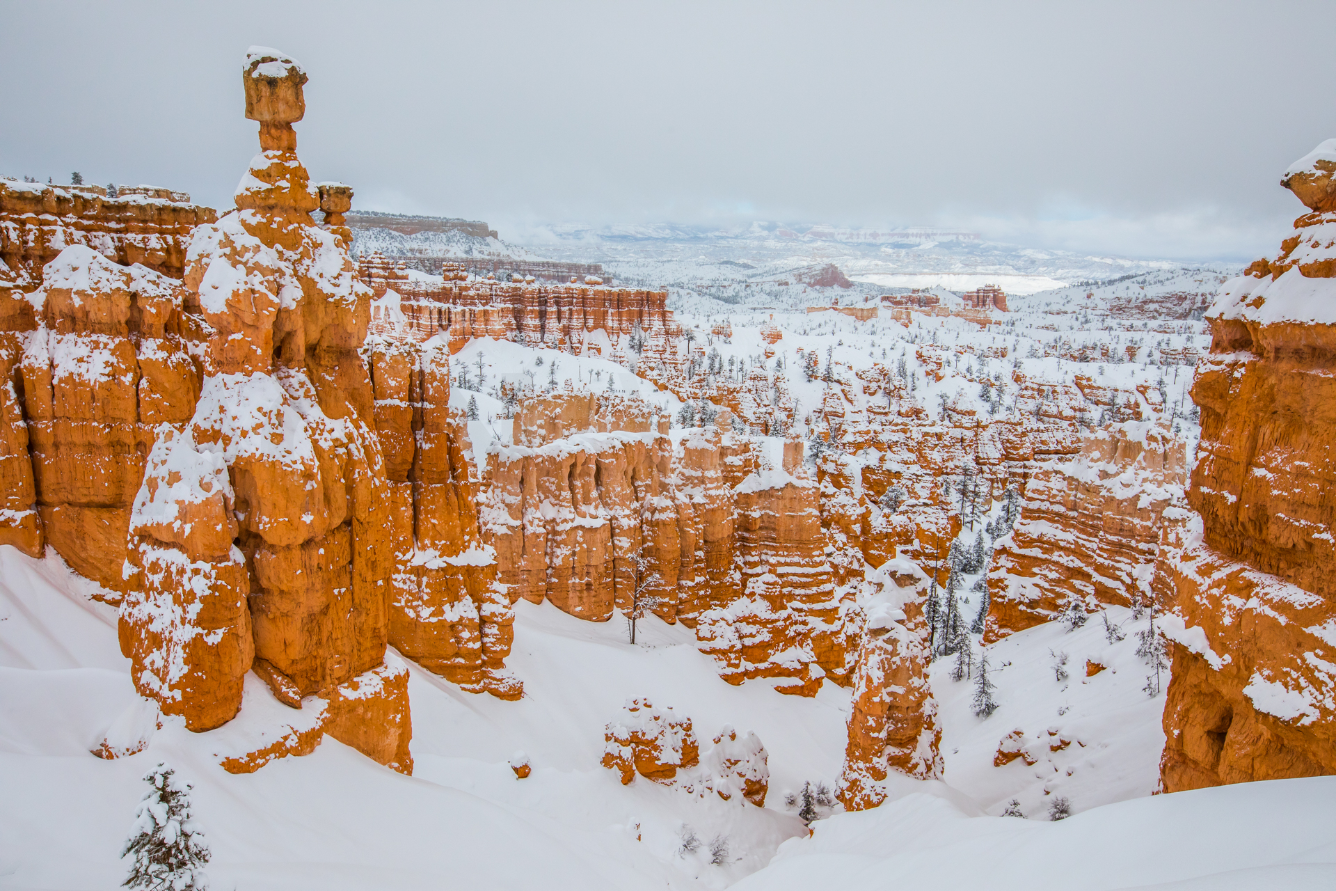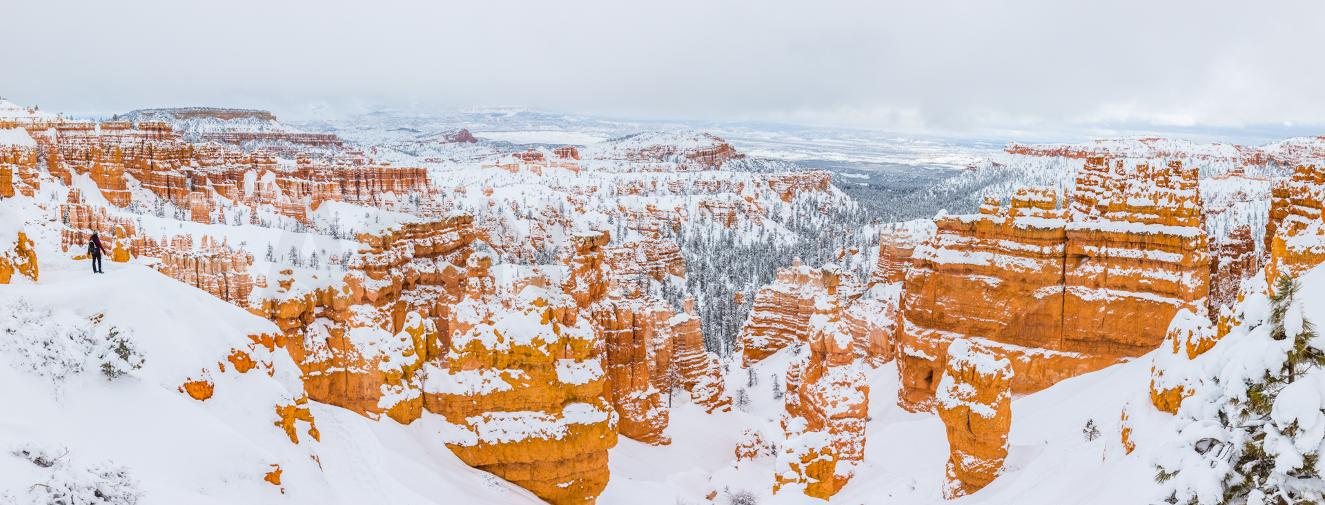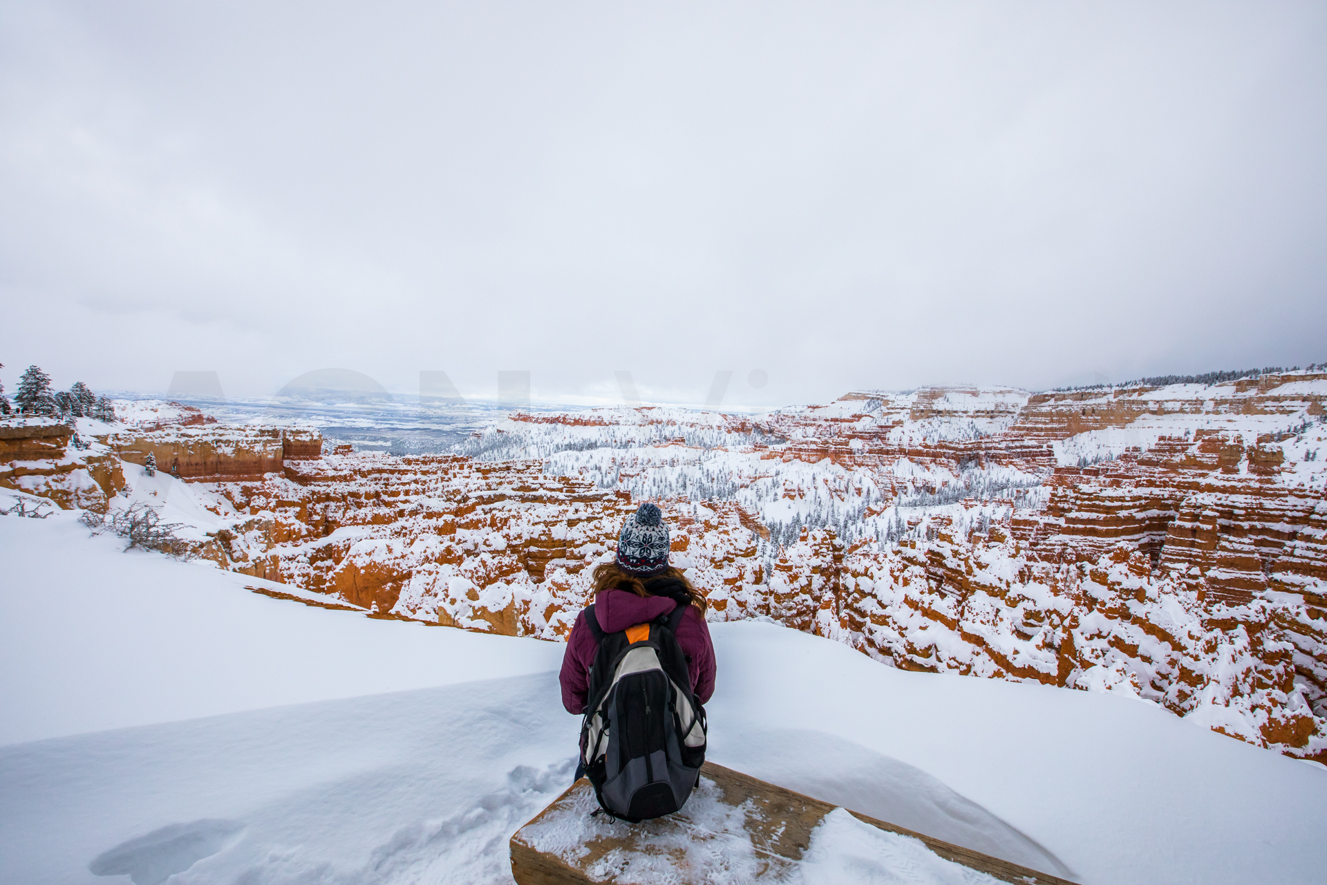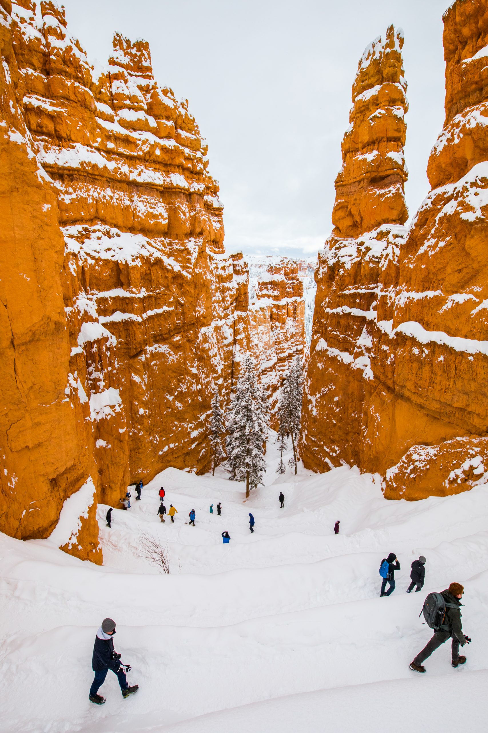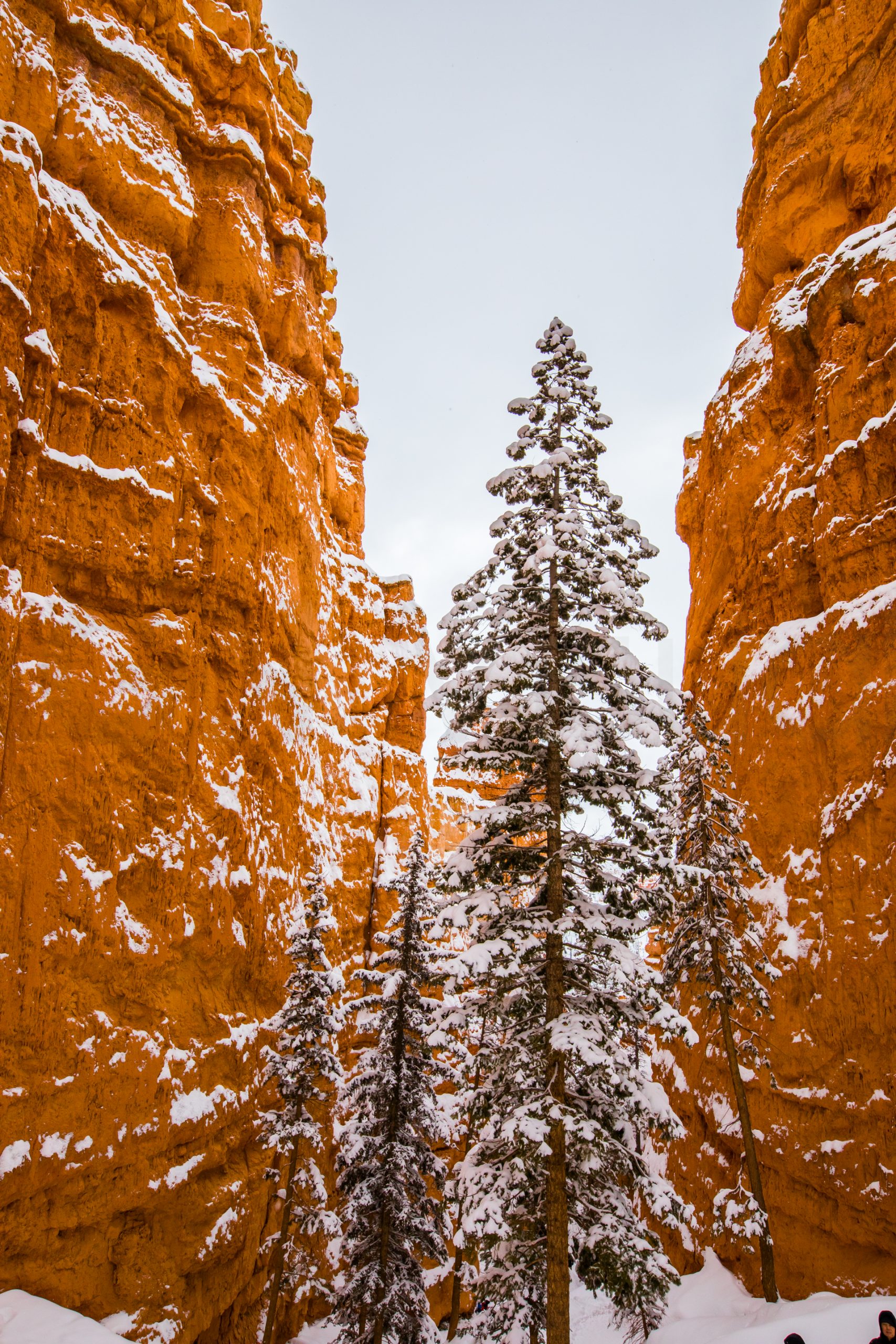 Llegamos al mirador más lejano, el parking está lleno y hay mucha niebla. Bajamos de vuelta al próximo mirador. Aparcamos y bajamos con no mucha esperanza de ver nada, hay muchas nubes bajas. Nos abrigamos, cojo la cámara y llegamos al mirador. ¡Nos quedamos con la boca abierta! ¡Qué paisaje más impresionante! Los cañones de roca naranja, los pinos y la nieve recién caída dejaban un paisaje realmente espectacular. Las fotos no hacen justicia a semejante paisaje. Nos hacemos muchas fotos y seguimos a los siguientes miradores. En uno de ellos, hay sendero pisado para andar. Dejamos el coche, nos calzamos las botas, nos abrigamos y cargo con la cámara. Fue una excursión corta pero impresionante. Caminar por esos cañones cargados de nieve fue una experiencia inolvidable.