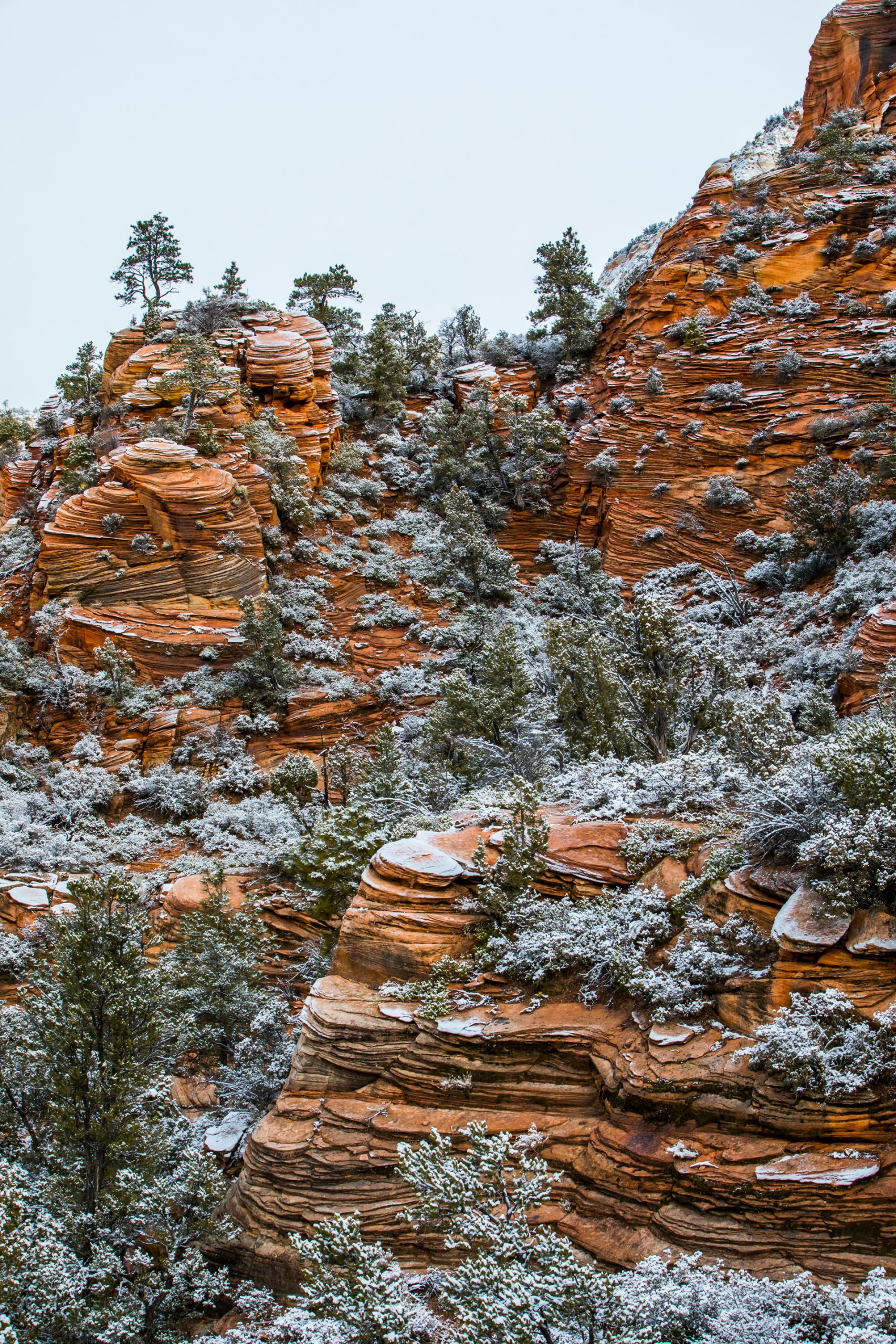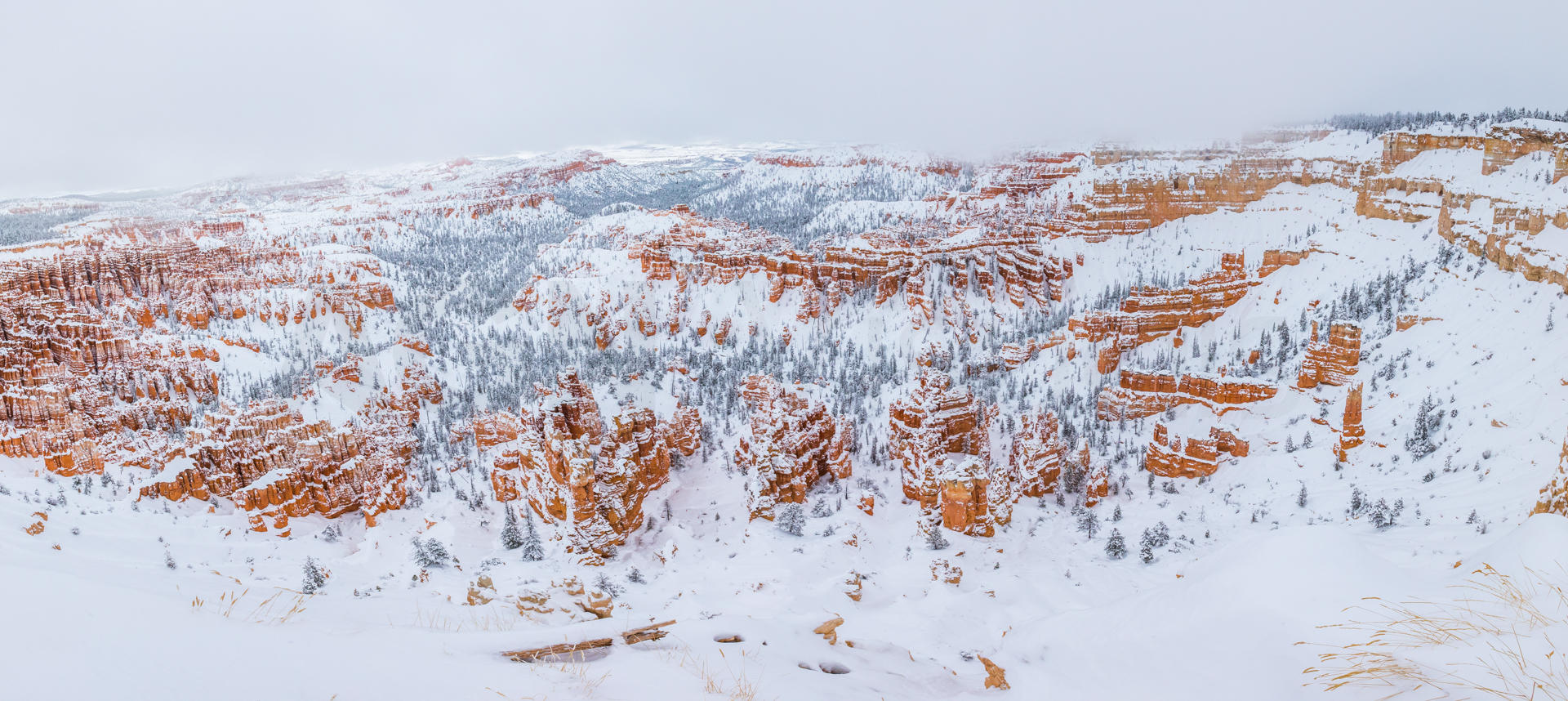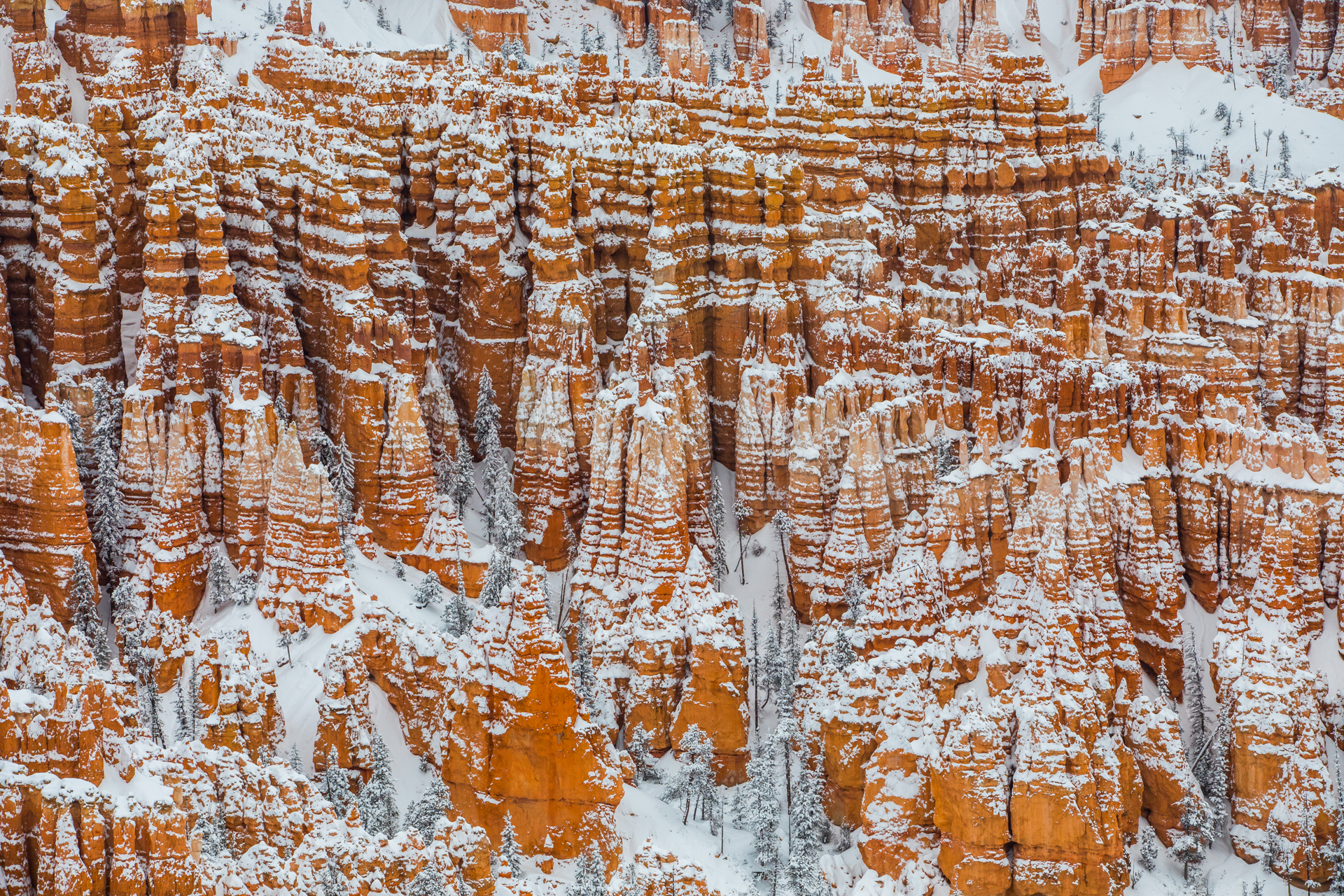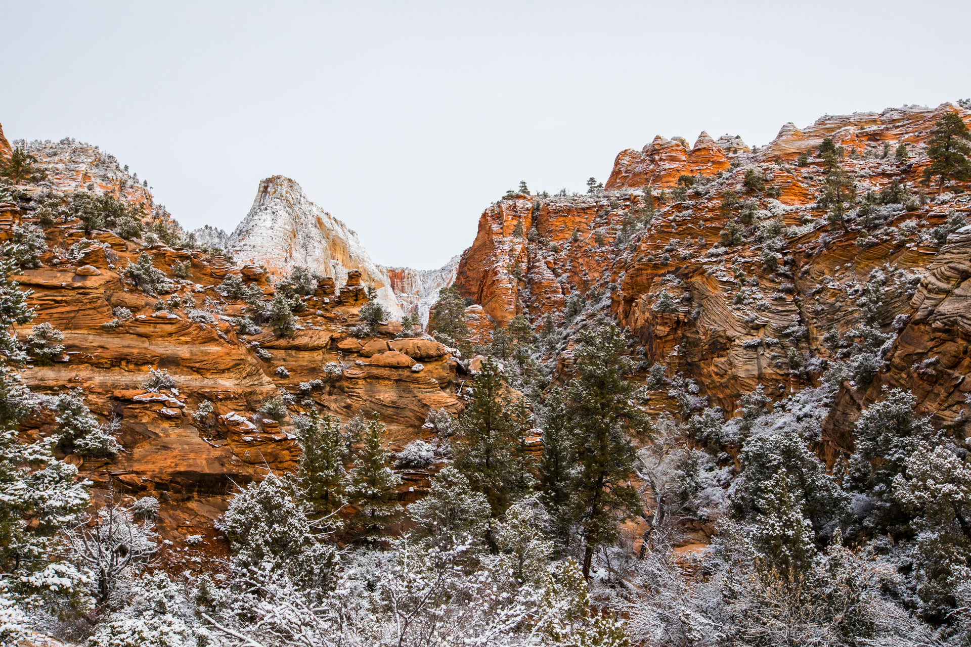 Llegamos al mirador más lejano, el parking está lleno y hay mucha niebla. Bajamos de vuelta al próximo mirador. Aparcamos y bajamos con no mucha esperanza de ver nada, hay muchas nubes bajas. Nos abrigamos, cojo la cámara y llegamos al mirador. ¡Nos quedamos con la boca abierta! ¡Qué paisaje más impresionante! Los cañones de roca naranja, los pinos y la nieve recién caída dejaban un paisaje realmente espectacular. Las fotos no hacen justicia a semejante paisaje. Nos hacemos muchas fotos y seguimos a los siguientes miradores. En uno de ellos, hay sendero pisado para andar. Dejamos el coche, nos calzamos las botas, nos abrigamos y cargo con la cámara. Fue una excursión corta pero impresionante. Caminar por esos cañones cargados de nieve fue una experiencia inolvidable.