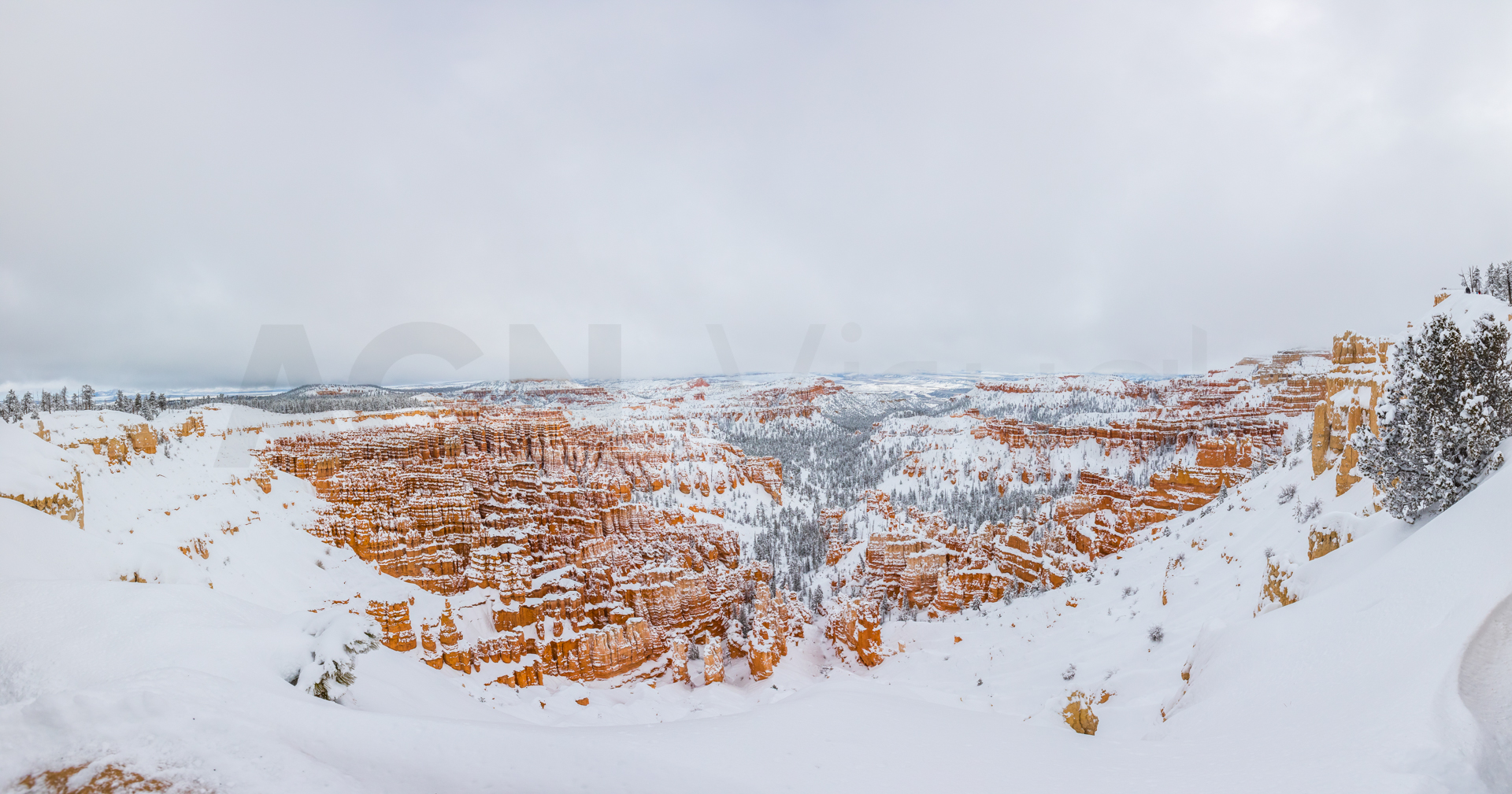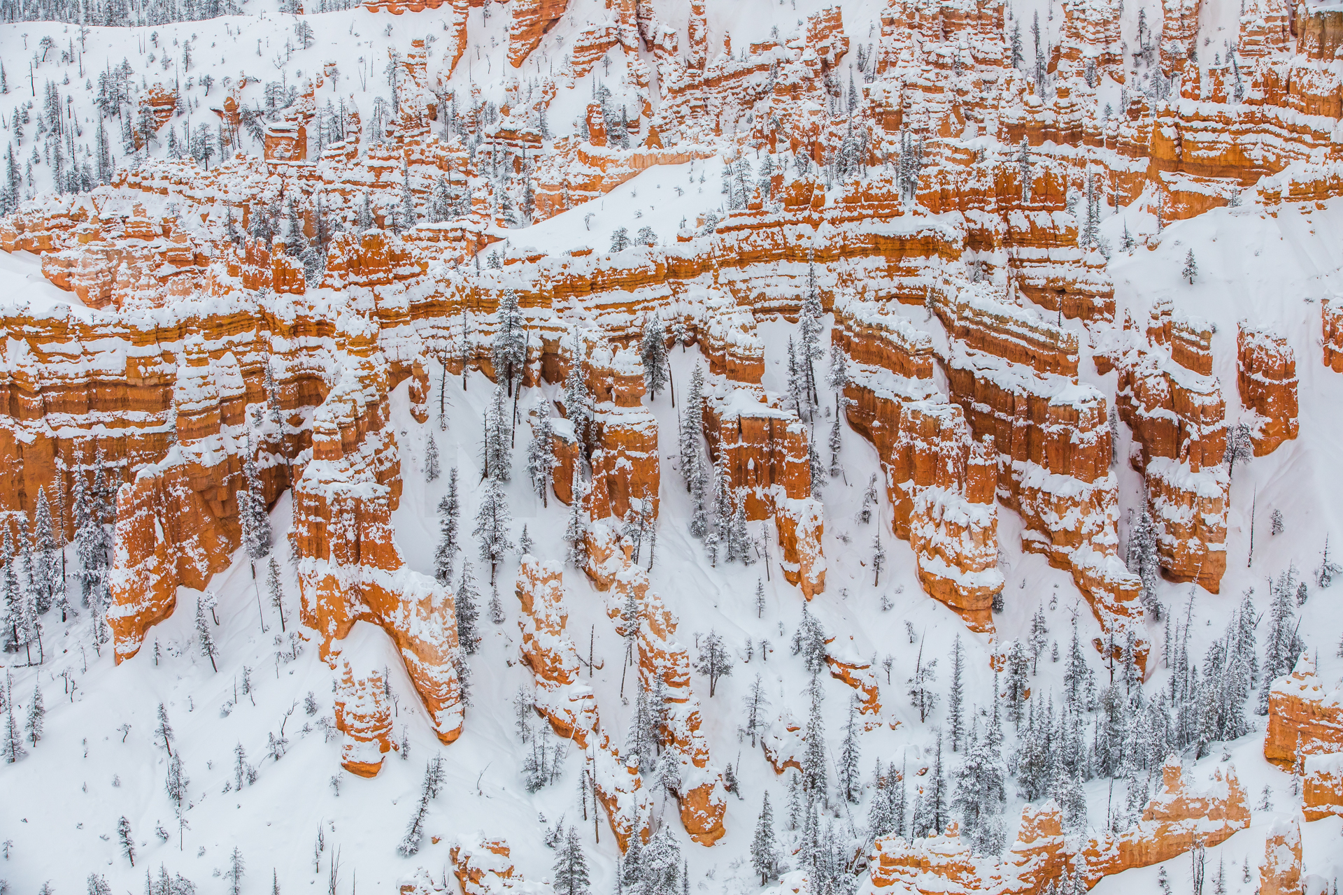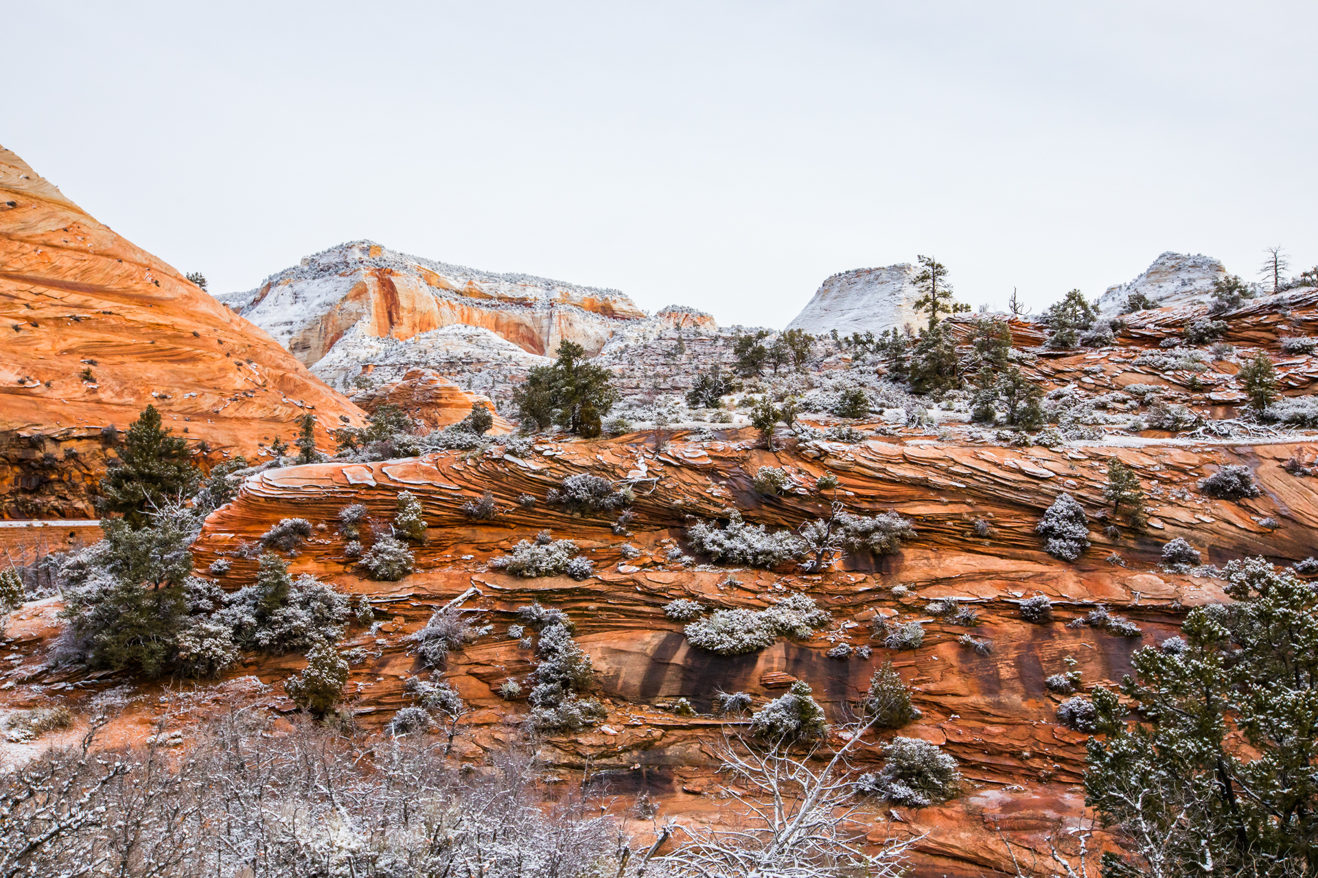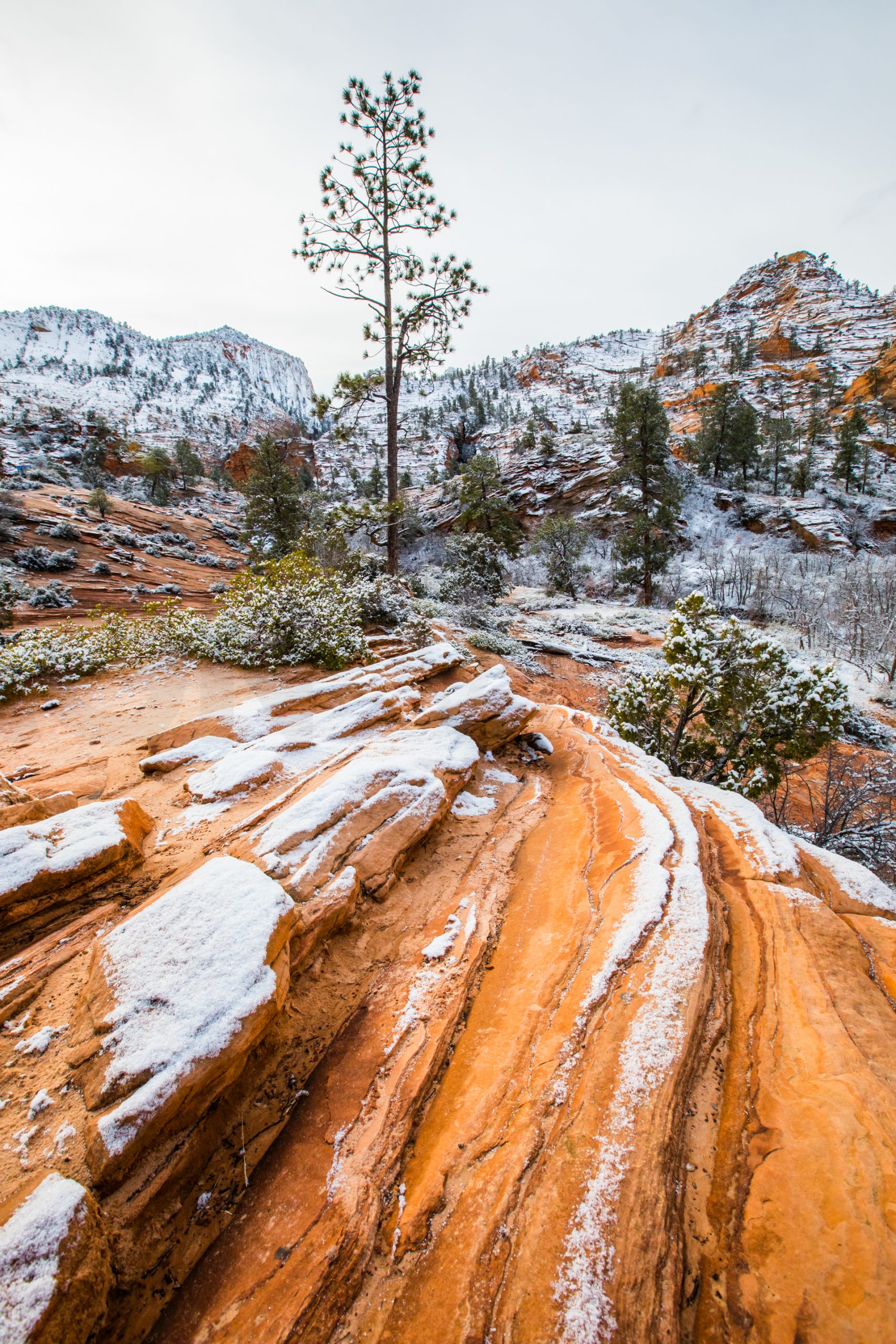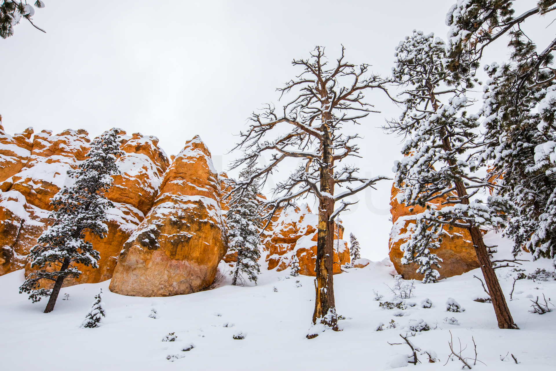 Llegamos al mirador más lejano, el parking está lleno y hay mucha niebla. Bajamos de vuelta al próximo mirador. Aparcamos y bajamos con no mucha esperanza de ver nada, hay muchas nubes bajas. Nos abrigamos, cojo la cámara y llegamos al mirador. ¡Nos quedamos con la boca abierta! ¡Qué paisaje más impresionante! Los cañones de roca naranja, los pinos y la nieve recién caída dejaban un paisaje realmente espectacular. Las fotos no hacen justicia a semejante paisaje. Nos hacemos muchas fotos y seguimos a los siguientes miradores. En uno de ellos, hay sendero pisado para andar. Dejamos el coche, nos calzamos las botas, nos abrigamos y cargo con la cámara. Fue una excursión corta pero impresionante. Caminar por esos cañones cargados de nieve fue una experiencia inolvidable.