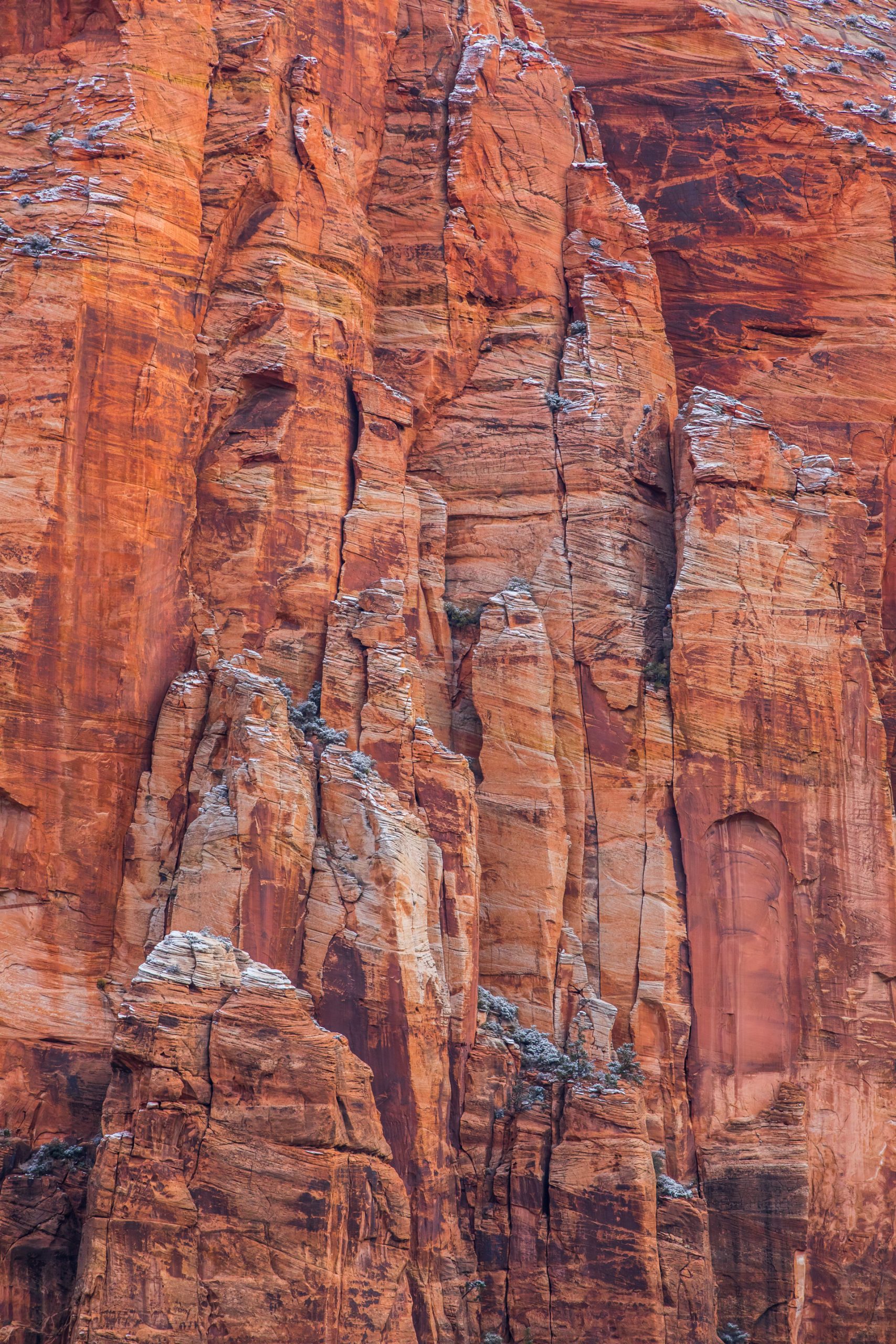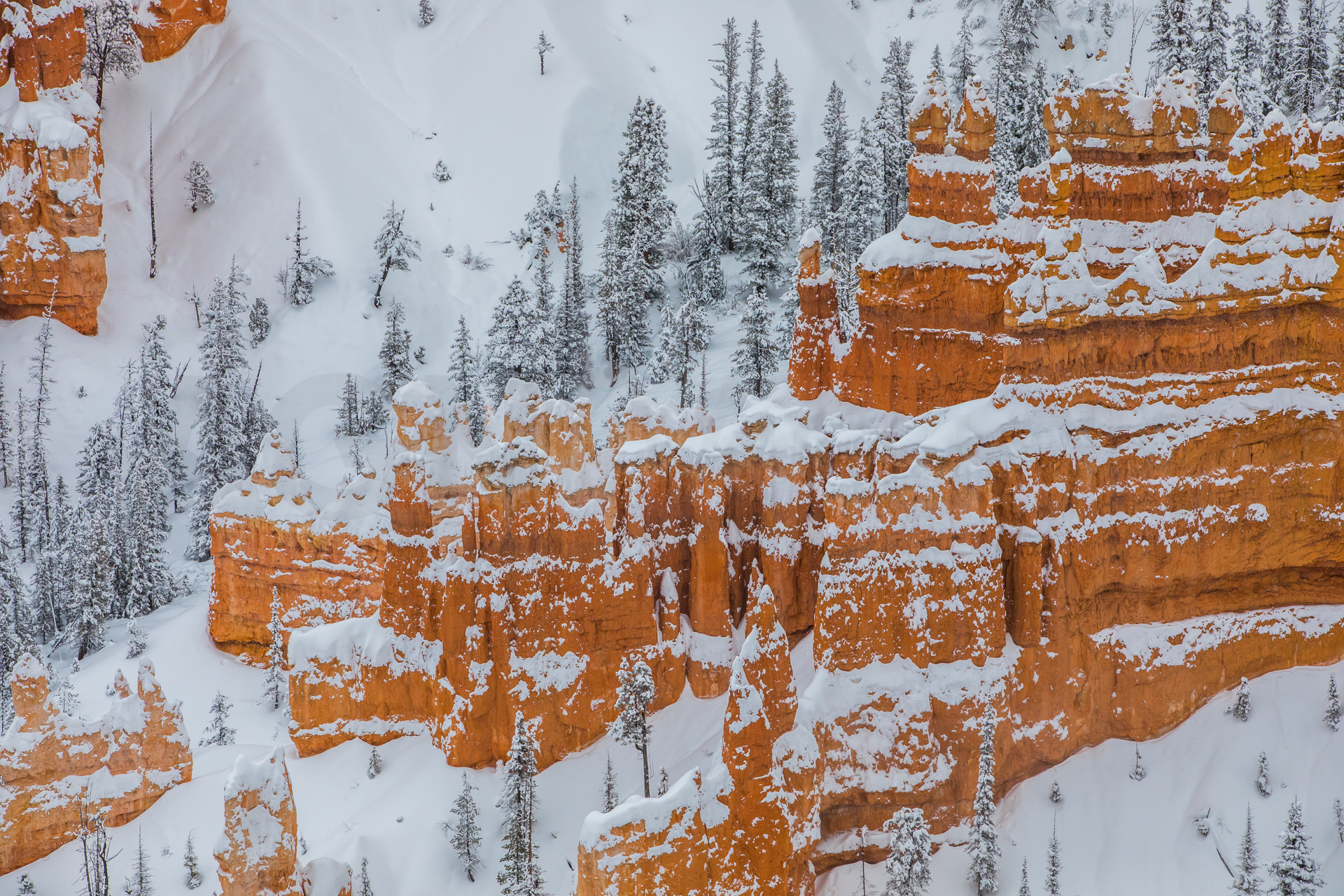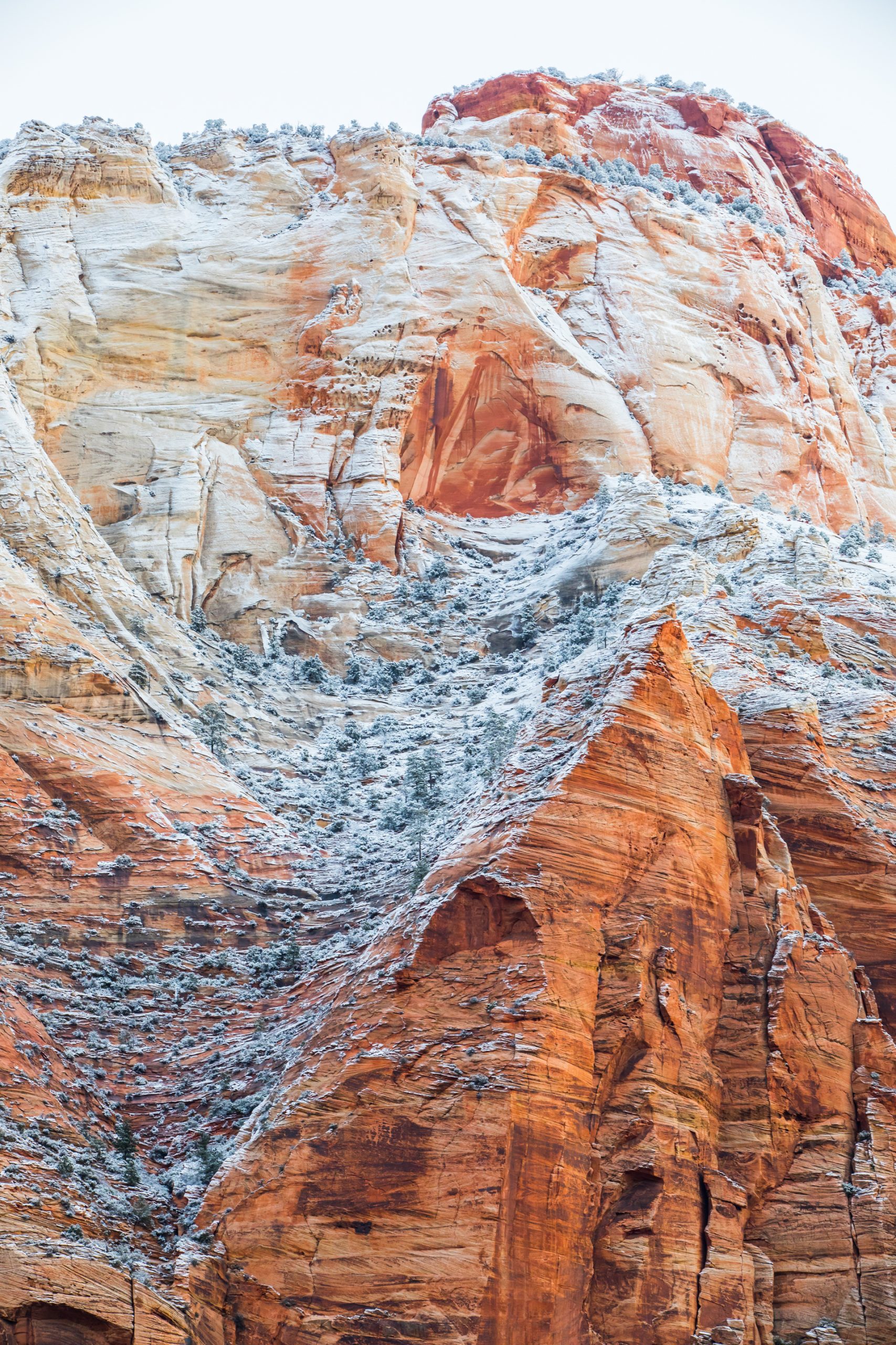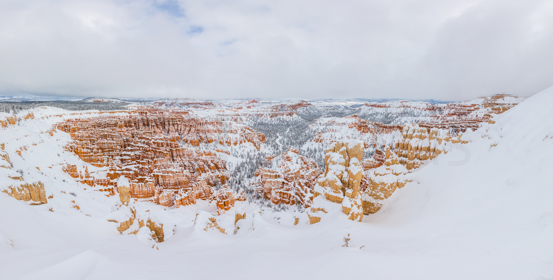 Llegamos al mirador más lejano, el parking está lleno y hay mucha niebla. Bajamos de vuelta al próximo mirador. Aparcamos y bajamos con no mucha esperanza de ver nada, hay muchas nubes bajas. Nos abrigamos, cojo la cámara y llegamos al mirador. ¡Nos quedamos con la boca abierta! ¡Qué paisaje más impresionante! Los cañones de roca naranja, los pinos y la nieve recién caída dejaban un paisaje realmente espectacular. Las fotos no hacen justicia a semejante paisaje. Nos hacemos muchas fotos y seguimos a los siguientes miradores. En uno de ellos, hay sendero pisado para andar. Dejamos el coche, nos calzamos las botas, nos abrigamos y cargo con la cámara. Fue una excursión corta pero impresionante. Caminar por esos cañones cargados de nieve fue una experiencia inolvidable.