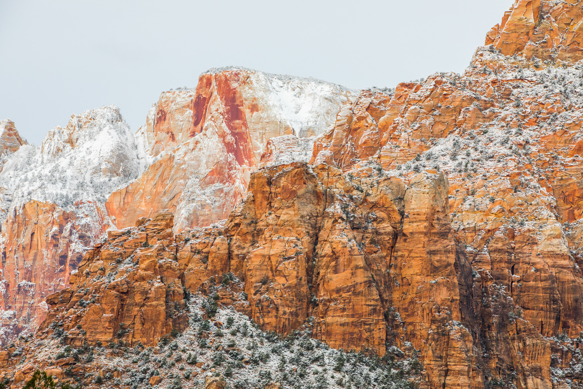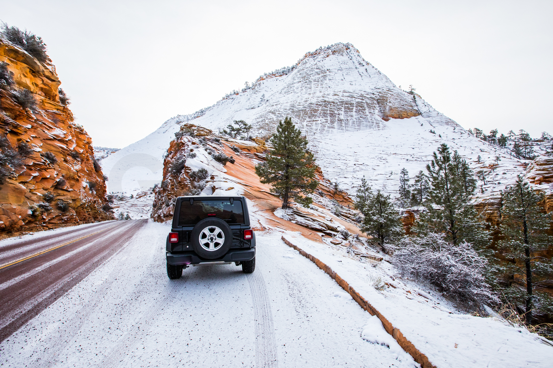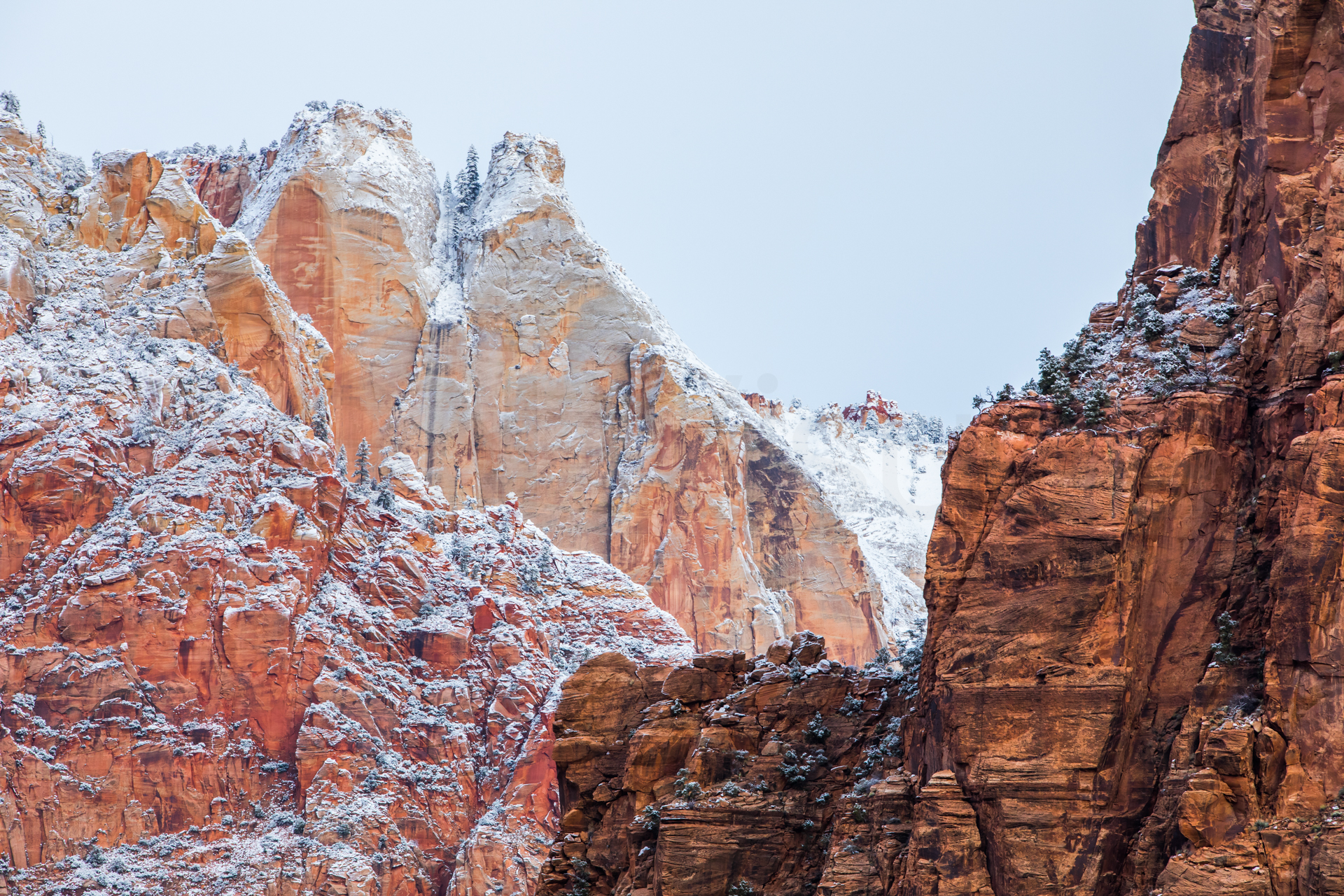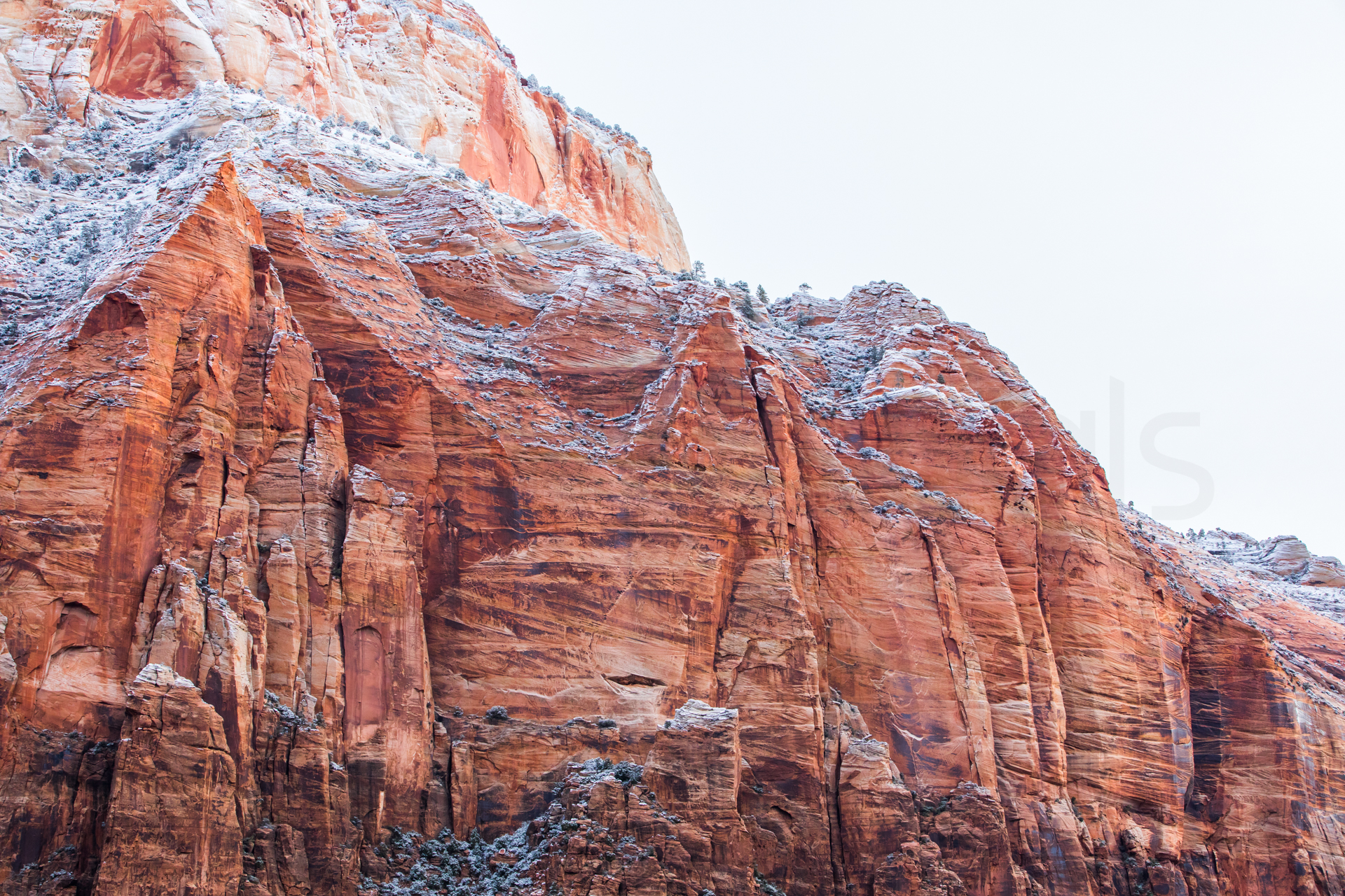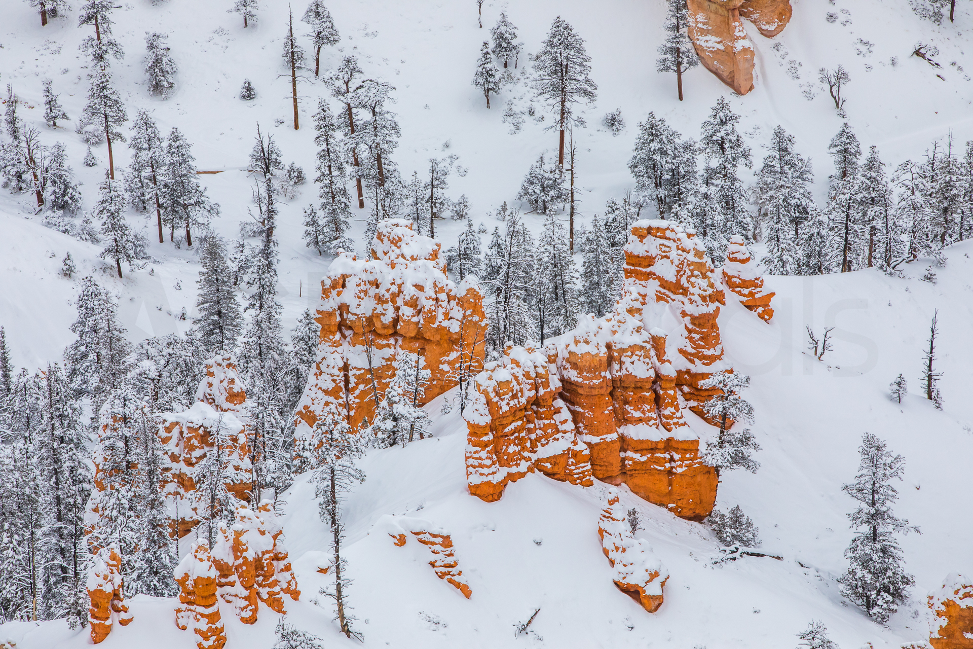 Llegamos al mirador más lejano, el parking está lleno y hay mucha niebla. Bajamos de vuelta al próximo mirador. Aparcamos y bajamos con no mucha esperanza de ver nada, hay muchas nubes bajas. Nos abrigamos, cojo la cámara y llegamos al mirador. ¡Nos quedamos con la boca abierta! ¡Qué paisaje más impresionante! Los cañones de roca naranja, los pinos y la nieve recién caída dejaban un paisaje realmente espectacular. Las fotos no hacen justicia a semejante paisaje. Nos hacemos muchas fotos y seguimos a los siguientes miradores. En uno de ellos, hay sendero pisado para andar. Dejamos el coche, nos calzamos las botas, nos abrigamos y cargo con la cámara. Fue una excursión corta pero impresionante. Caminar por esos cañones cargados de nieve fue una experiencia inolvidable.