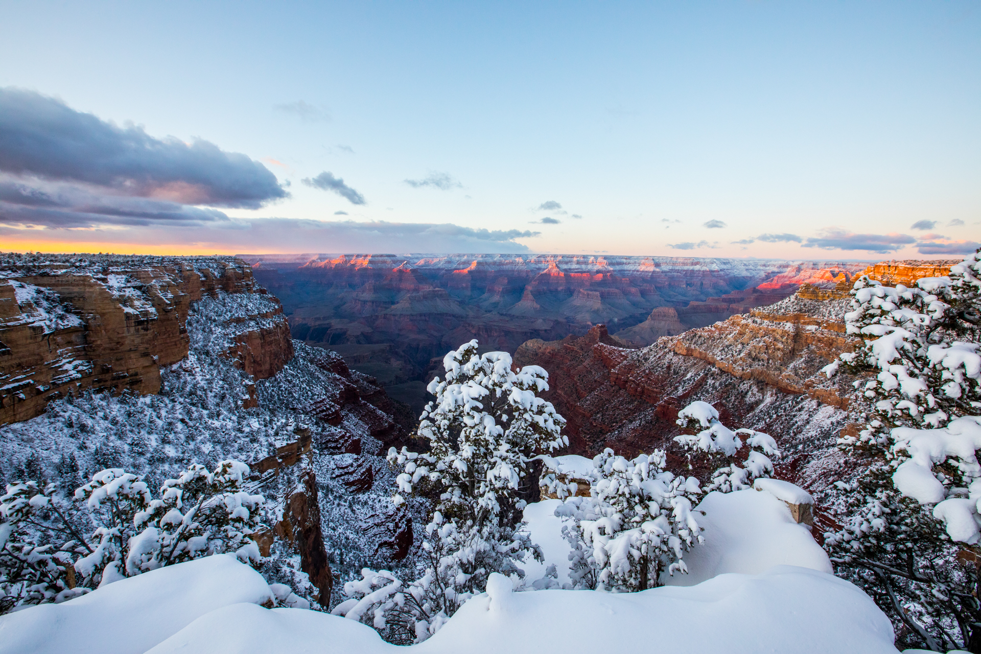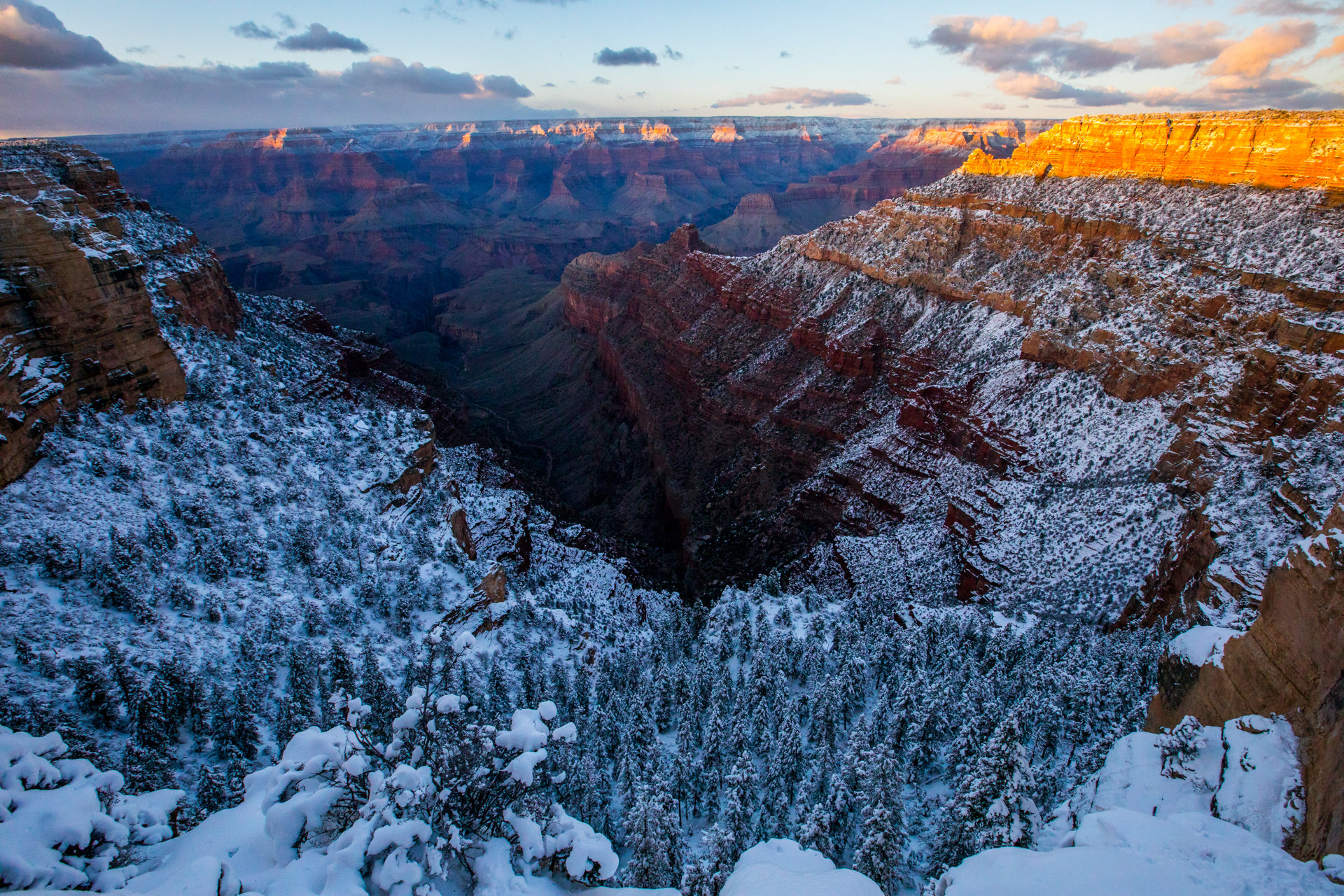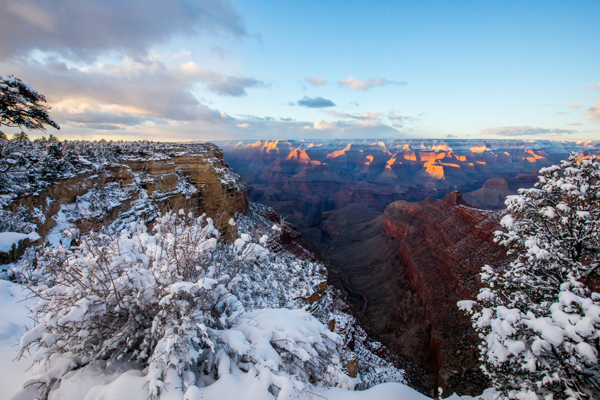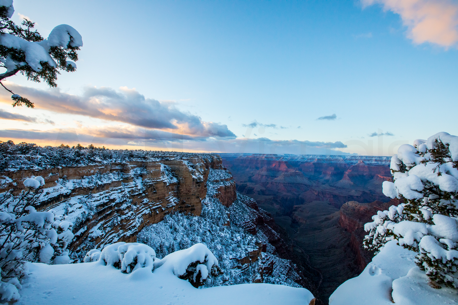 Vamos a una zona de miradores donde no hay tanta gente y tengo la suerte de encontrar un sitio para aparcar (encima pequeña montaña de nieve). Nos bajamos y ¡qué vistas! ¡Y sin apenas gente! La puesta de sol aquí fue realmente espectacular. Esos cañones del Río Colorado iluminados por las últimas luces del día, con la nieve cubriendo las partes altas del paisaje, fue un regalo para la vista, sin duda. No podemos parar de hacer fotos y pasamos unos momentos geniales disfrutando de esos paisajes.