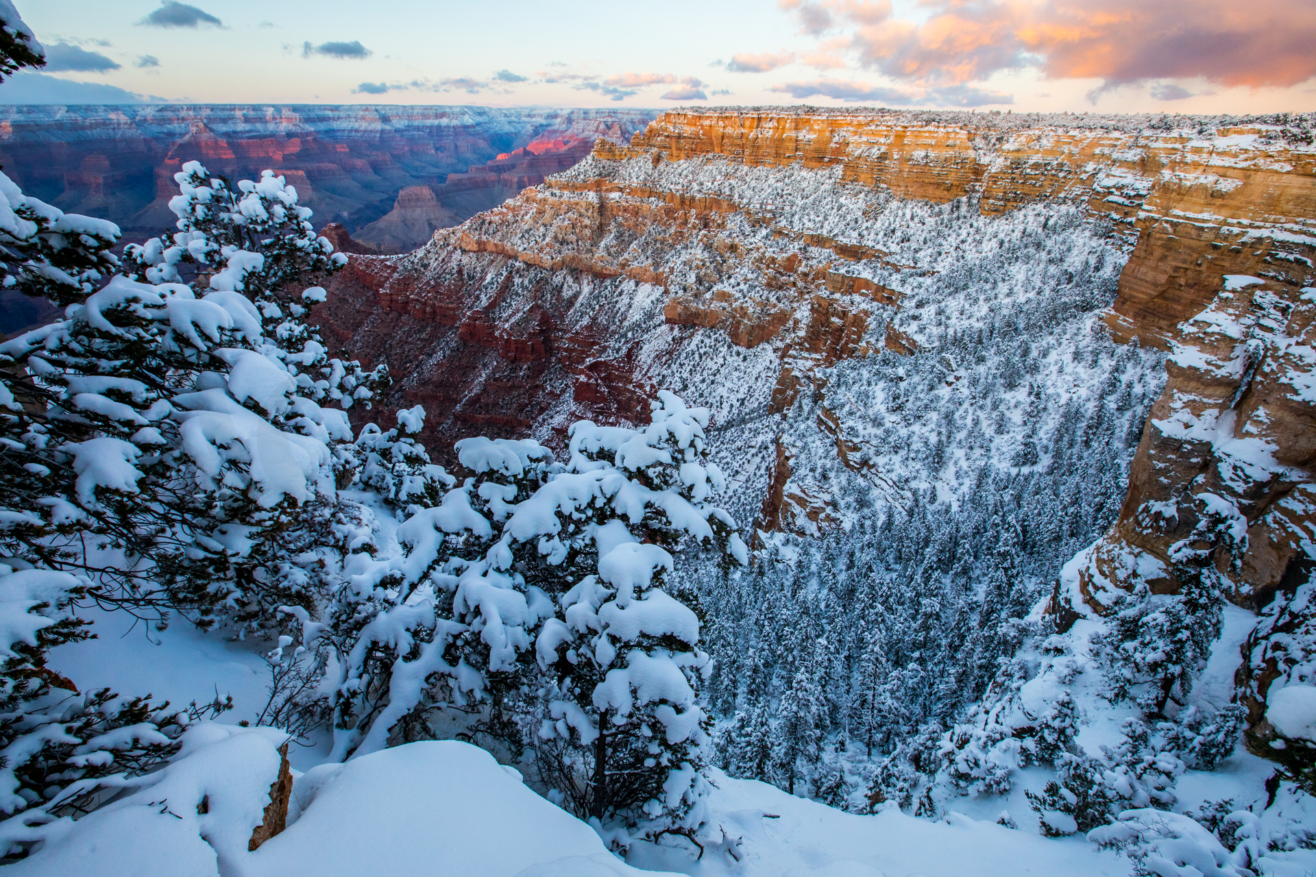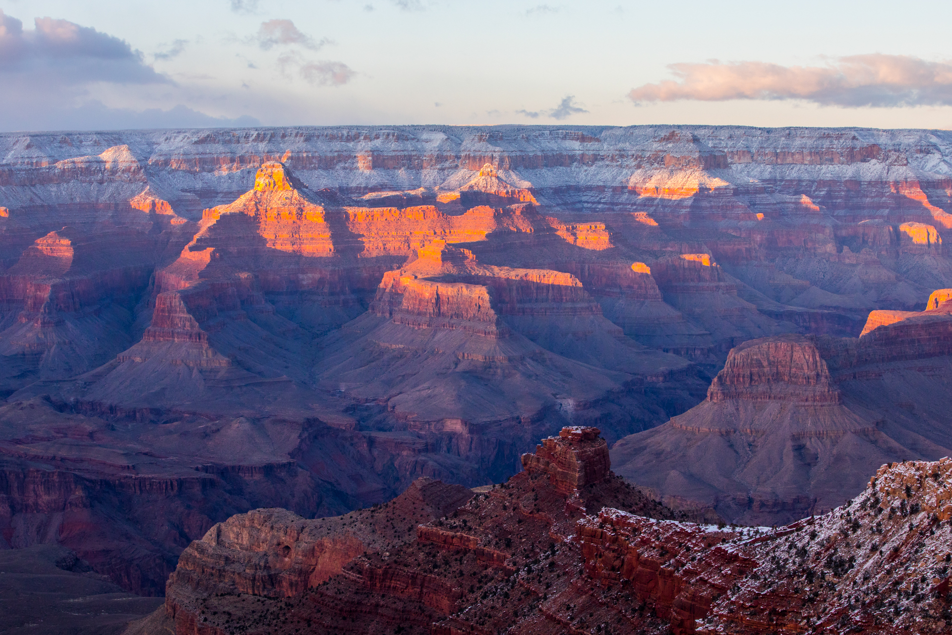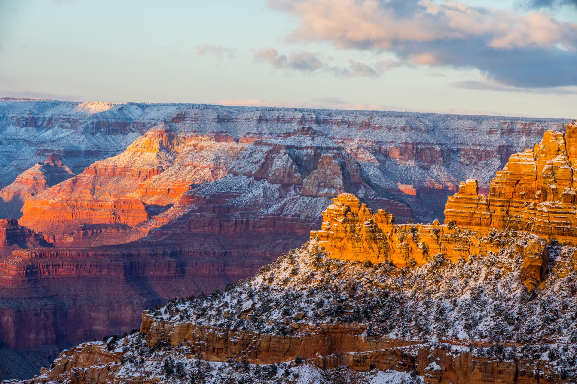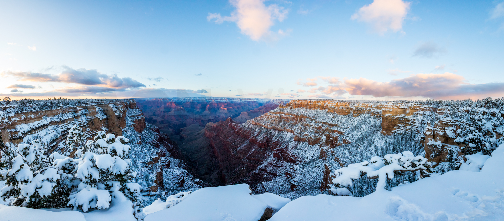 Vamos a una zona de miradores donde no hay tanta gente y tengo la suerte de encontrar un sitio para aparcar (encima pequeña montaña de nieve). Nos bajamos y ¡qué vistas! ¡Y sin apenas gente! La puesta de sol aquí fue realmente espectacular. Esos cañones del Río Colorado iluminados por las últimas luces del día, con la nieve cubriendo las partes altas del paisaje, fue un regalo para la vista, sin duda. No podemos parar de hacer fotos y pasamos unos momentos geniales disfrutando de esos paisajes.