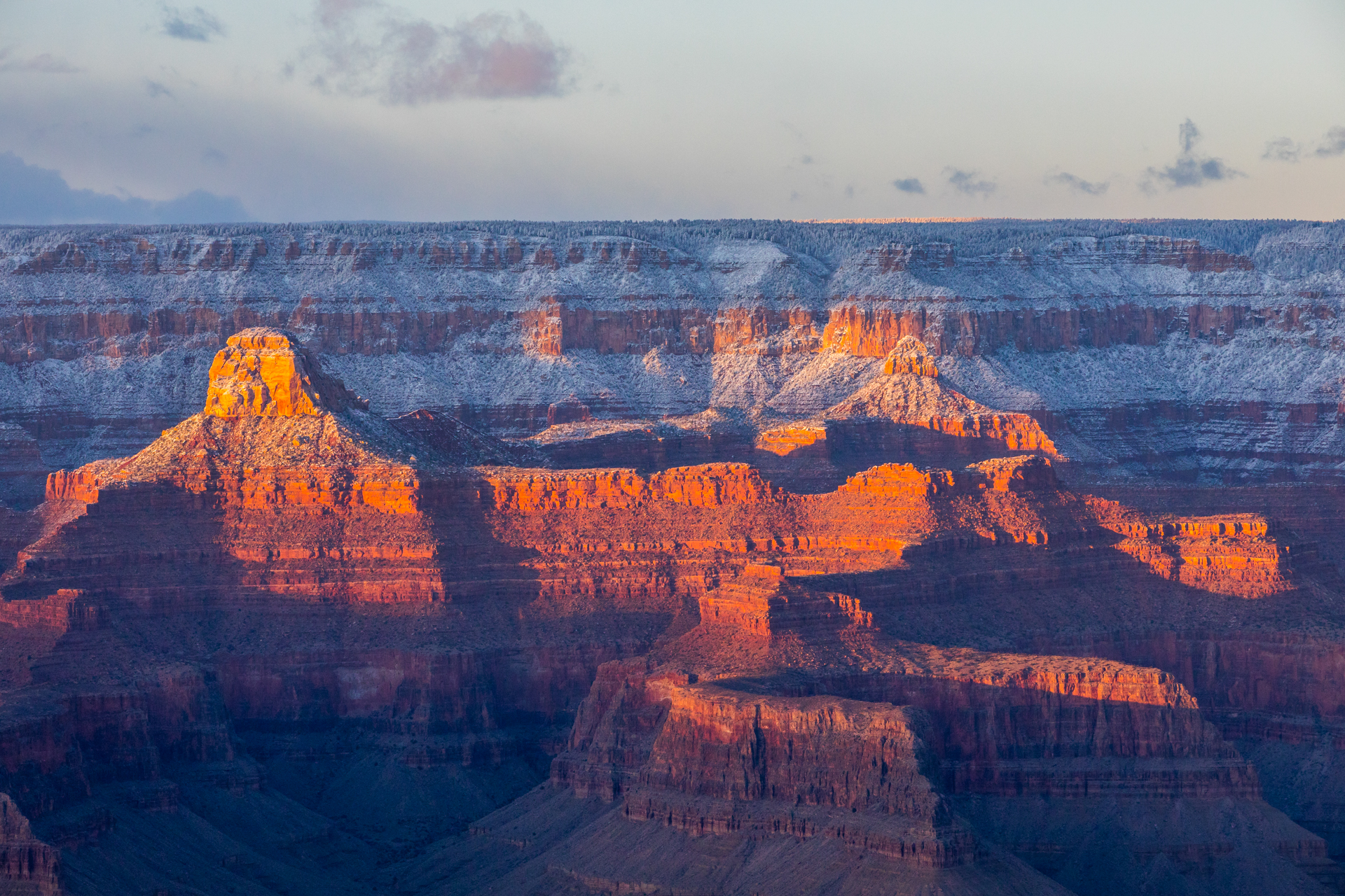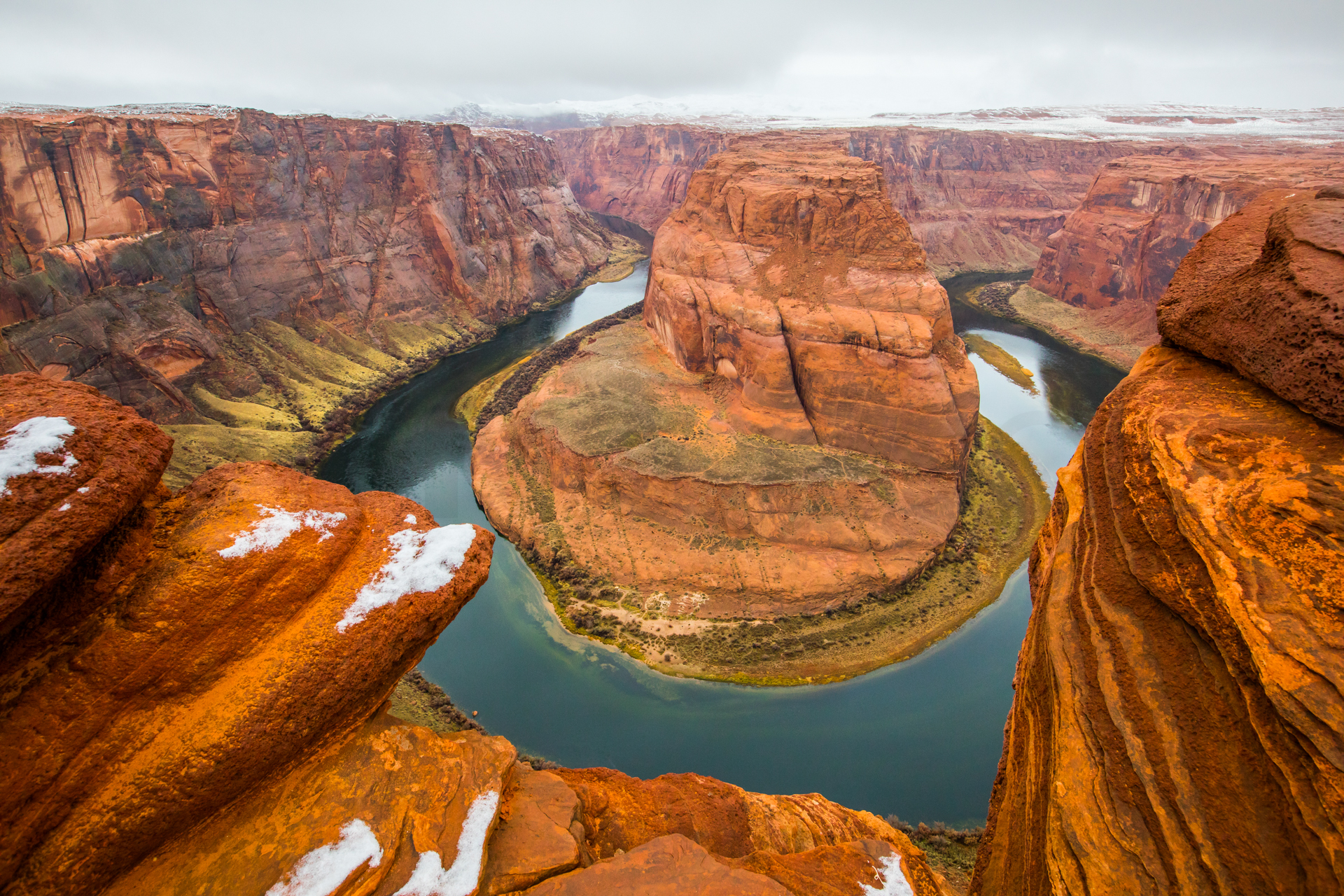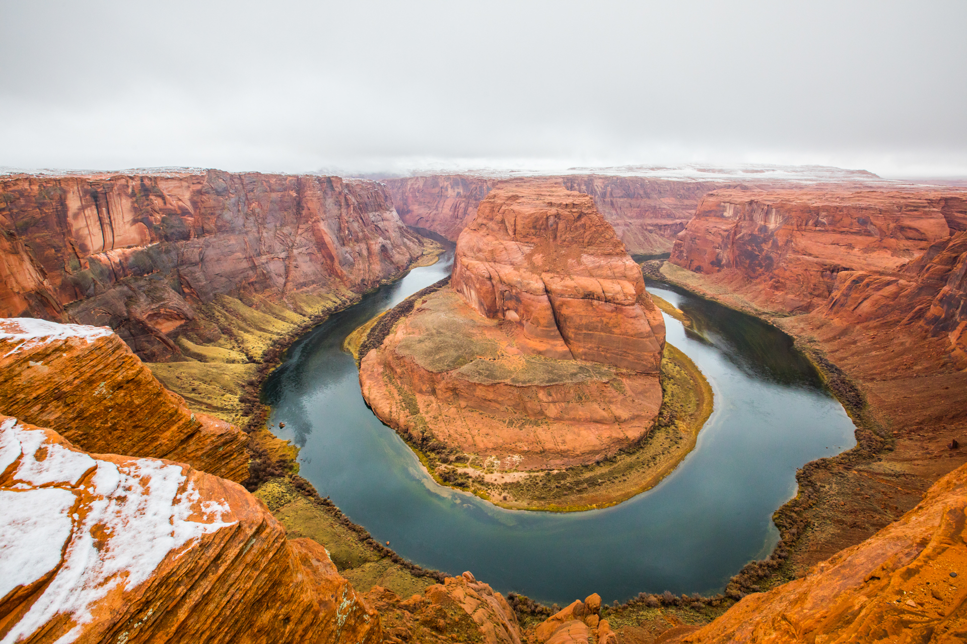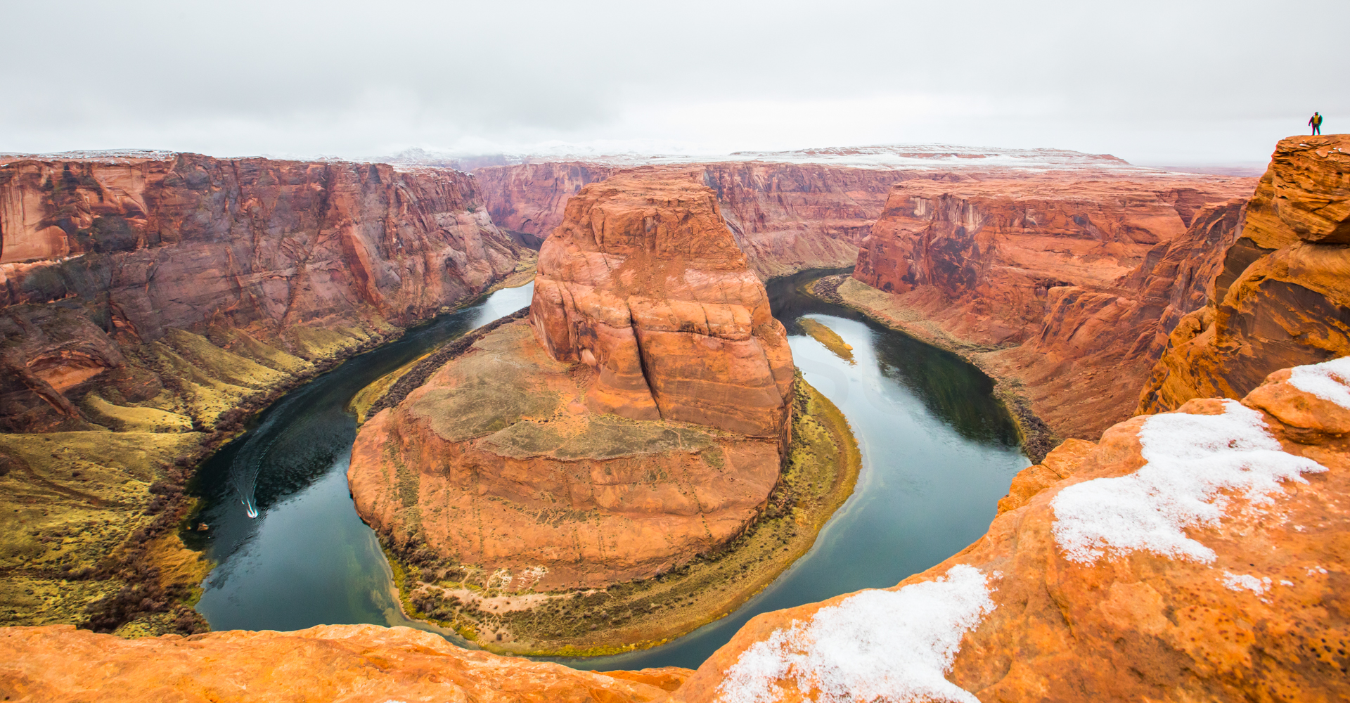 Vamos a una zona de miradores donde no hay tanta gente y tengo la suerte de encontrar un sitio para aparcar (encima pequeña montaña de nieve). Nos bajamos y ¡qué vistas! ¡Y sin apenas gente! La puesta de sol aquí fue realmente espectacular. Esos cañones del Río Colorado iluminados por las últimas luces del día, con la nieve cubriendo las partes altas del paisaje, fue un regalo para la vista, sin duda. No podemos parar de hacer fotos y pasamos unos momentos geniales disfrutando de esos paisajes.