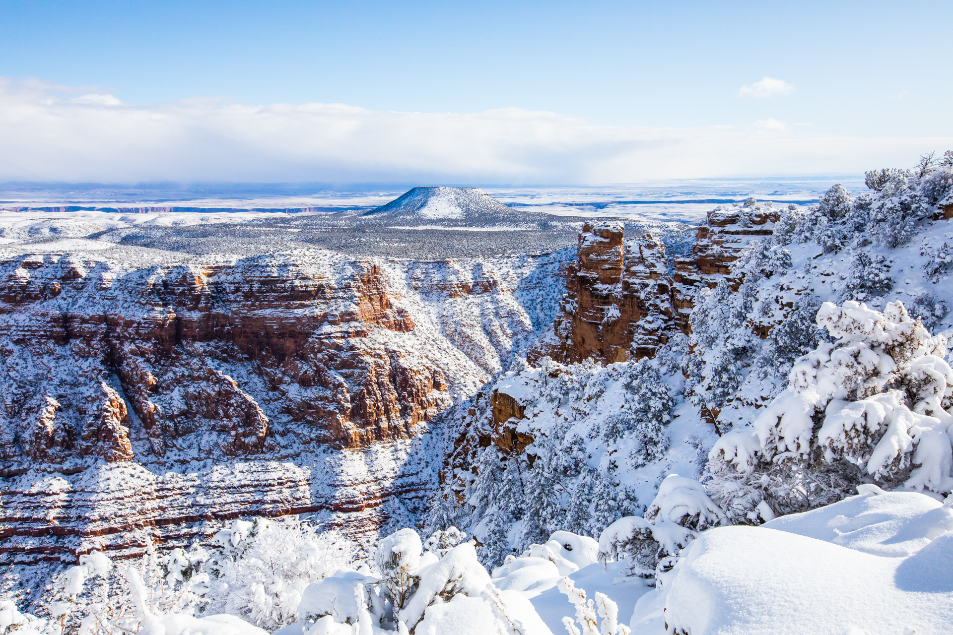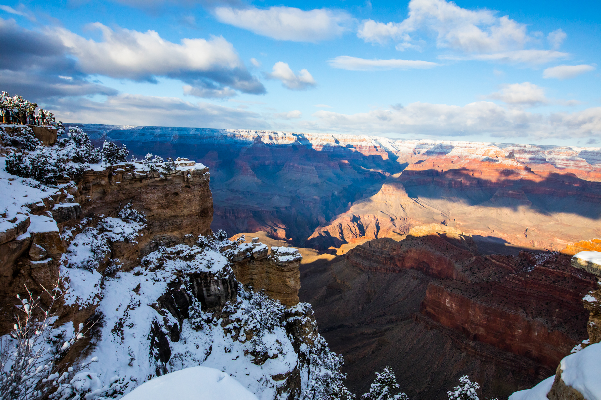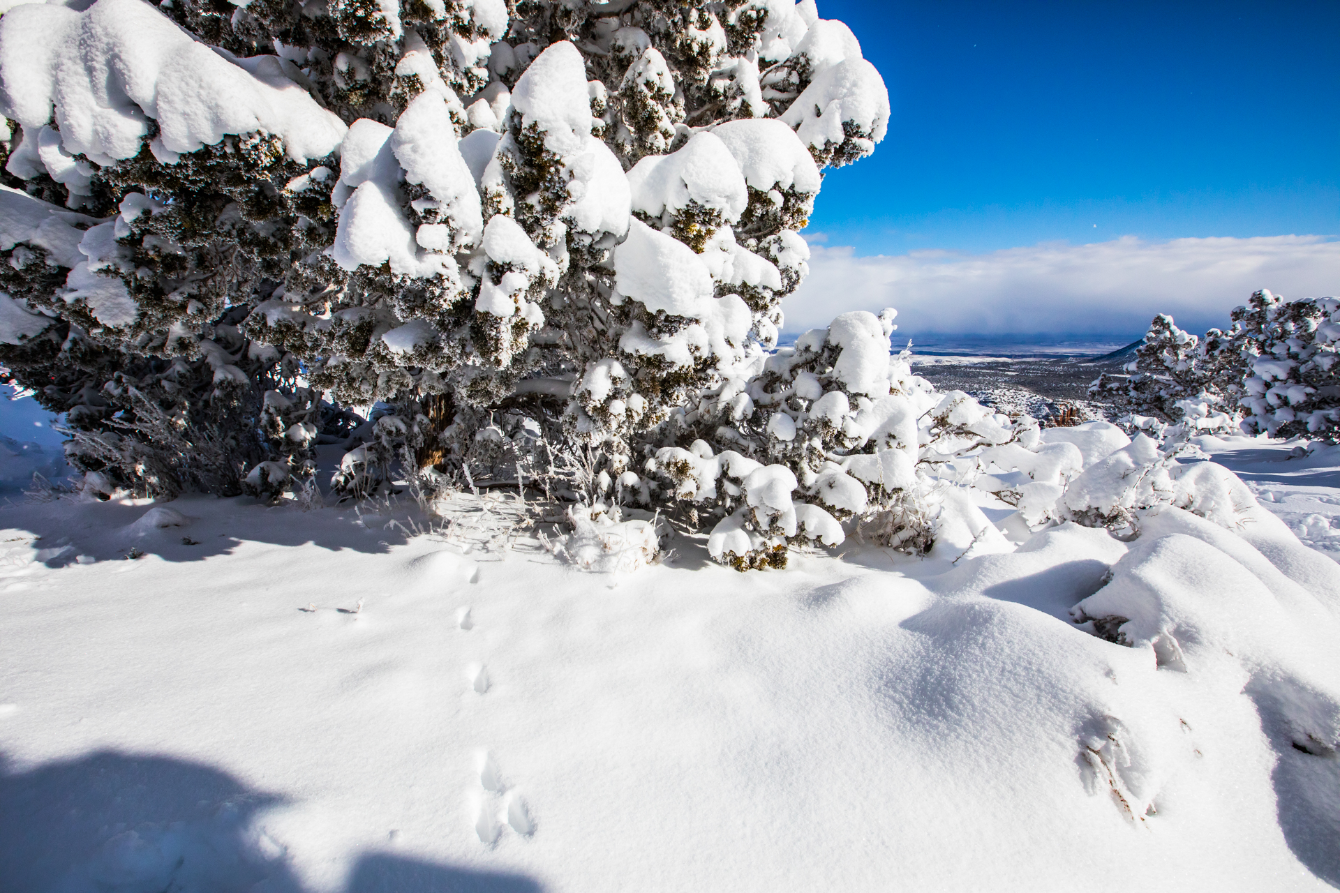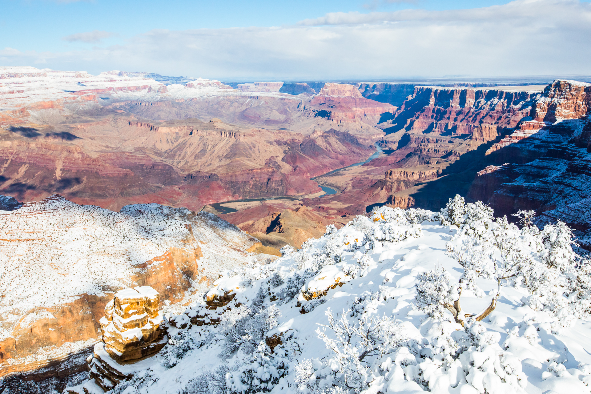 Continuamos y nos dirigimos hacia el Grand Canyon, iremos al mirador este del Parque Nacional del Grand Canyon del Colorado (Desert View Road) con intención de seguir por la carretera de los miradores hasta la zona central. Cuando llegamos, la carretera está cerrada y aparcamos en el parking. El parking es una pista de hielo y hay más de un palmo de nieve virgen de esta misma noche en el paisaje. Sabemos que ese día es genial, paisaje recién nevado y soleado. Nos calzamos bien, nos abrigamos, cogemos la cámara y hacia los miradores a pie. Llegamos al primer mirador y nos volvemos a quedar con la boca abierta. ¡Qué inmensidad de paisajes! ¡Y todo recién nevado! El contraste de la roca del desierto y la nieve dejaban un paisaje espectacular. Vamos andando y disfrutando por estos miradores y no podíamos parar de hacer fotos. ¡Qué momentos increíbles vivimos esa mañana!