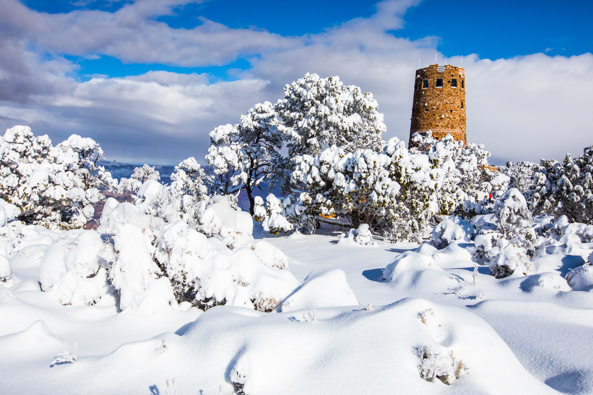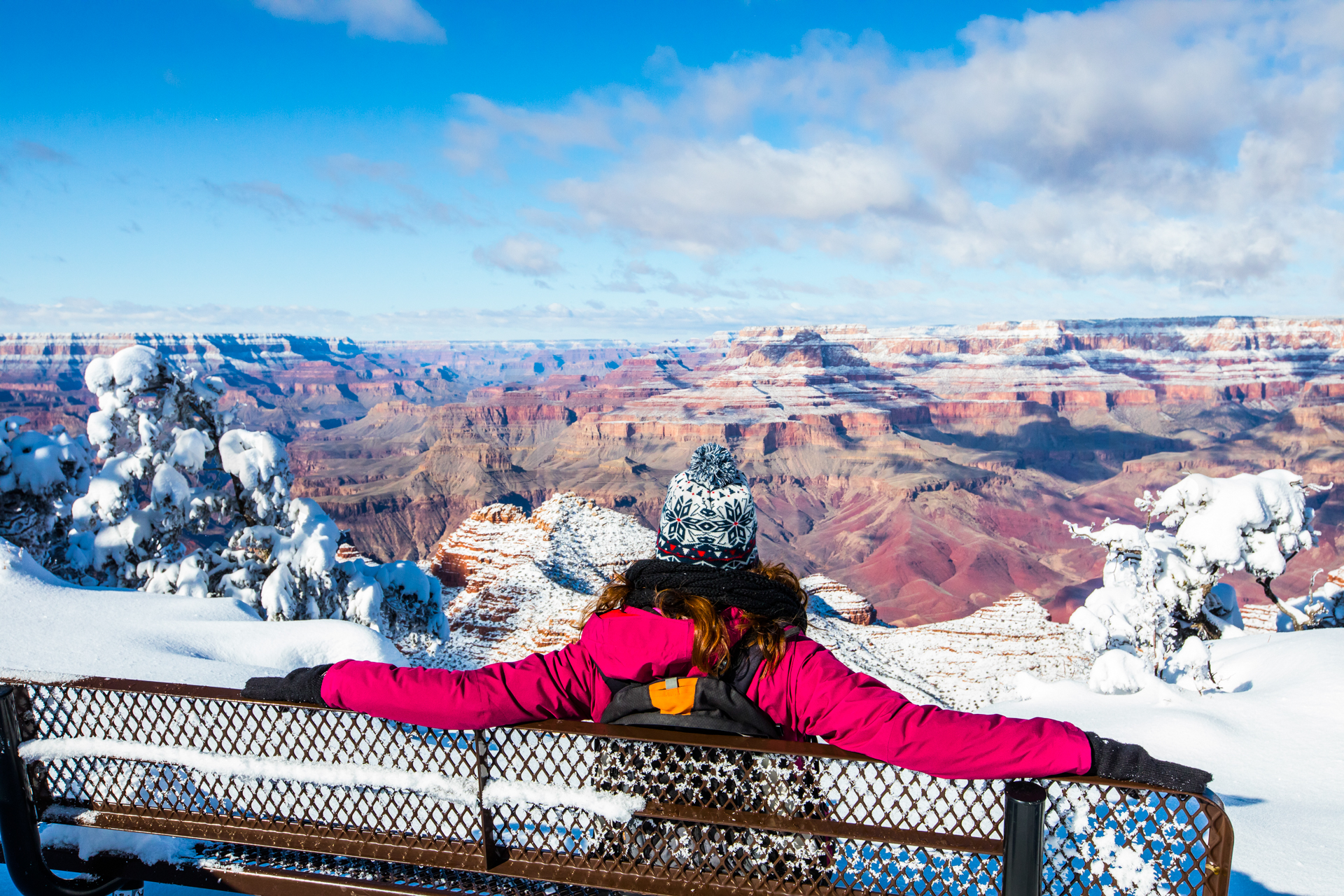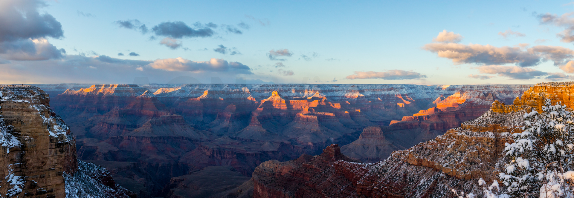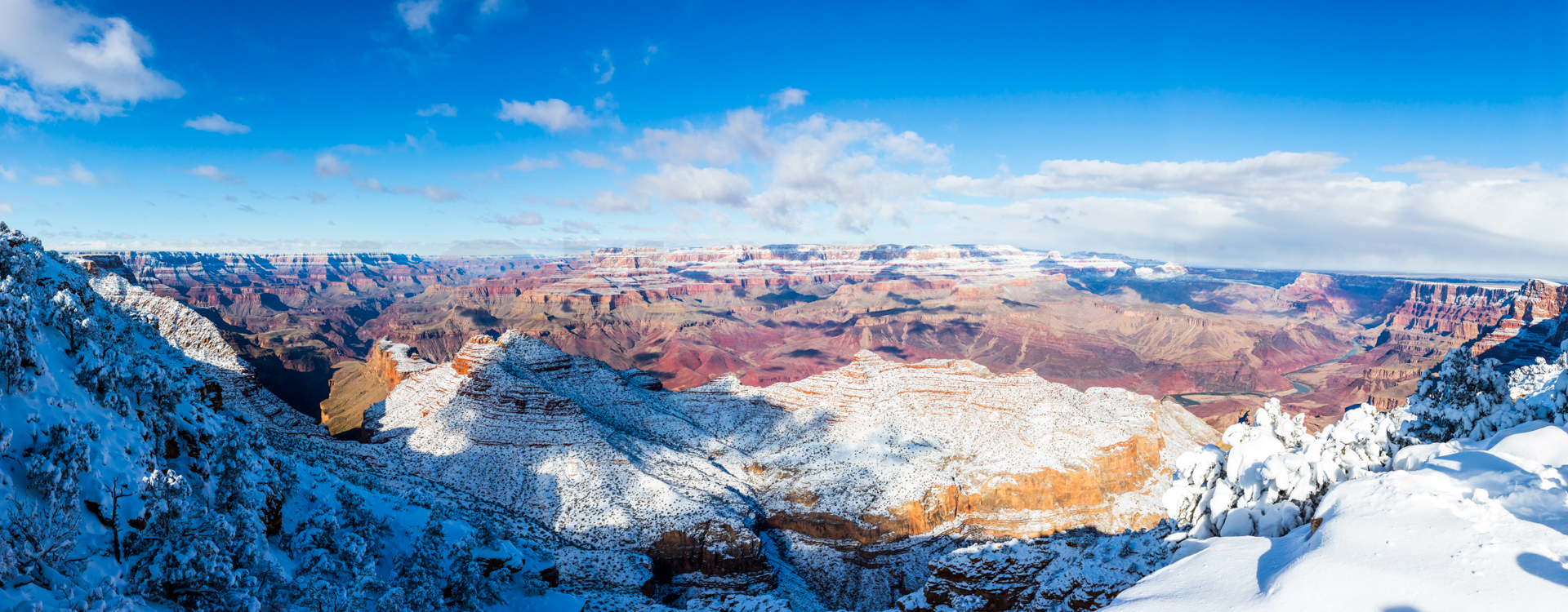 Continuamos y nos dirigimos hacia el Grand Canyon, iremos al mirador este del Parque Nacional del Grand Canyon del Colorado (Desert View Road) con intención de seguir por la carretera de los miradores hasta la zona central. Cuando llegamos, la carretera está cerrada y aparcamos en el parking. El parking es una pista de hielo y hay más de un palmo de nieve virgen de esta misma noche en el paisaje. Sabemos que ese día es genial, paisaje recién nevado y soleado. Nos calzamos bien, nos abrigamos, cogemos la cámara y hacia los miradores a pie. Llegamos al primer mirador y nos volvemos a quedar con la boca abierta. ¡Qué inmensidad de paisajes! ¡Y todo recién nevado! El contraste de la roca del desierto y la nieve dejaban un paisaje espectacular. Vamos andando y disfrutando por estos miradores y no podíamos parar de hacer fotos. ¡Qué momentos increíbles vivimos esa mañana!
