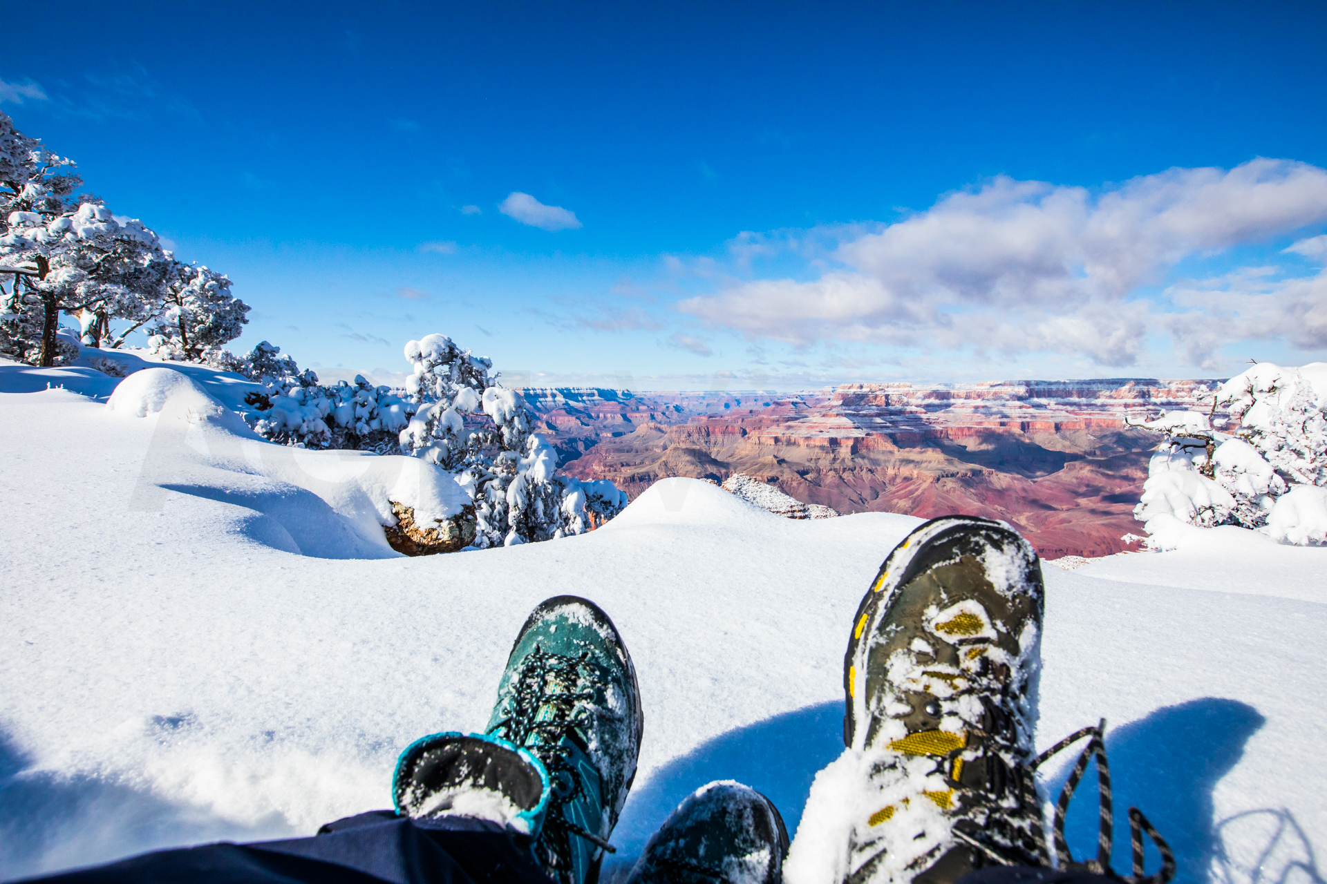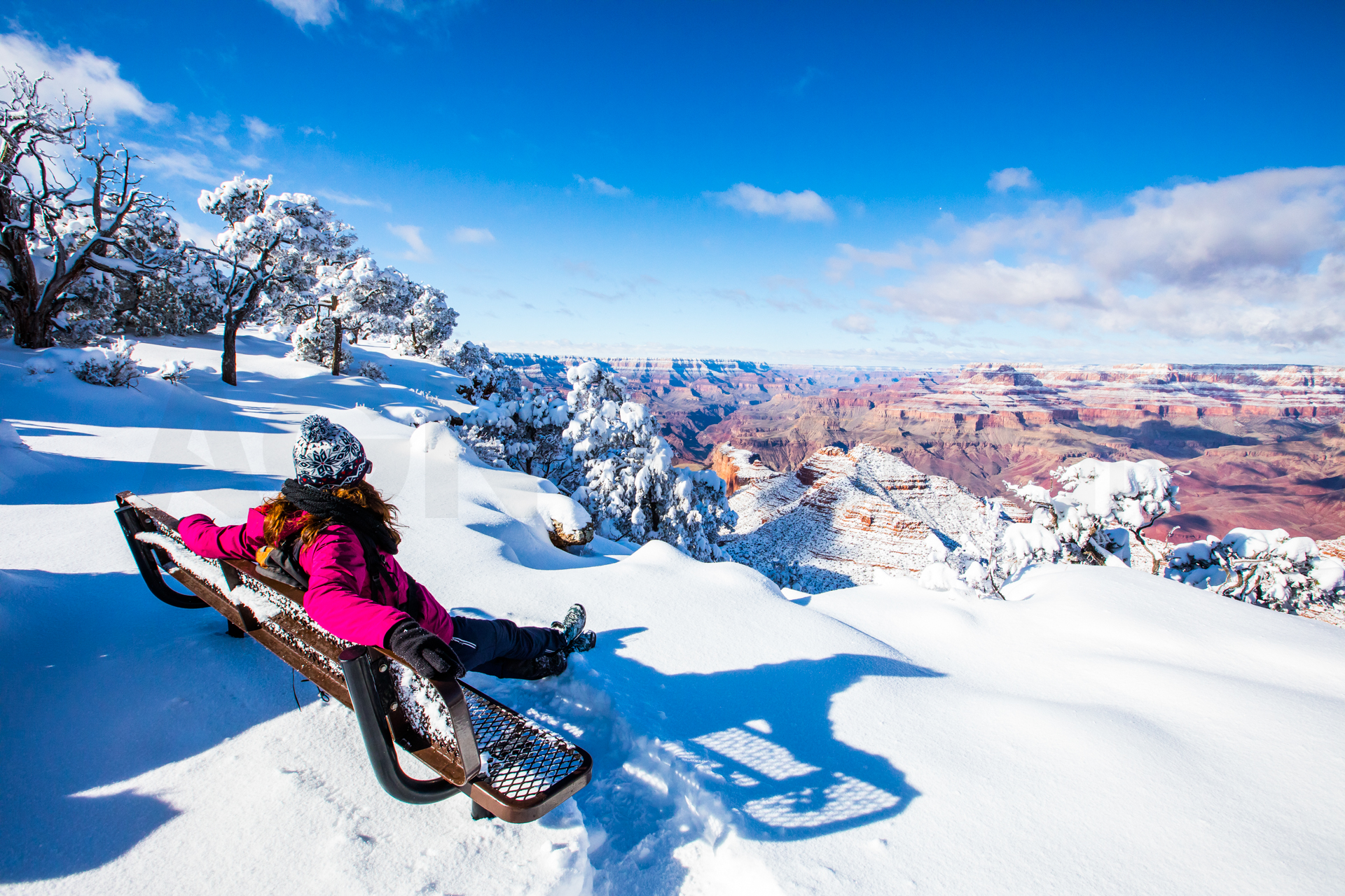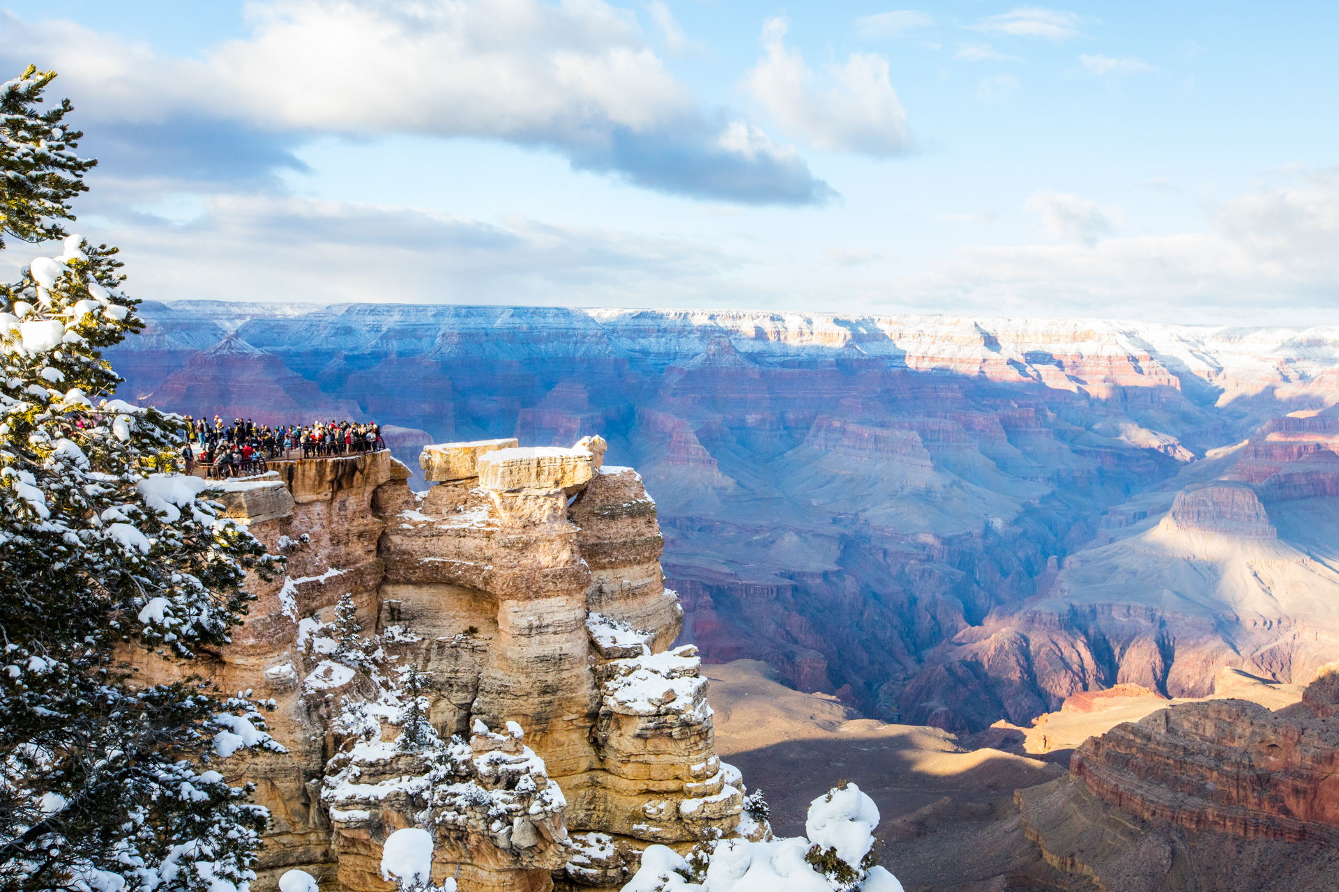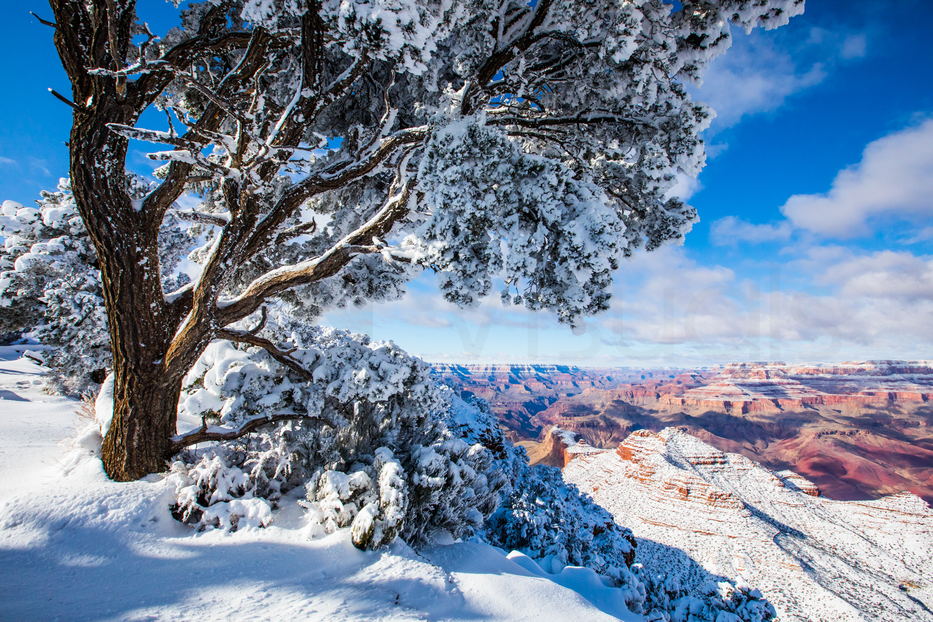 Continuamos y nos dirigimos hacia el Grand Canyon, iremos al mirador este del Parque Nacional del Grand Canyon del Colorado (Desert View Road) con intención de seguir por la carretera de los miradores hasta la zona central. Cuando llegamos, la carretera está cerrada y aparcamos en el parking. El parking es una pista de hielo y hay más de un palmo de nieve virgen de esta misma noche en el paisaje. Sabemos que ese día es genial, paisaje recién nevado y soleado. Nos calzamos bien, nos abrigamos, cogemos la cámara y hacia los miradores a pie. Llegamos al primer mirador y nos volvemos a quedar con la boca abierta. ¡Qué inmensidad de paisajes! ¡Y todo recién nevado! El contraste de la roca del desierto y la nieve dejaban un paisaje espectacular. Vamos andando y disfrutando por estos miradores y no podíamos parar de hacer fotos. ¡Qué momentos increíbles vivimos esa mañana!