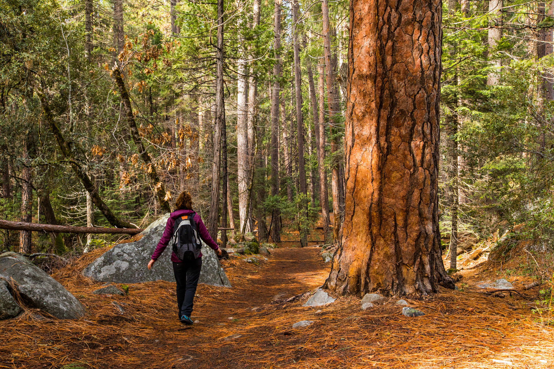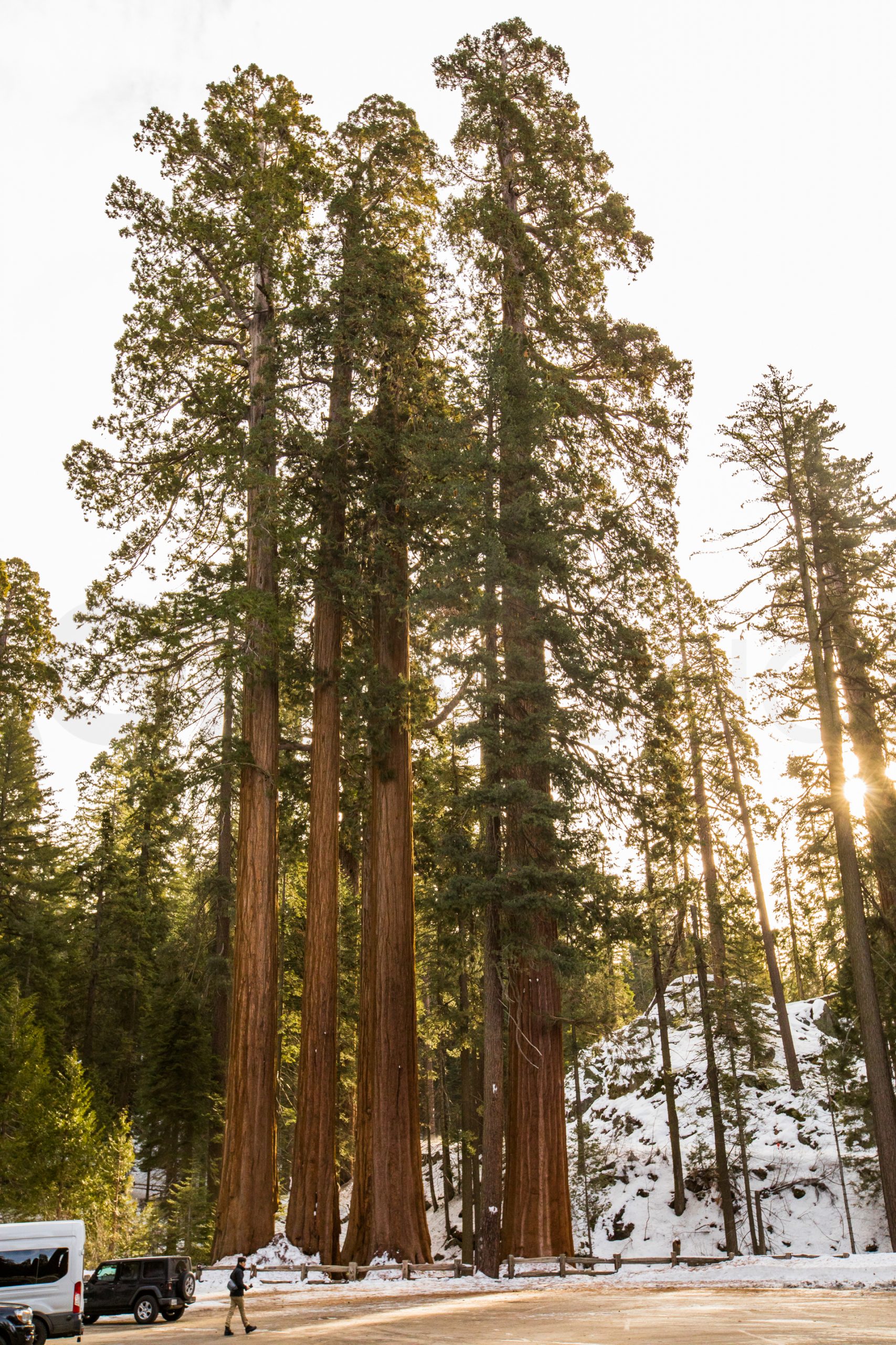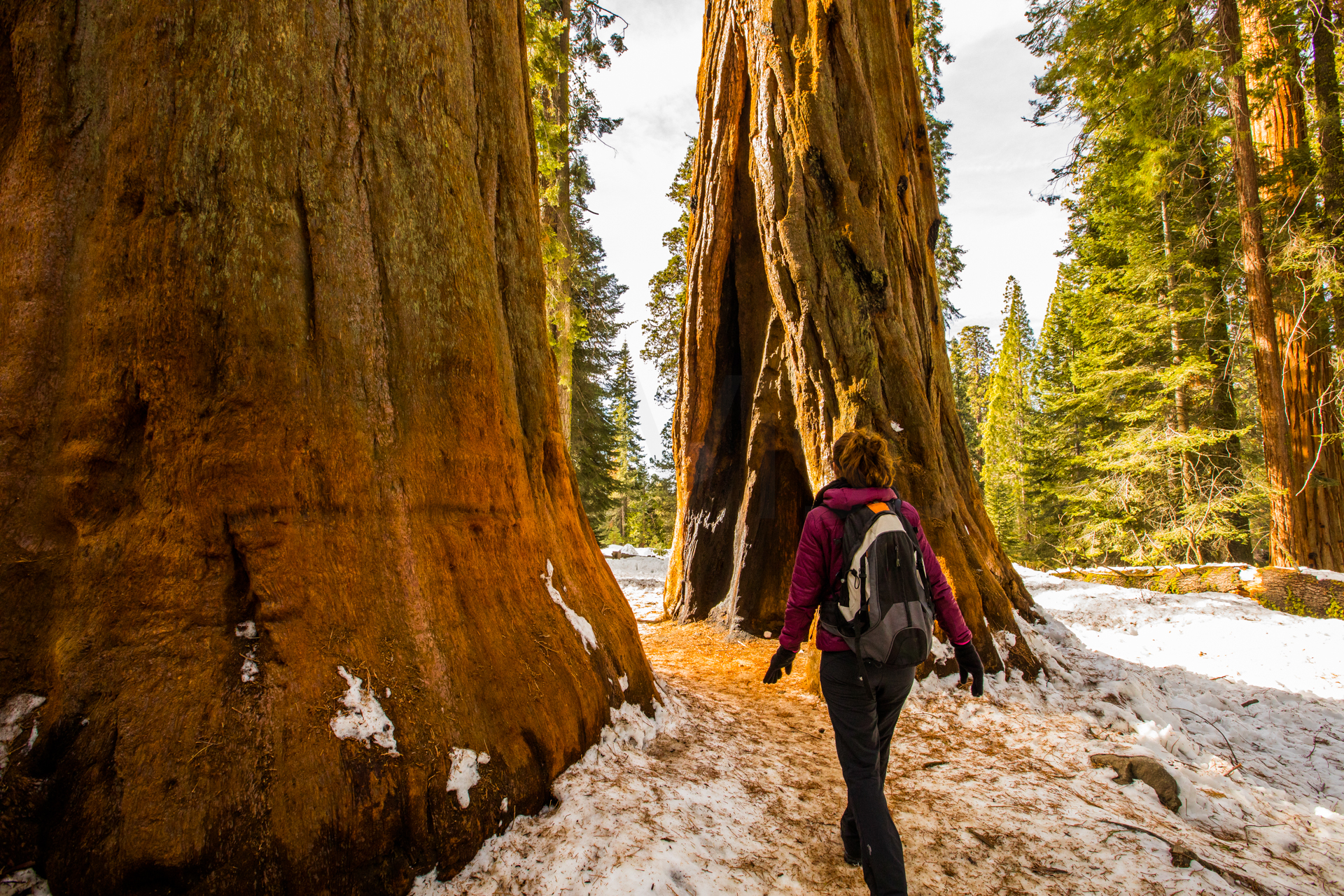 Llegamos al primer mirador y ¡qué vistas! Impresionante paisaje con las montañas, los bosques y la cascada al horizonte. Seguimos y aparcamos en el parking principal. Pasaremos el día haciendo excursiones por esta parte del parque nacional. Es una gozada poder caminar entre esos bosques y esas montañas tan espectaculares. Al ser invierno, hay muchos senderos y carreteras cortados, así que nos centramos en recorrer esta zona. Volveremos unos años más tarde en otra época del año para recorrer otras zonas del parque.