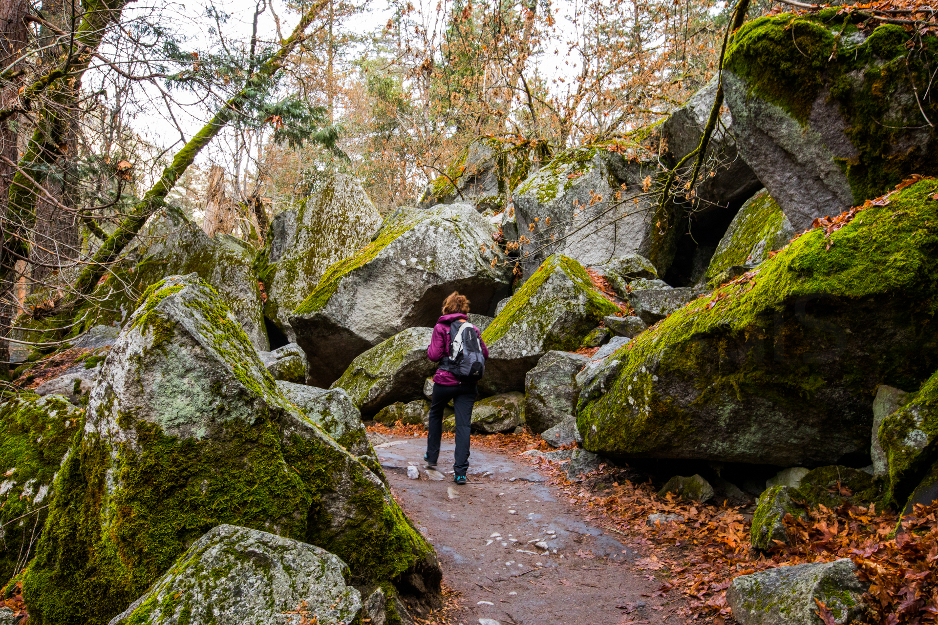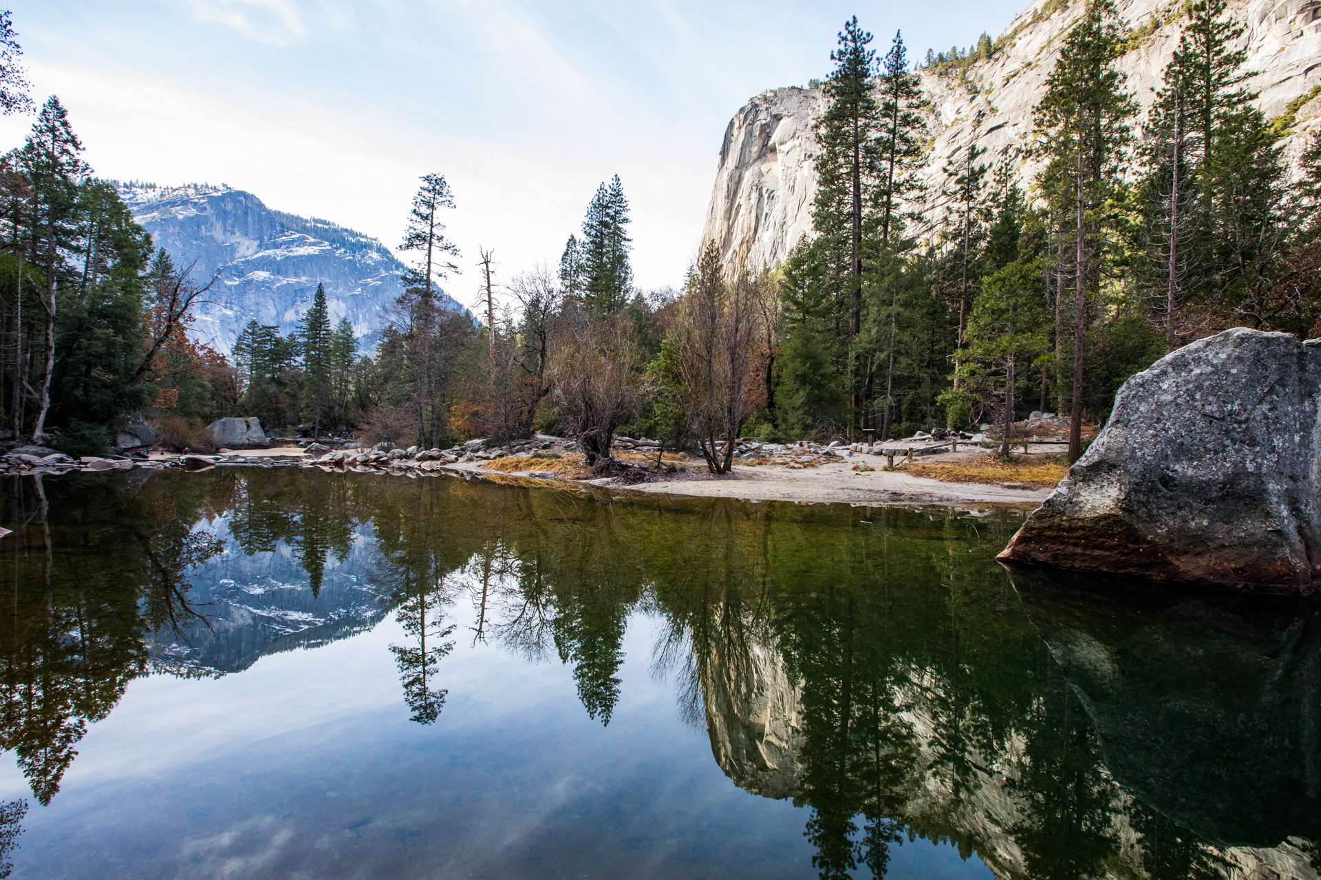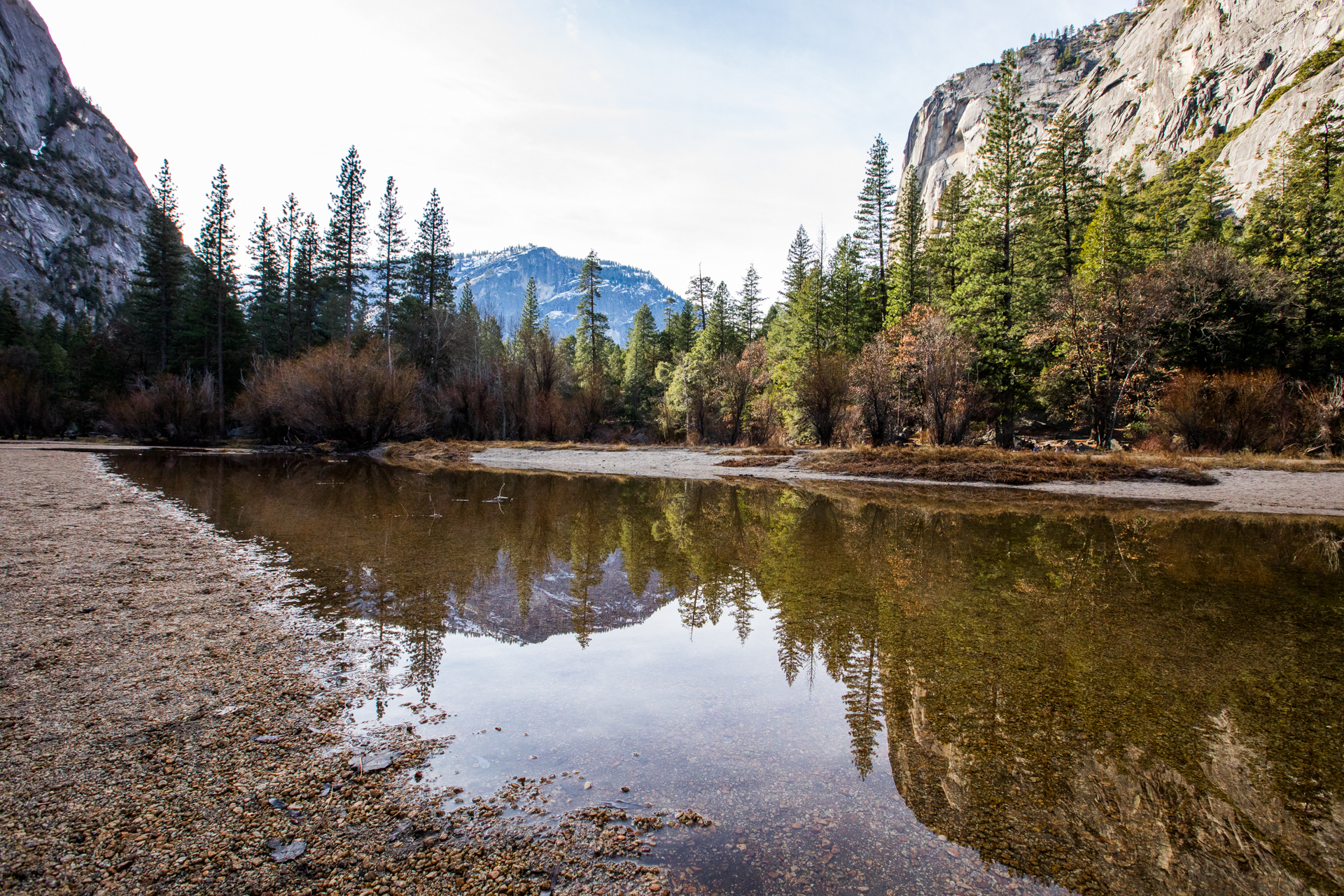 Llegamos al primer mirador y ¡qué vistas! Impresionante paisaje con las montañas, los bosques y la cascada al horizonte. Seguimos y aparcamos en el parking principal. Pasaremos el día haciendo excursiones por esta parte del parque nacional. Es una gozada poder caminar entre esos bosques y esas montañas tan espectaculares. Al ser invierno, hay muchos senderos y carreteras cortados, así que nos centramos en recorrer esta zona. Volveremos unos años más tarde en otra época del año para recorrer otras zonas del parque.