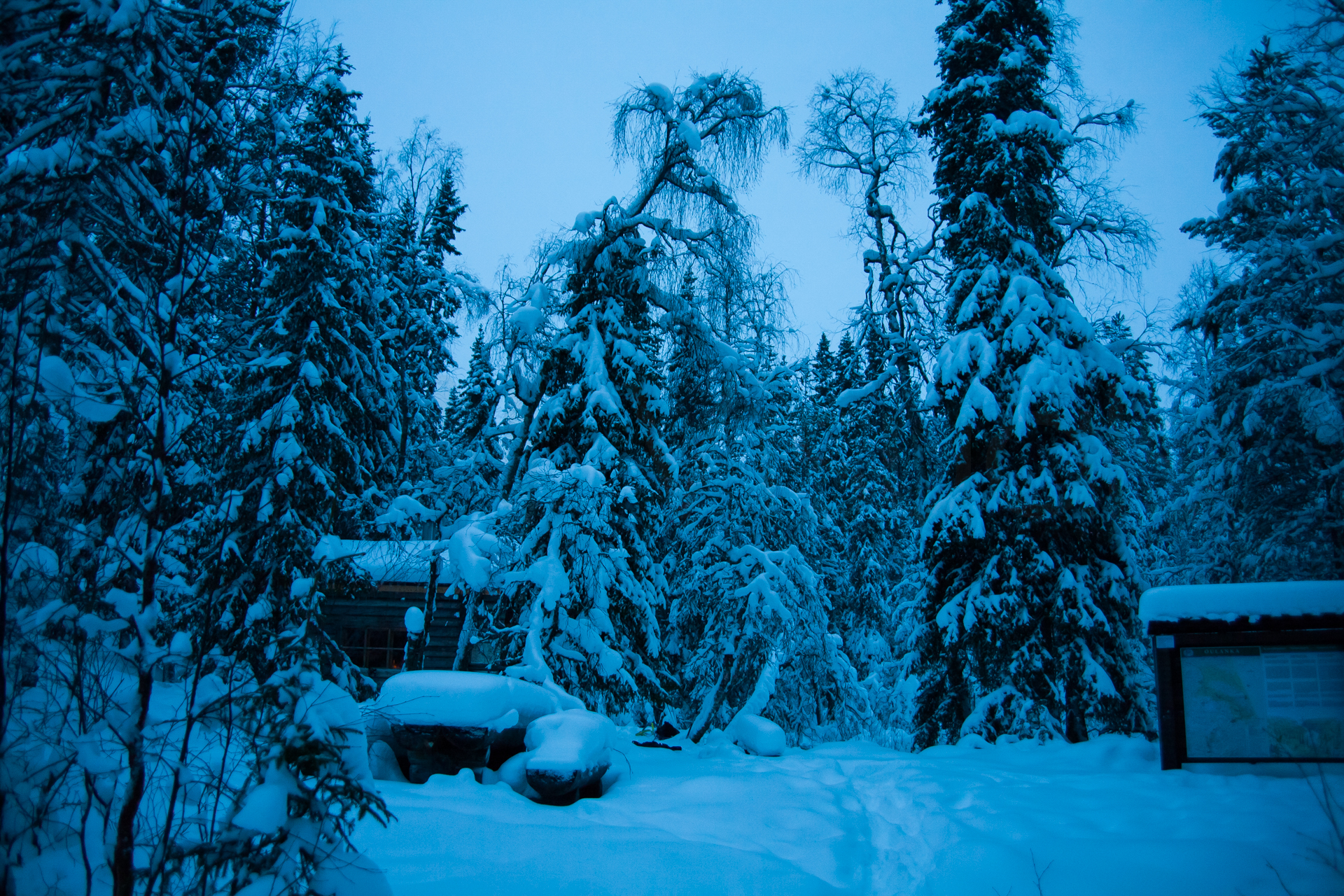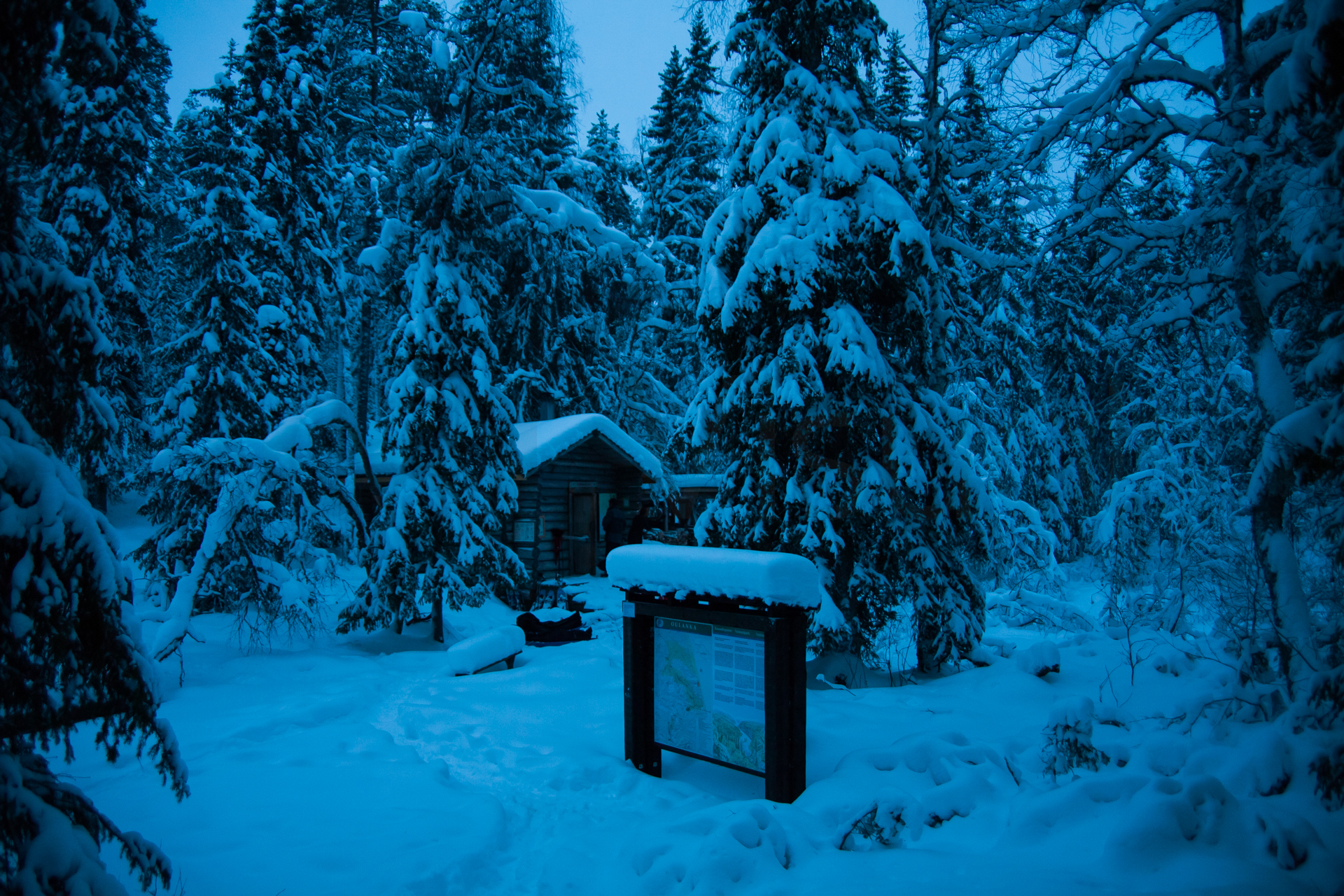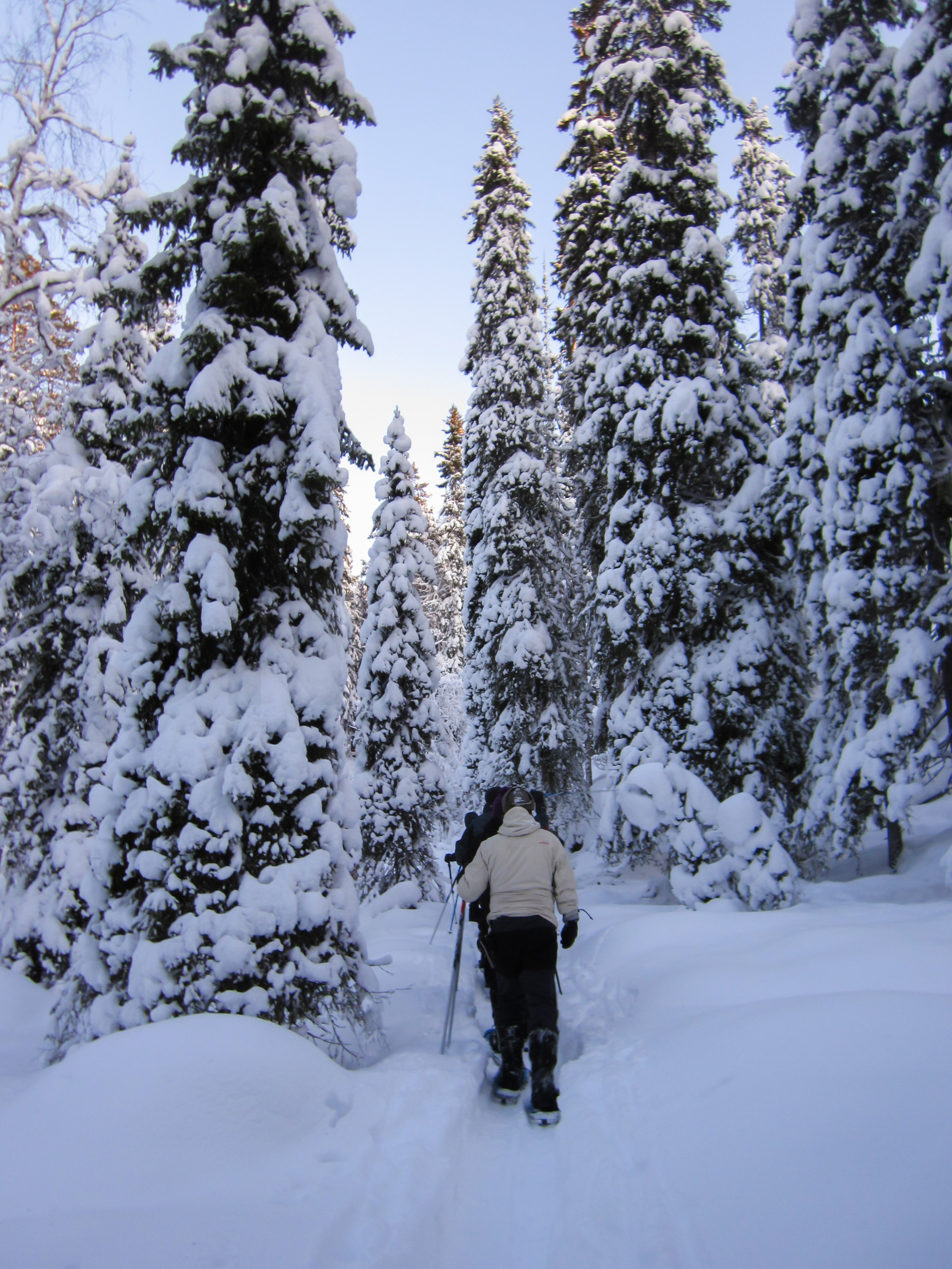 Iniciamos el viaje en un entorno realmente espectacular. Un bosque boreal cargado de nieve. Será una etapa corta pero aún y así llegamos de noche a la cabaña.