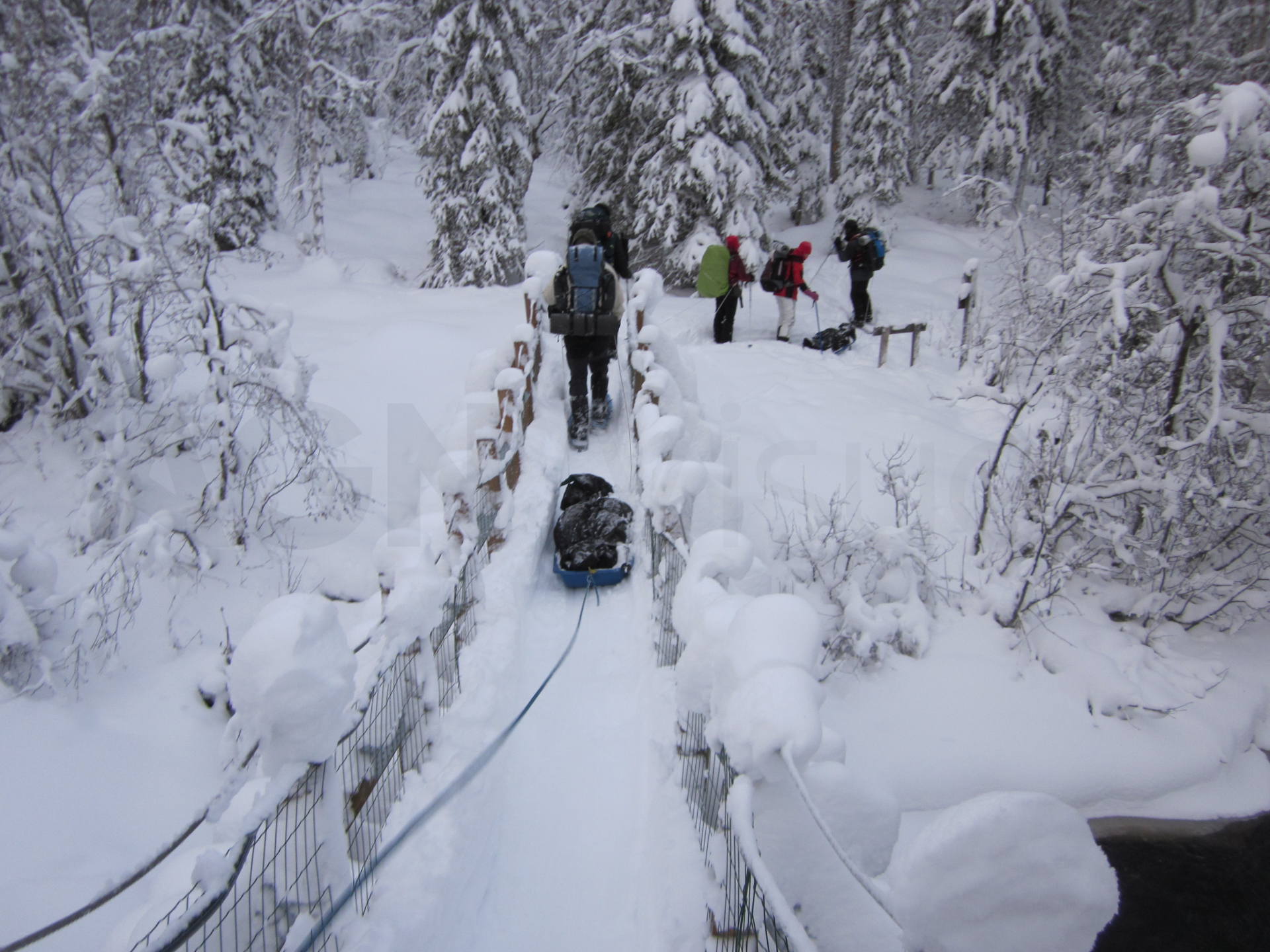Salimos de la cabaña y emprendemos de nuevo la travesía. Hoy será un día entretenido. Tendremos que subir escaleras y cruzar puentes cargados de nieve para atravesar los cañones. Temía que en un cruce de esos puentes me fuera al agua; no tenía ganas de darme un baño como en Groenlandia.