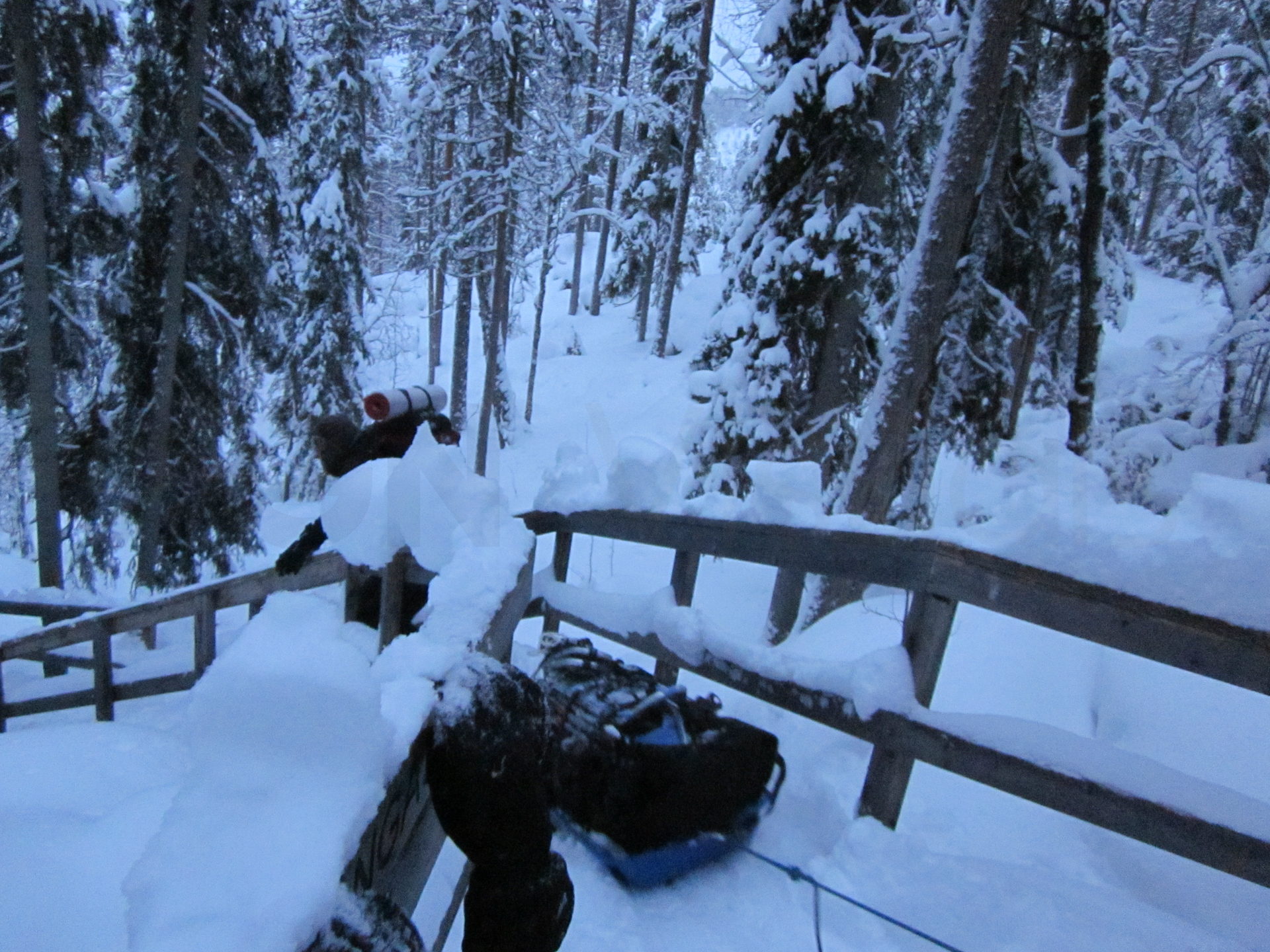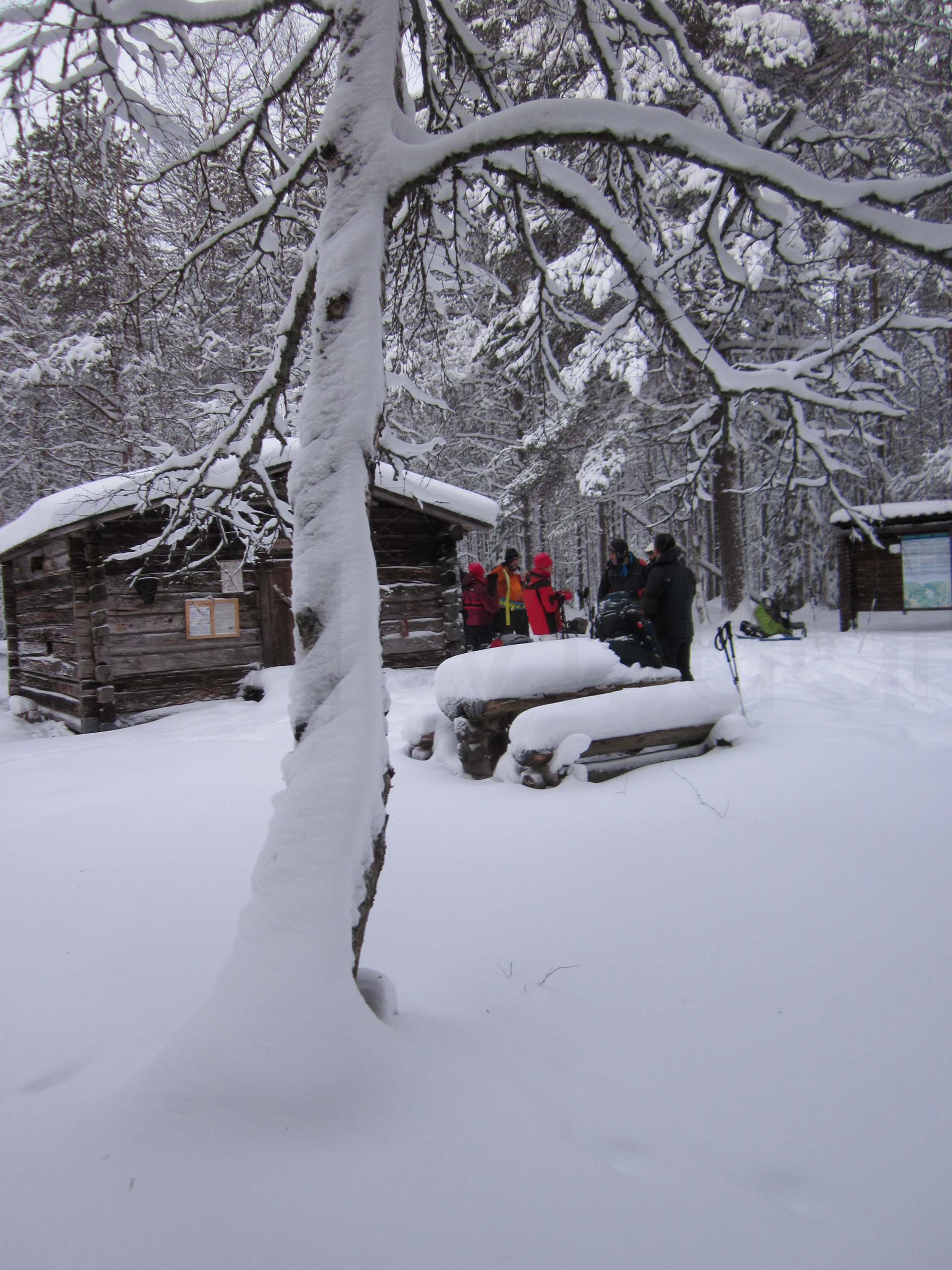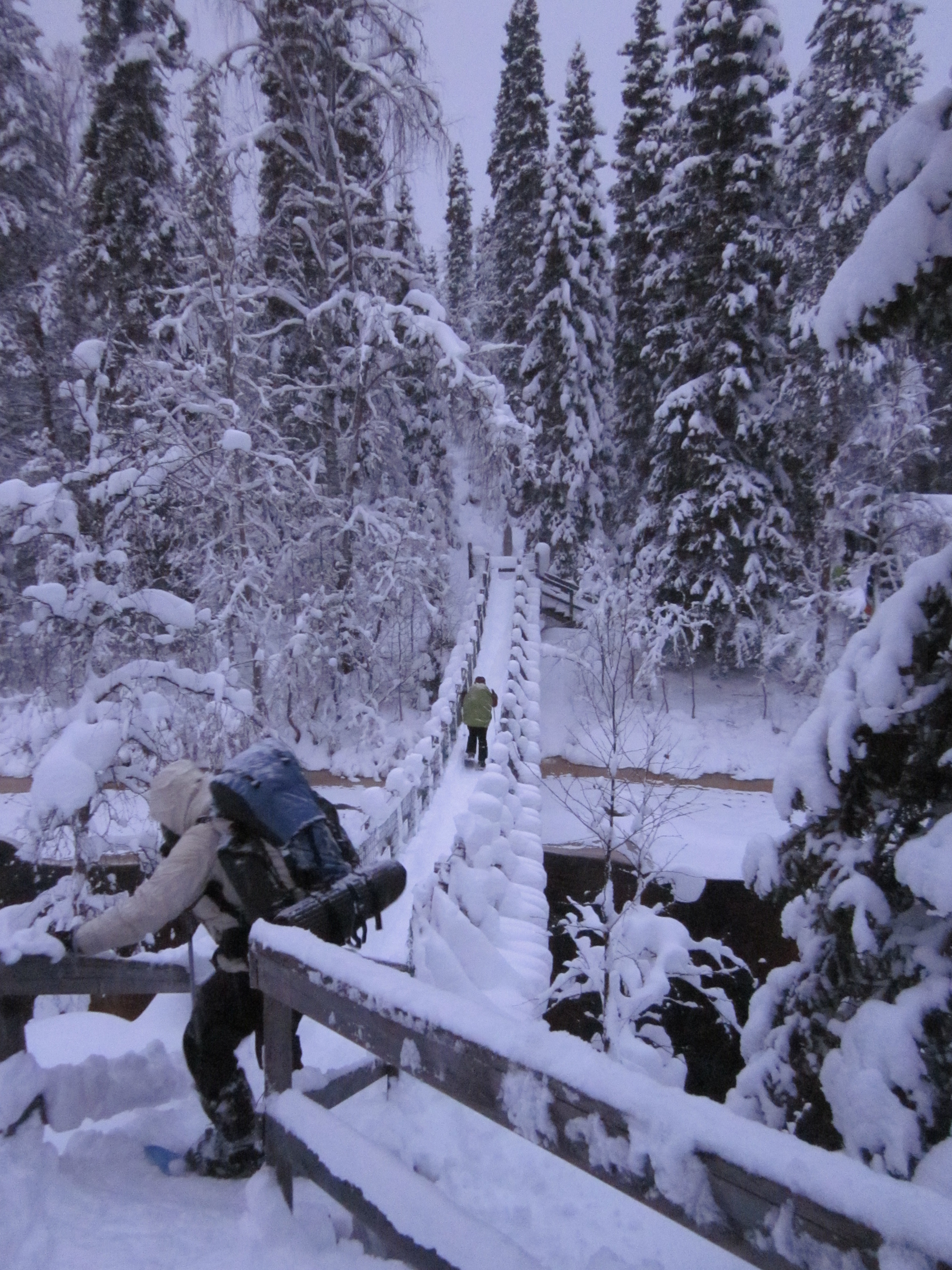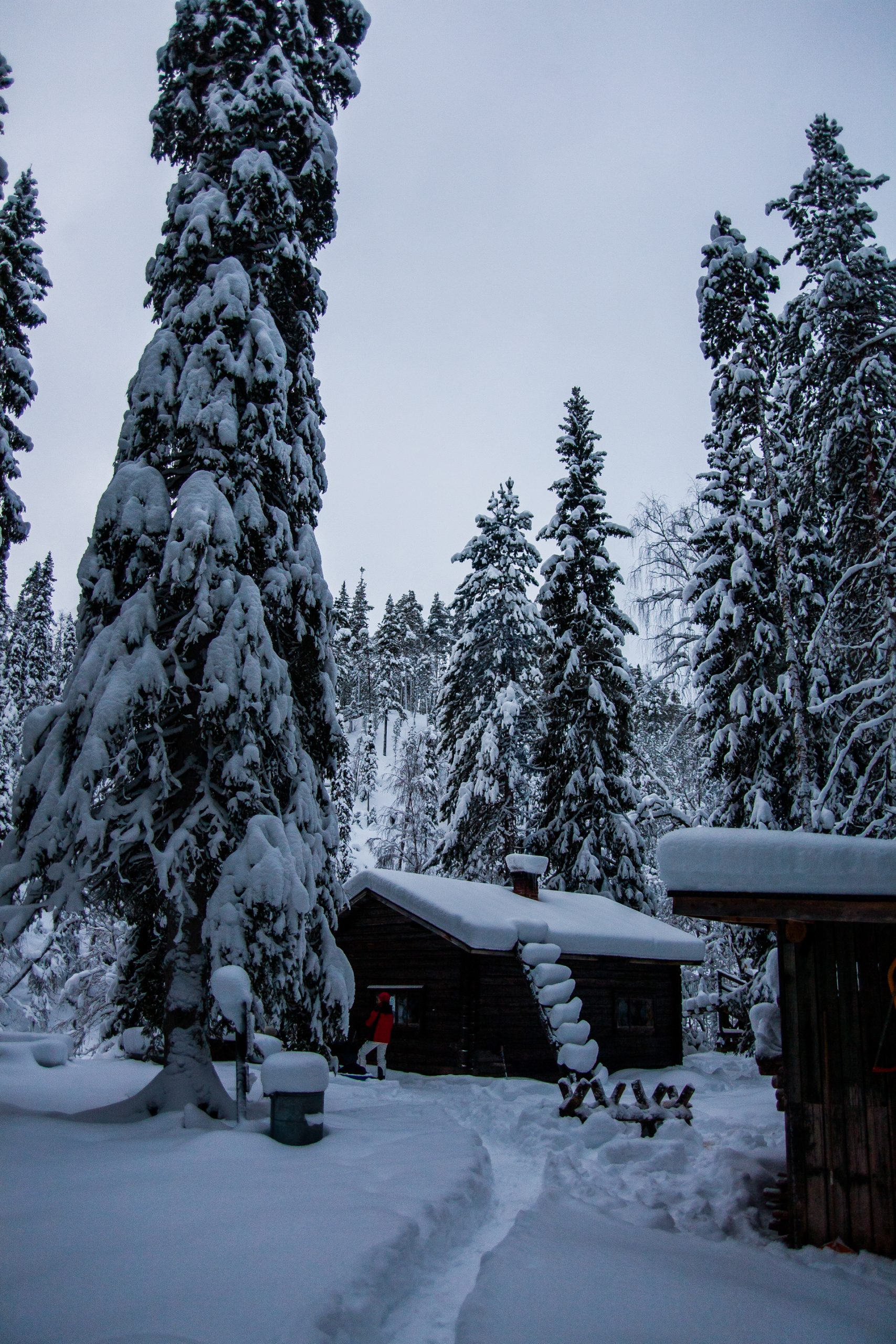Madrugamos y empezamos la ruta. Hoy será un día espectacular. Cruzaremos muchos más puentes cargados de nieve y llegaremos a un refugio impresionante. Los refugios están situados en lugares realmente preciosos, entre pinos y abedules cargados de nieve. Era un paisaje de cuento.