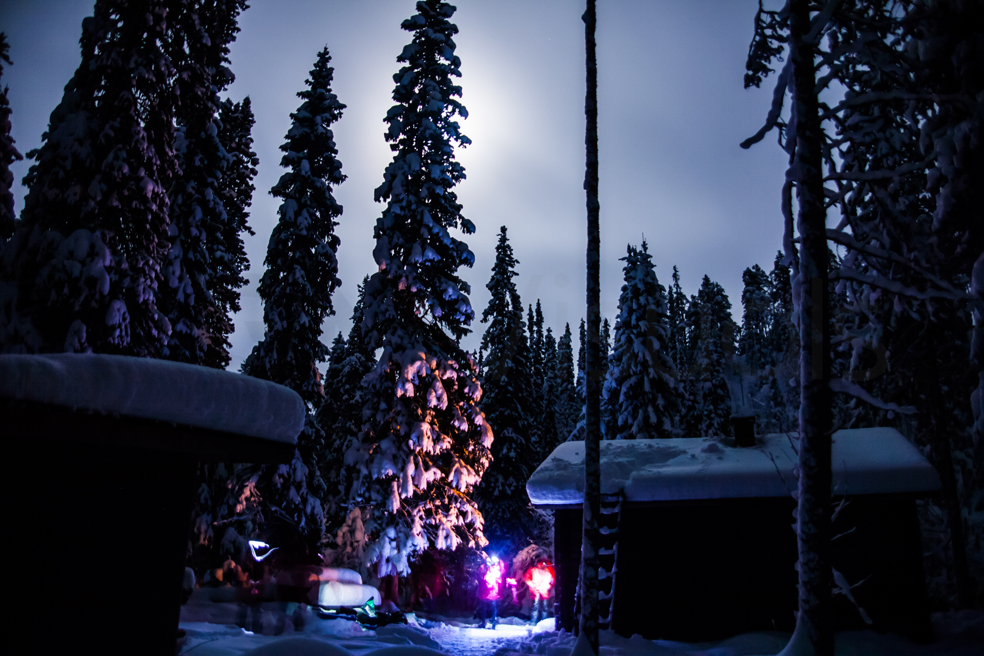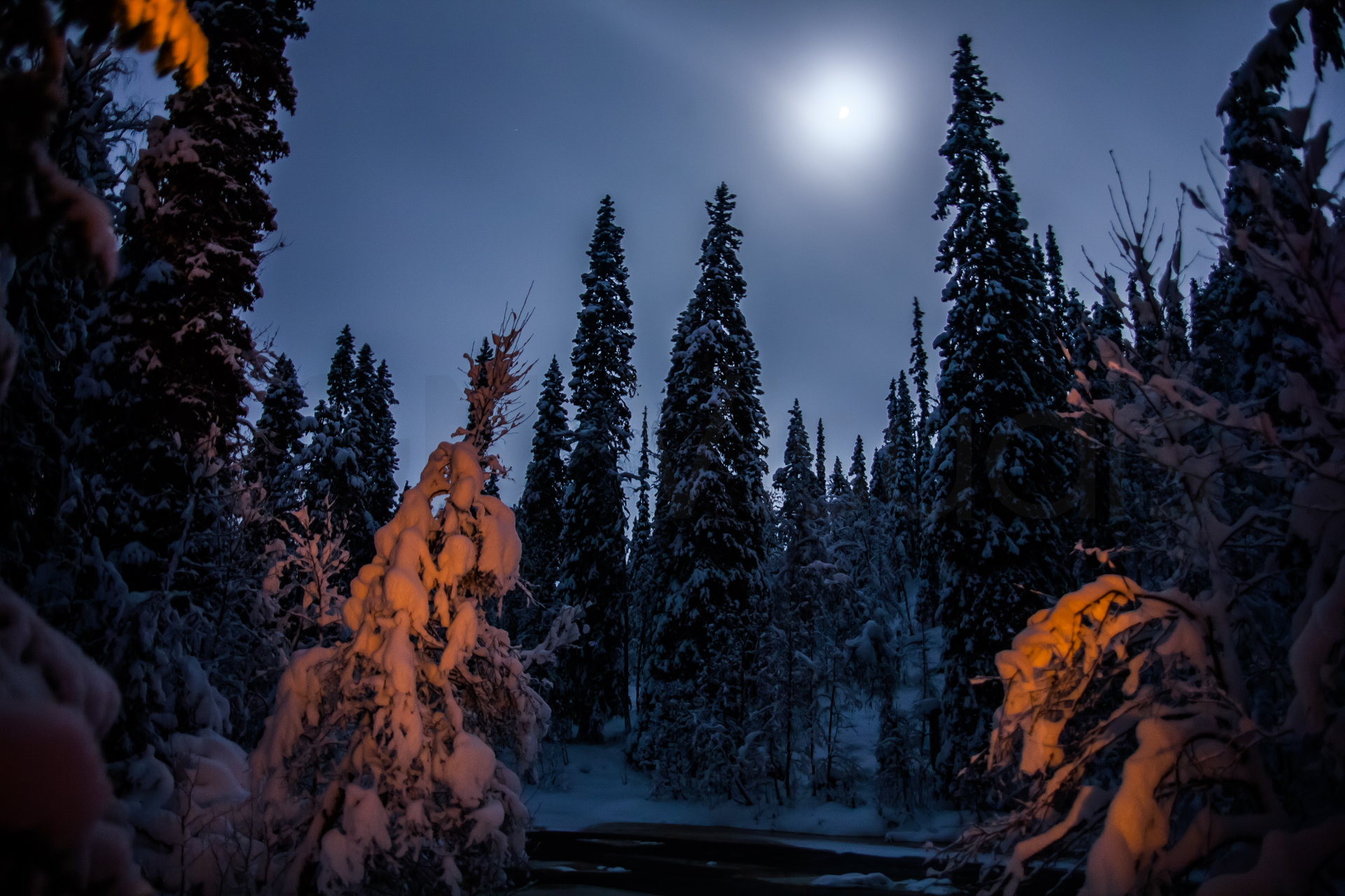 Llega la noche y veo que el cielo aclara por fin después de días nublado y nevando. Saco la cámara con ilusión de poder fotografiar las auroras boreales. No hay suerte y solo puedo fotografiar la luna. Las auroras boreales no las vería hasta 2013 en un viaje a las Islas Lofoten, Noruega.