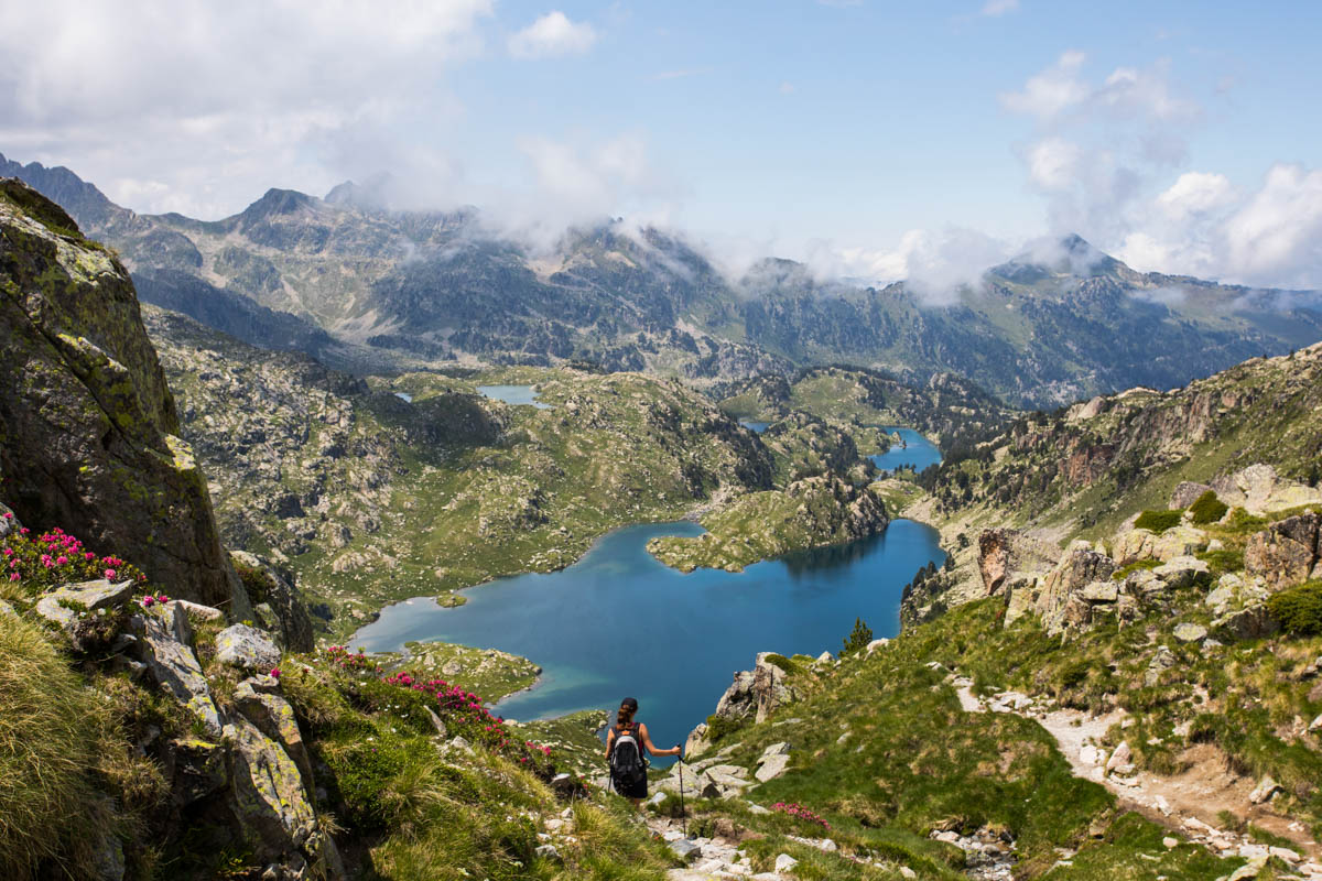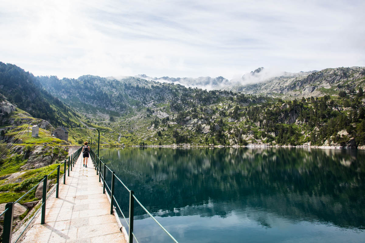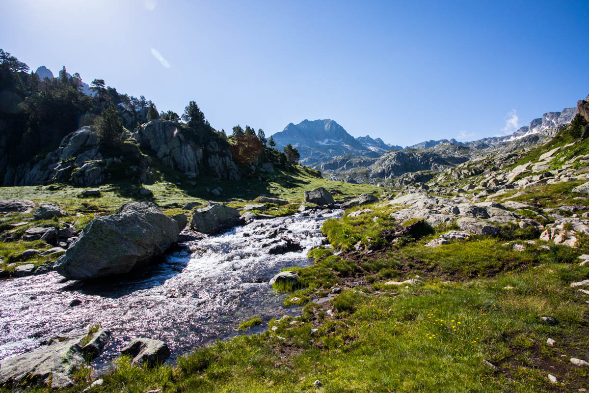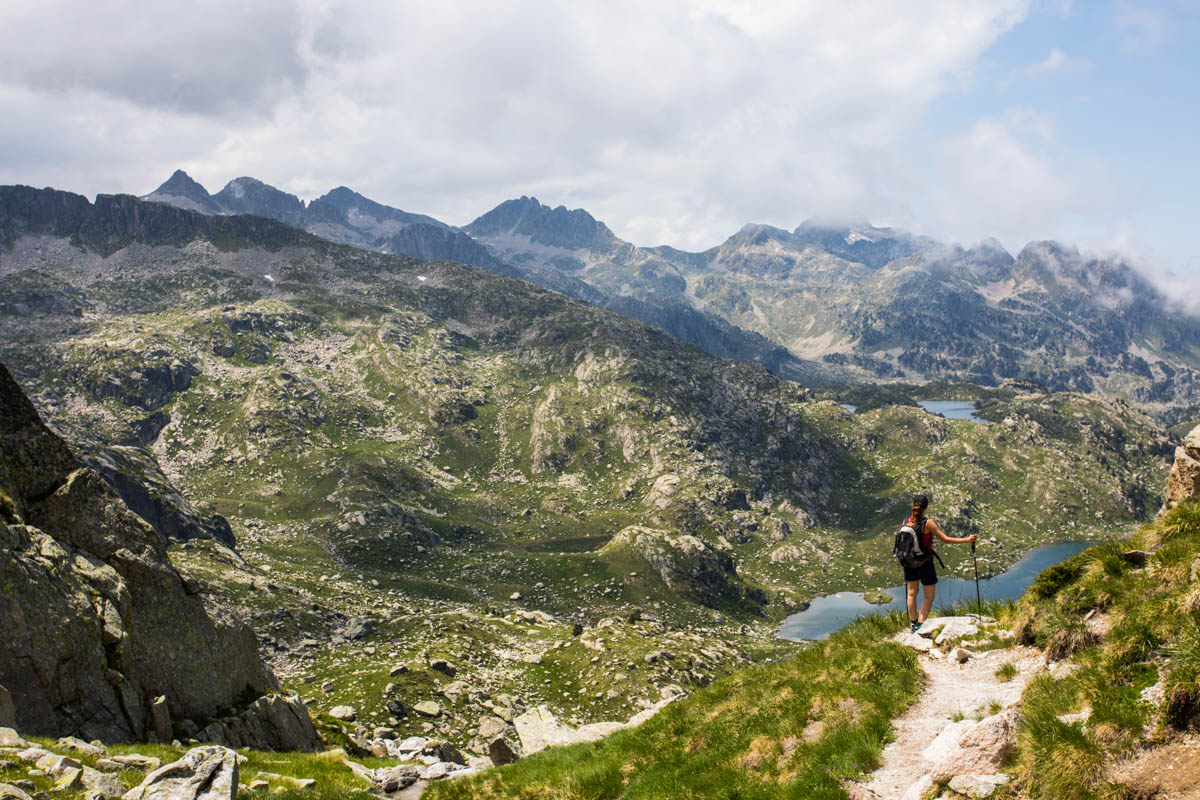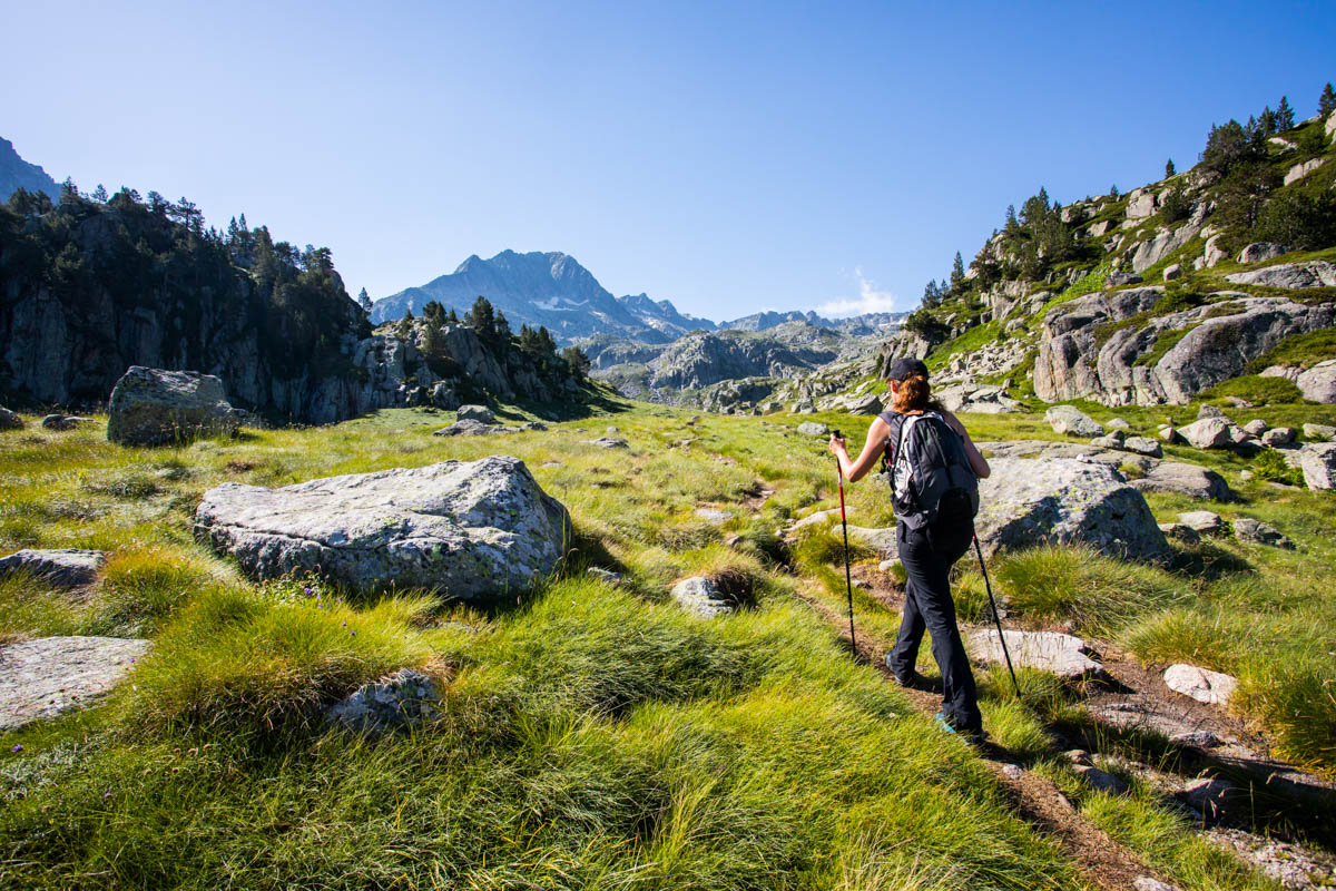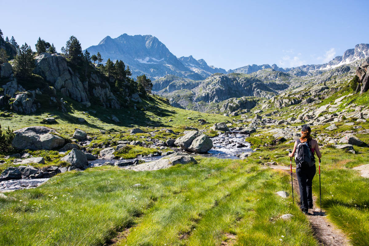 Los chicos con los que compartimos el taxi eran majísimos y se notaba que iban a por una travesía larga o una cima potente. Nosotros empezamos nuestra ruta a un ritmo más tranquilo, pero alucinando desde el primer momento con el paisaje. Todo estaba verde, vivo, de pleno verano. Prácticamente no había nadie. A lo lejos, unas nieblas entraban por el Valle de Arán, haciendo la escena aún más mágica.