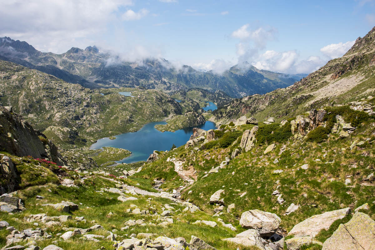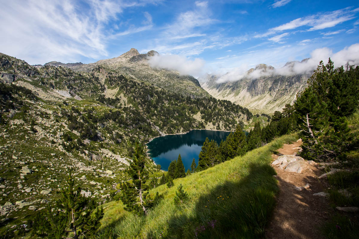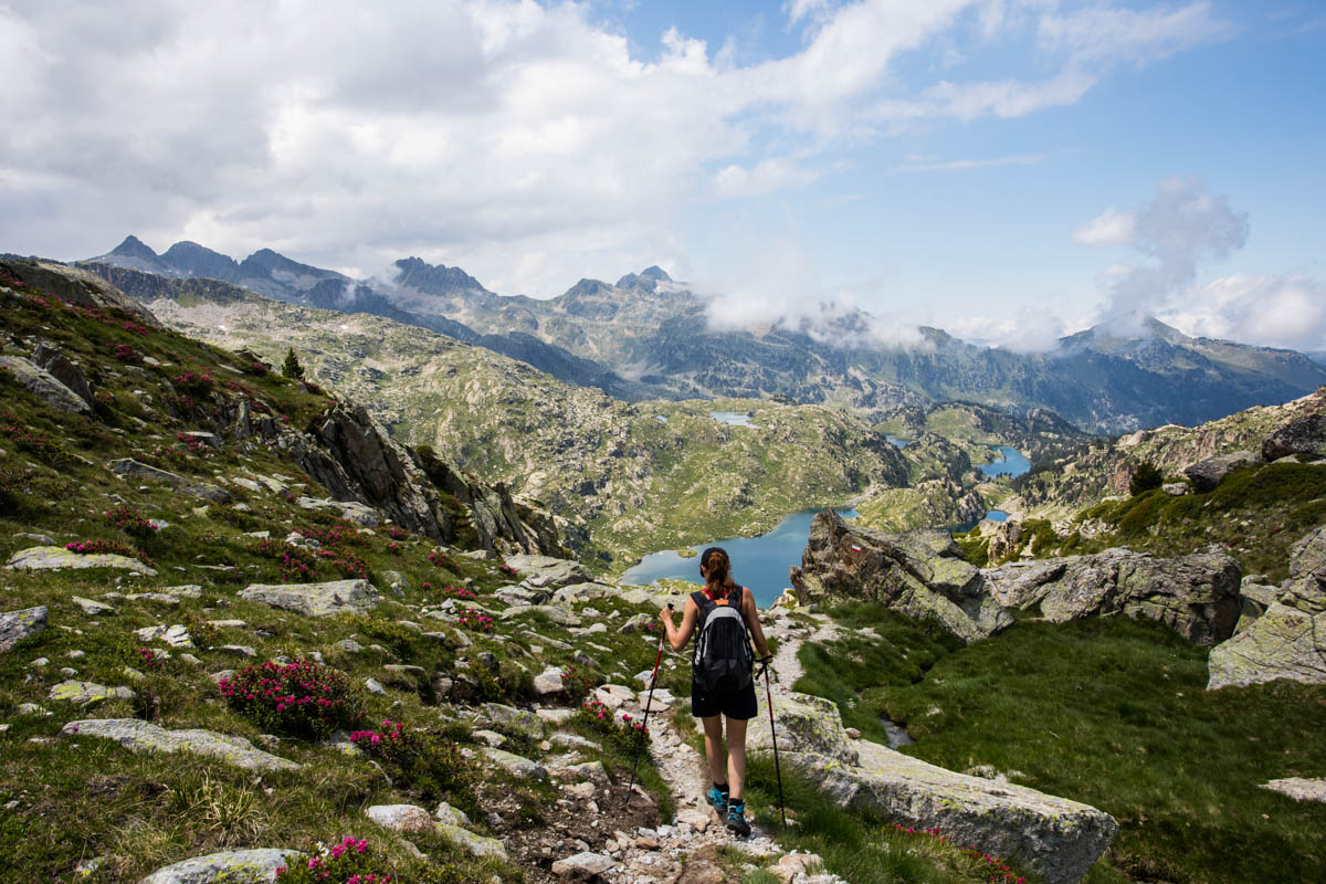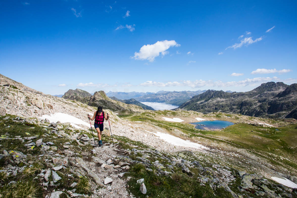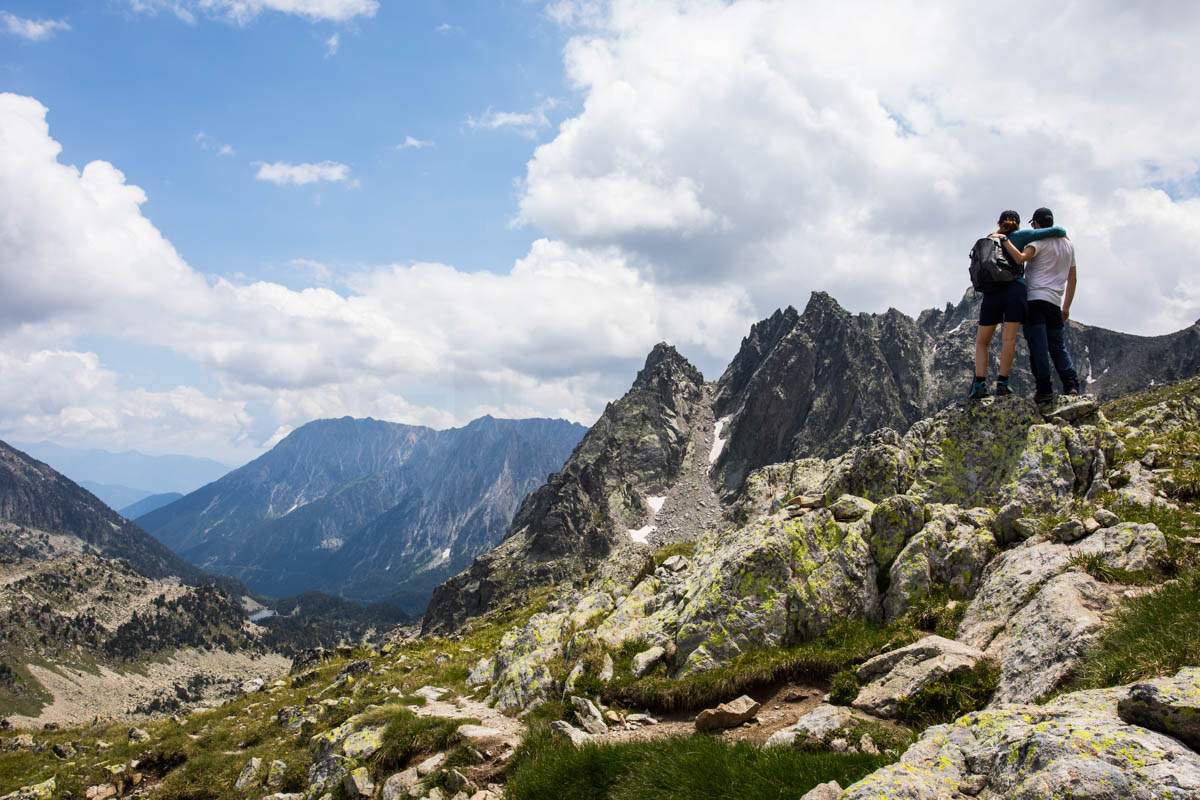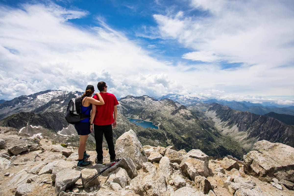 Los chicos con los que compartimos el taxi eran majísimos y se notaba que iban a por una travesía larga o una cima potente. Nosotros empezamos nuestra ruta a un ritmo más tranquilo, pero alucinando desde el primer momento con el paisaje. Todo estaba verde, vivo, de pleno verano. Prácticamente no había nadie. A lo lejos, unas nieblas entraban por el Valle de Arán, haciendo la escena aún más mágica.