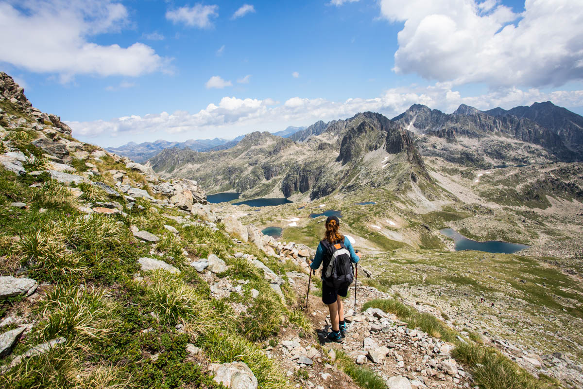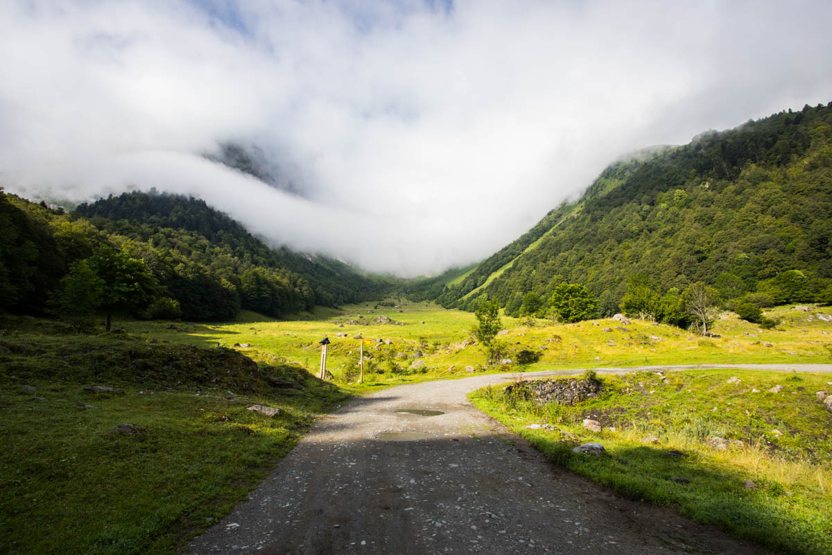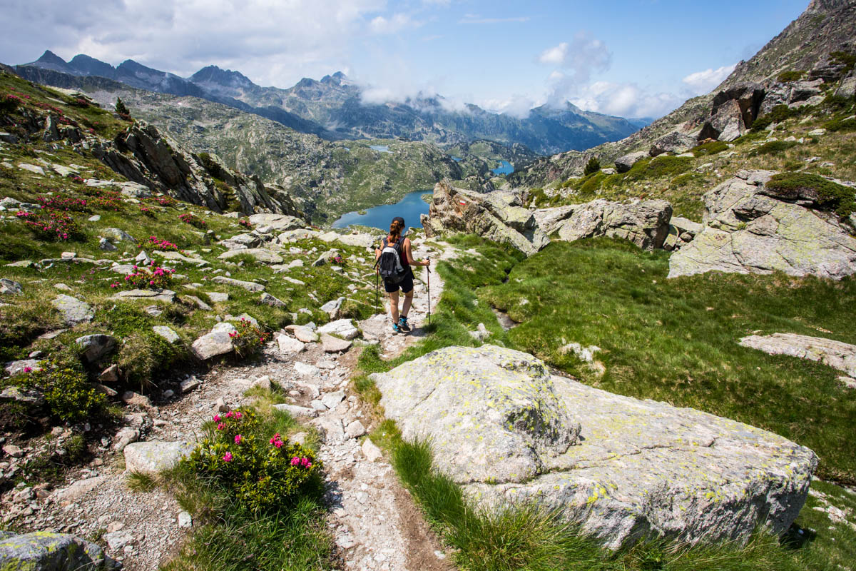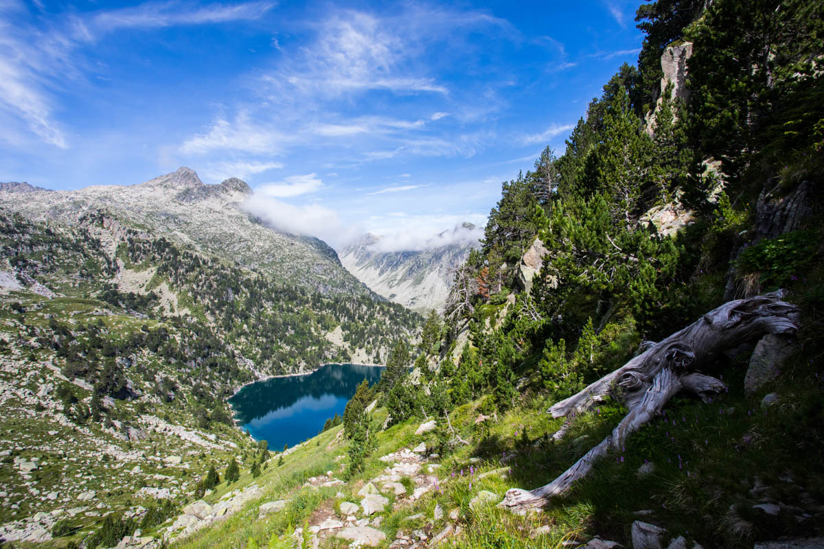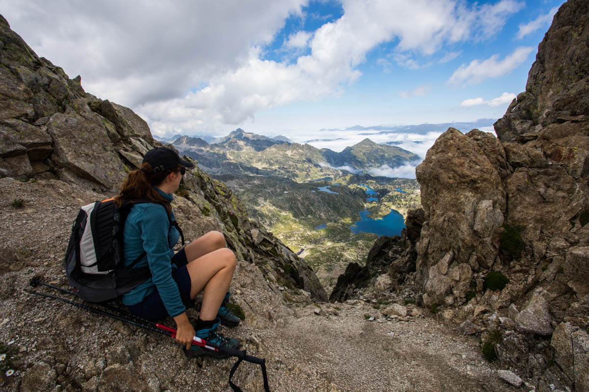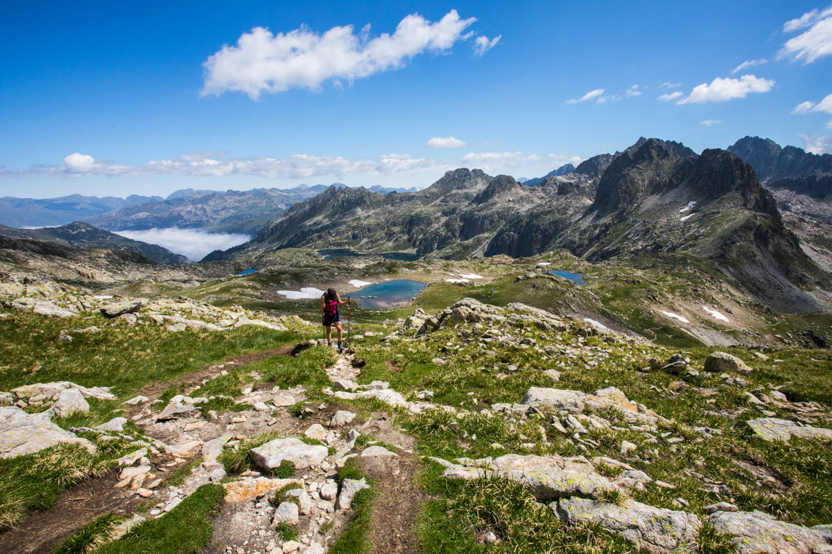 Los chicos con los que compartimos el taxi eran majísimos y se notaba que iban a por una travesía larga o una cima potente. Nosotros empezamos nuestra ruta a un ritmo más tranquilo, pero alucinando desde el primer momento con el paisaje. Todo estaba verde, vivo, de pleno verano. Prácticamente no había nadie. A lo lejos, unas nieblas entraban por el Valle de Arán, haciendo la escena aún más mágica.