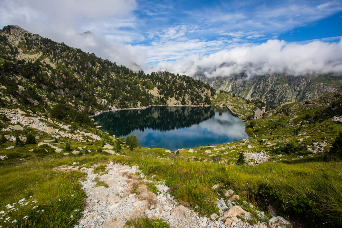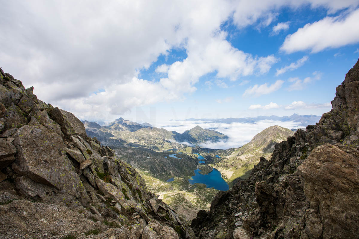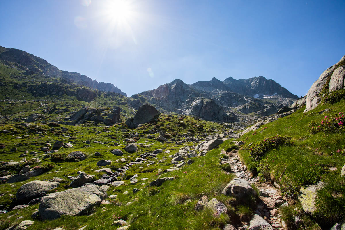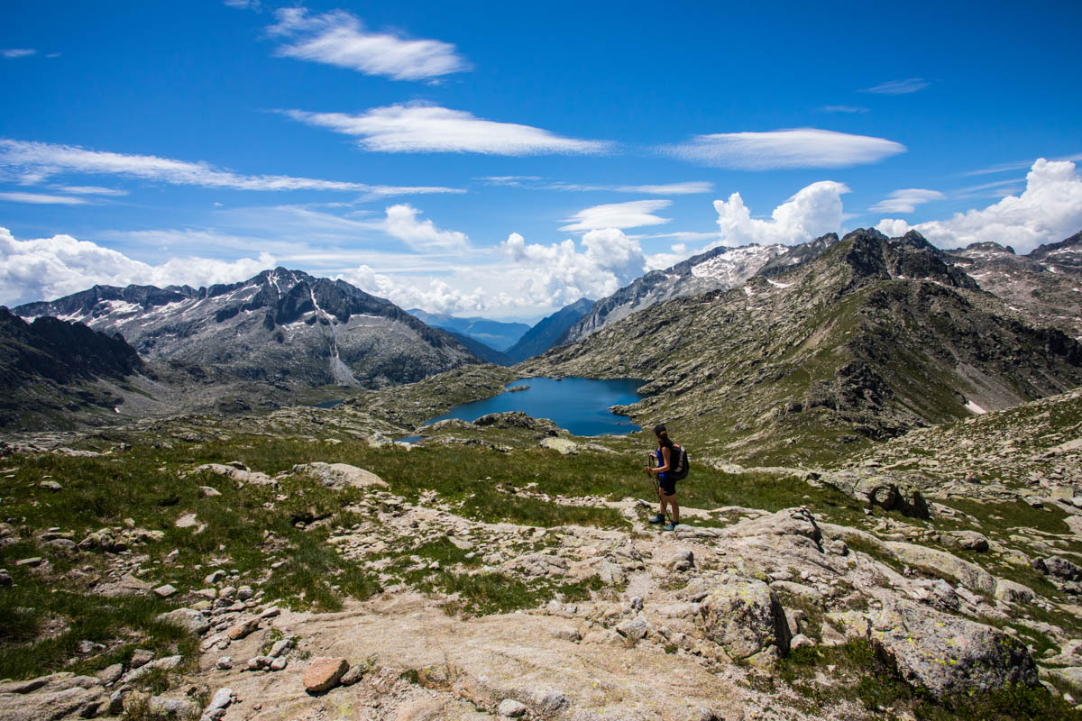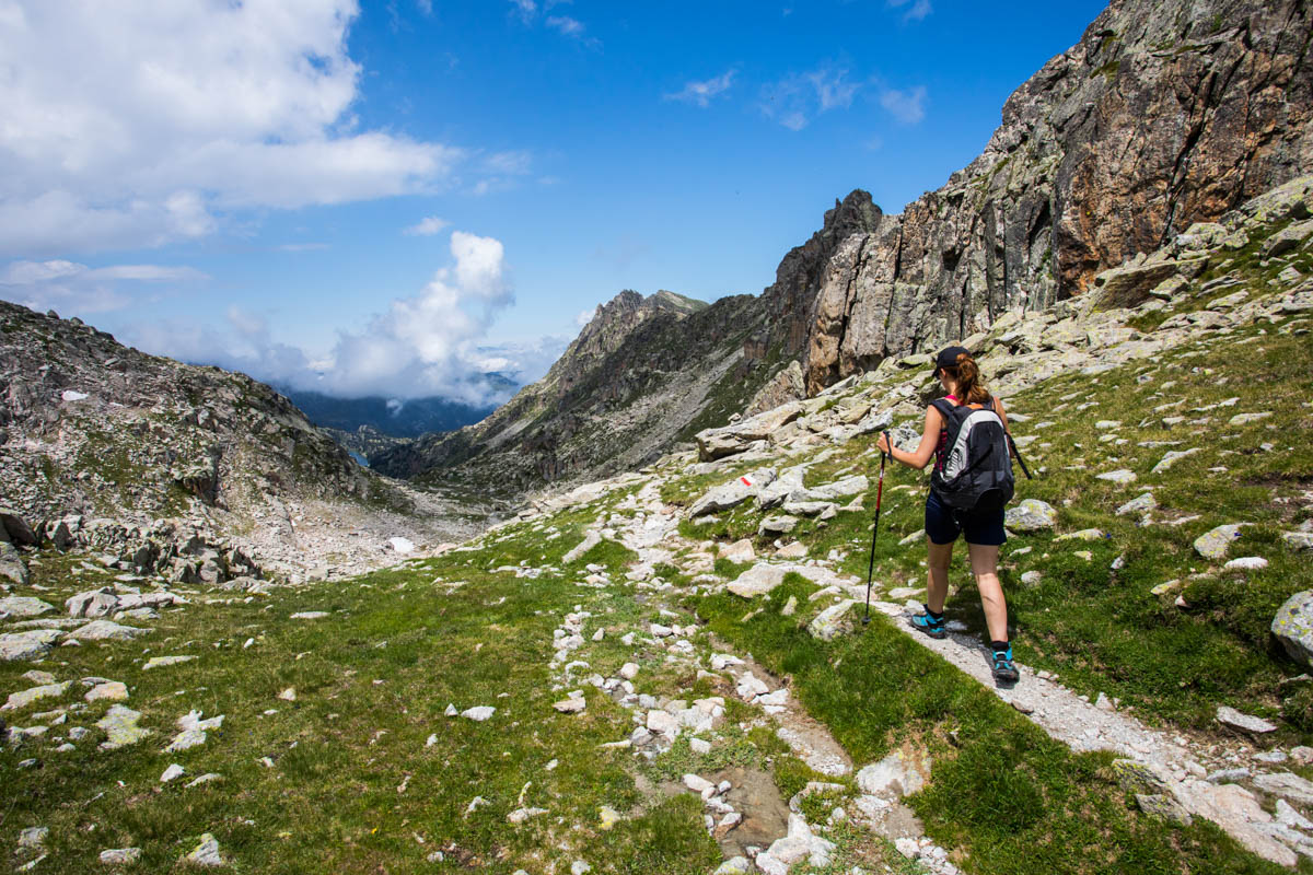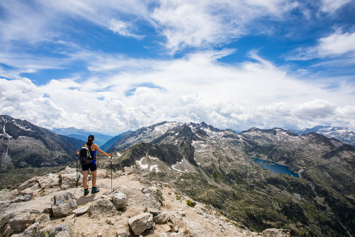 Los chicos con los que compartimos el taxi eran majísimos y se notaba que iban a por una travesía larga o una cima potente. Nosotros empezamos nuestra ruta a un ritmo más tranquilo, pero alucinando desde el primer momento con el paisaje. Todo estaba verde, vivo, de pleno verano. Prácticamente no había nadie. A lo lejos, unas nieblas entraban por el Valle de Arán, haciendo la escena aún más mágica.
